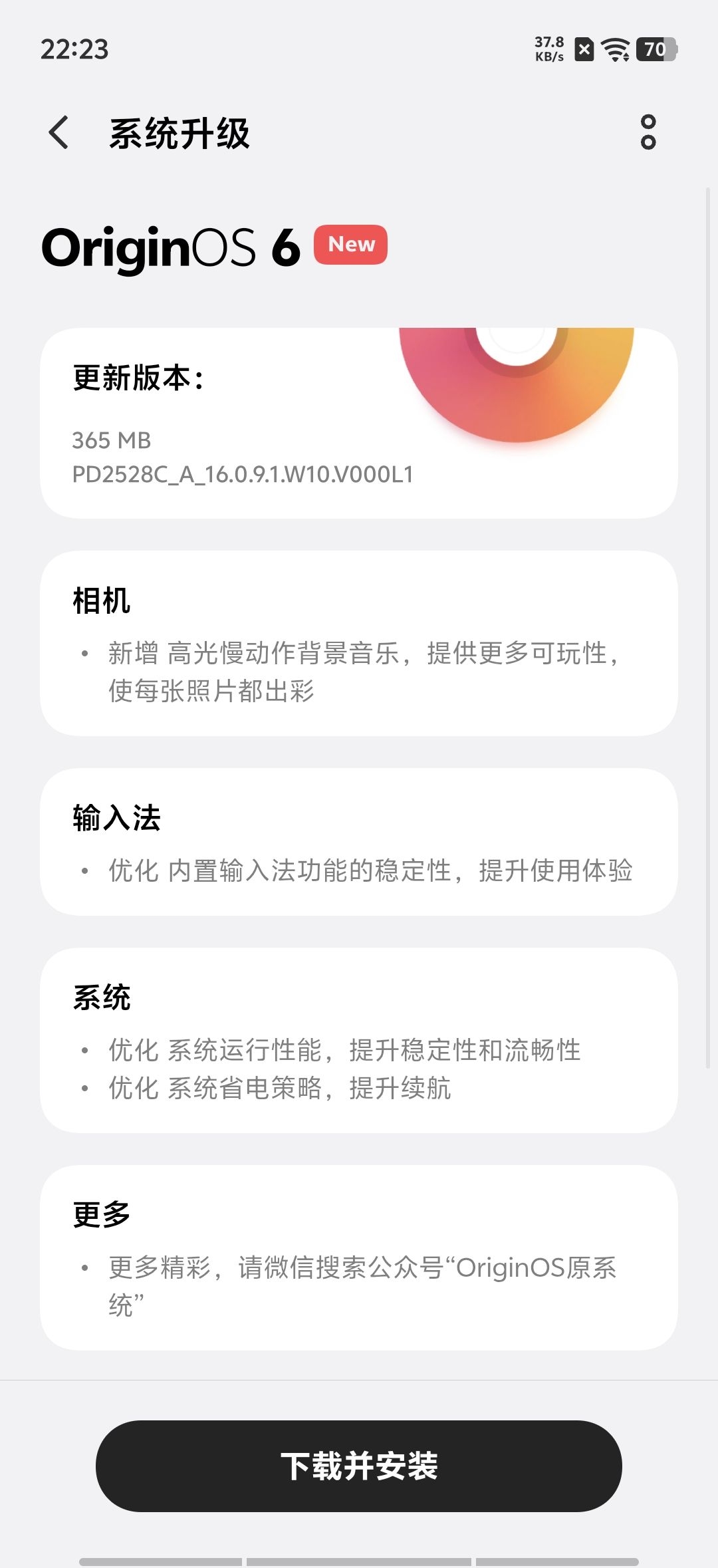 vivo S50到手后第四次更新,这次以「新版本尝鲜」的形式抢先而来。这个版本更新推送拥有365MB的大小,而更新日志则带来了3大点4小项目的内容。 升级过后,版本号升级到16.0.9.1版本。而这次升级的重点是让实况模式中的「高光慢动作」增加了背景音乐,这让拍摄实况带来更多创新的玩法体验。 #vivoS50# #OriginOS6#