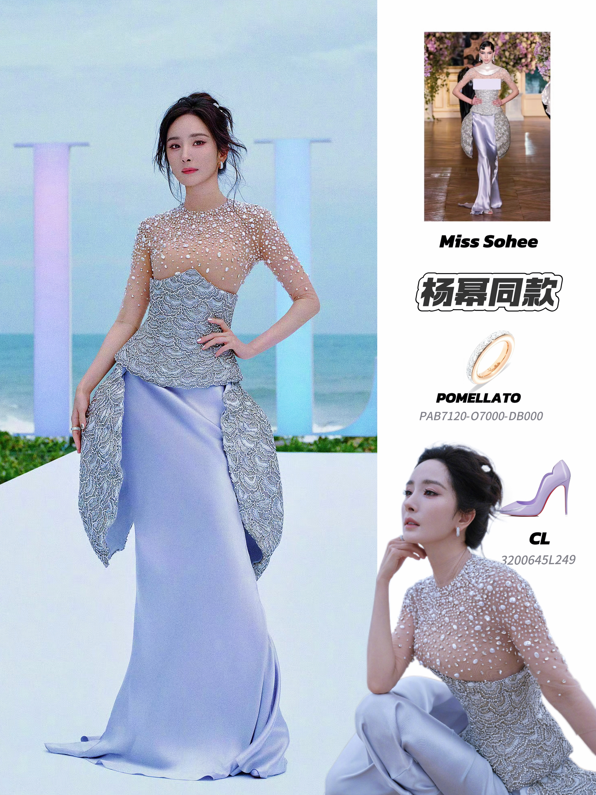 杨幂身着Miss Sohee 2025春夏高级定制系列礼录制了ELLE盛典红毯,成为第一个登岛的艺人 Miss Sohee的礼服太懂营造氛围了——上半身透视面料缀满珍珠,下裙渐变的柔紫色缎面如鱼尾般飘逸。搭配CL高跟鞋与Pomellato珠宝,精致感拉满,再衬着海浪背景,仿佛从童话里游来的人鱼公主,把优雅与梦幻感都演绎到了极致~