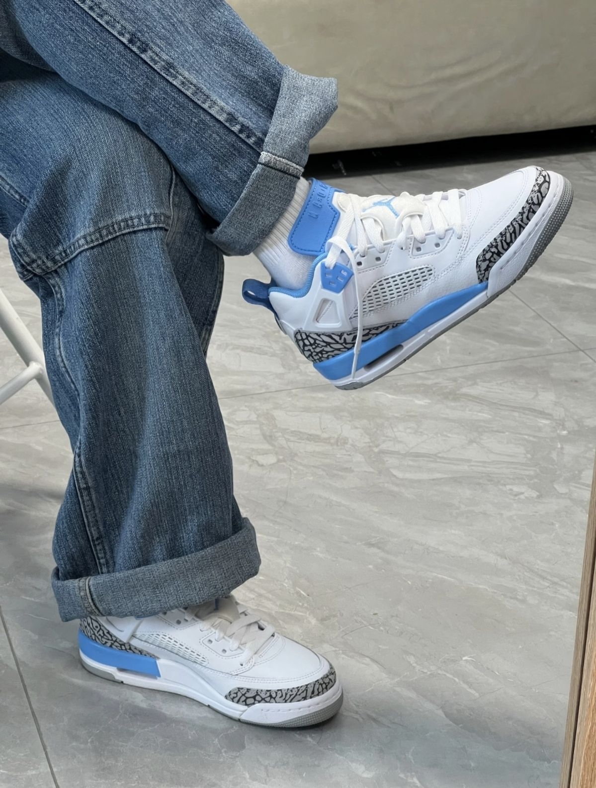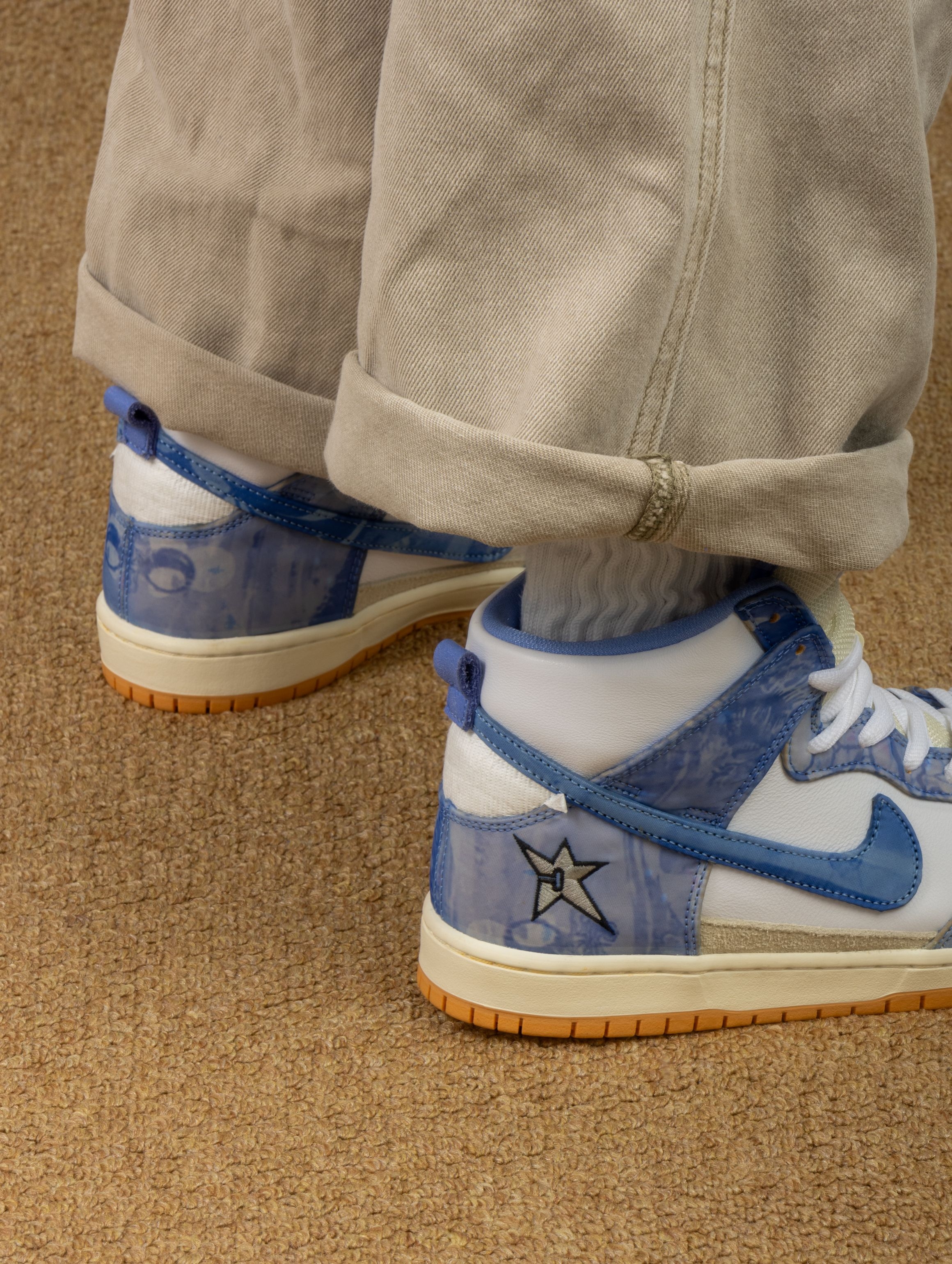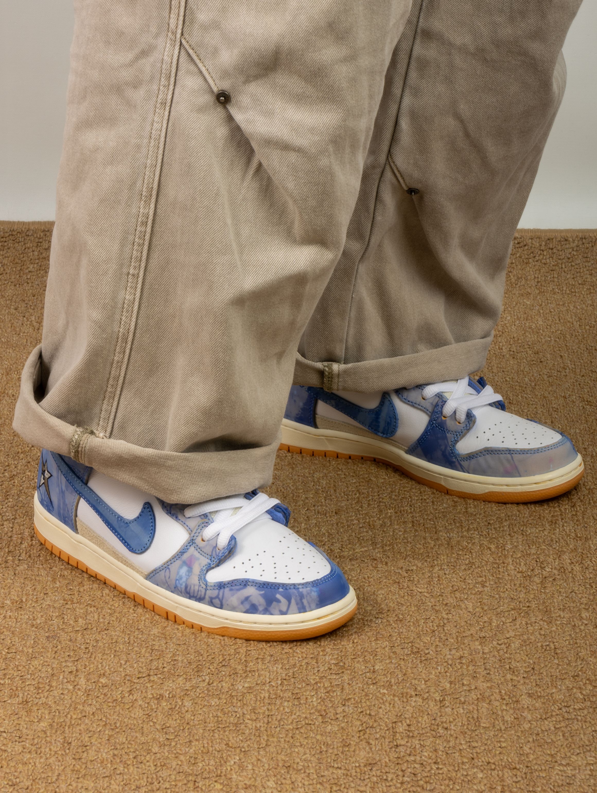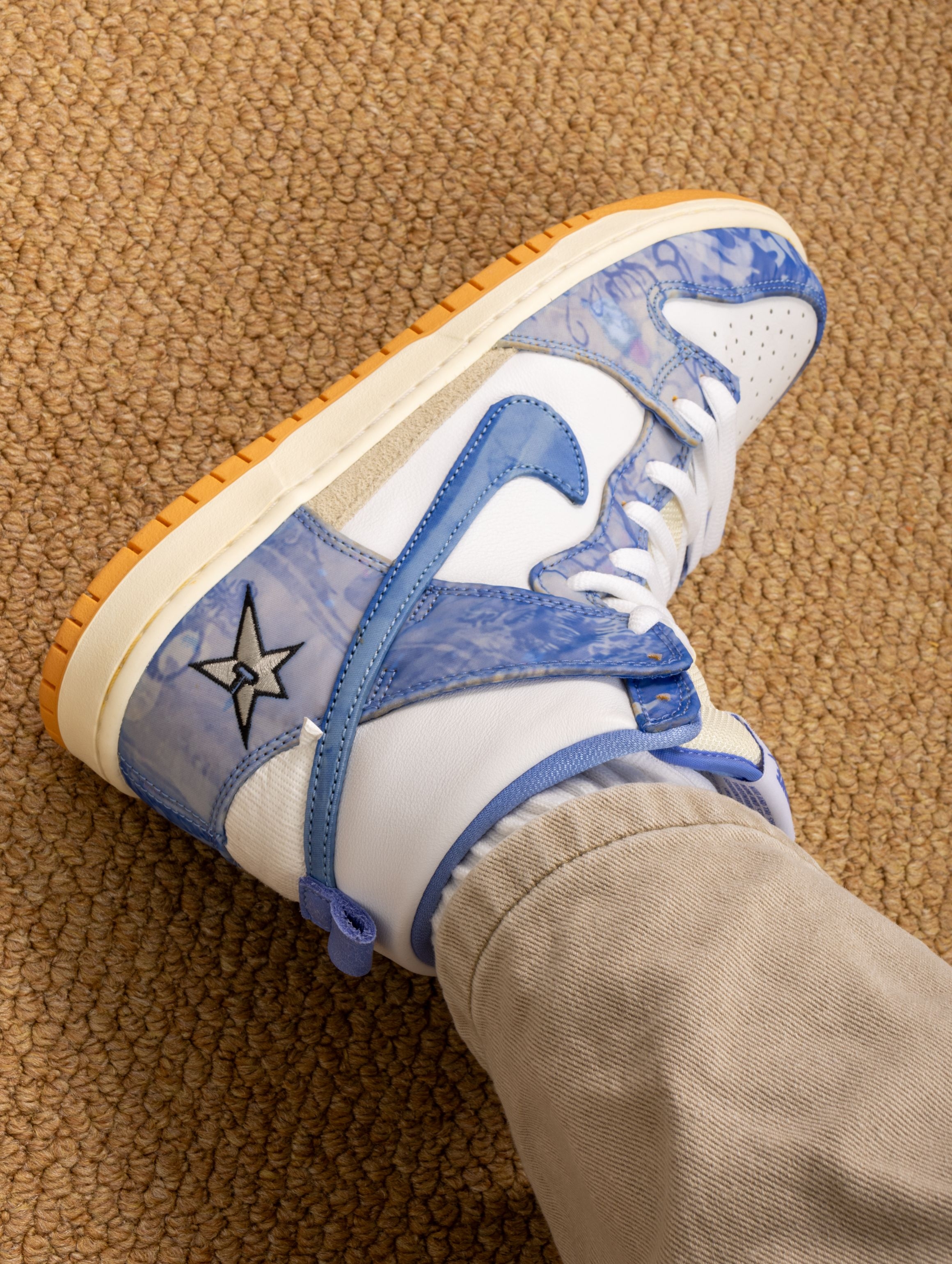 这双地毯公司联名Dunk SB,真是把球鞋玩成了艺术品!白蓝皮革外壳下藏着柔软的米白内层,像拆礼物一样能亲手“撕”出新质感。 上脚惊喜的是它比普通Dunk更软,气垫在脚心微微鼓动,走久也不板脚。我已经忍不住撕开了后跟的一角,露出奶油般的内衬,每天换个心情剥一点,仿佛拥有两双鞋。 搭宽松牛仔裤或工装裙都很出片,撕裂处的毛边自带随性态度。它不仅是双鞋,更是一场关于“破坏与创造”的快乐实验——穿旧了...