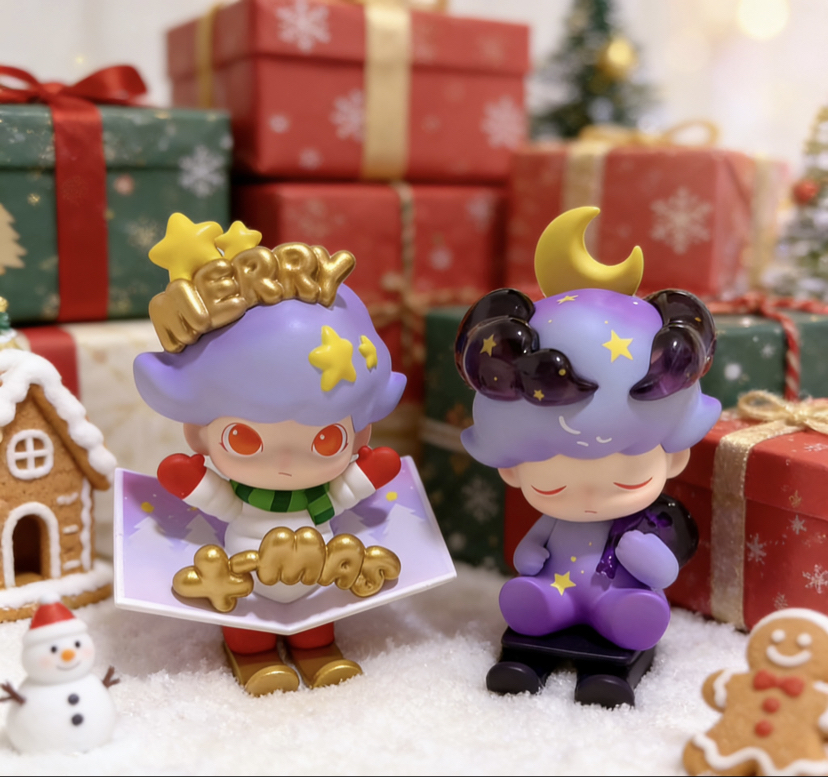 宝子们!终于凑齐这套Dimoo圣诞双子啦,紫调渐变的配色真的美到失语😭 左边是带着MERRY X’MAS的圣诞信使,金闪闪的字母装饰和星星细节超精致;右边的星月款像坠入了紫色星空,透明质感的角和月牙顶饰,梦幻感直接拉满~ 这次搭配了奶白色毛绒背景,特意突出手办的渐变紫调,摆在一起就像把圣诞的星光和浪漫都捏在了手里✨ 有没有宝子也入了这套Dimoo?评论区晒晒你的圣诞款呀~