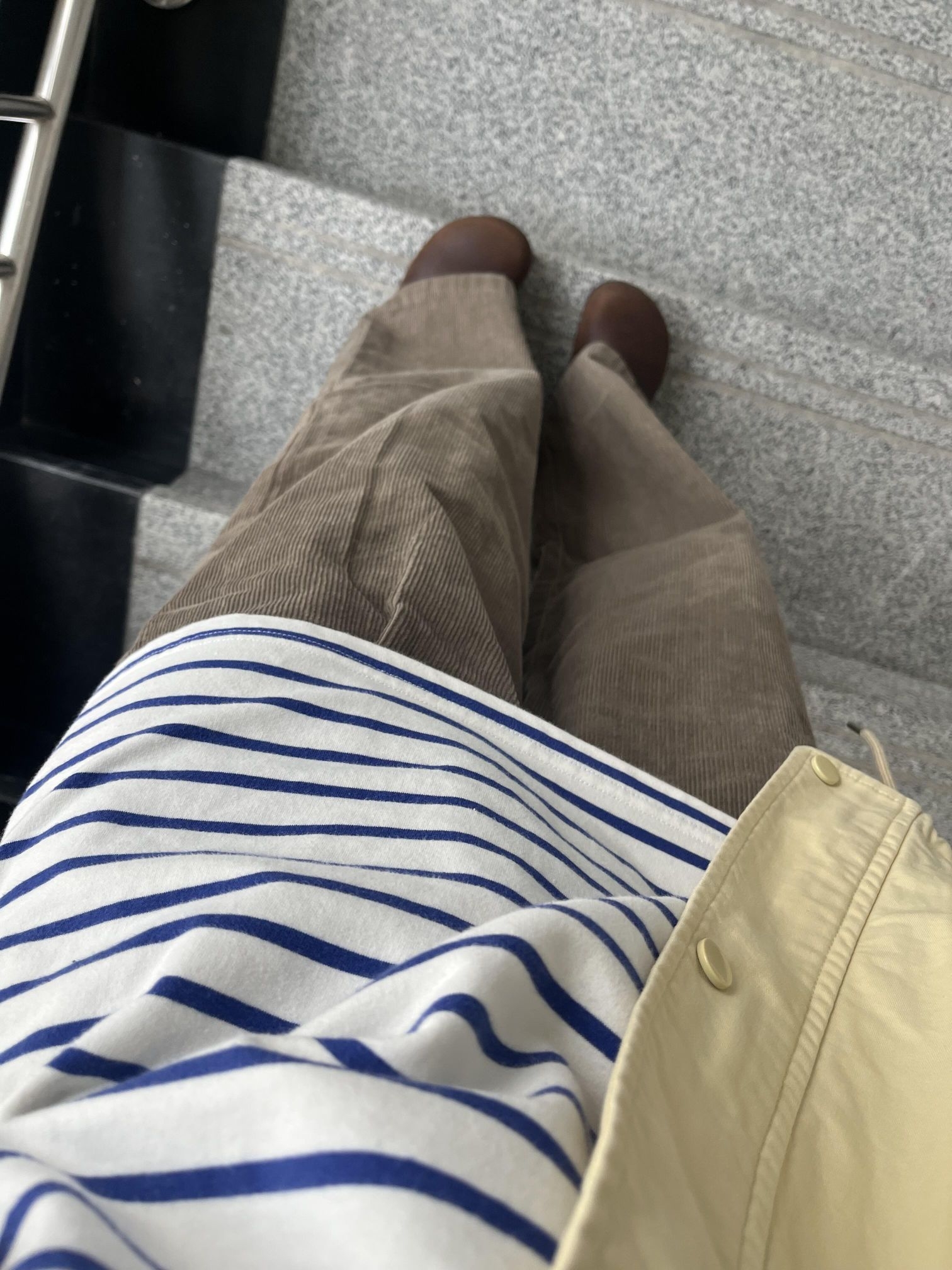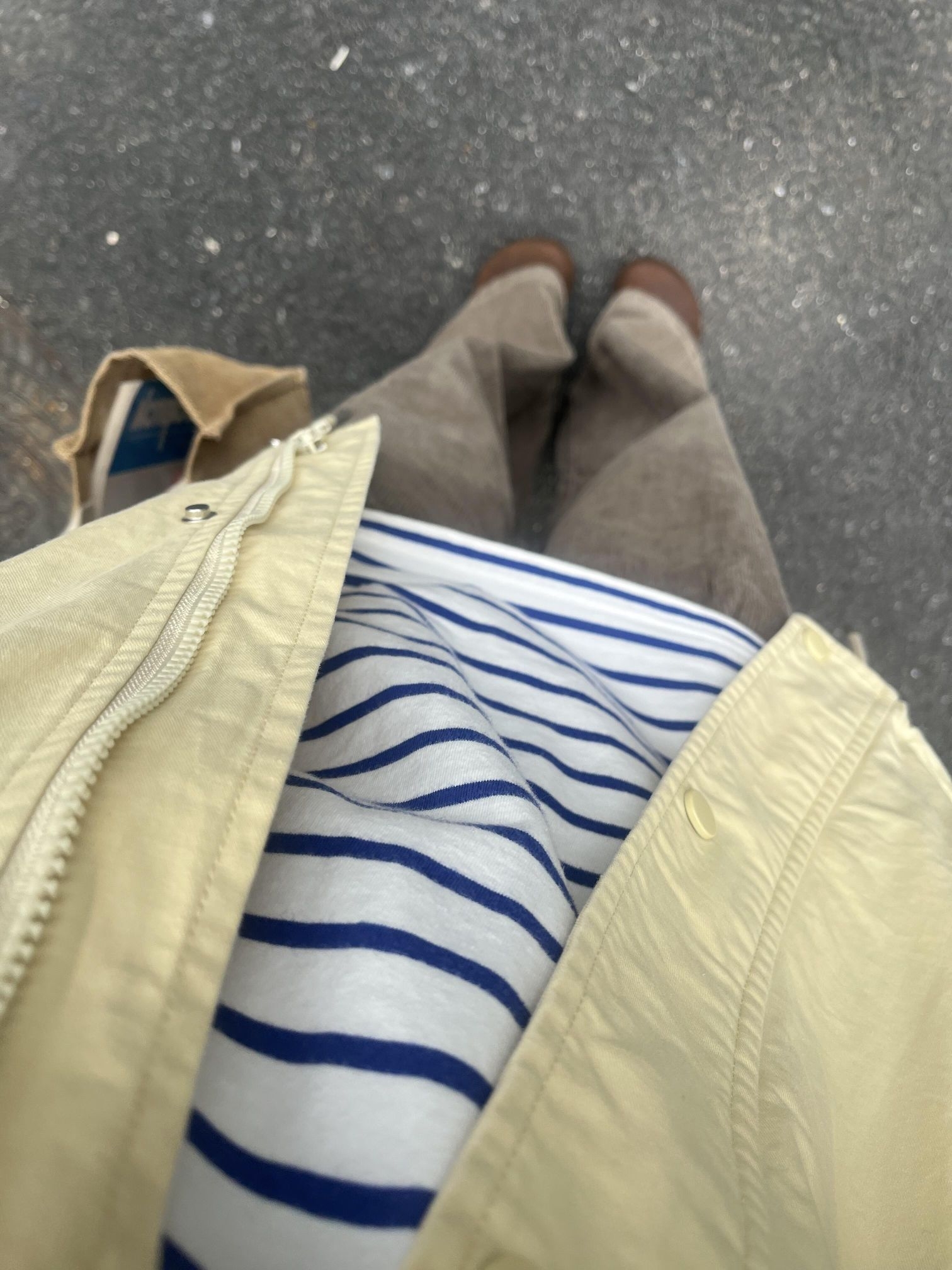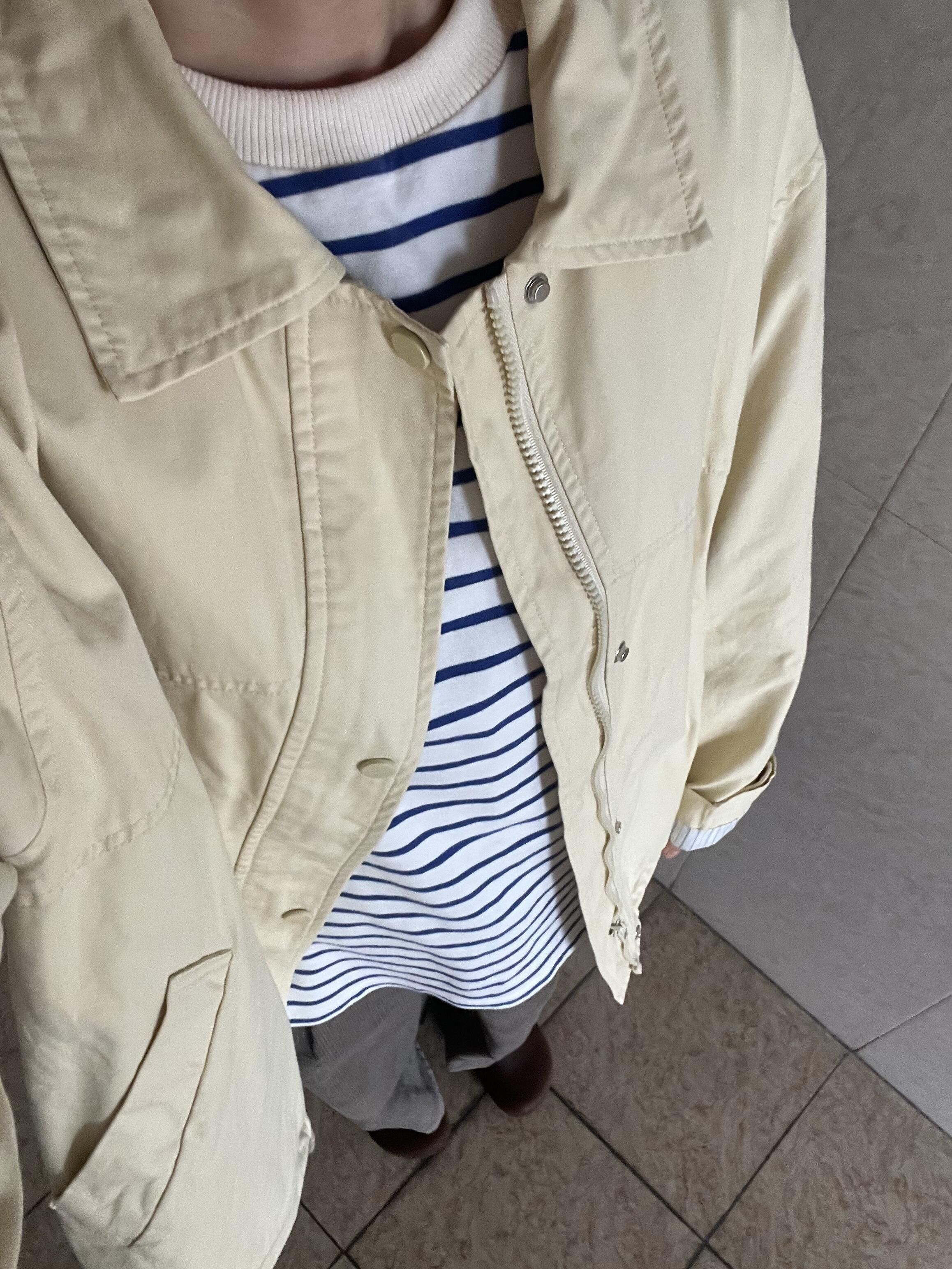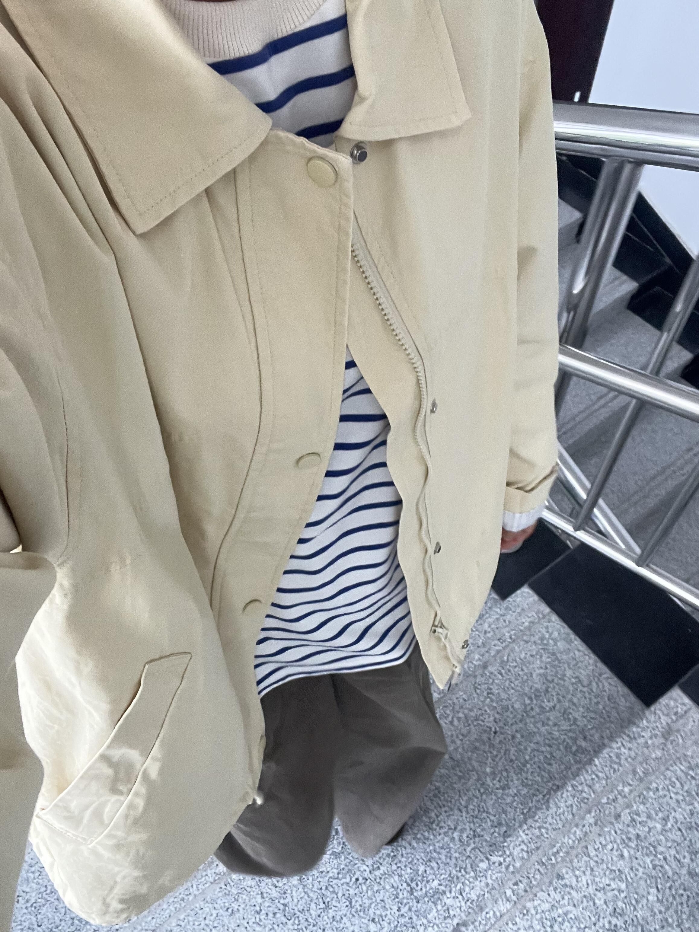 打工日记之下雨天☔️ 阴沉沉的一周好无聊 依旧风衣外套 内搭的条纹衫和卷起的袖子内衬搭配上了 暗绿色的灯芯绒裤复古味满满