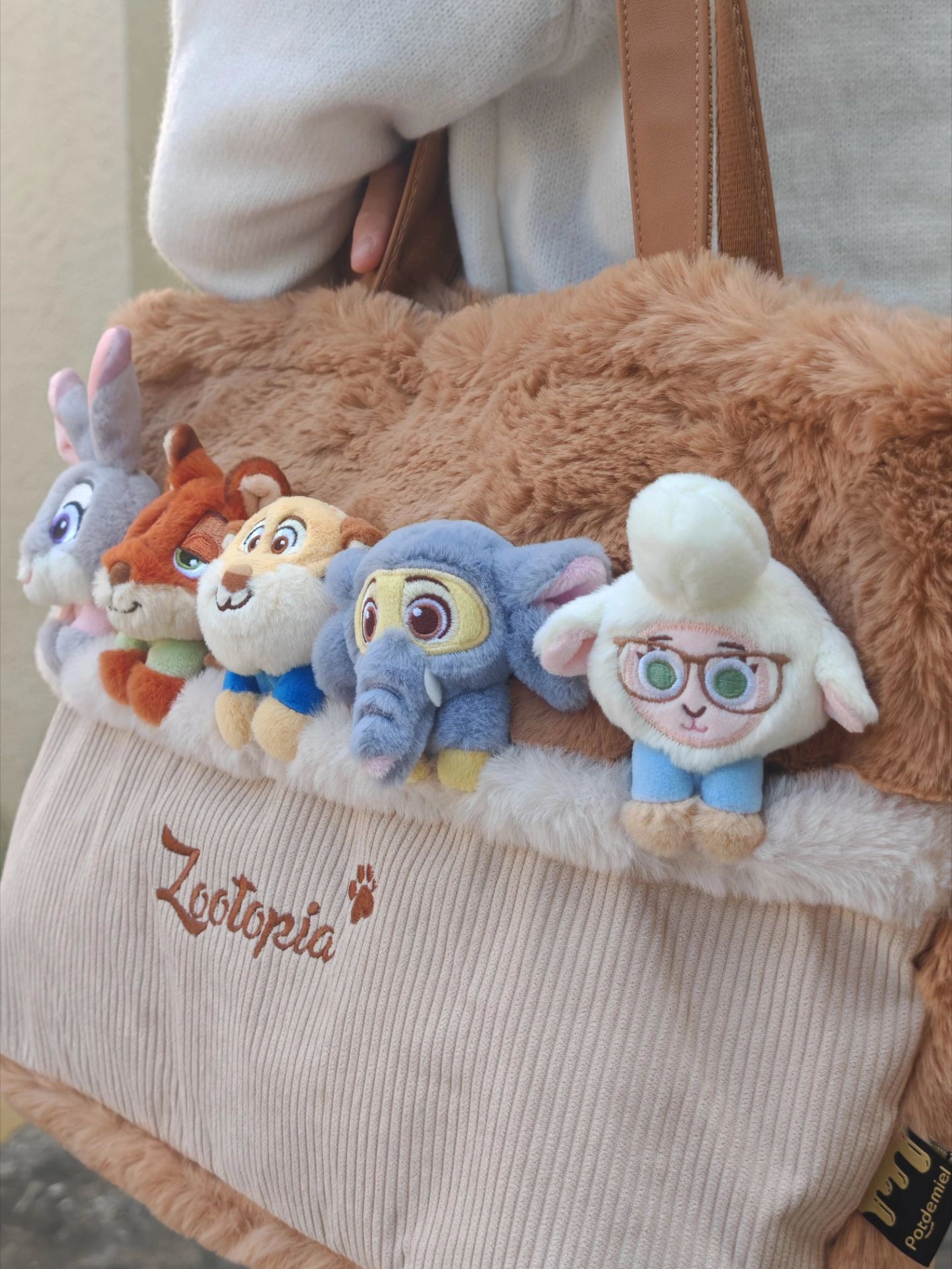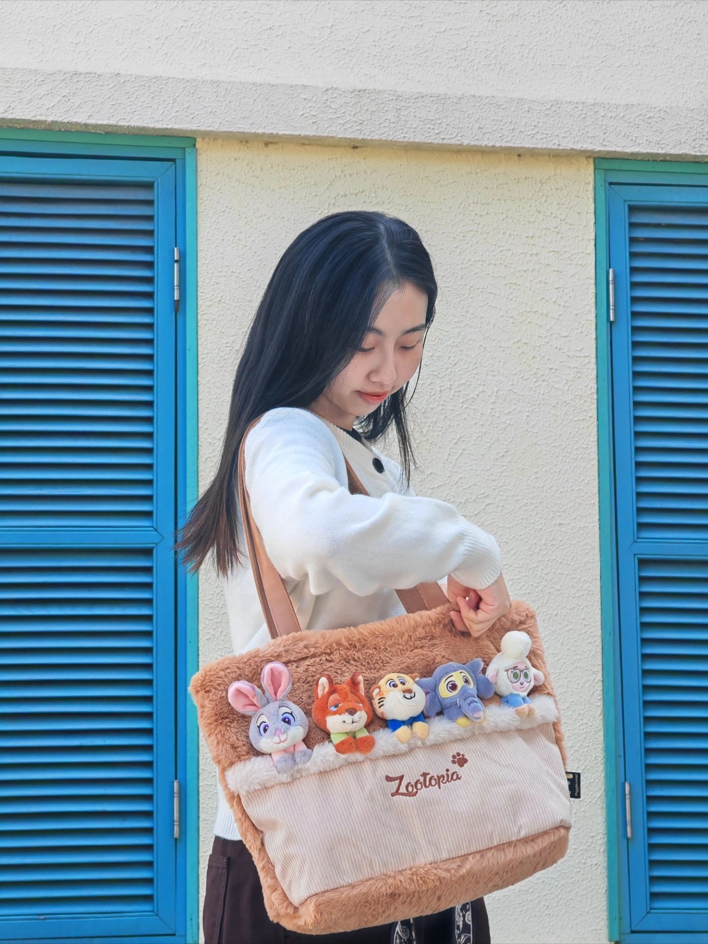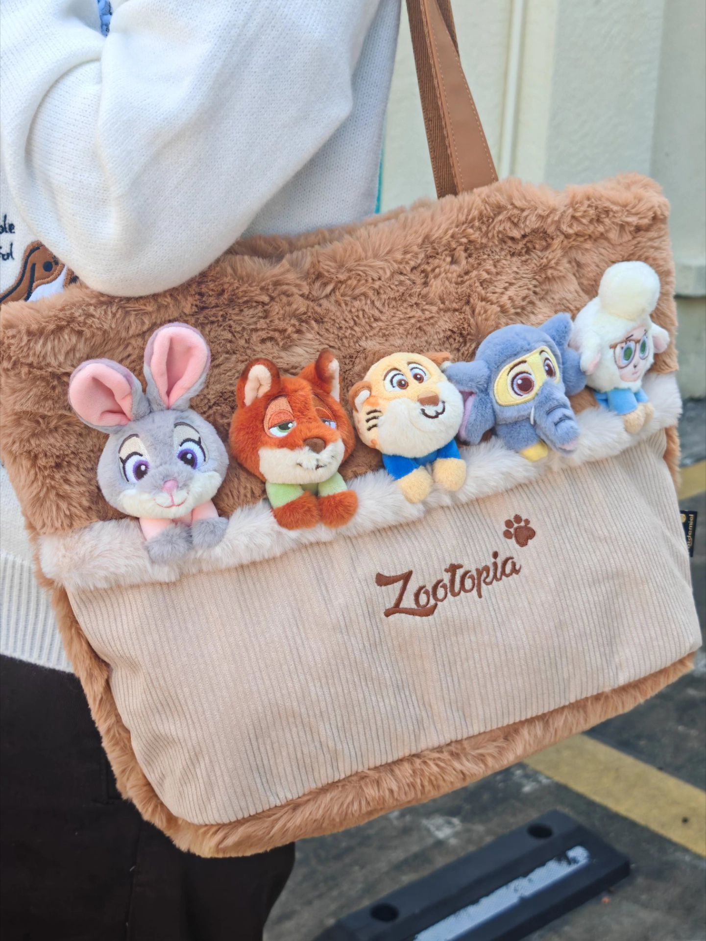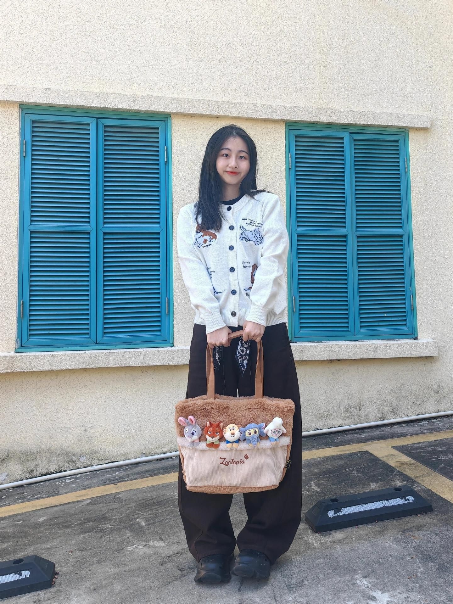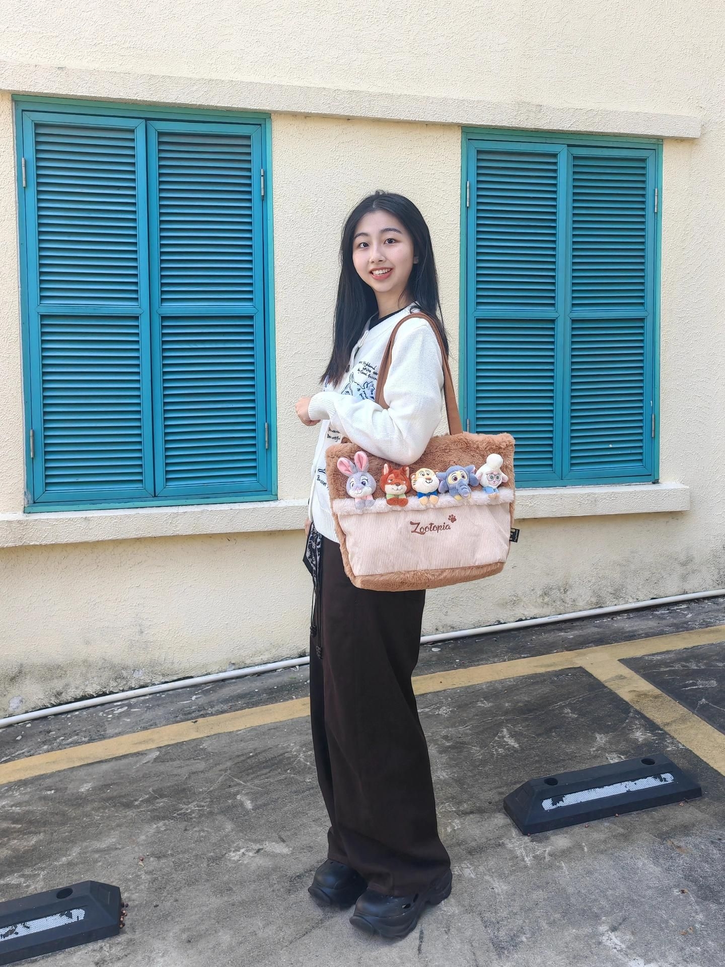 今天出门迎秋🍂 一件白色针织外套搭棕色牛仔裤和黑色鞋 拿上有疯狂动物城5只小可爱的毛绒托特包👜 想不引人注目都难哈哈哈! 包包容量妥妥的 通勤旅游逛街都🉑 而且很好搭配 穿搭基础 背上它就不基础啦😝