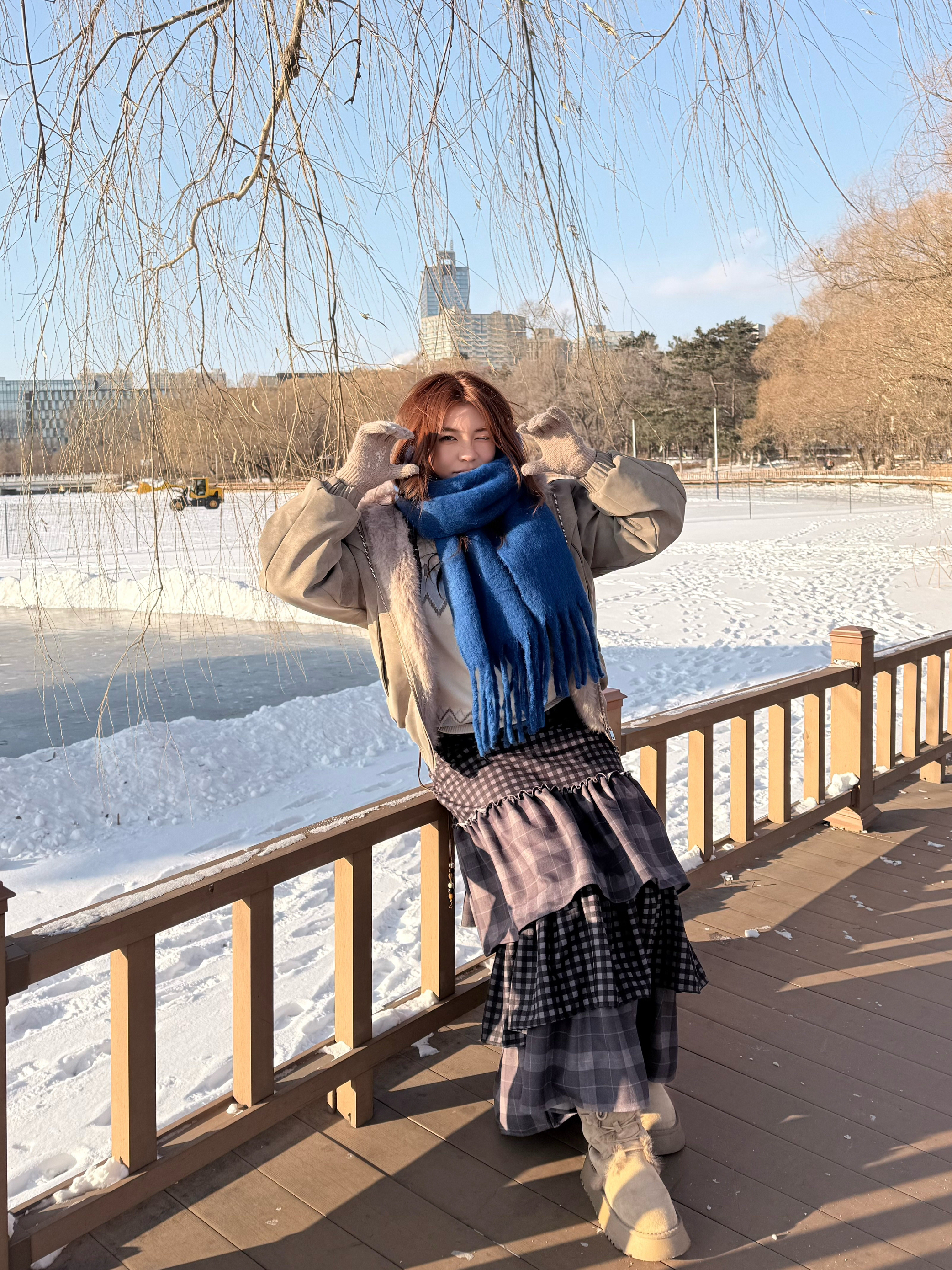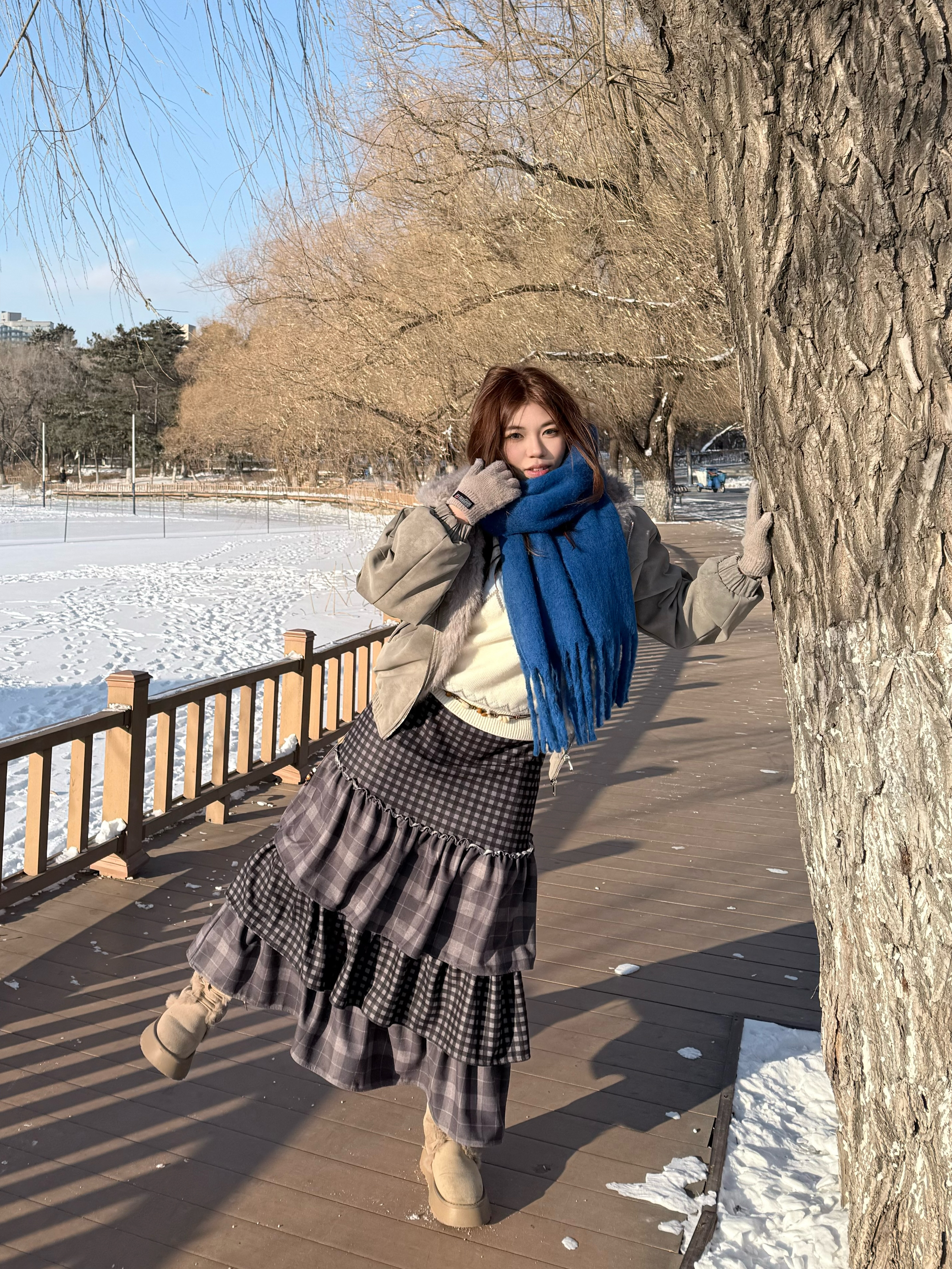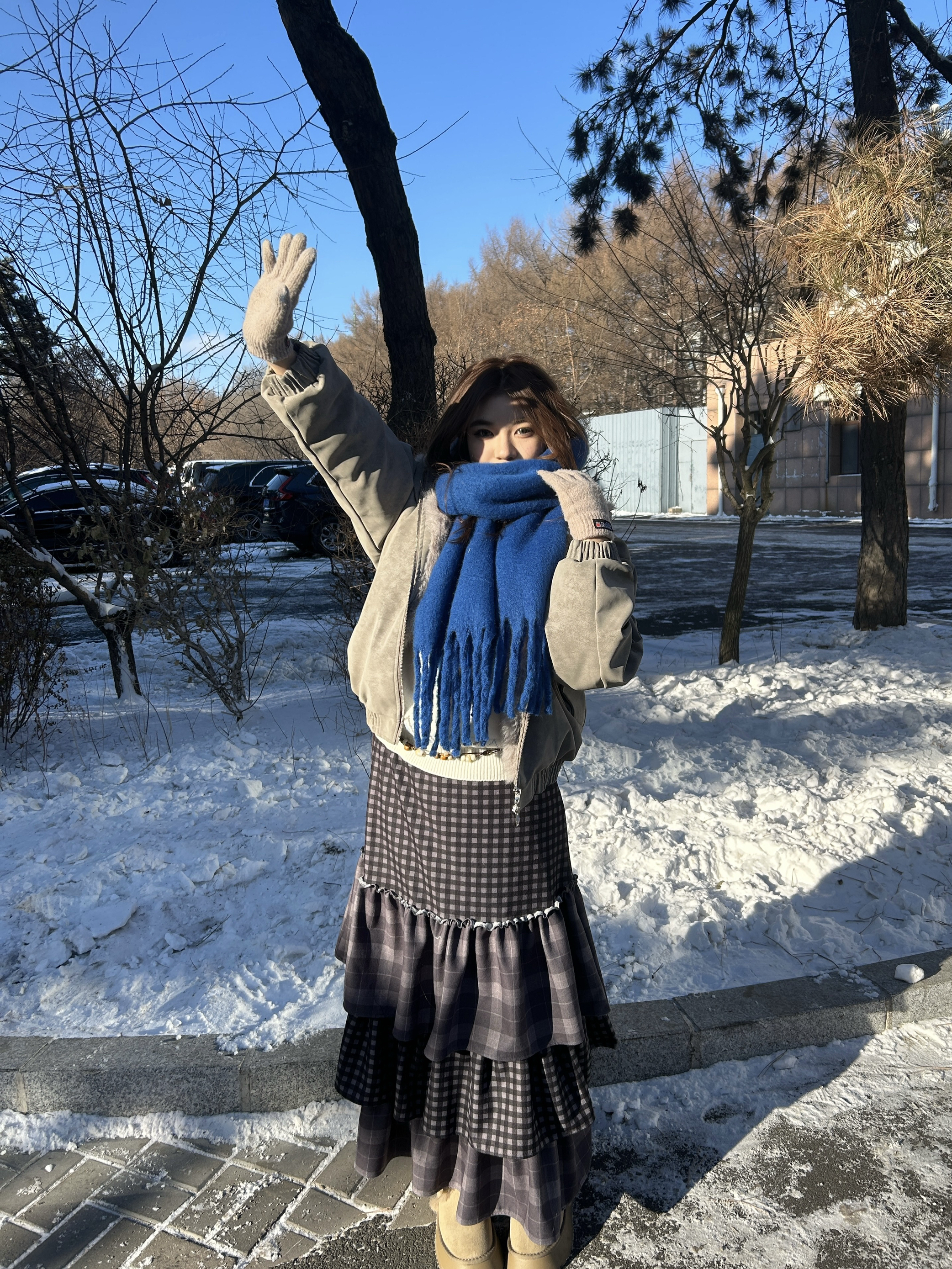 👔浅卡其色座山雕 毛绒拼接增添了冬日的温暖感与复古氛围 版型的宽松能藏住内搭的厚重感不显臃肿 内搭是蓝白色费尔岛针织毛衣 柔软的质感中和了整体的硬朗 👖格纹蛋糕半身裙 多层荷叶边设计增加了裙摆的蓬松感和灵动感 深灰与黑色的格纹复古又百搭 👞浅卡其色厚底雪地靴 🧣克莱因蓝围巾 这件围巾是整套穿搭的视觉焦点 高饱和度的蓝色在素净的雪景里格外亮眼 与浅色系的衣装形成强烈撞色打破沉闷 整体穿搭冷暖色系...