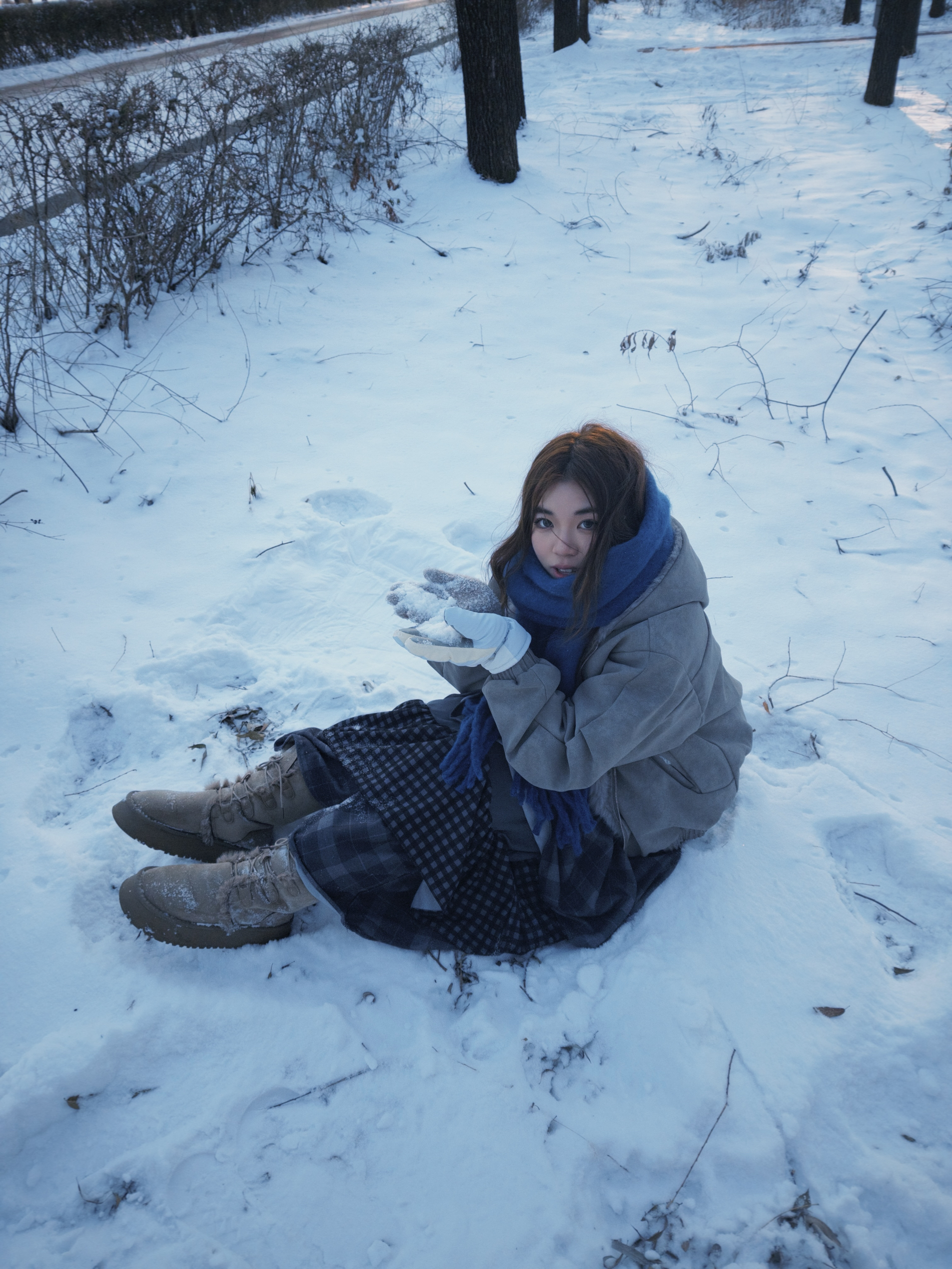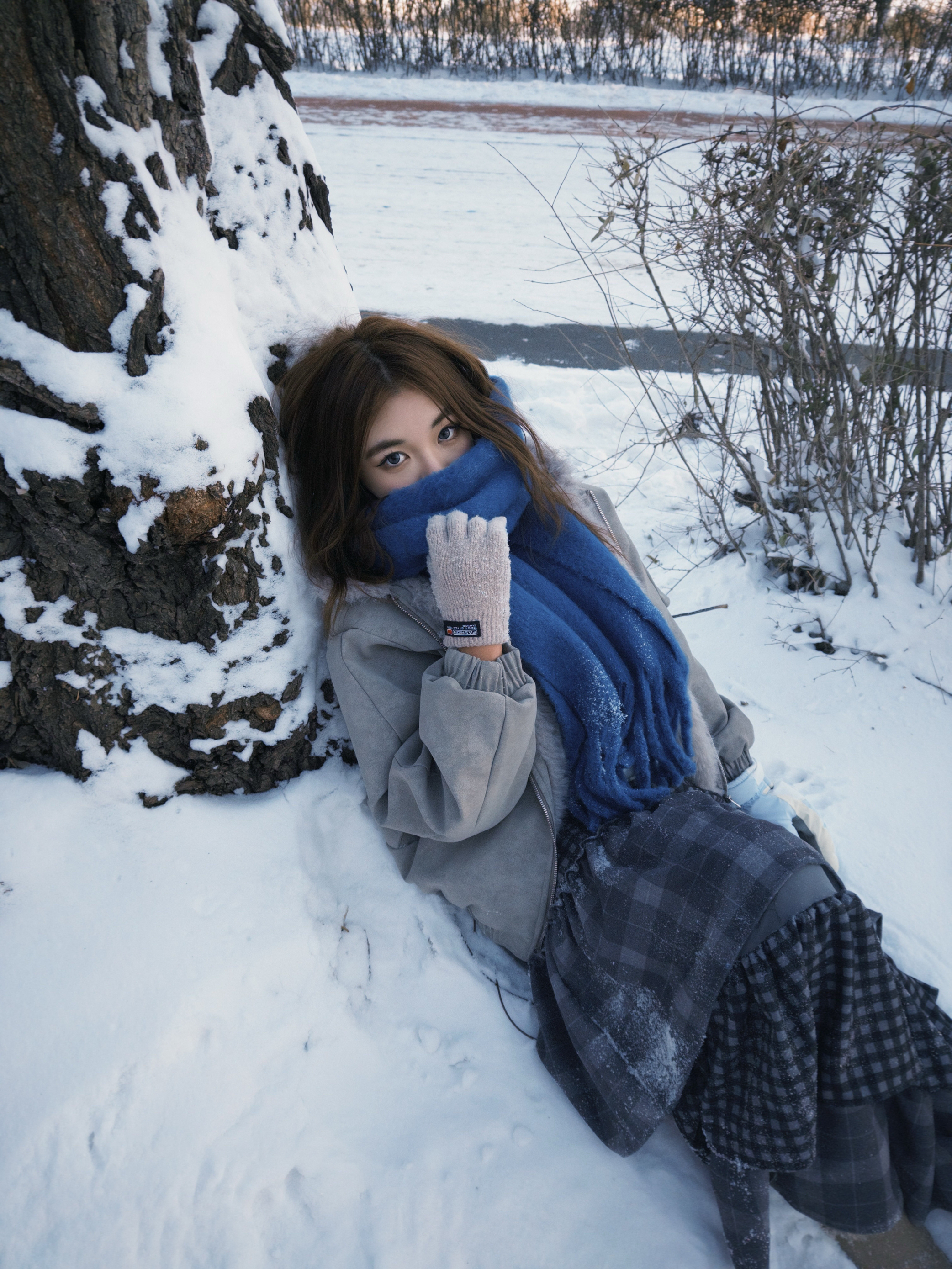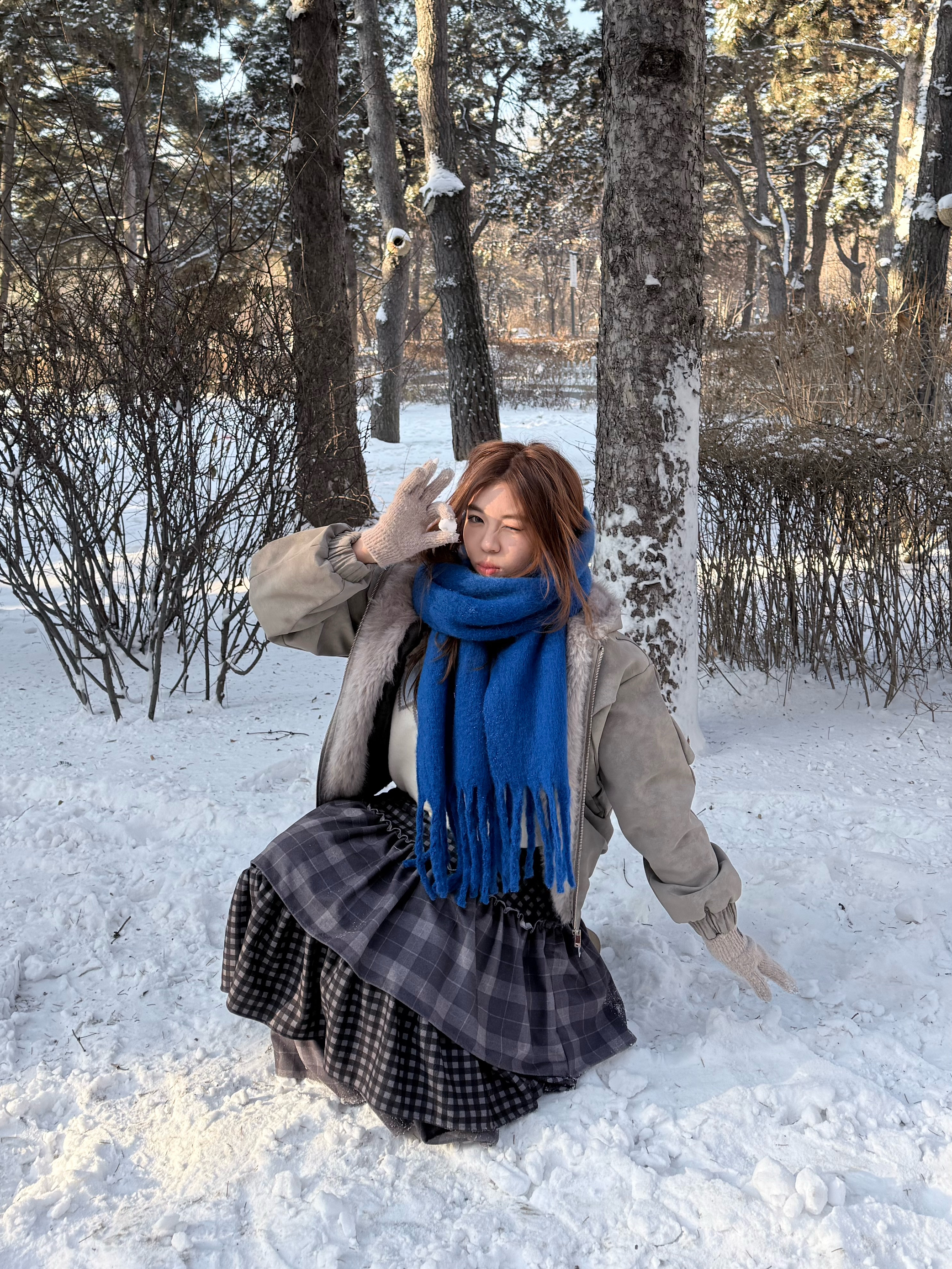 👔浅卡其色座山雕 毛绒拼接增添了冬日的温暖感与复古氛围 版型的宽松能藏住内搭的厚重感不显臃肿 内搭是蓝白色费尔岛针织毛衣 柔软的质感中和了整体的硬朗 👖格纹蛋糕半身裙 多层荷叶边设计增加了裙摆的蓬松感和灵动感 深灰与黑色的格纹复古又百搭 👞浅卡其色厚底雪地靴 🧣克莱因蓝围巾 这件围巾是整套穿搭的视觉焦点 高饱和度的蓝色在素净的雪景里格外亮眼 与浅色系的衣装形成强烈撞色打破沉闷 整体穿搭冷暖色系...