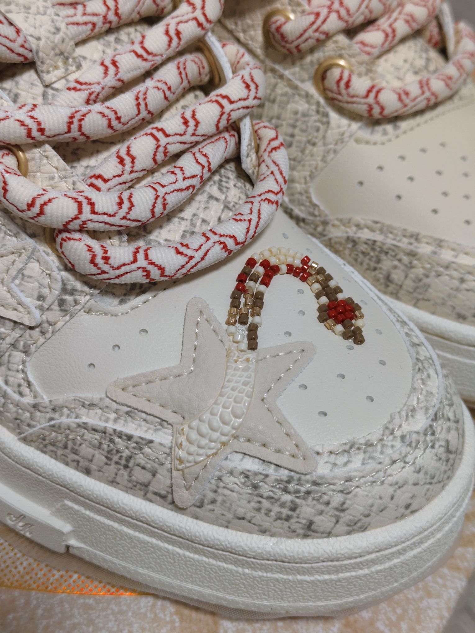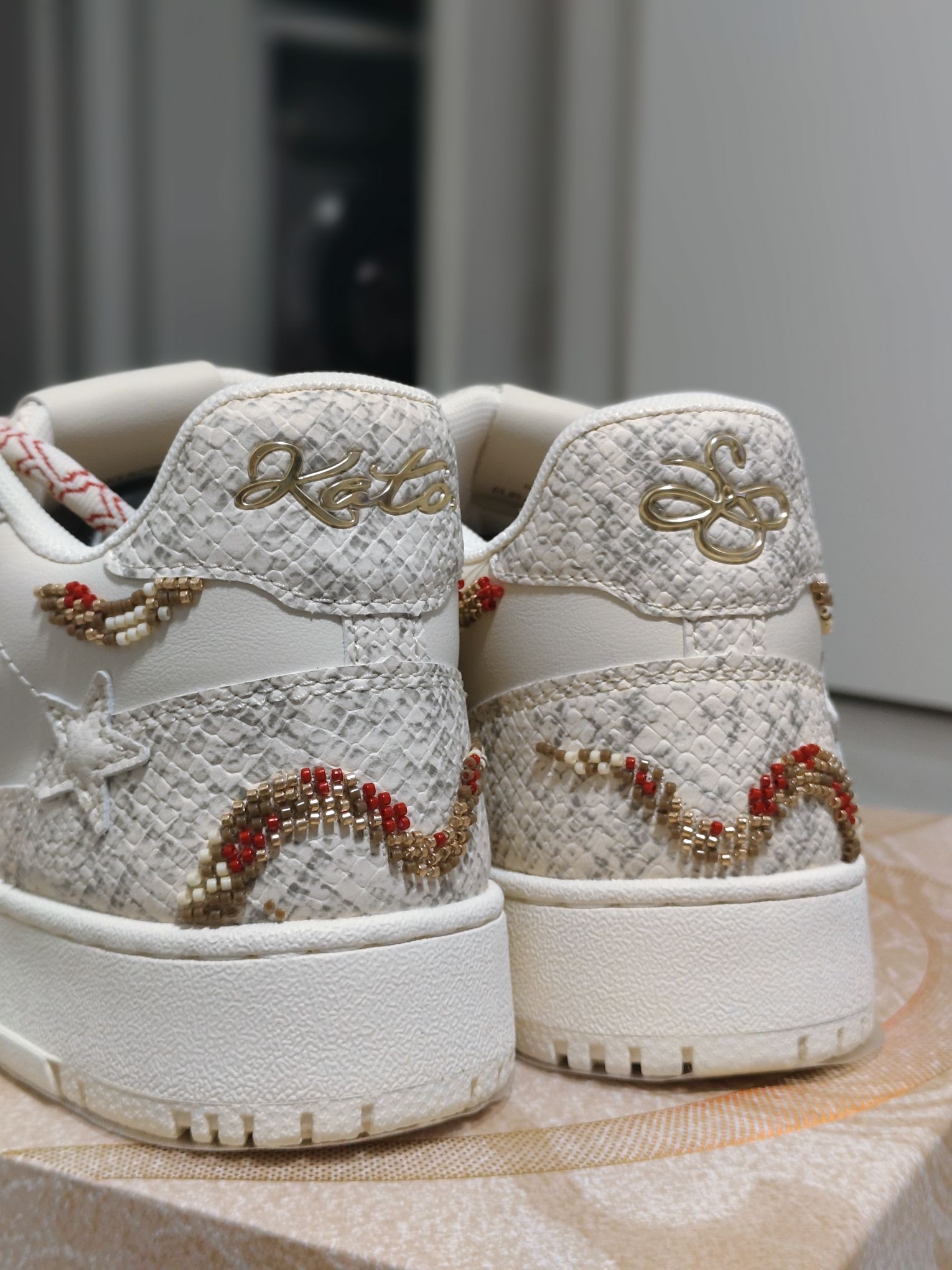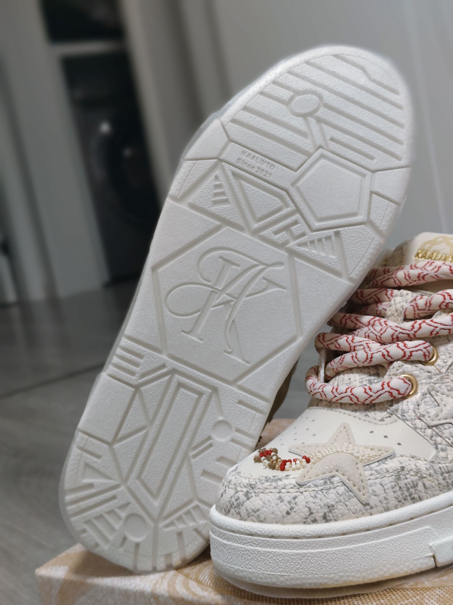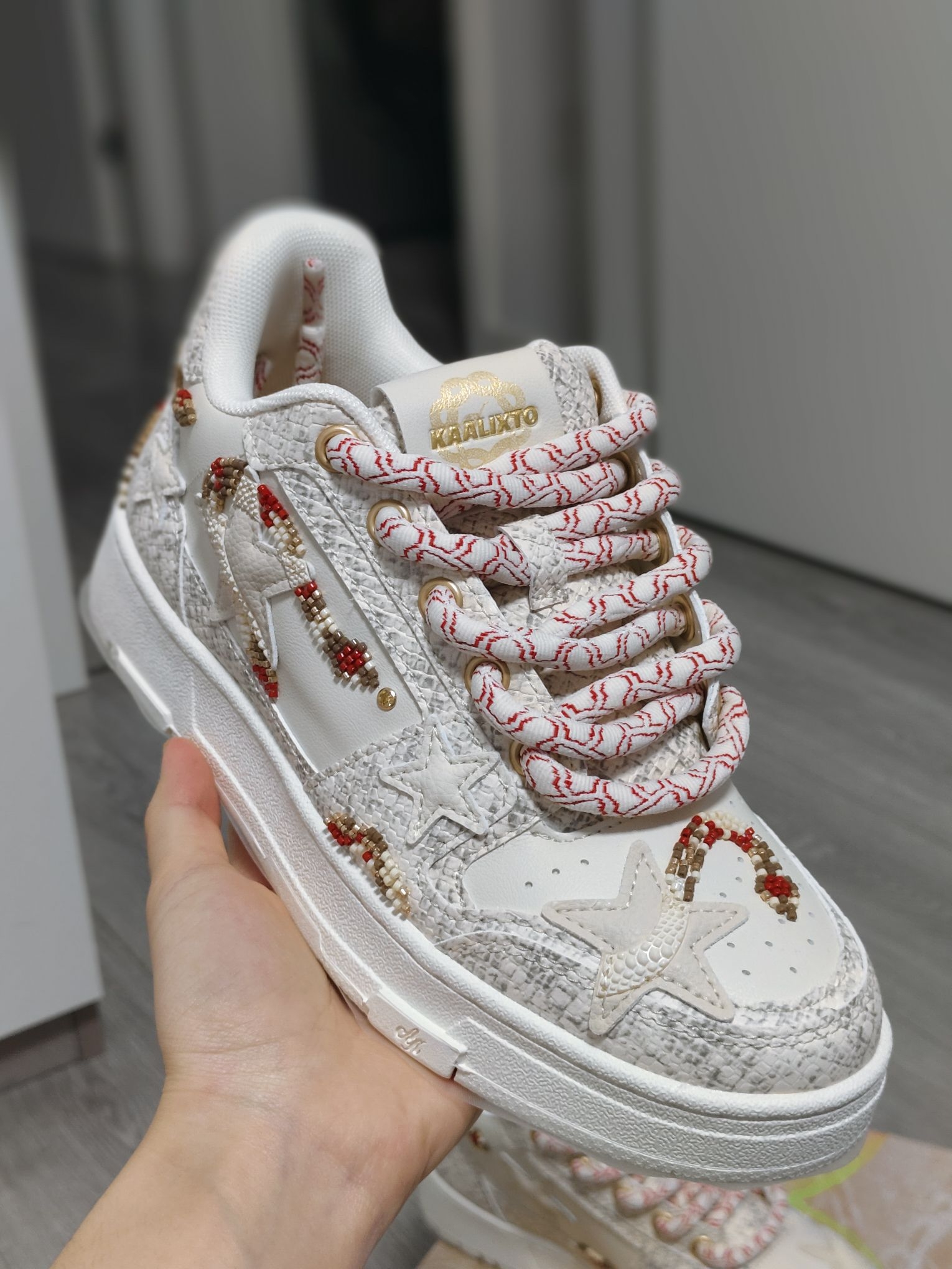 马上就要迎来2026年啦,抓住蛇年的小尾巴,分享2025年我鞋柜的c位,这双Kaalixto“蛇年限定”(白蛇配色)。 一上脚那熟悉的kaa板鞋脚感真的太舒服了! 鞋面点缀着蛇形串珠,如同一条蛇在鞋上盘旋,让鞋子整体更有灵动感。颜色不是那种纯白,有点淡黄色刚刚好!