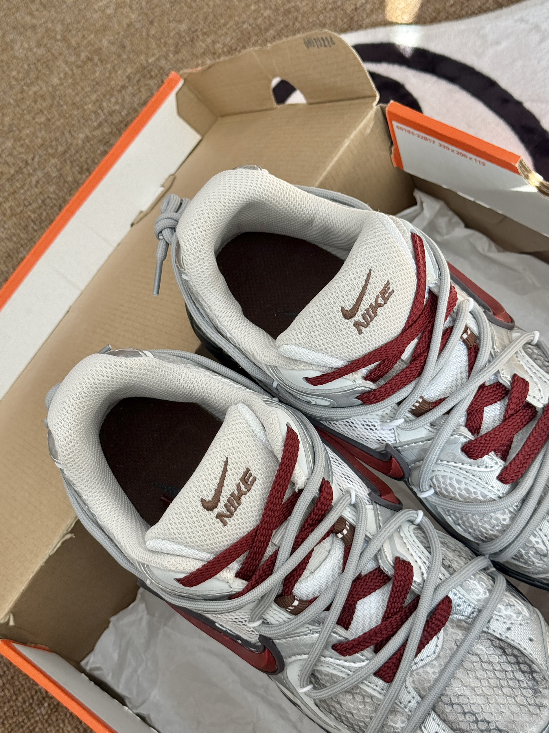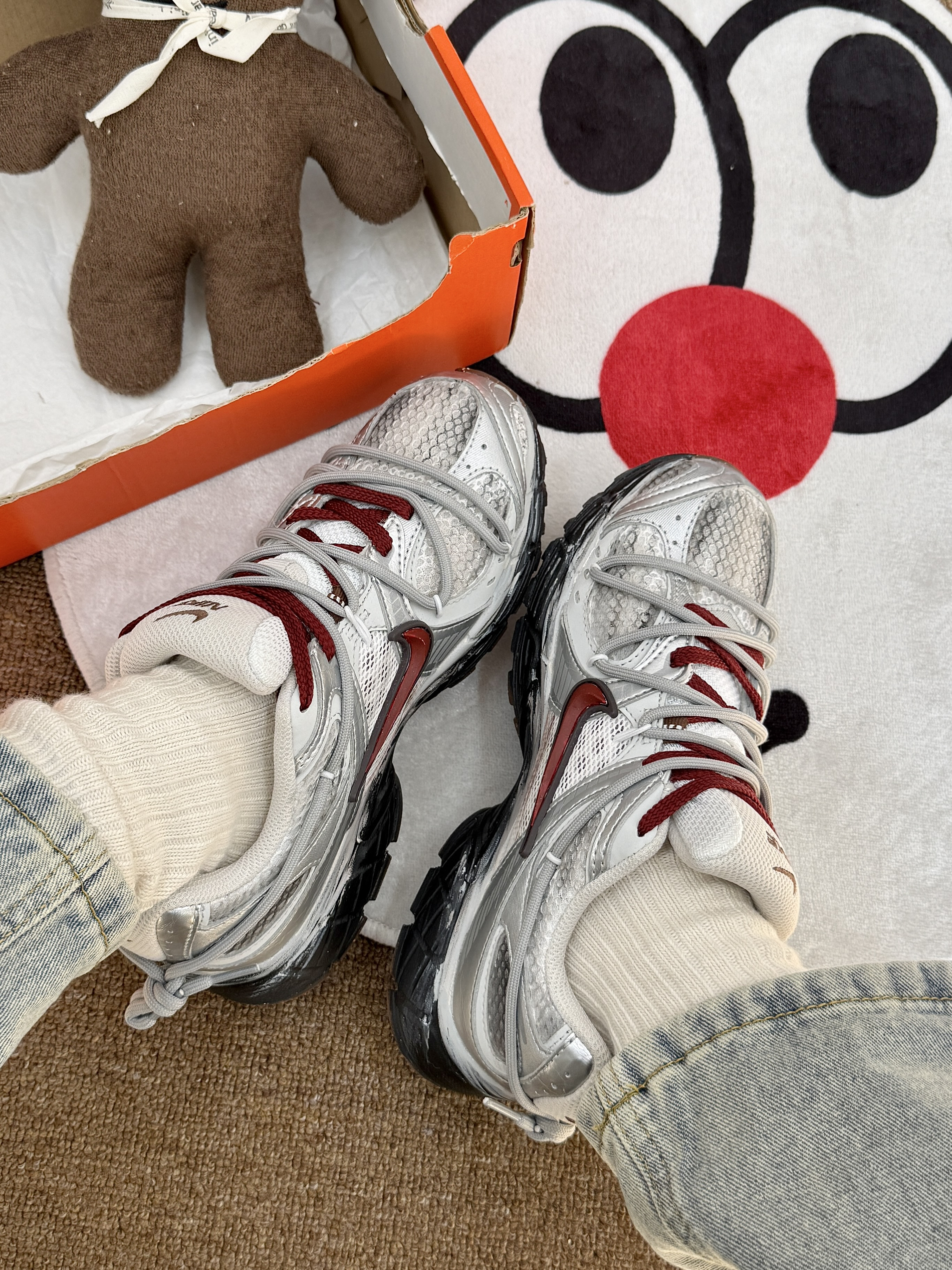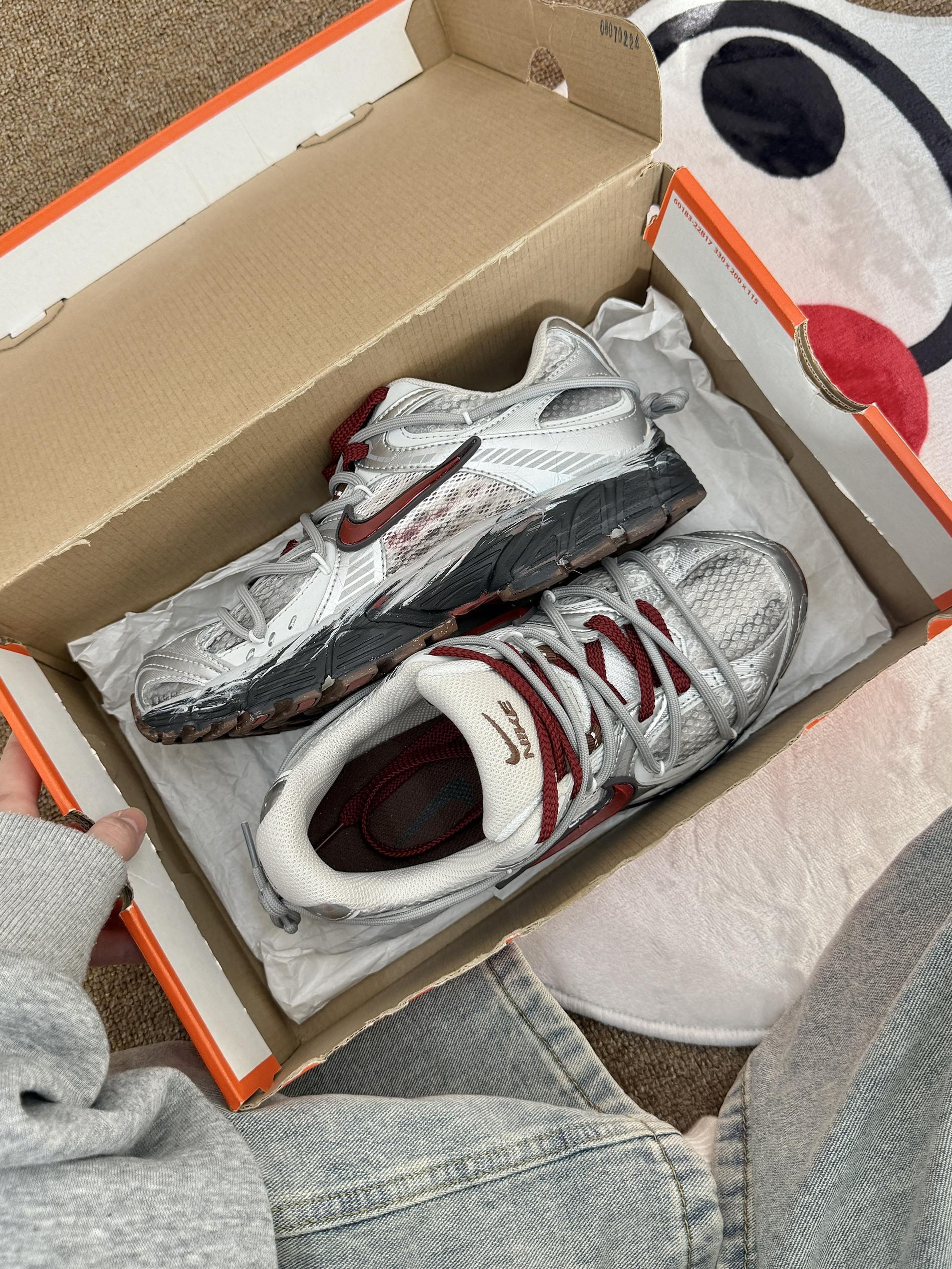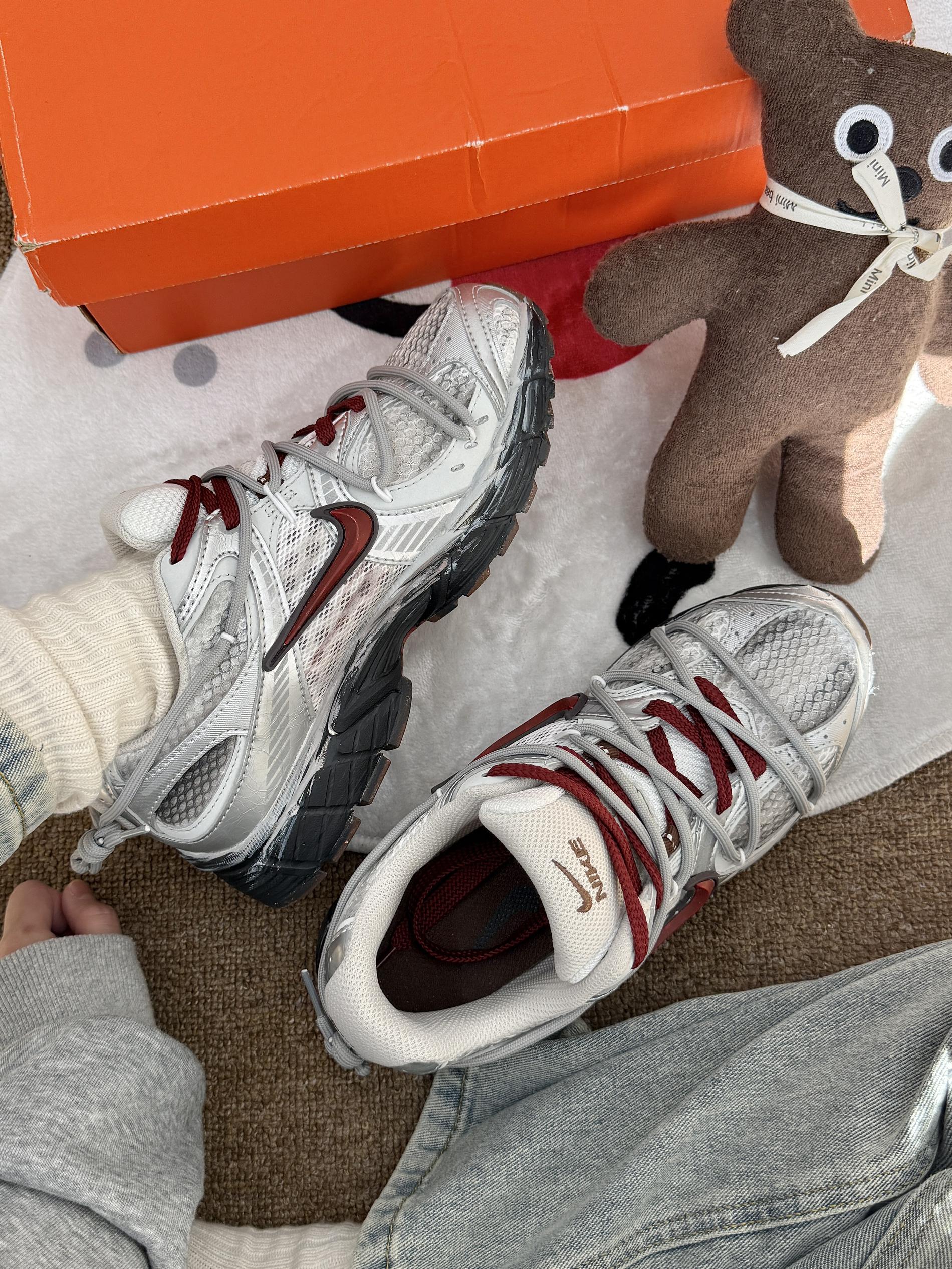 第一眼就被它的做旧设计狠狠拿捏了米白网布基底混着做旧的灰调,酒红色Swoosh和鞋绳做点缀,鞋底的磨损做旧效果直接拉满废土机能感,鞋身的分层结构还透着复古老爹鞋的味儿 材质上用了透气网布做主体,搭配合成革加固鞋身,脚感透气不闷,支撑性也在线;橡胶大底做了防滑纹路,抓地还不错。优点是设计感独一份,日常出街回头率拉满,脚感也适合通勤;缺点是做旧网面容易勾丝,清洁起来得轻手轻脚。