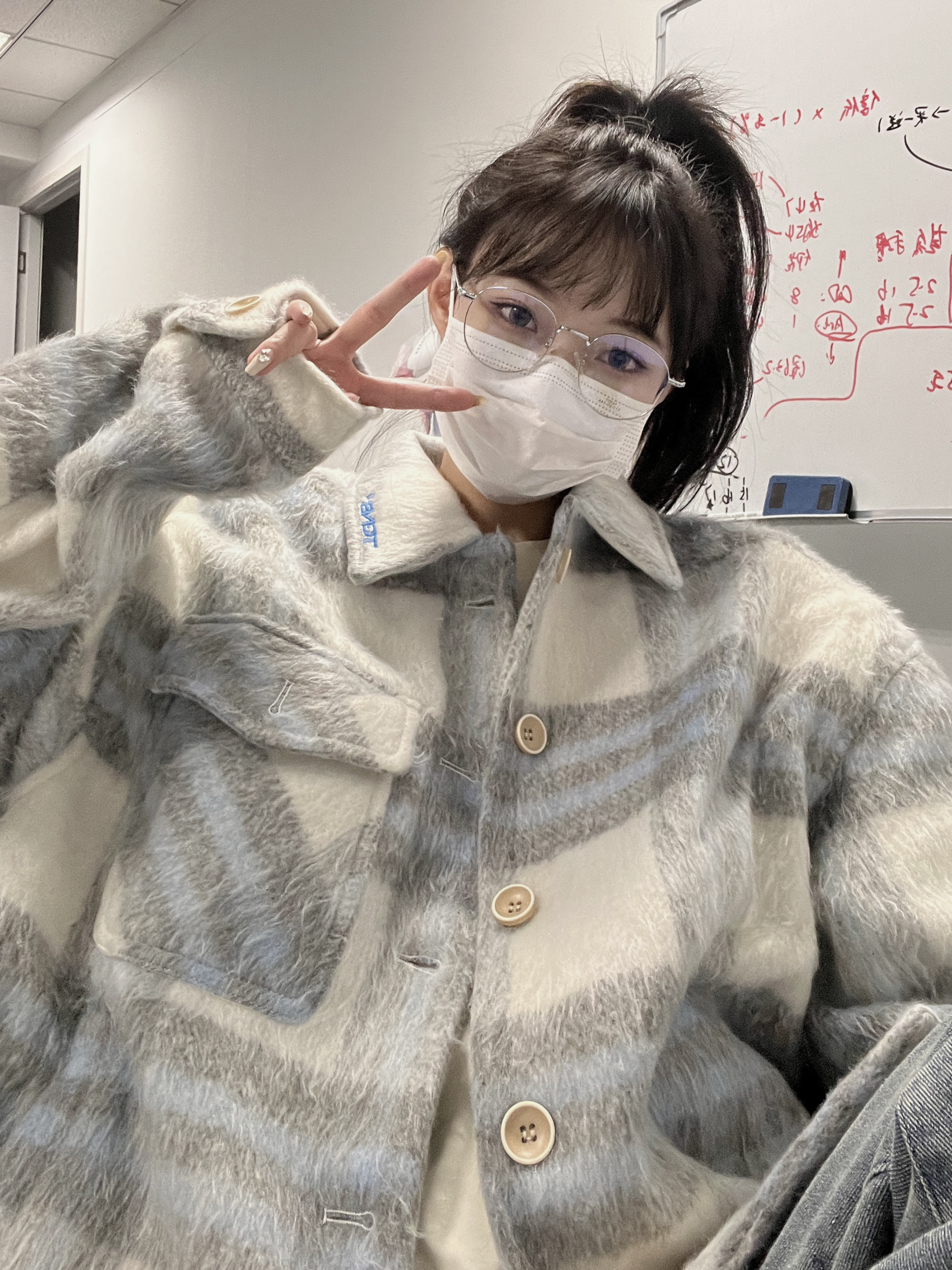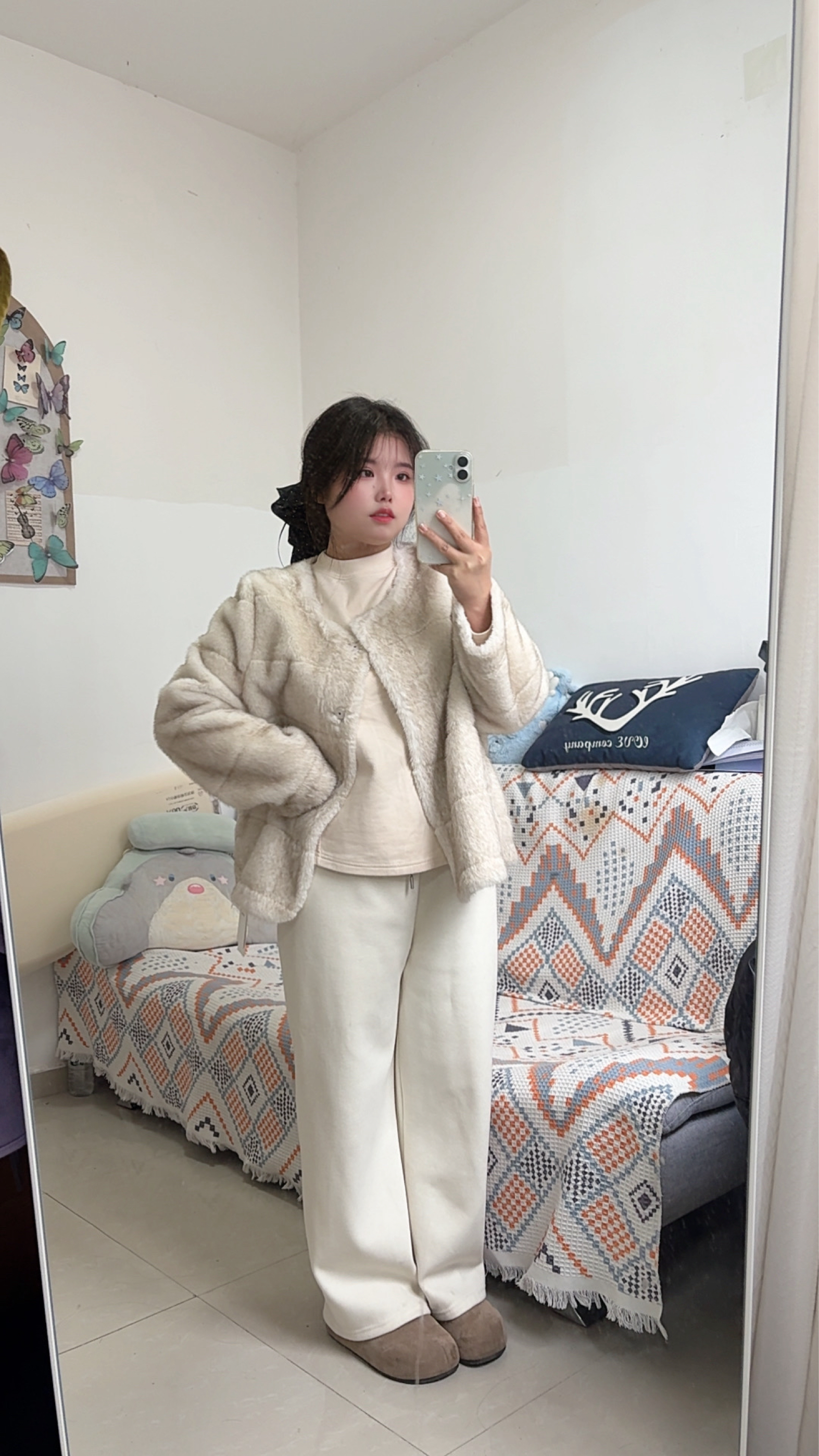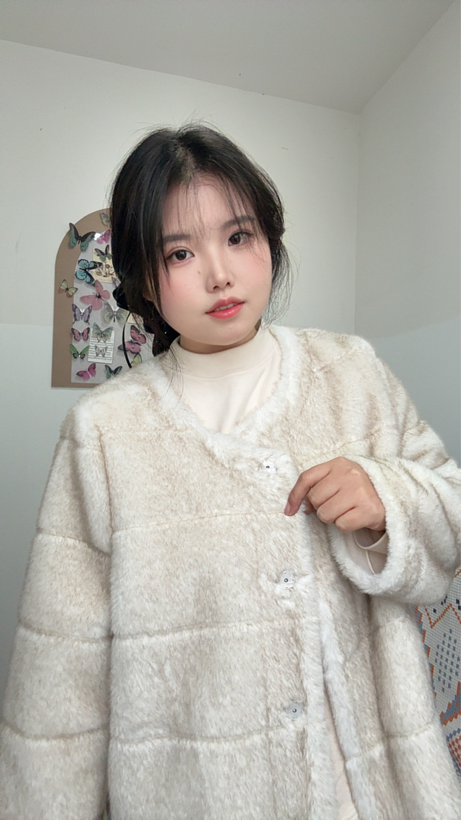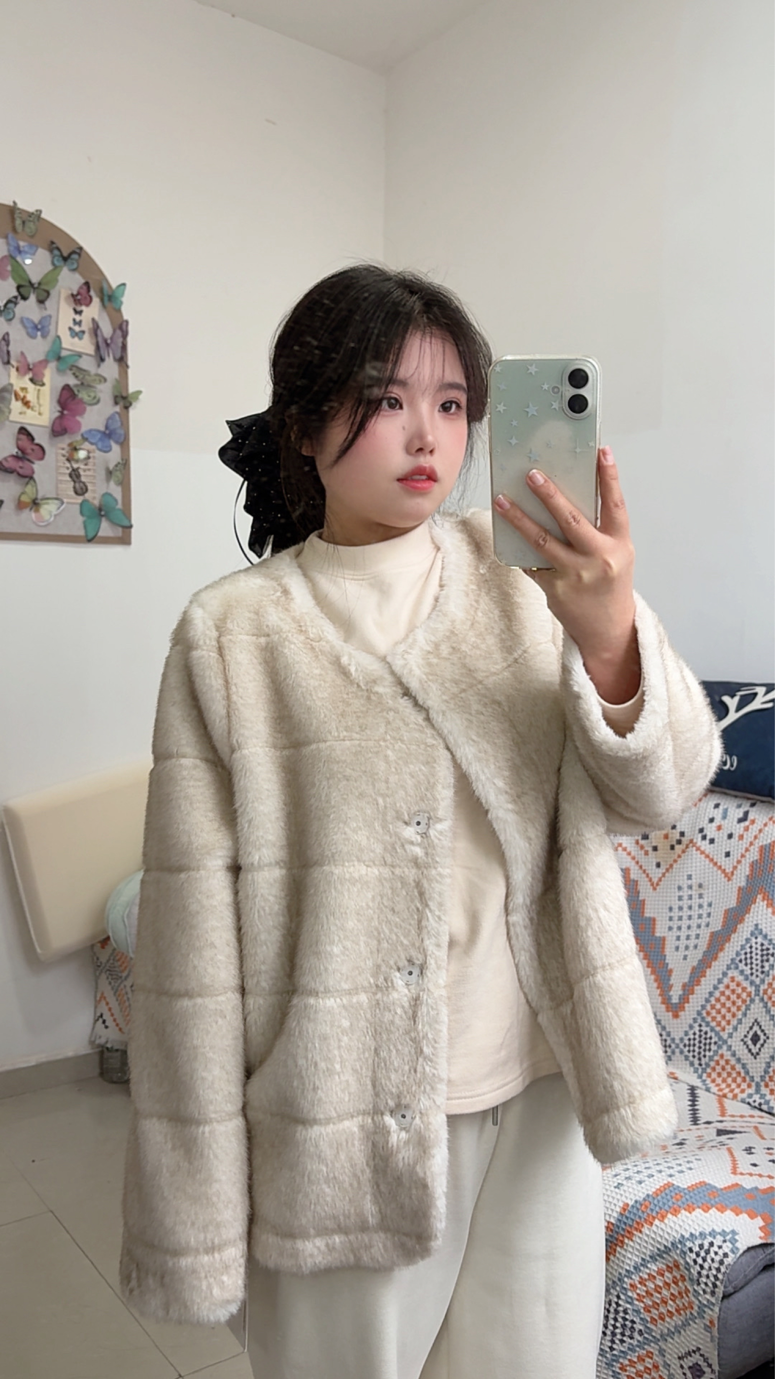 这件奶杏色毛毛外套真的挖到宝了!毛绒质感软乎乎的,贴身穿也不扎,摸起来像撸猫一样舒服~无领的设计简约又大气,搭配同色系高领内搭,温柔感直接拉满。版型是微宽松的,对身材的包容度超赞,穿上自带慵懒氛围感,秋冬出门搭牛仔裤、半身裙都合适,保暖又好看,真的爱惨了!