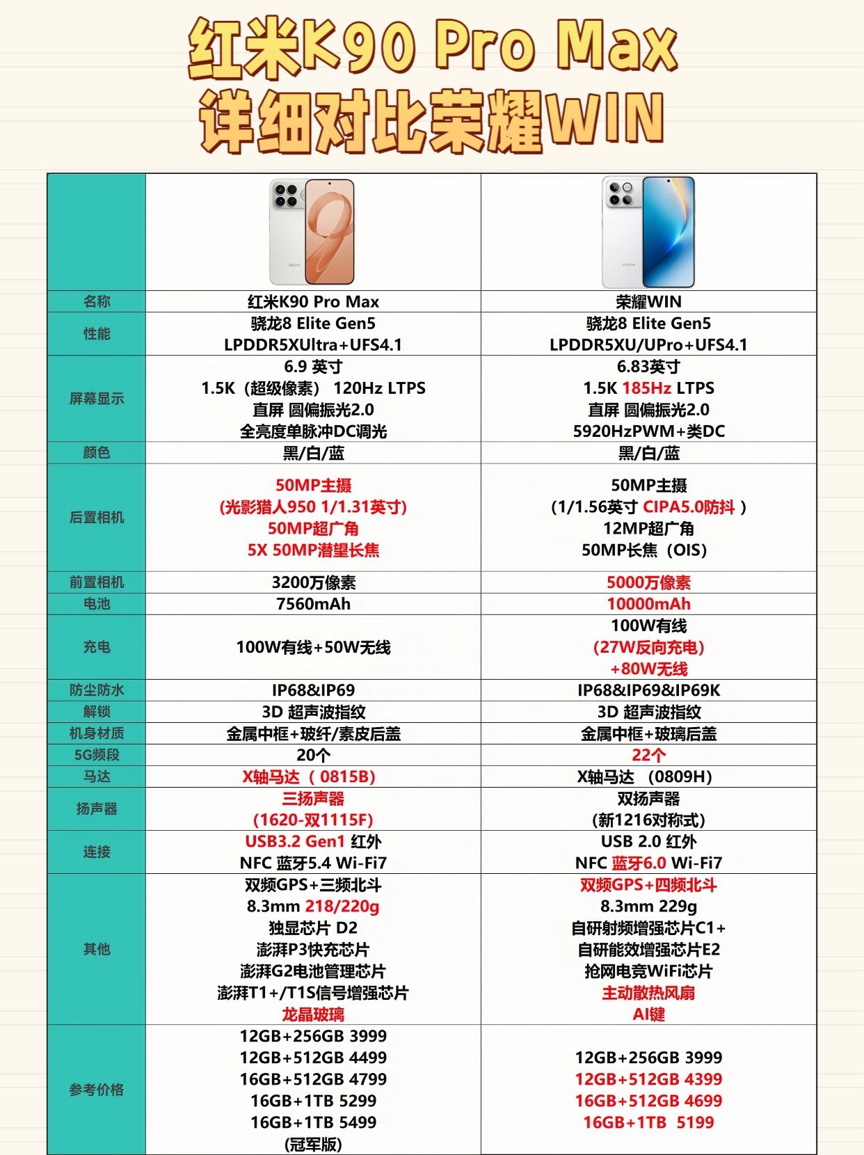 荣耀WIN对比iQOO15、一加15、iQOO15和红米K90ProMax 根据以上表格整理一下精简版的优势点 ★荣耀WIN 续航、前置影像和充电组合是最大优势,还主动风扇散热加持,可以长时间的高帧稳帧。现在加赠礼盒🎁 去线上官方店报【当赢不让逍遥】 ★红米K90 Pro Max 主摄传感器底更大、三扬声器音效好。 ★iQOO 15 2K高分辨率屏幕是核心亮点,长焦传感器规格高且机身更轻...