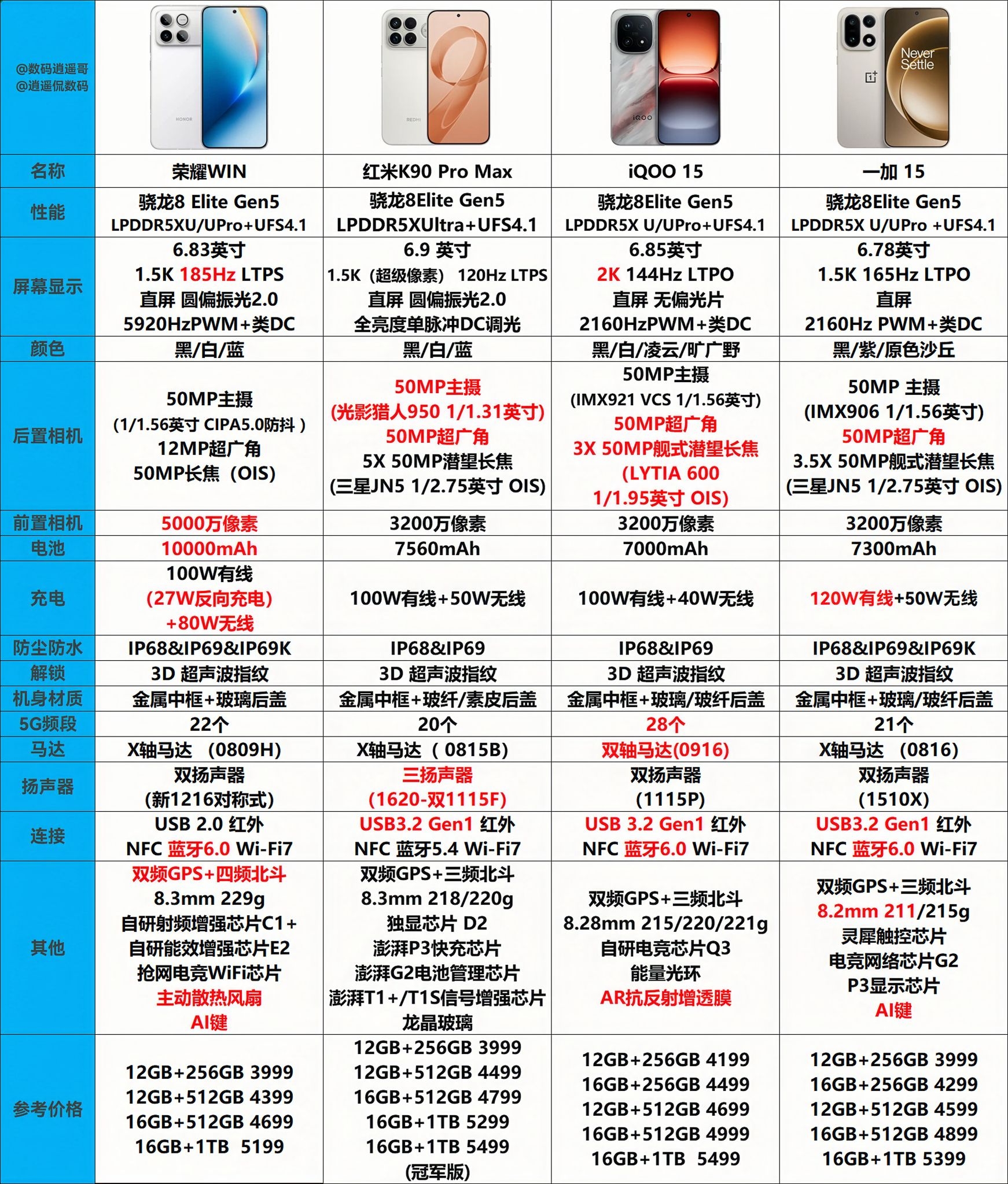 【荣耀WIN对比iQOO15、一加15、iQOO15和红米K90ProMax】,由用户 数码逍遥哥 分享,来自河北。这是一篇来自识货社区的真实用户分享笔记。