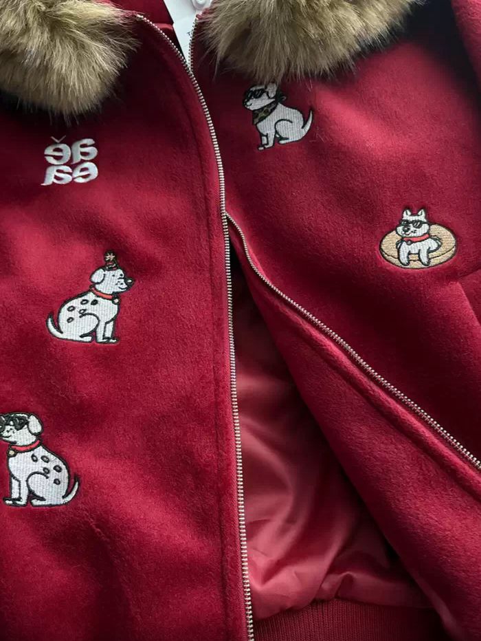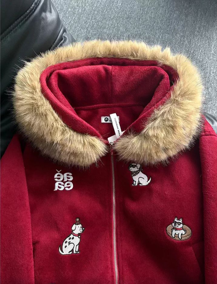 这件红色毛领刺绣外套真的是新年战袍天花板!浓郁的酒红色调超显白,自带节日的喜庆氛围感,超大的毛领不仅软乎乎超舒服,还能防风保暖,衣身的小狗刺绣图案又萌又精致,瞬间打破单调感。厚实的面料抗风又保暖,宽松的版型对各种身材都超友好,不管是搭卫衣、毛衣还是打底衫都超合适,过年走亲访友穿它,既亮眼又可爱,70多的价格能拿下这样的质感,学生党也能闭眼冲!