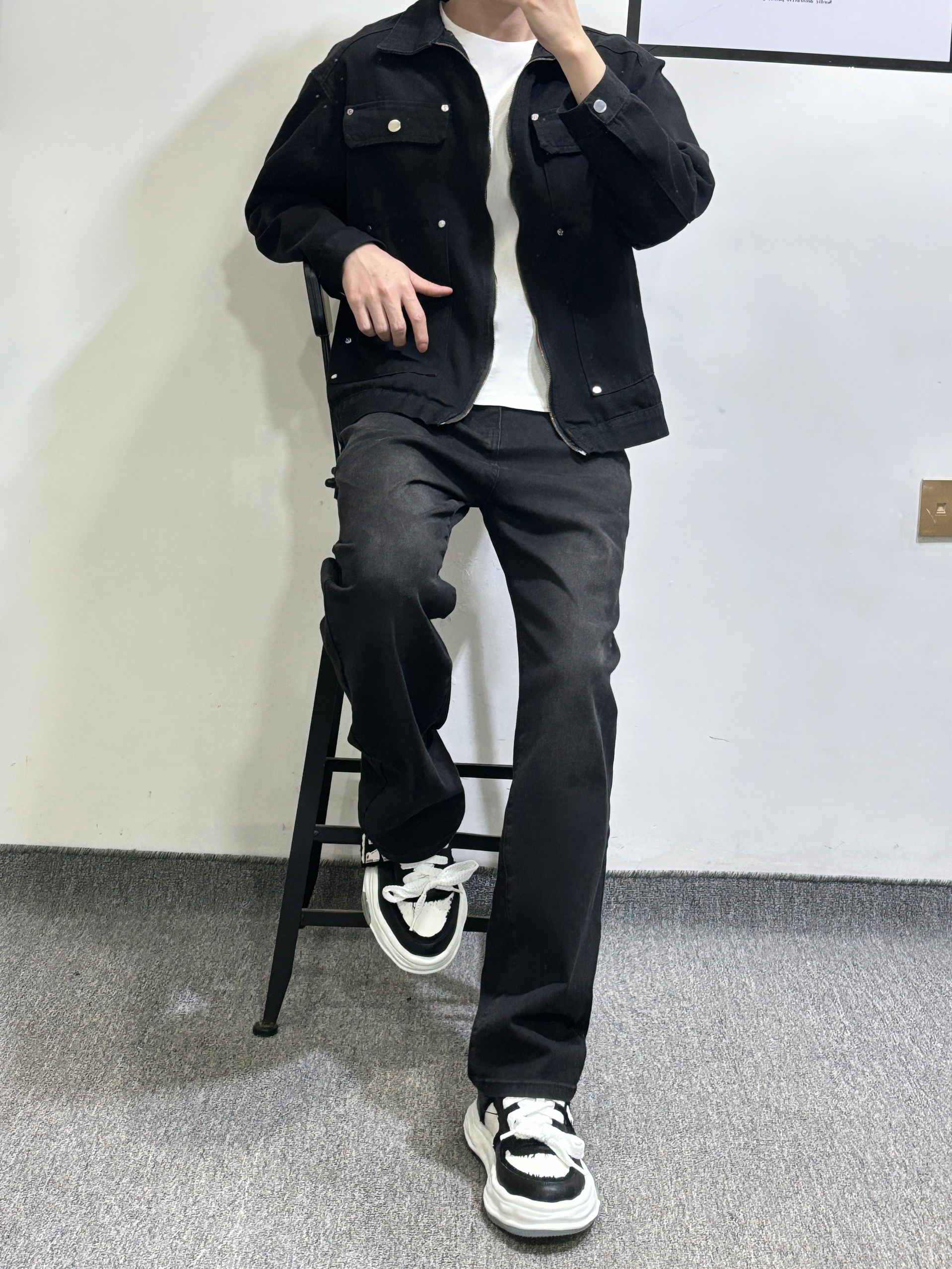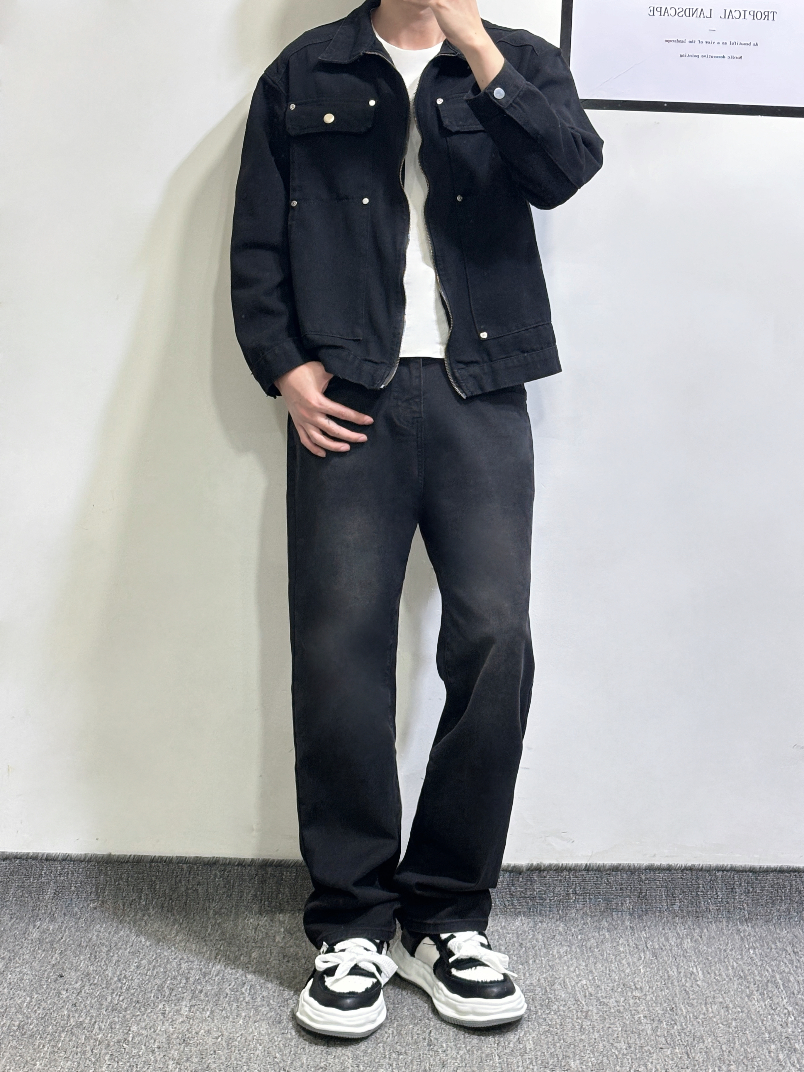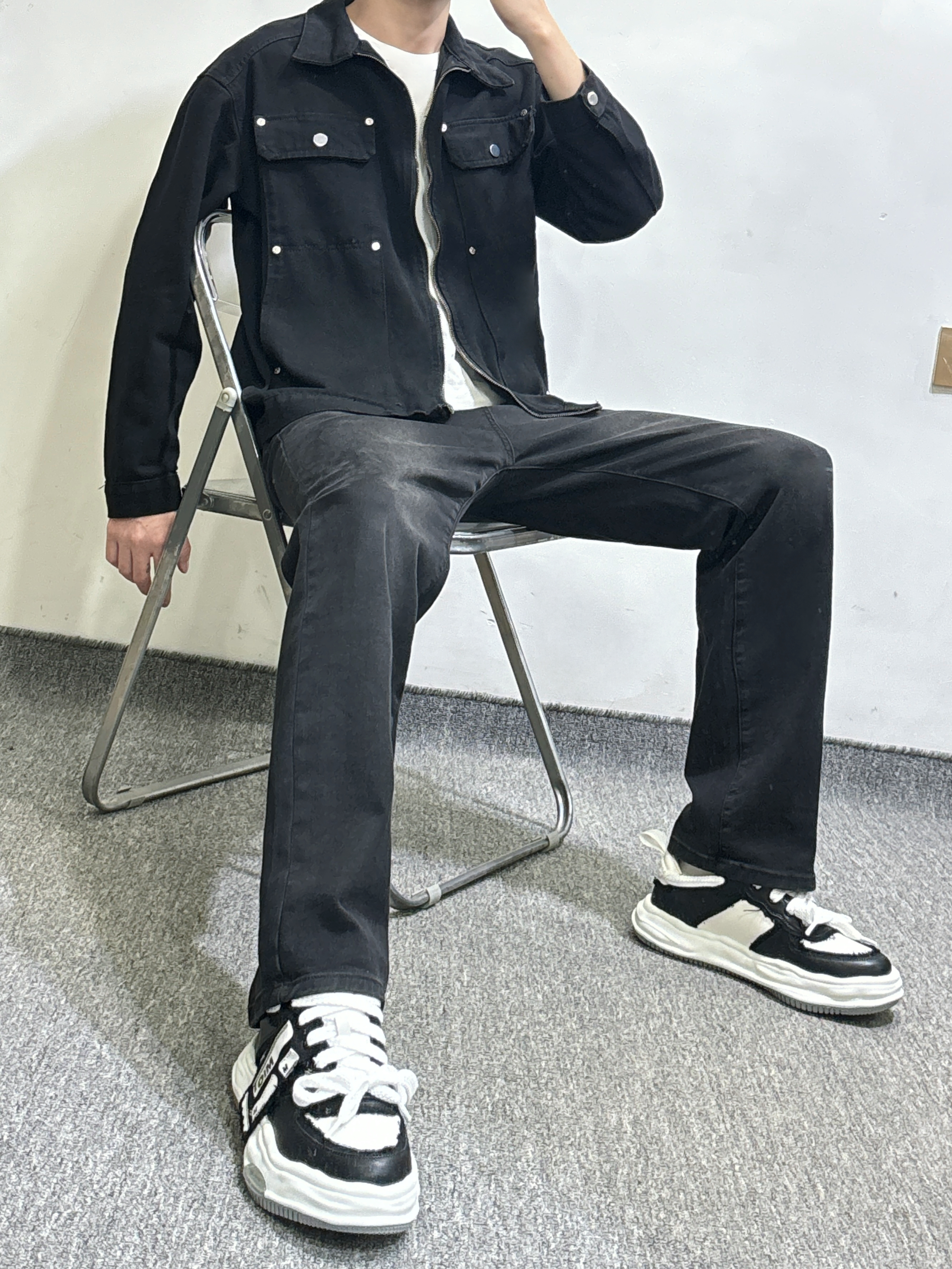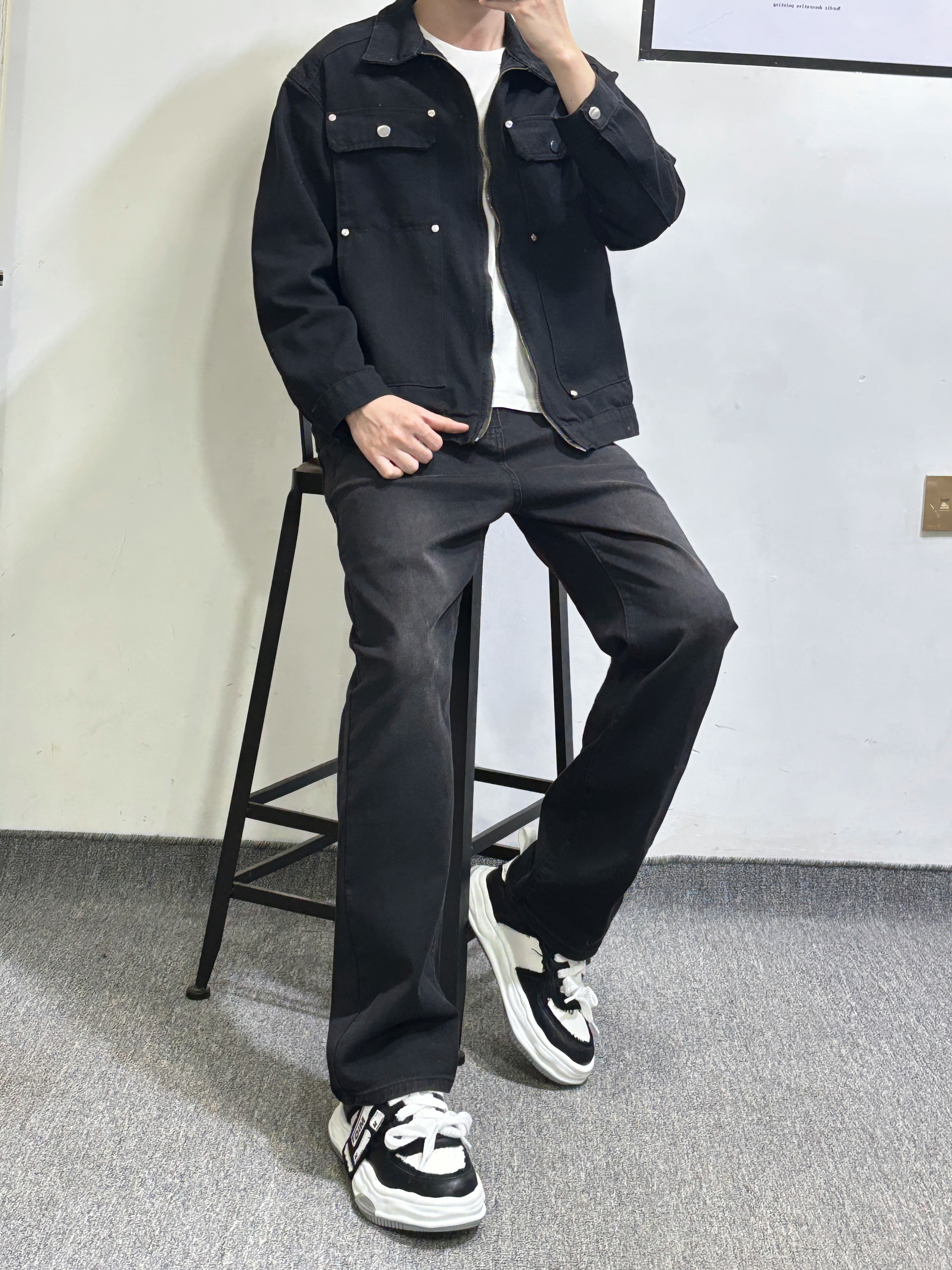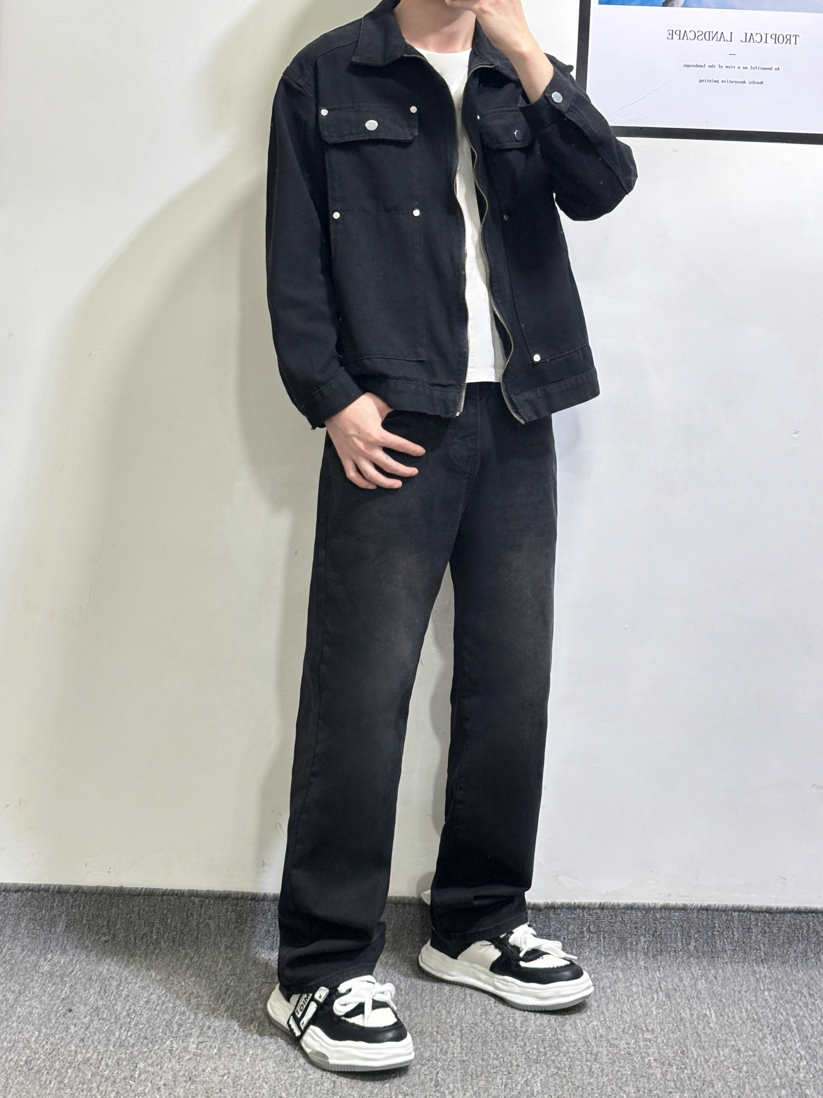 男生穿搭不用太麻烦 一套牛仔系简单又帅气 黑色外套内搭白色T恤有层次感 黑色直筒牛仔裤 百搭耐看又耐脏 休闲板鞋 厚底增高效果嘎嘎猛 帅就完了 身高|体重 178-130