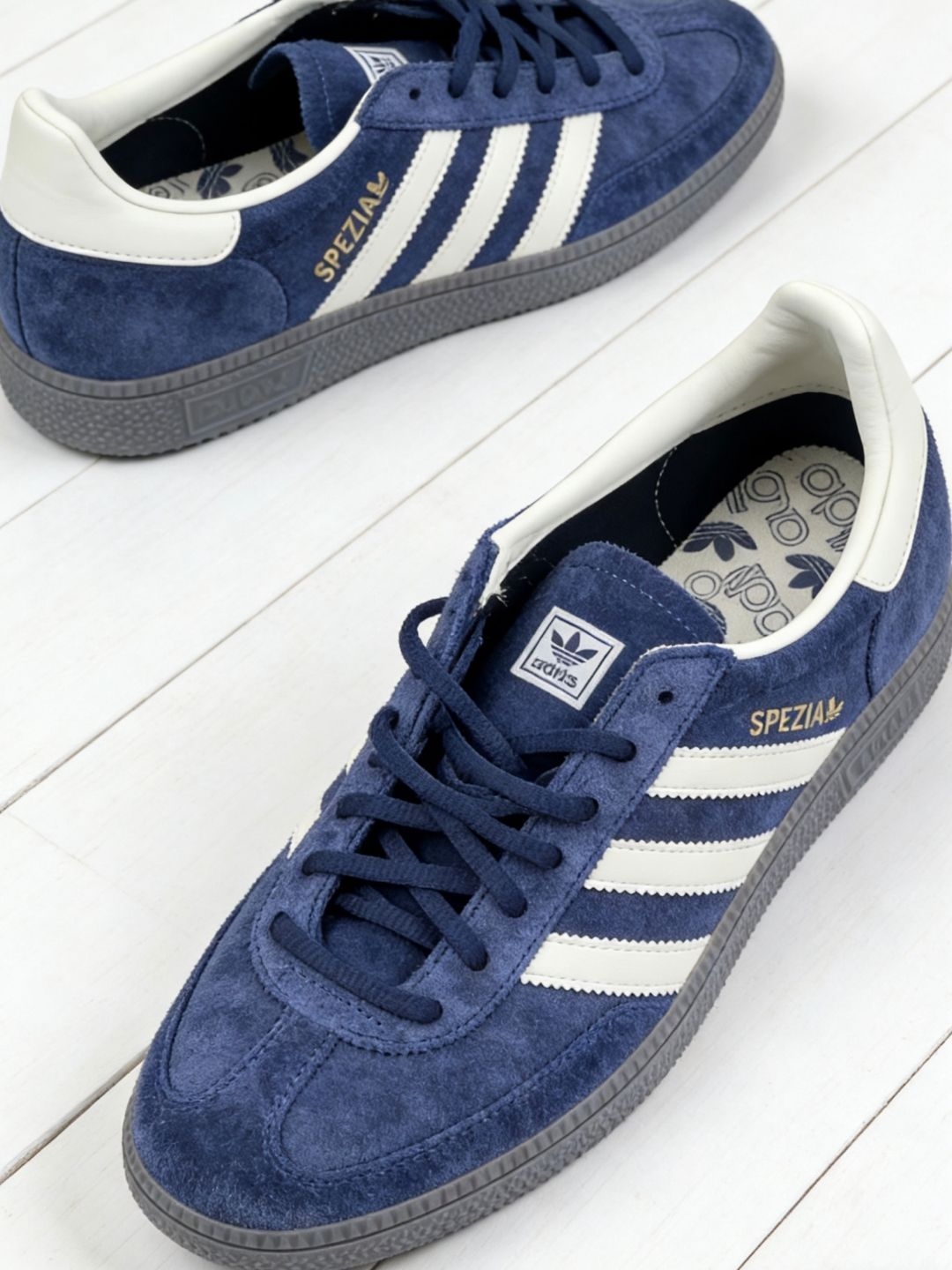 这双adidas SPEZIAL我穿了小半个月,说实在的,麂皮摸着手感是真舒服,深蓝色看着也不扎眼,配牛仔裤或者卡其色工装裤都挺搭。 脚感属于“不惊艳但够用”的类型,软度刚好,走个万把步没觉得累。不过刚穿那两天后跟有点磨,贴了个创可贴才好。鞋型偏窄,我平时穿38码,这双得买大半码才不挤脚。 鞋垫上的logo还挺有意思的,不过穿久了有点起球,好在不影响脚感。最近降温配个短款夹克出门,随便套上就挺随性...