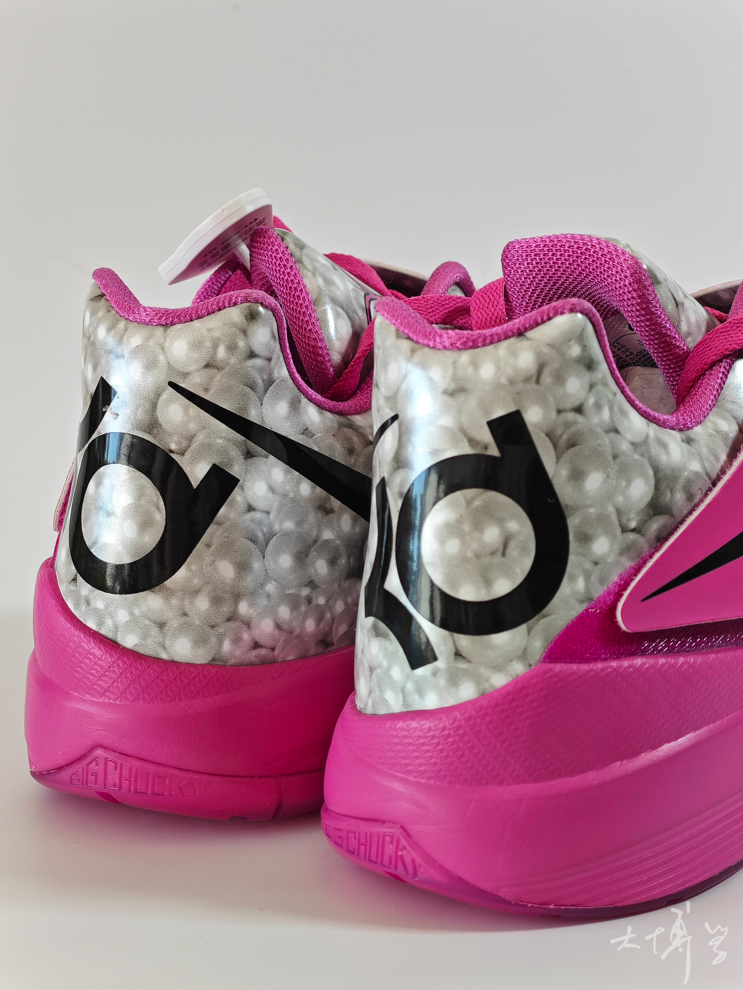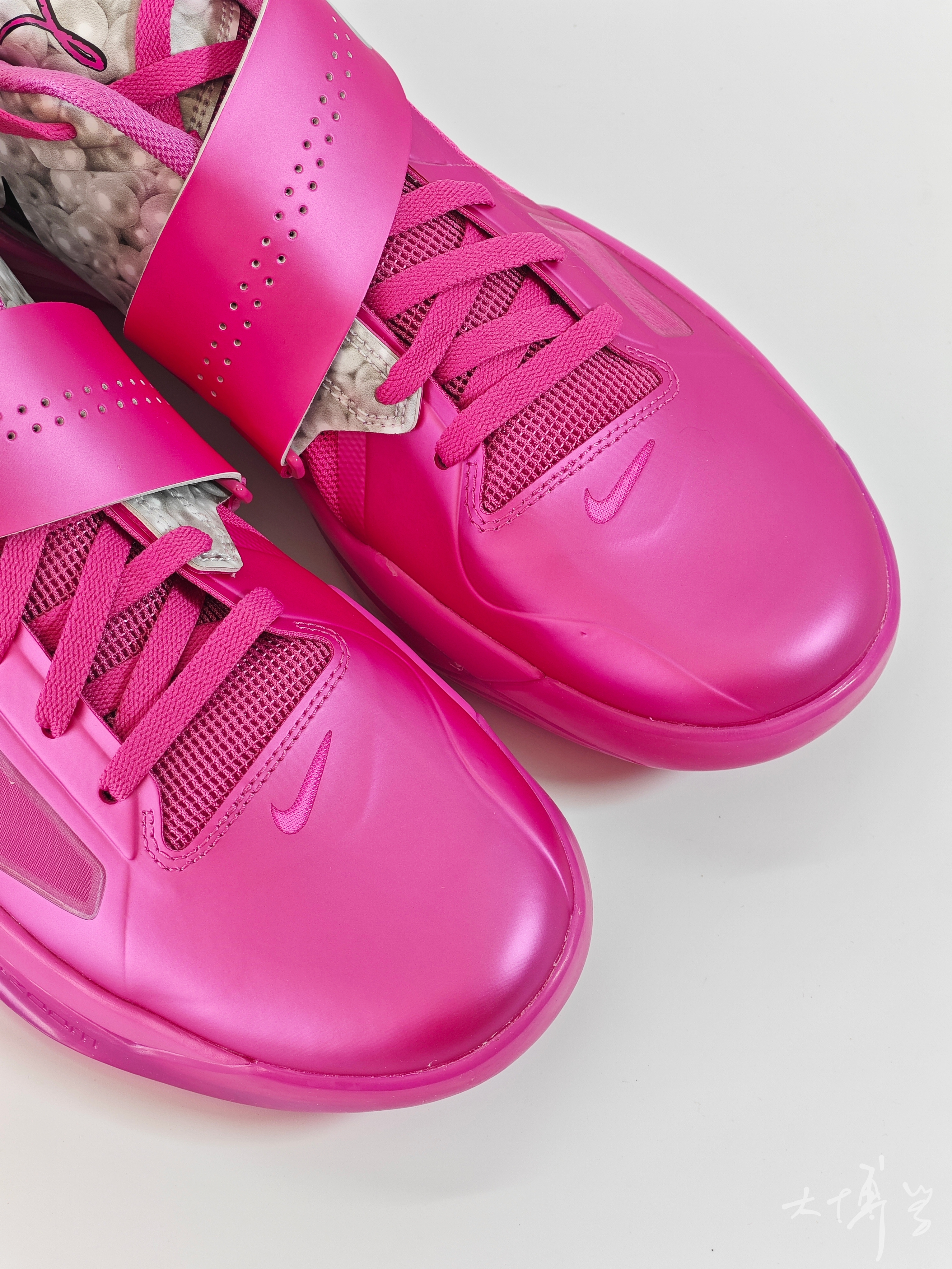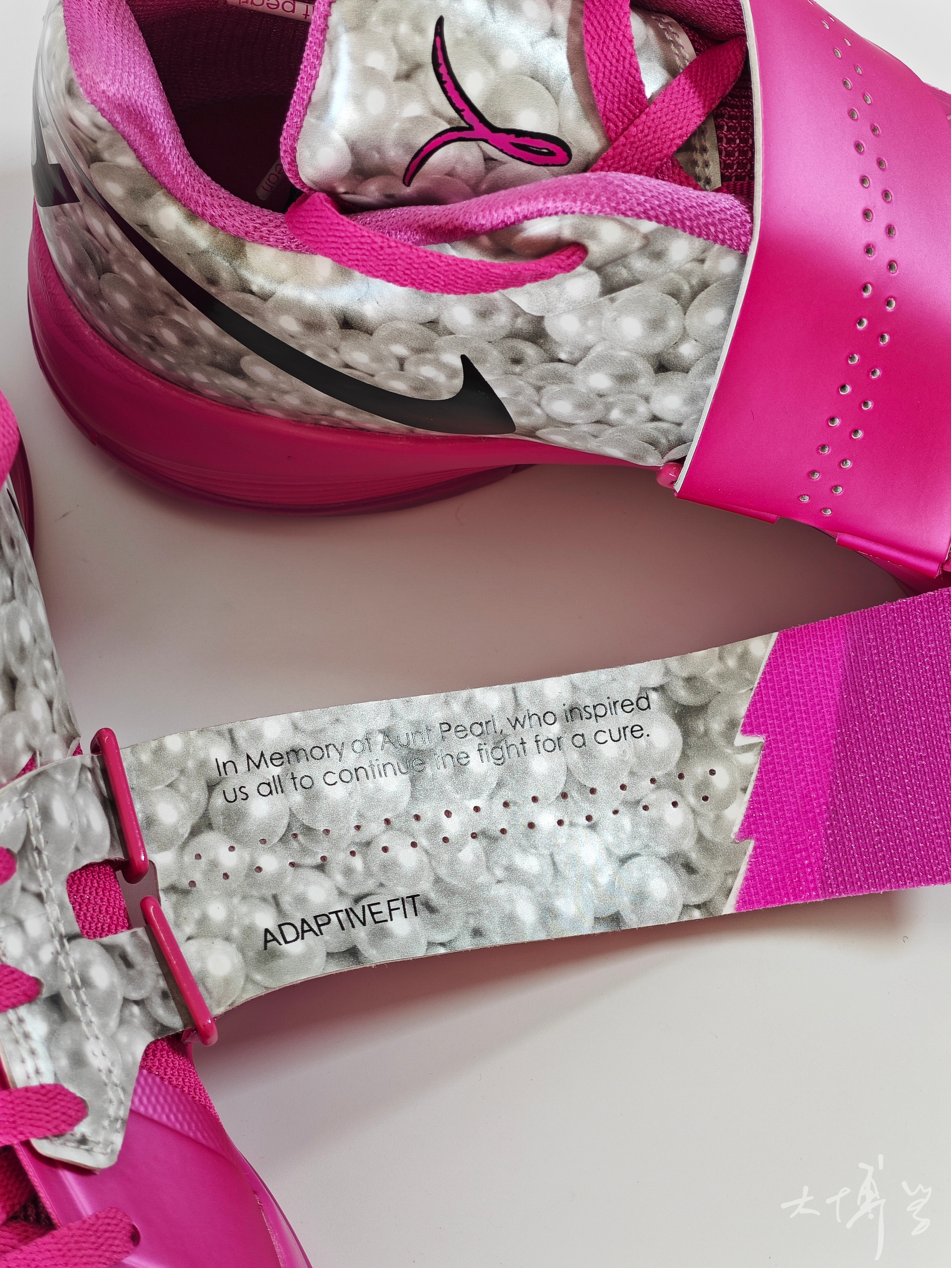 一双复刻的kd4 使用了独特的亮粉乳腺癌配色 加上多处珍珠的细节设计,颜值我很喜欢 无论在球场还是日常出街 都能轻松成为焦点 魔术贴绑带系统搭配较硬的鞋面材质 提供了优秀的包裹感 双脚在鞋内比较稳定