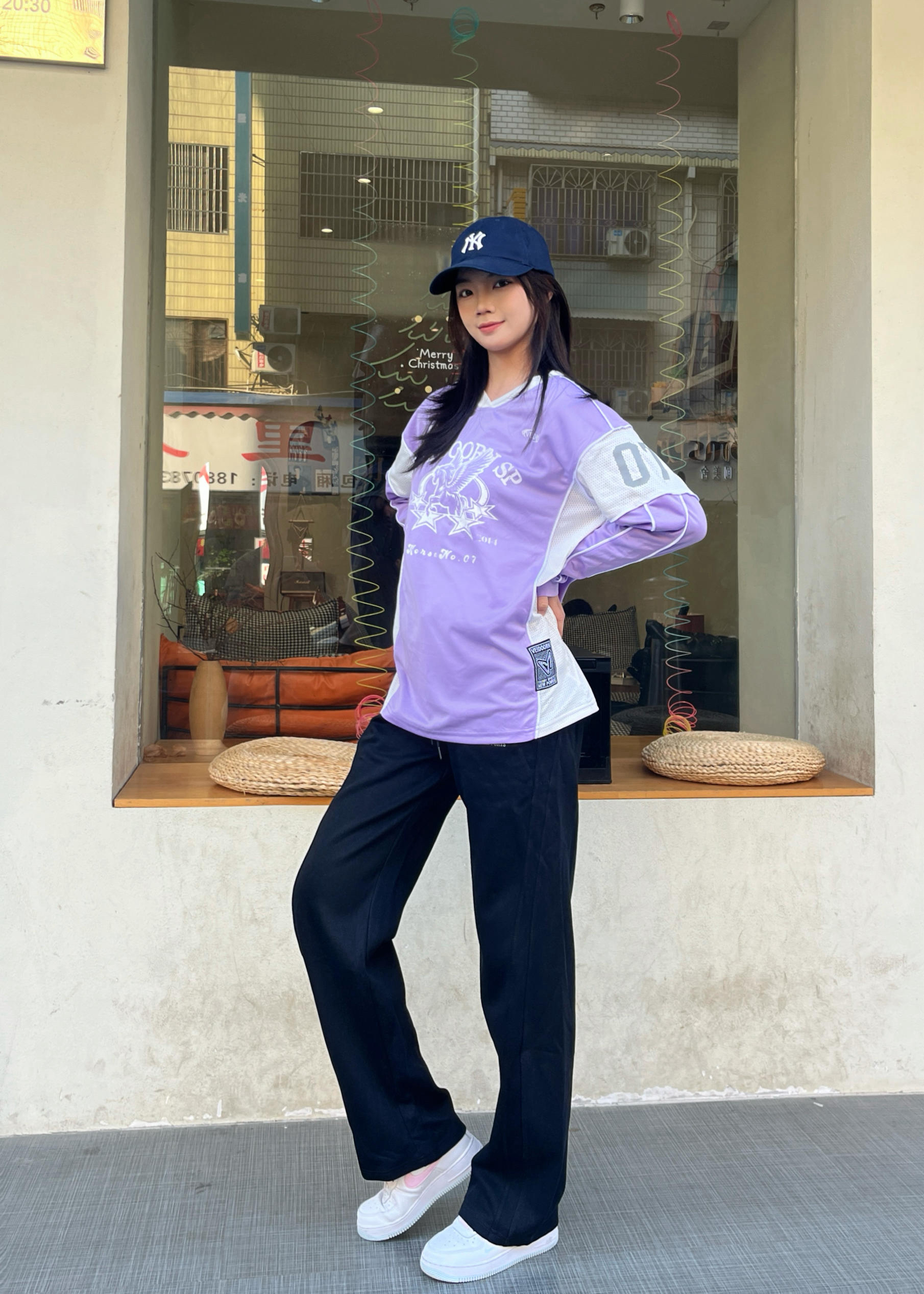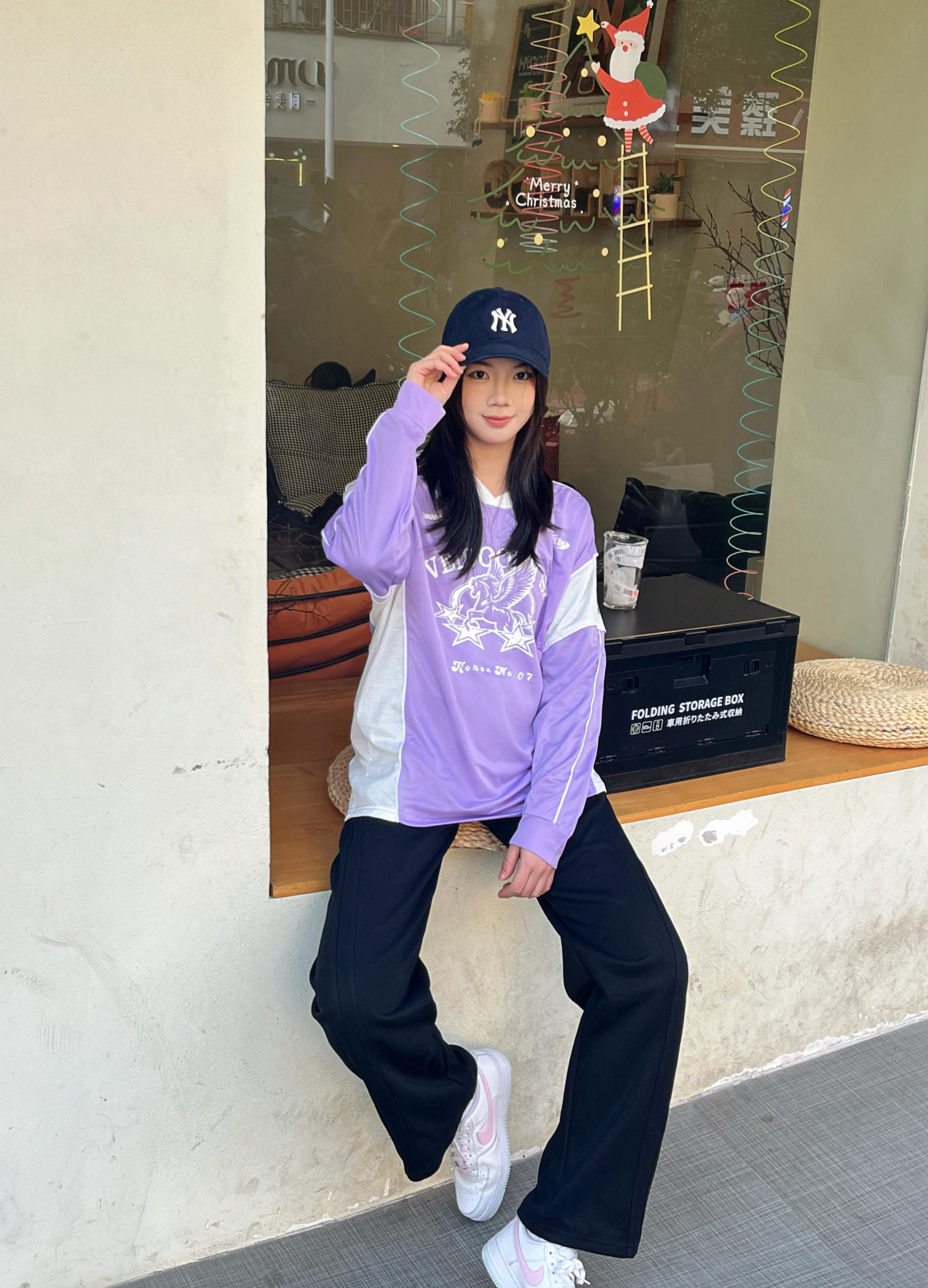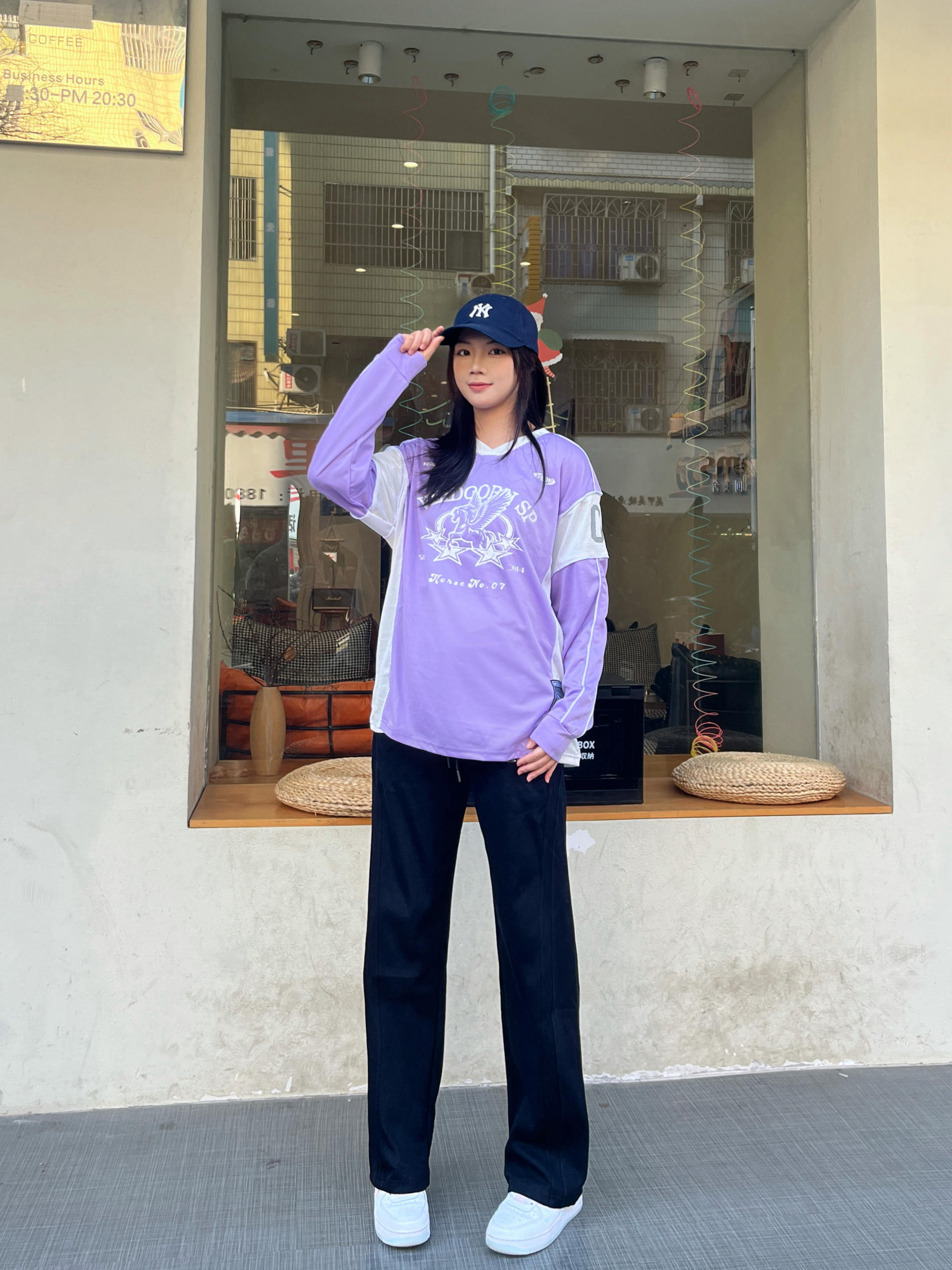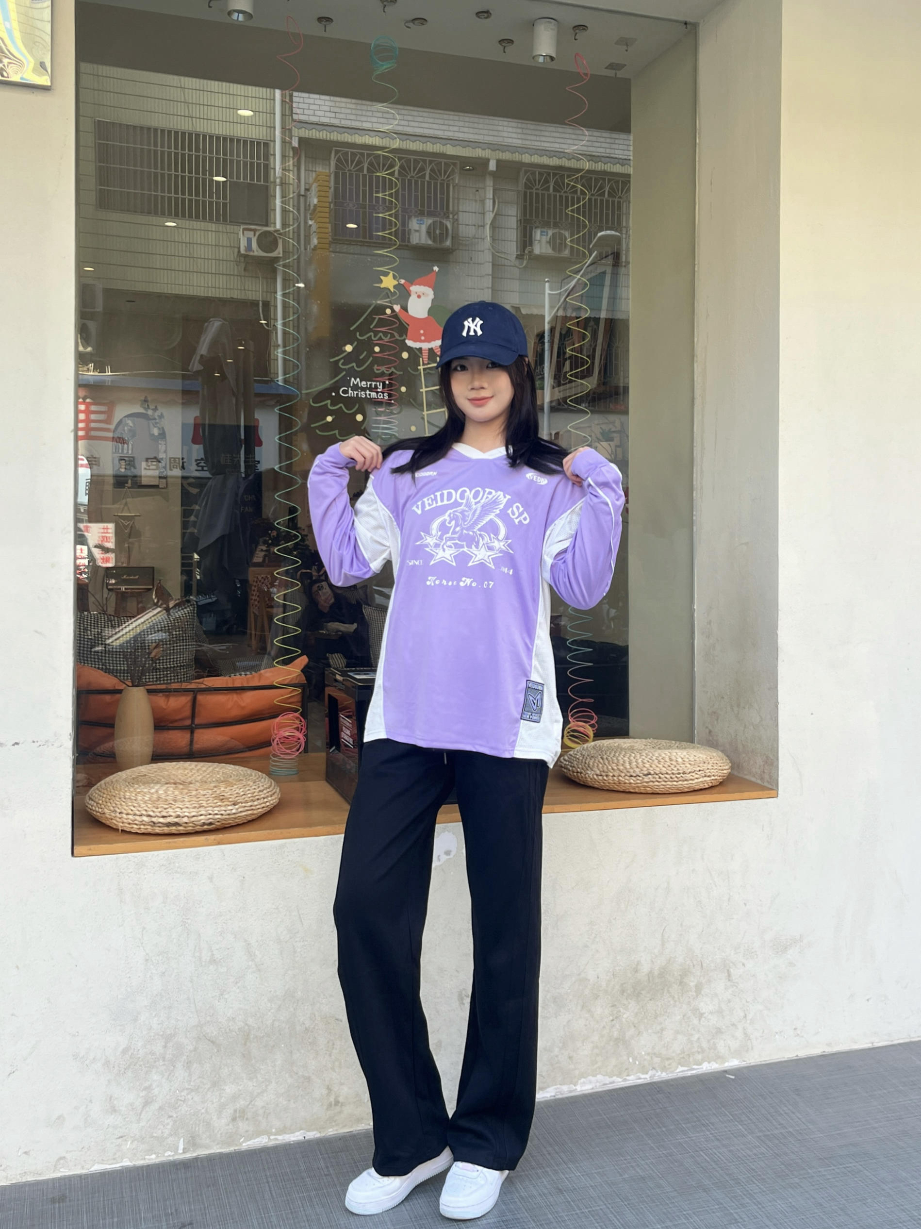 淡紫长袖撞白设计超吸睛,搭配黑阔腿裤利落又随性,小白鞋+棒球帽拉满街头休闲感,慵懒范拿捏~