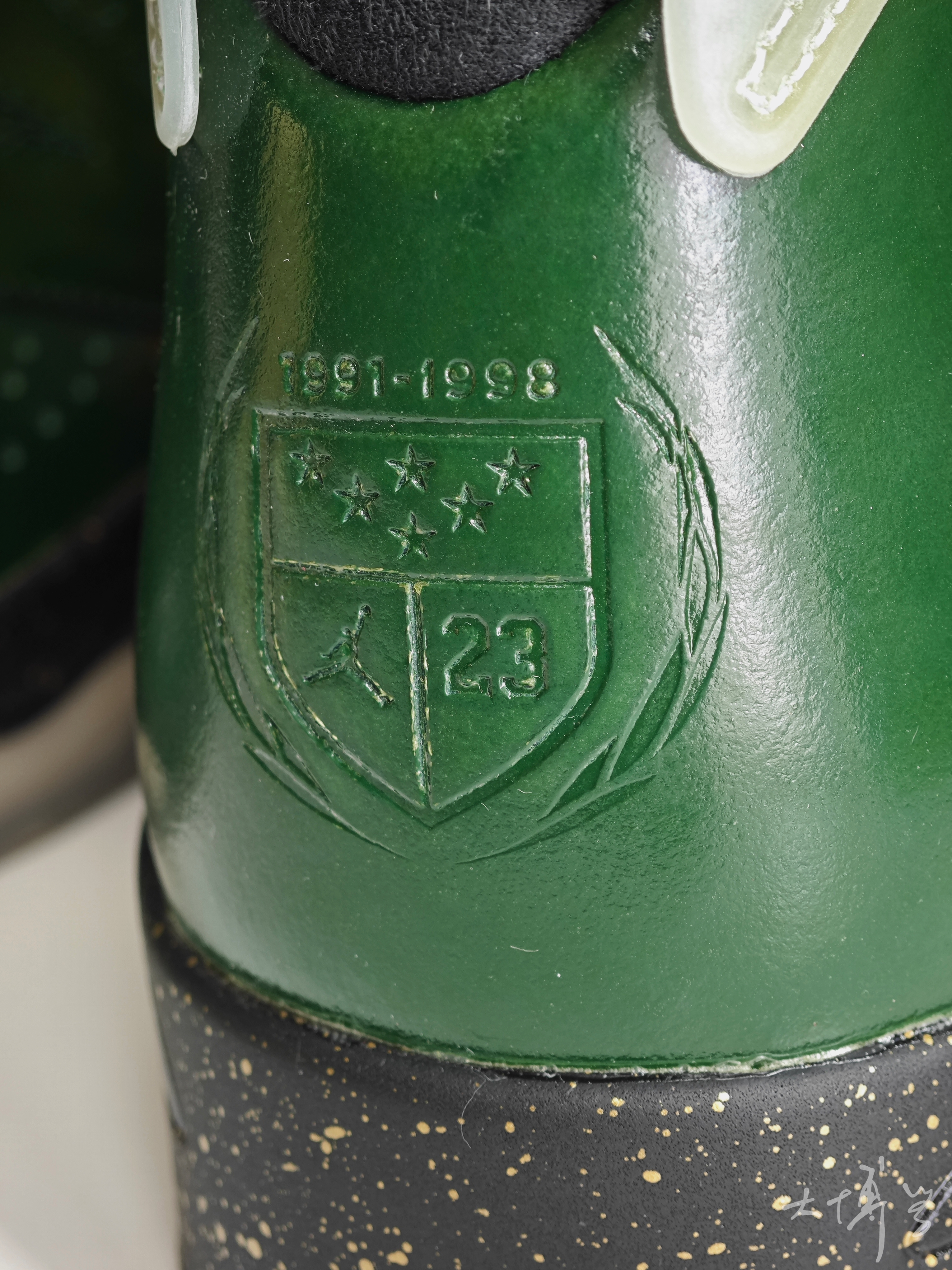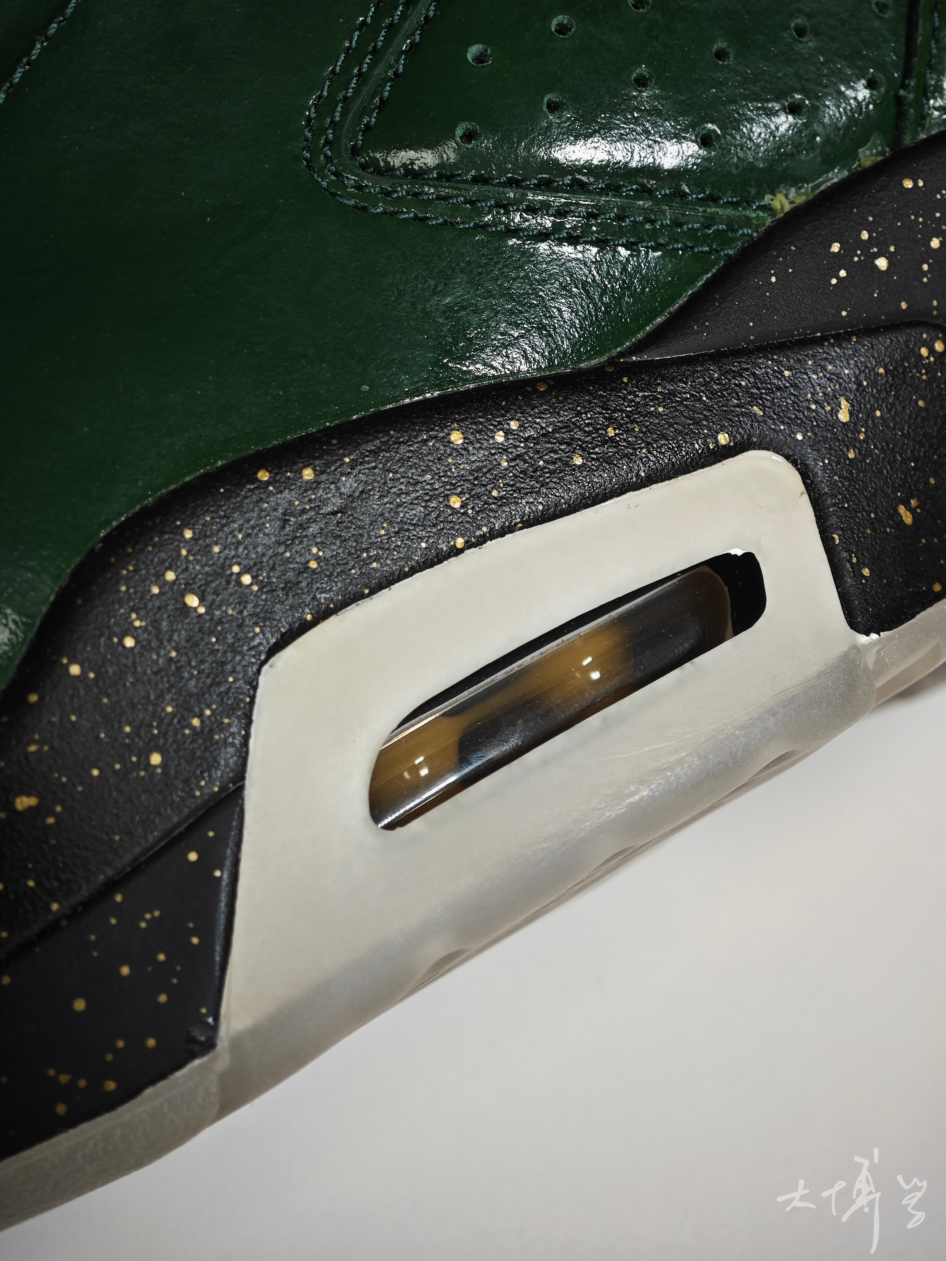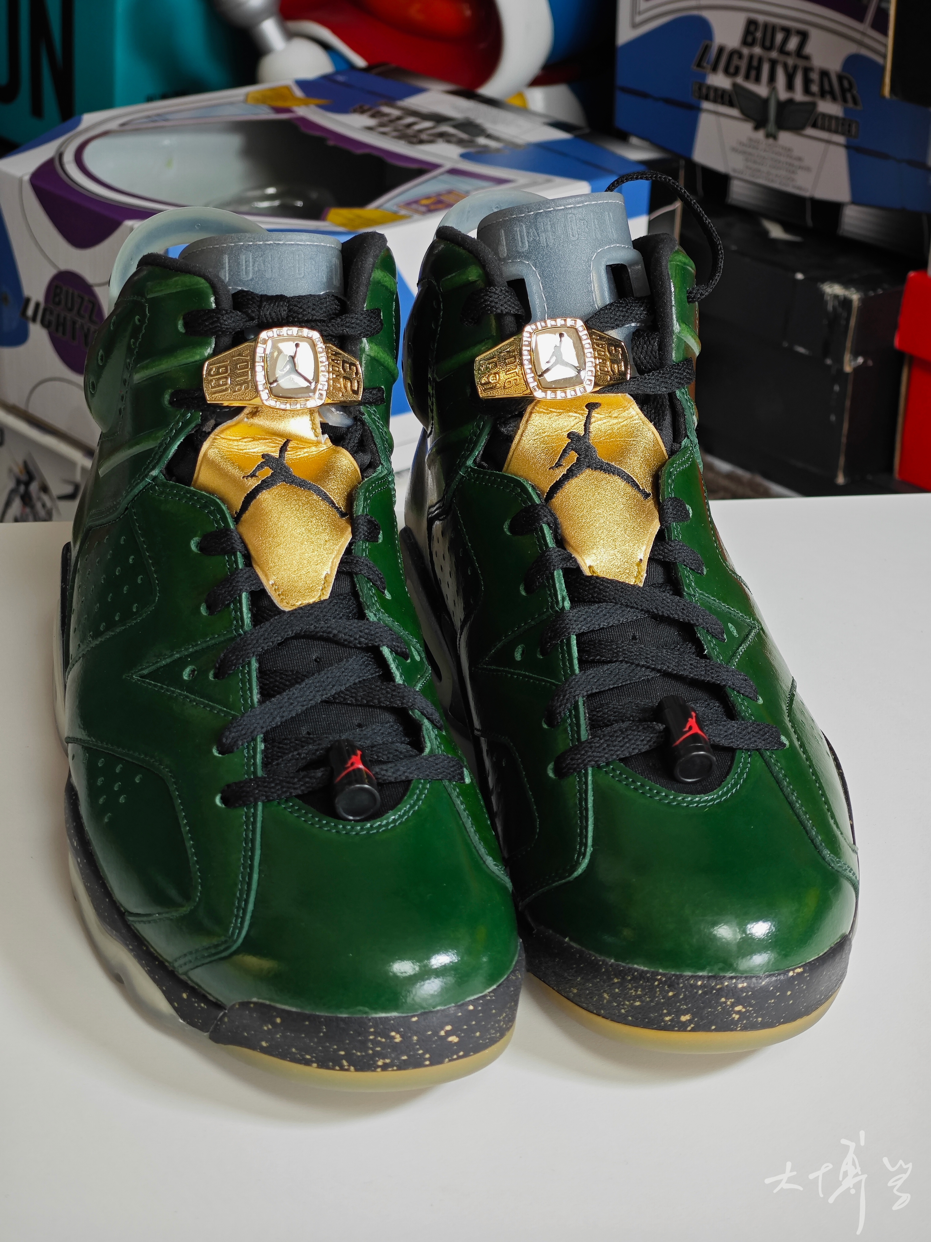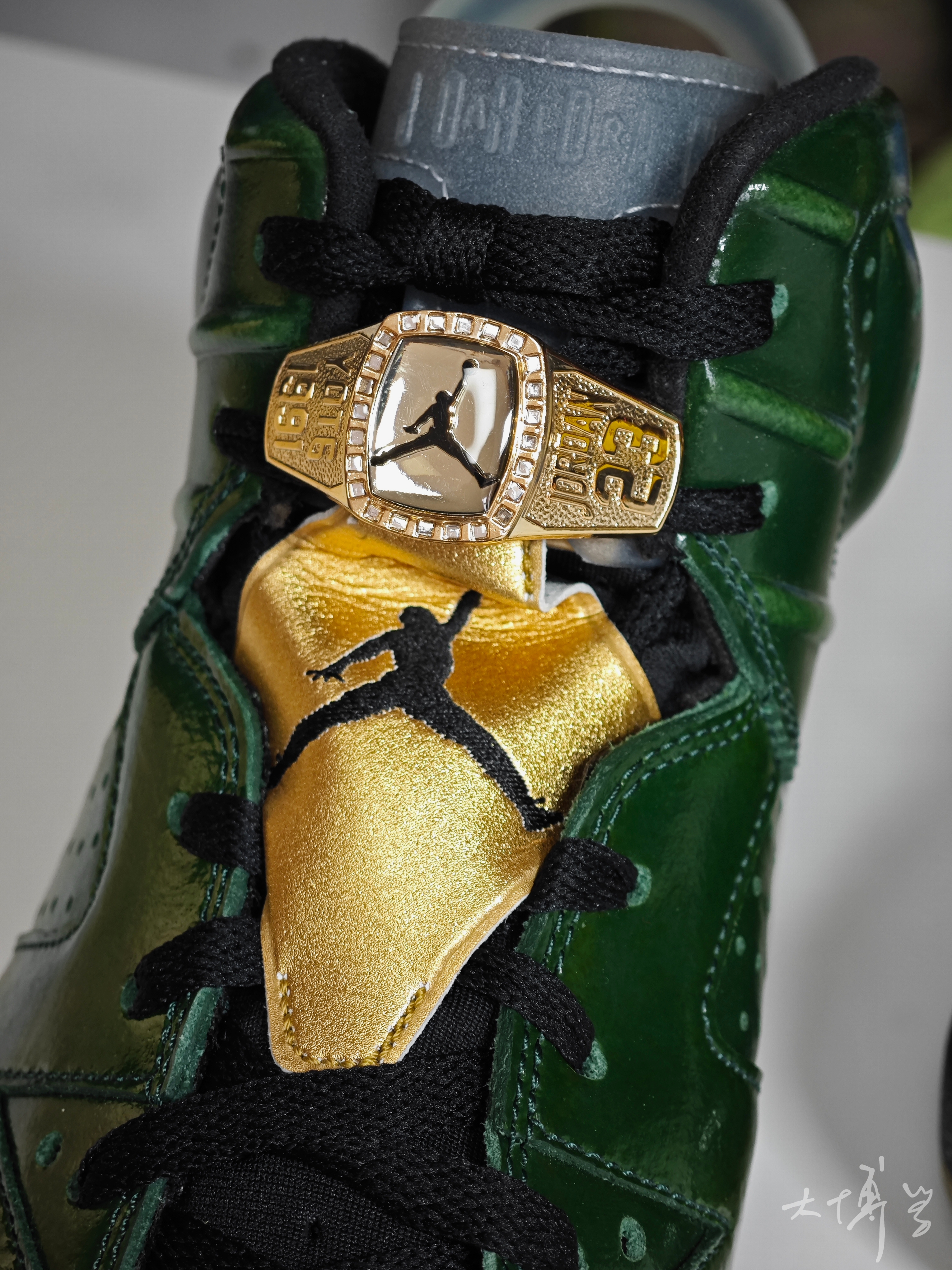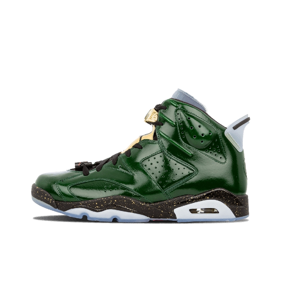 AJ 6代是我很喜欢的款式 尤其是脚踝处的鼓包和软胶鞋舌 总觉得酷酷的与众不同 这双绿油油的AJ 6 配色灵感是夺冠之后的香槟🍾酒瓶 真是太有创意了