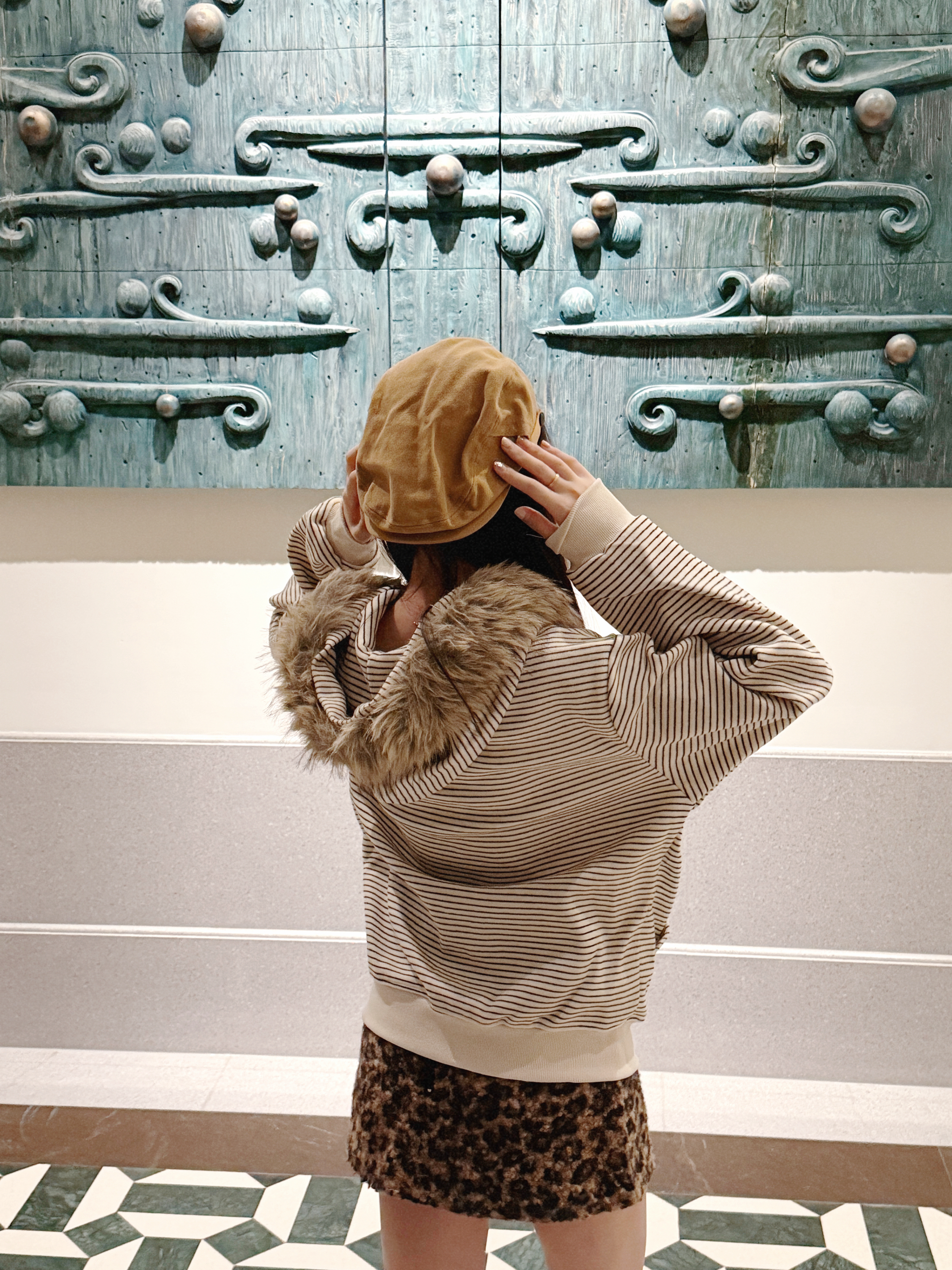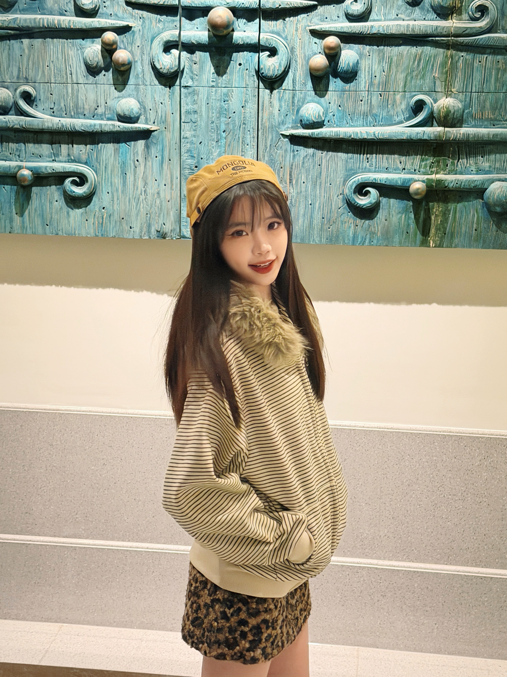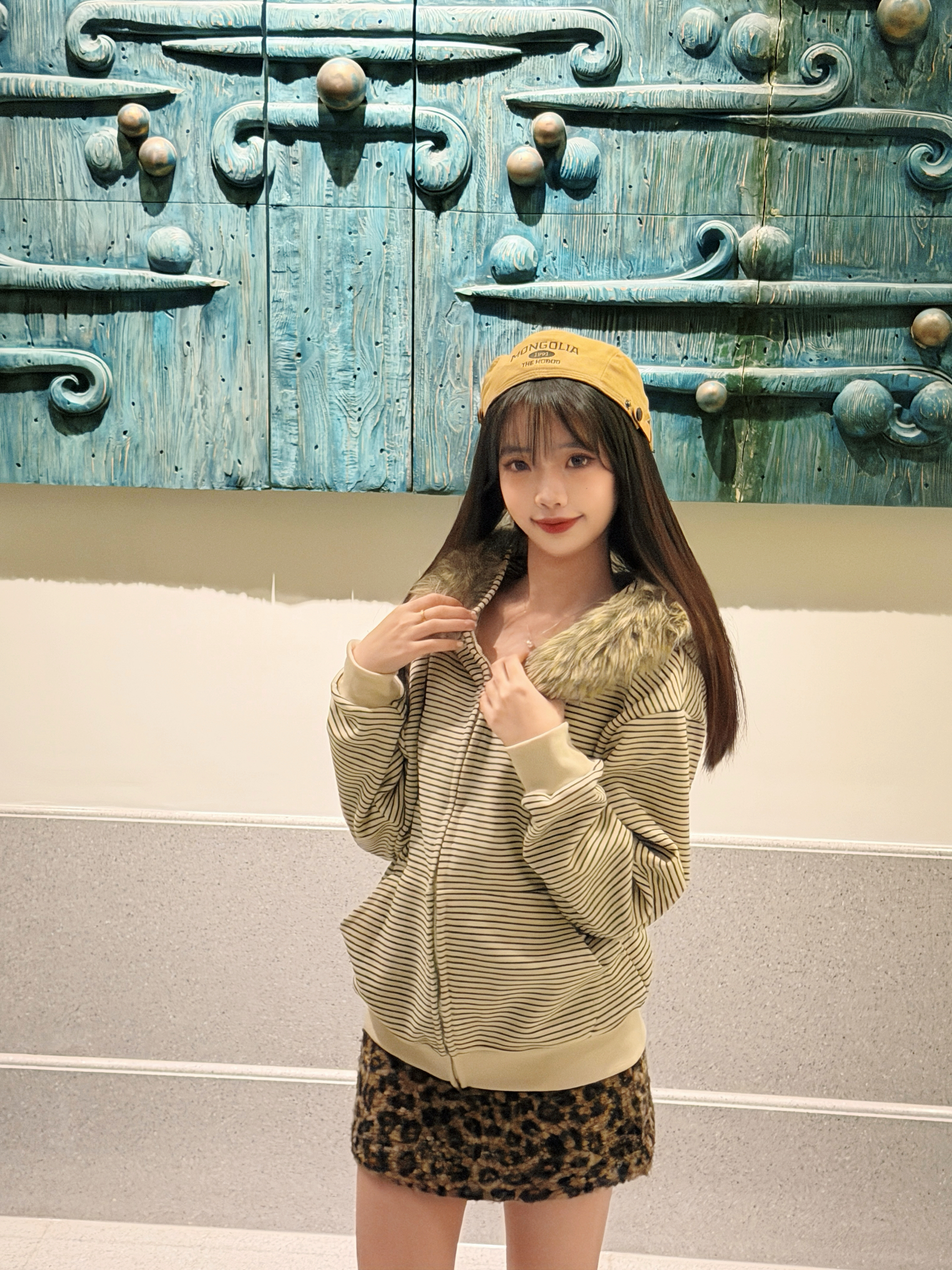 很可爱的一张封面哈哈 揪帽子拍照大法快去学学吧!! 今天穿的是很美式复古的一套喔 条纹毛领卫衣搭配了豹纹短裙和棕色的帽子 卫衣开衫搭配的是可拆卸的毛领 真的很喜欢这件衣服 毛领可以自己选择要不要组装 机洗也可以把毛领拆下来 很韩很时髦的一件卫衣哇🎄 168 90斤 m合身