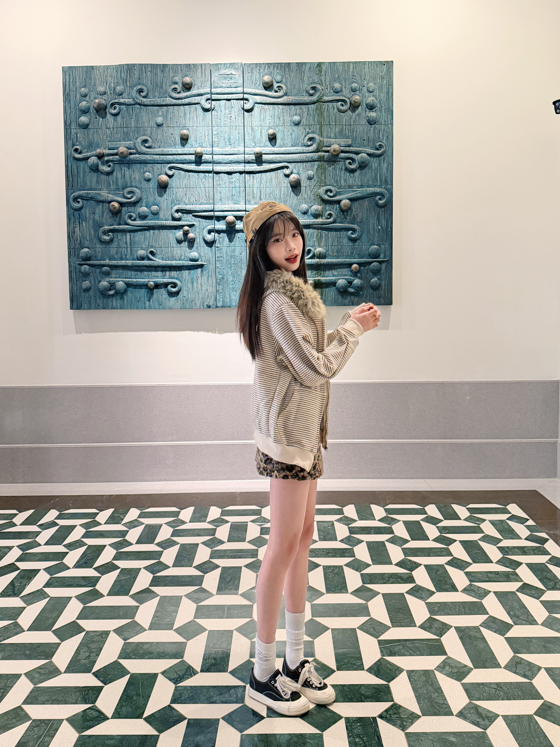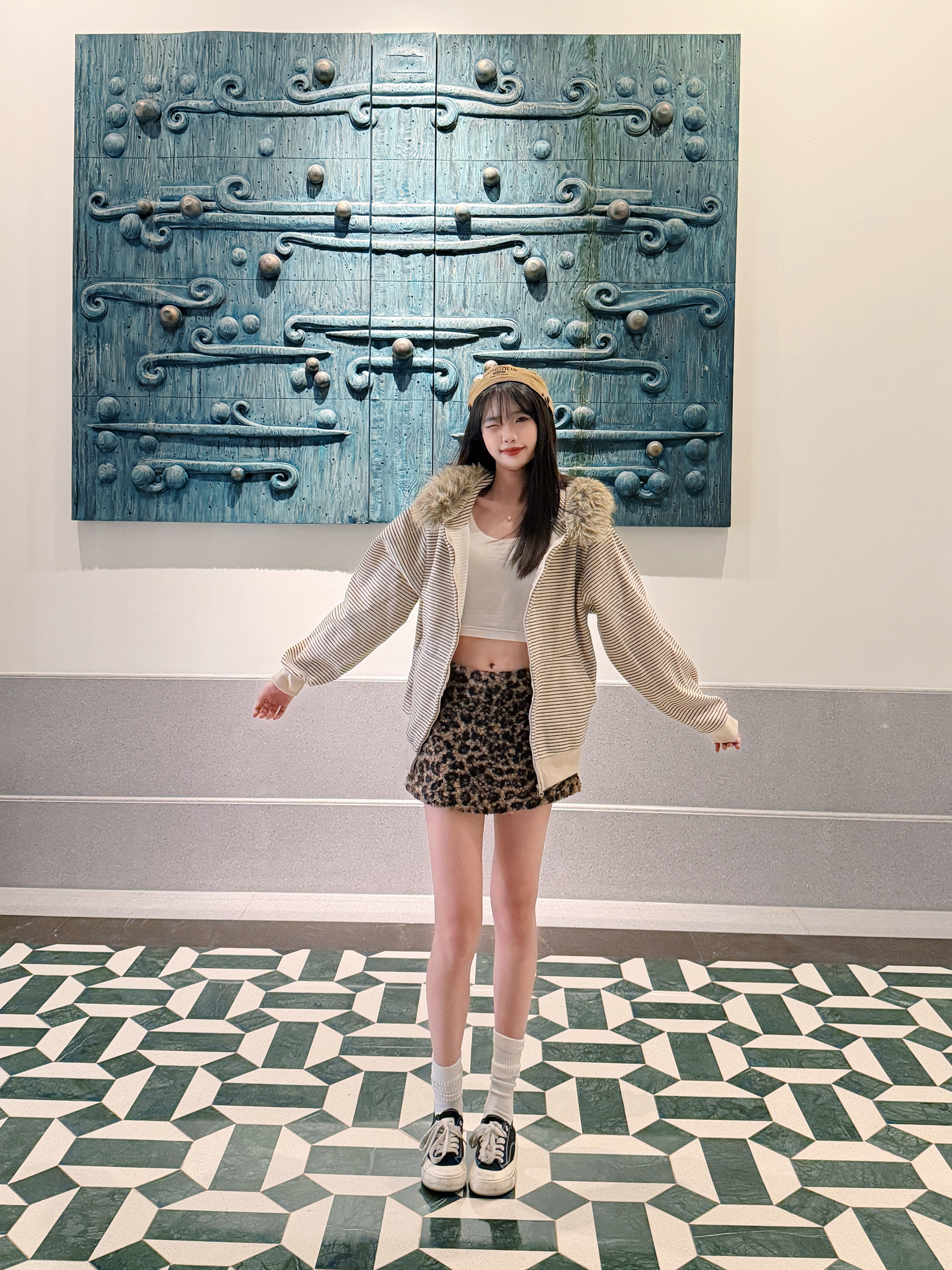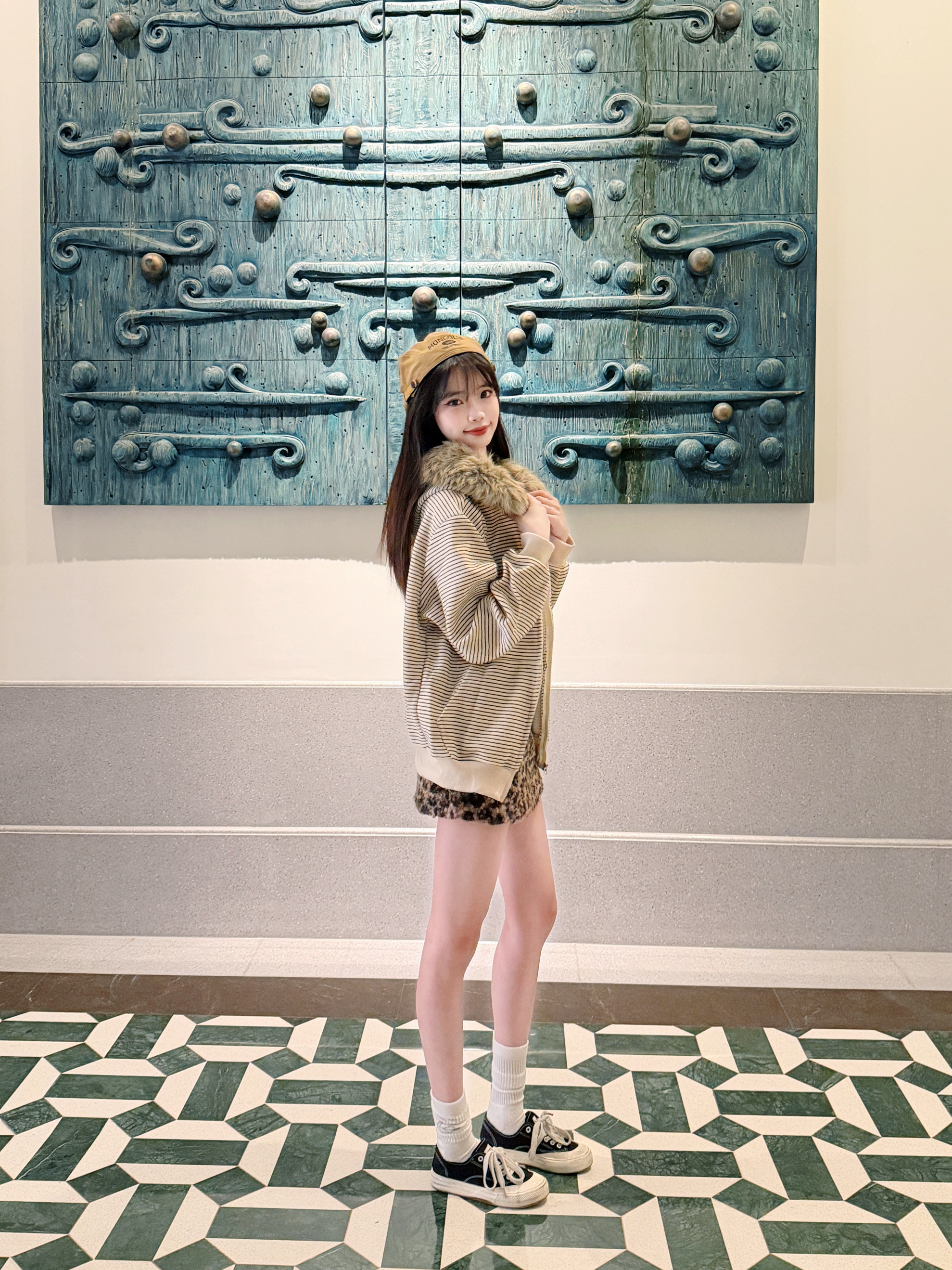 很可爱的一张封面哈哈 揪帽子拍照大法快去学学吧!! 今天穿的是很美式复古的一套喔 条纹毛领卫衣搭配了豹纹短裙和棕色的帽子 卫衣开衫搭配的是可拆卸的毛领 真的很喜欢这件衣服 毛领可以自己选择要不要组装 机洗也可以把毛领拆下来 很韩很时髦的一件卫衣哇🎄 168 90斤 m合身