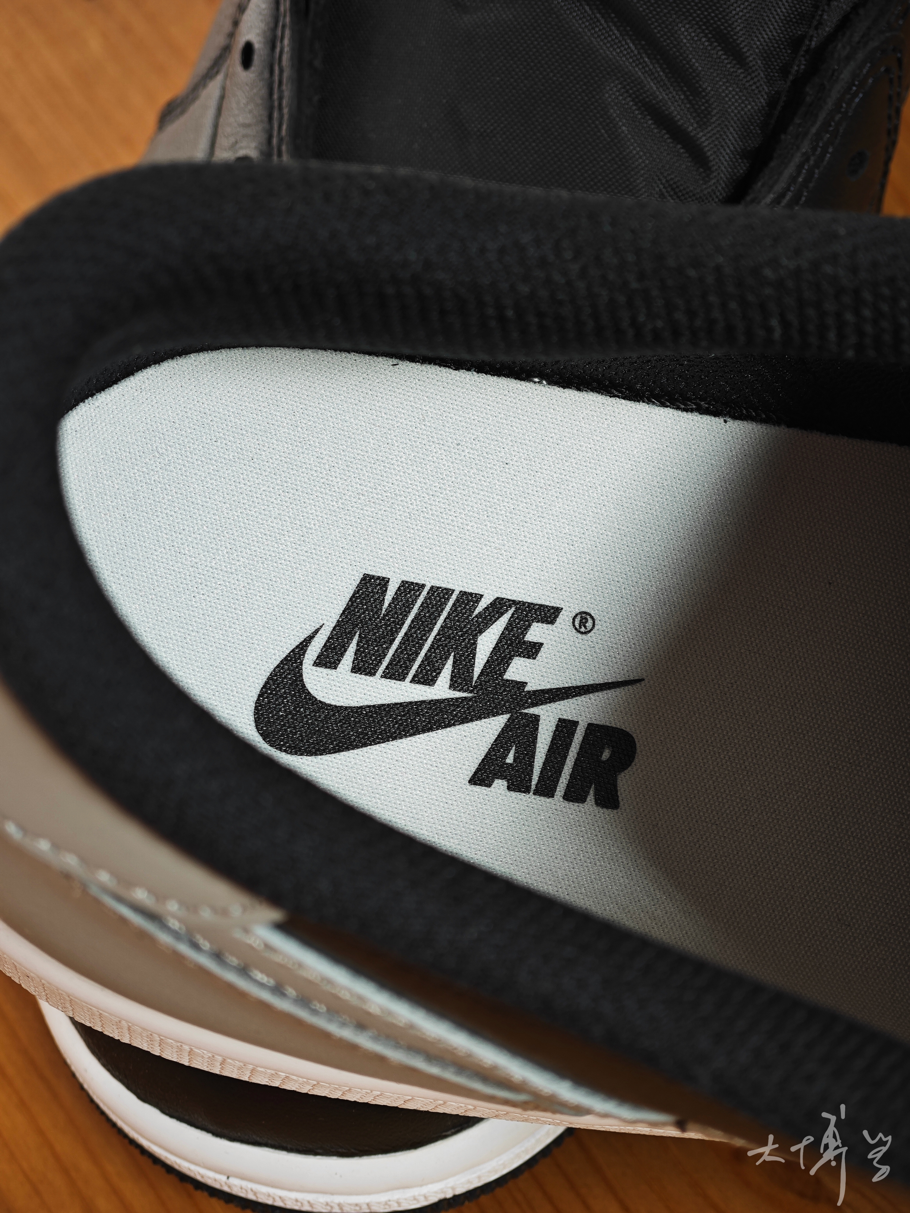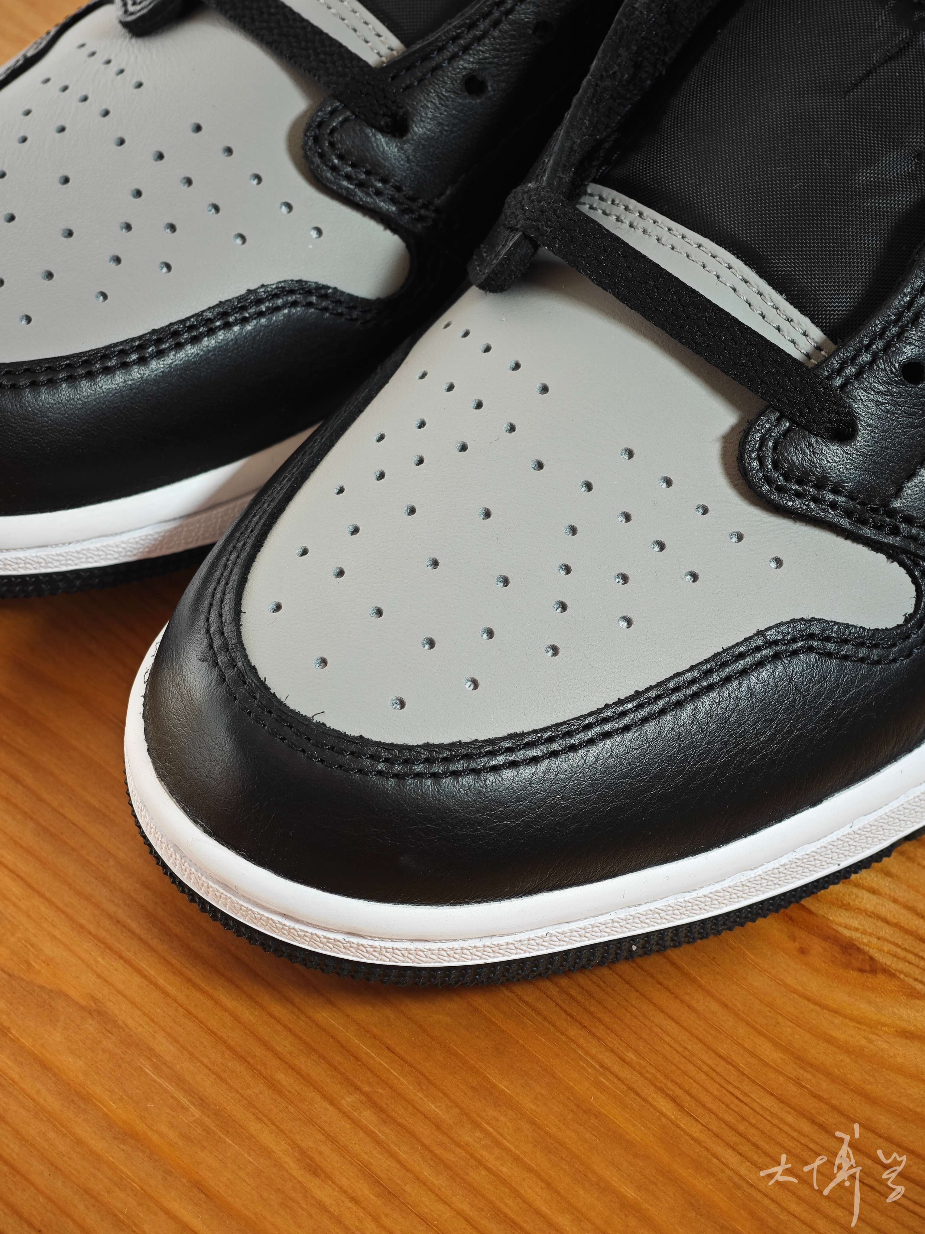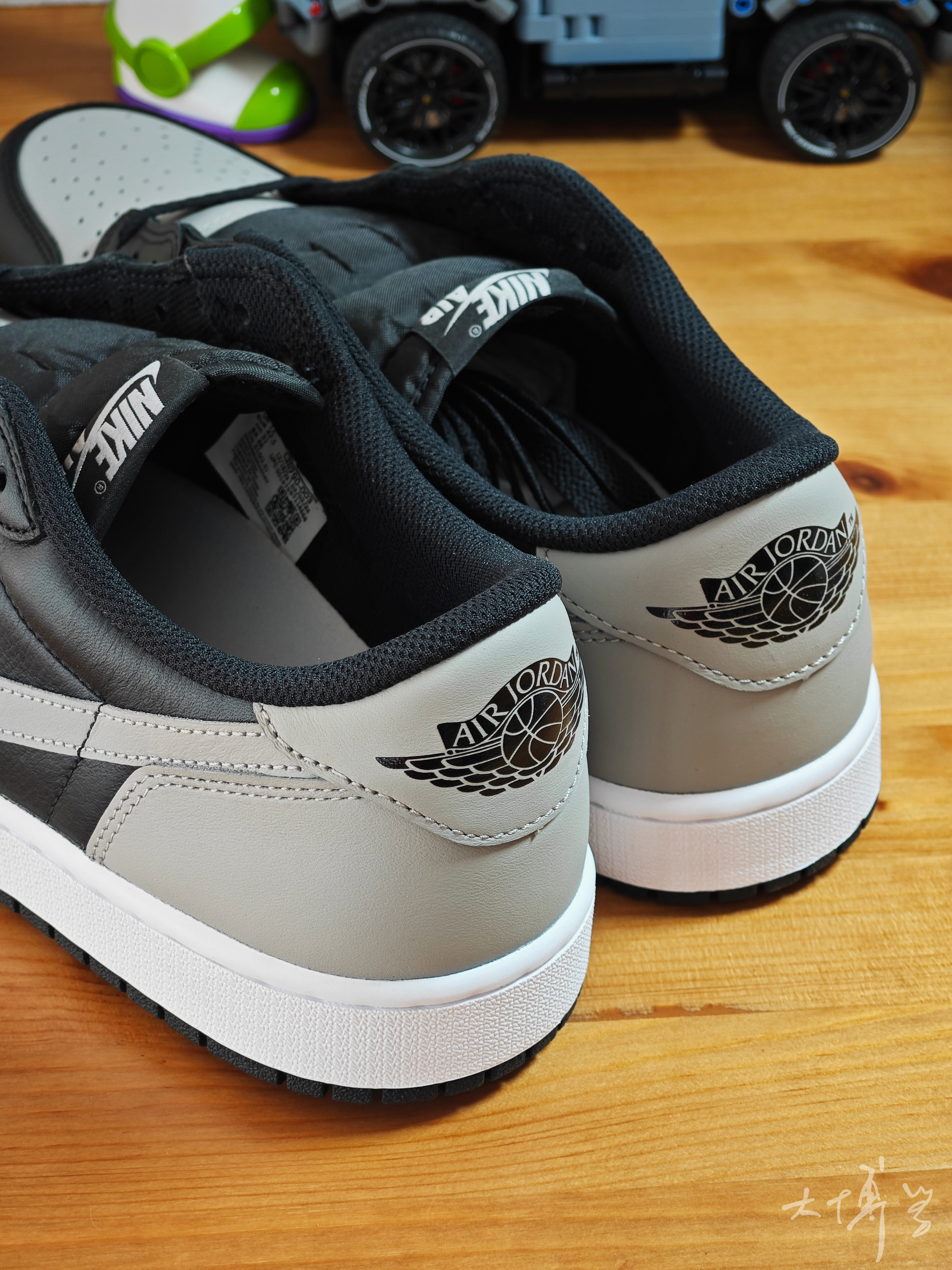 一双低帮AJ 1 灰黑配色,和影子灰高帮AJ 1配色基本一致 或者说就是那款的低帮版本 个人觉得,灰色皮质部分稍有不同 低帮看起来更显得脚修长 后跟印刷的飞翼logo 要是换成刺绣的就更棒了