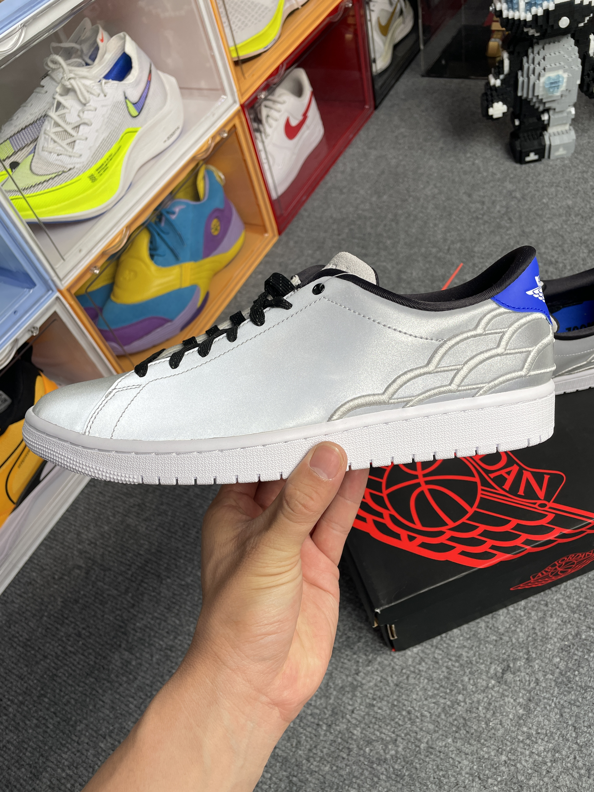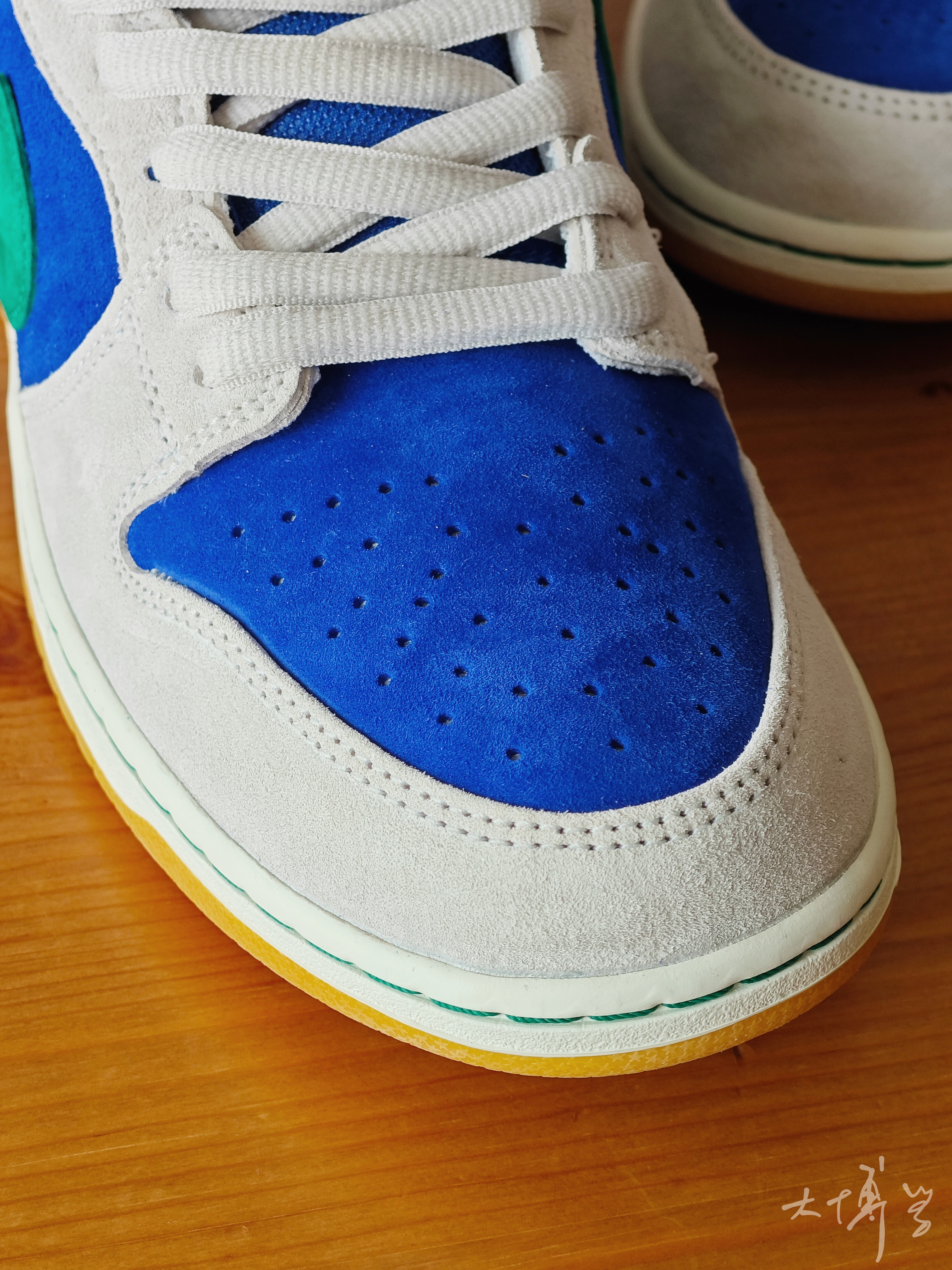 这款是SB dunk 所以鞋垫带zoom气垫 而且鞋舌和鞋跟的填充很厚实 建议比平时买大半码到一码 我很喜欢这双的蓝色部分 鞋舌和鞋跟一点绿色点缀也恰到好处