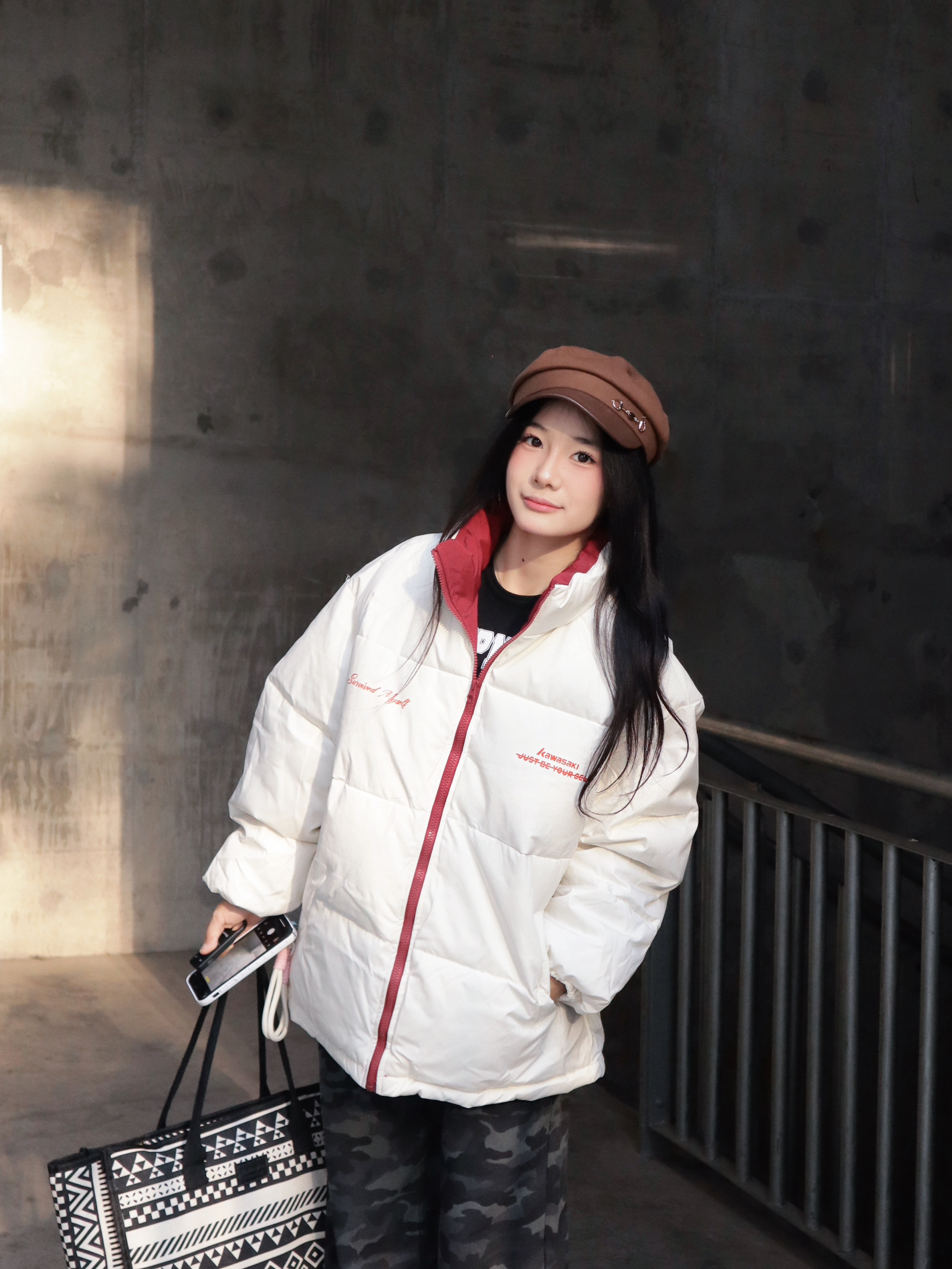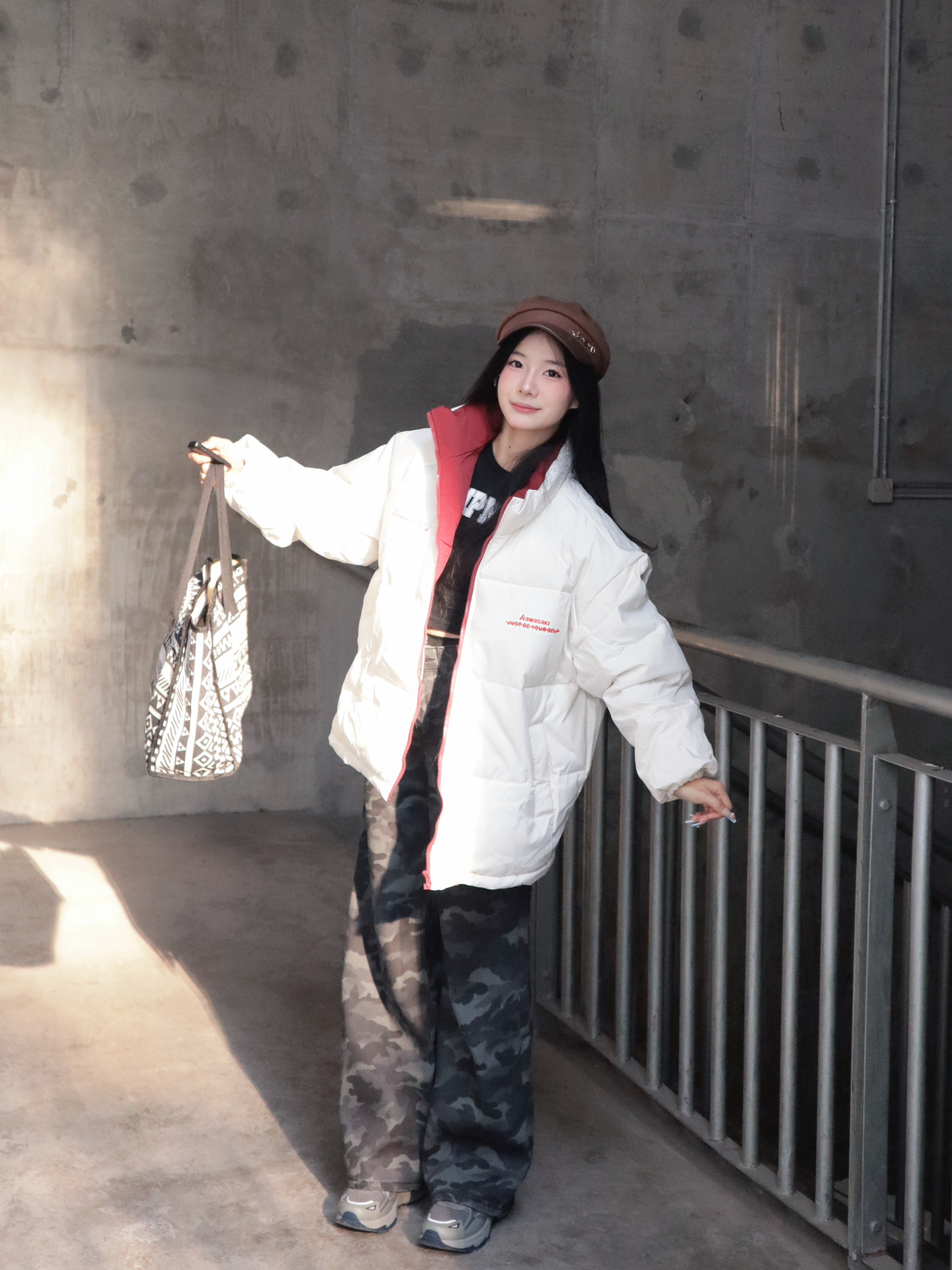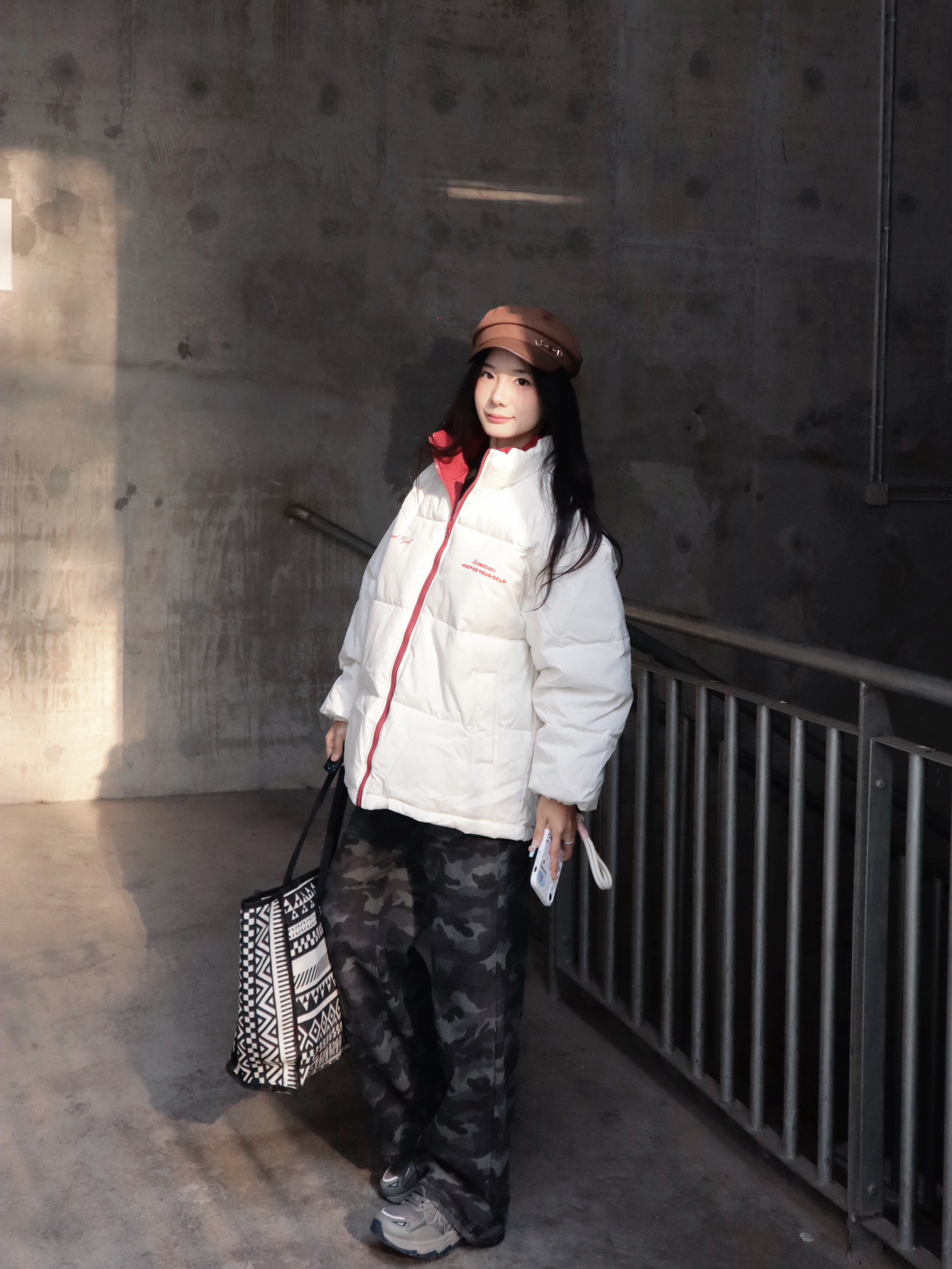 简约的白色面包服版型宽松不臃肿,红边拉链和领口的撞色设计,添了点元气感~ 下装搭了条迷彩牛仔裤,中和了羽绒服的柔和,街头风拉满! 怕冷星人也能时髦出街,羽绒服+迷彩裤的组合谁穿谁好看