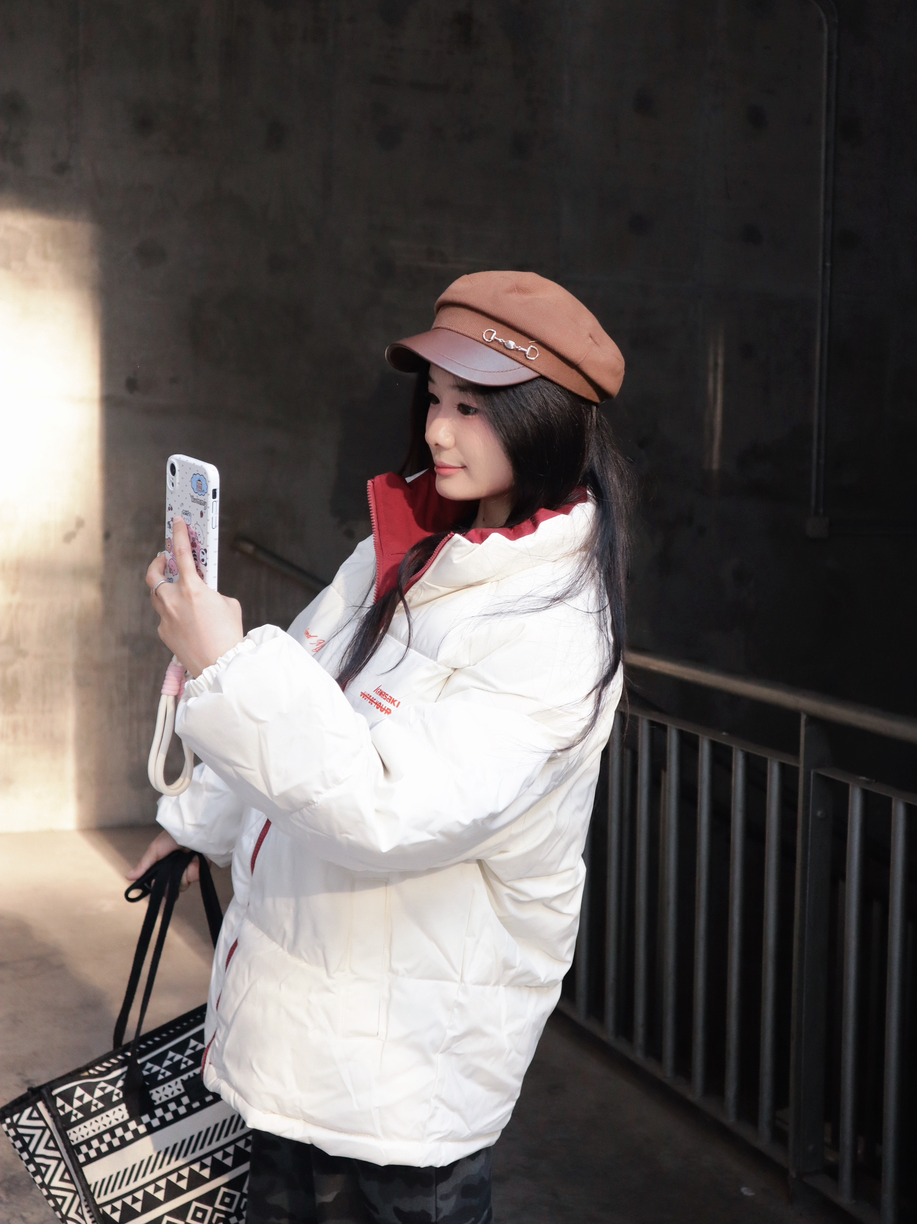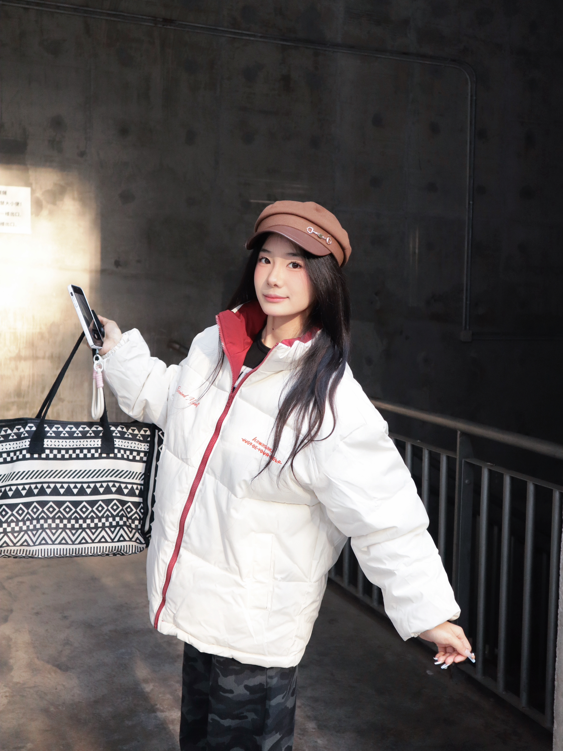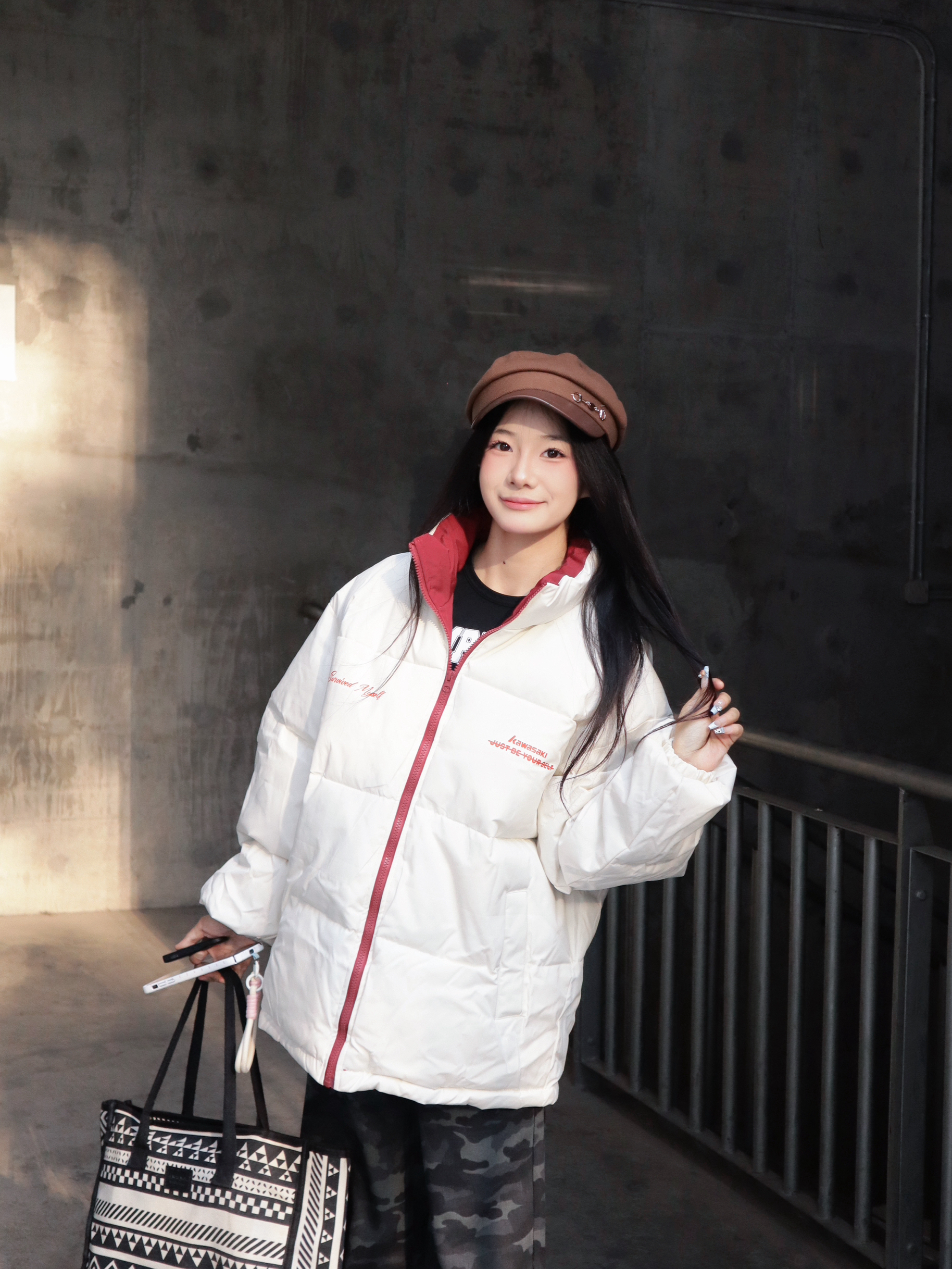 简约的白色面包服版型宽松不臃肿,红边拉链和领口的撞色设计,添了点元气感~ 下装搭了条迷彩牛仔裤,中和了羽绒服的柔和,街头风拉满! 怕冷星人也能时髦出街,羽绒服+迷彩裤的组合谁穿谁好看