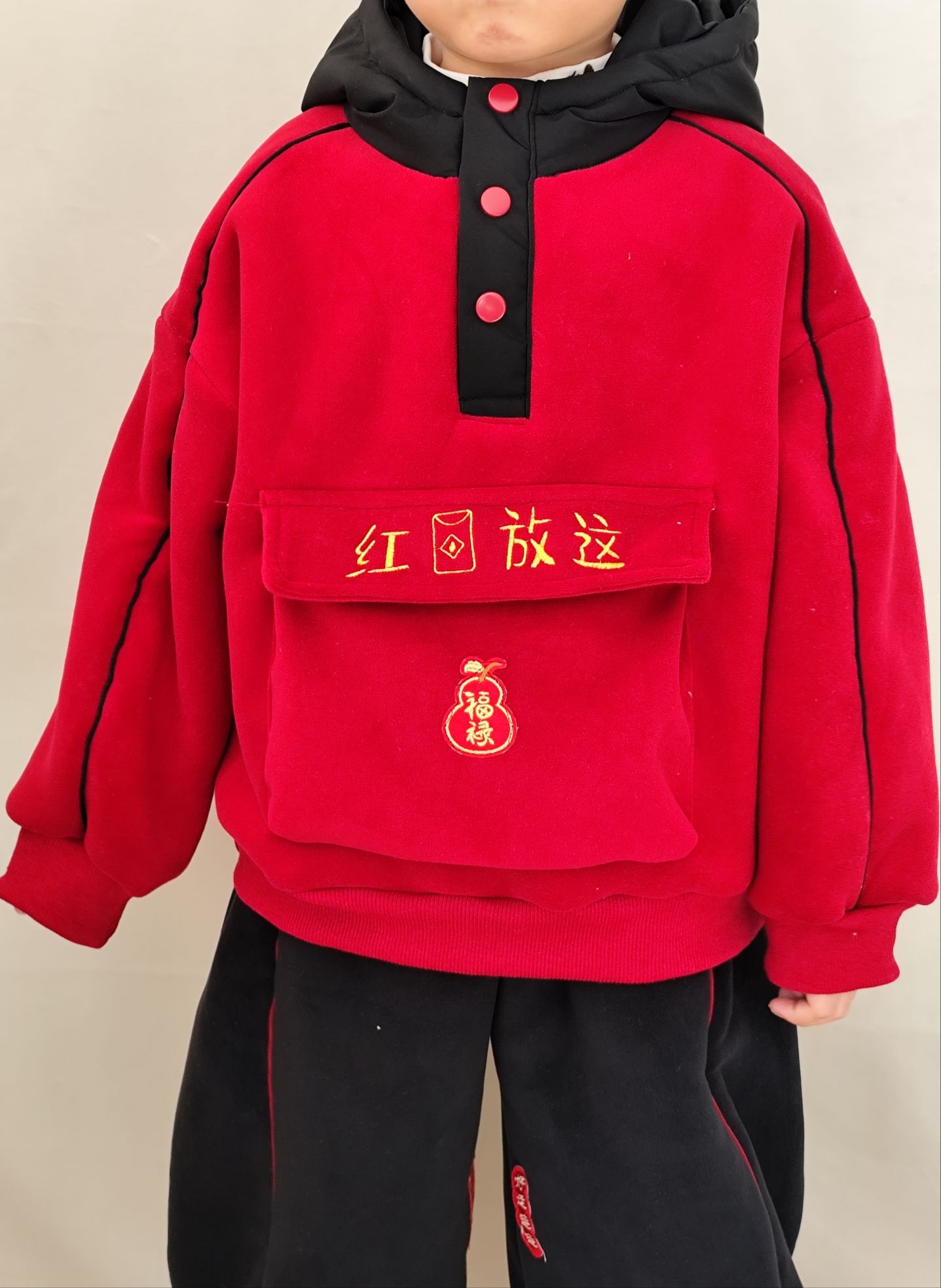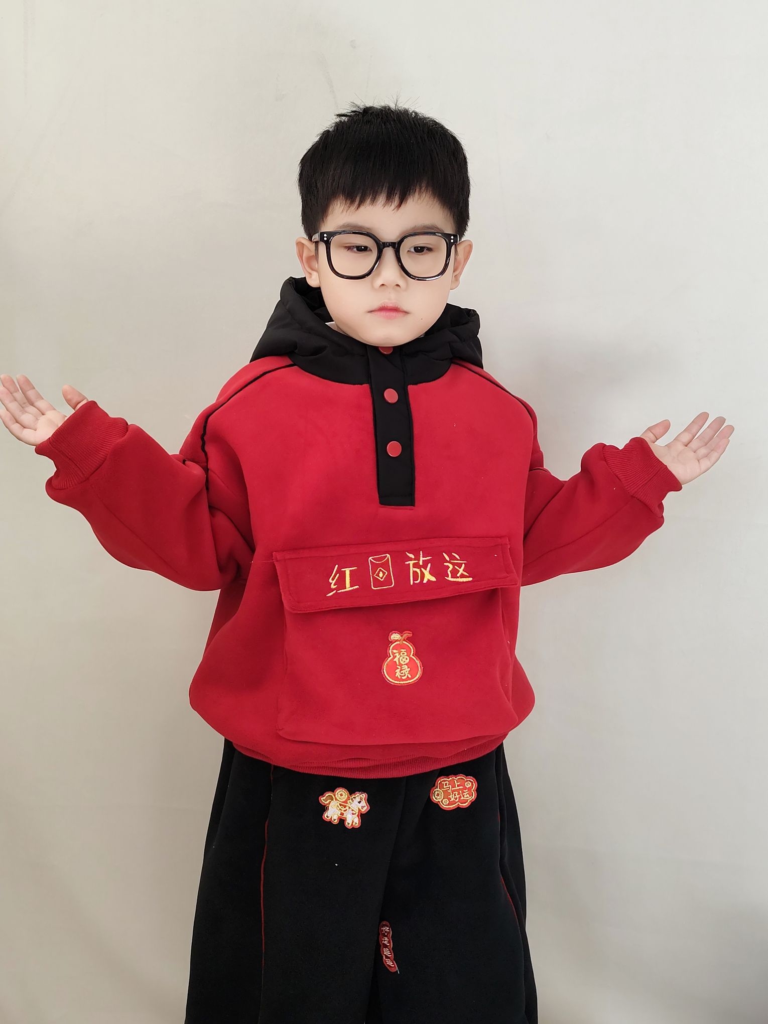 马上就要过年了,为了让宸宝穿上舒服的新年战袍,作为老母亲的我必须提前把新年战袍安排上!不得不说这套红黑撞色的国潮卫衣套装也太戳我了,“红包放这”的刺绣设计超有童趣,搭配同系列黑裤,裤子上的小刺绣也超精致,过年氛围感直接拉满~关键是套装还是加绒加厚款,摸着手感软乎乎的,内里绒质密实还不掉毛,孩子活动起来也不臃肿,宸宝说穿在身上暖烘烘的,里面的绒一点儿也不会扎人!南方北方过年穿也完全不担心冷,过年穿...