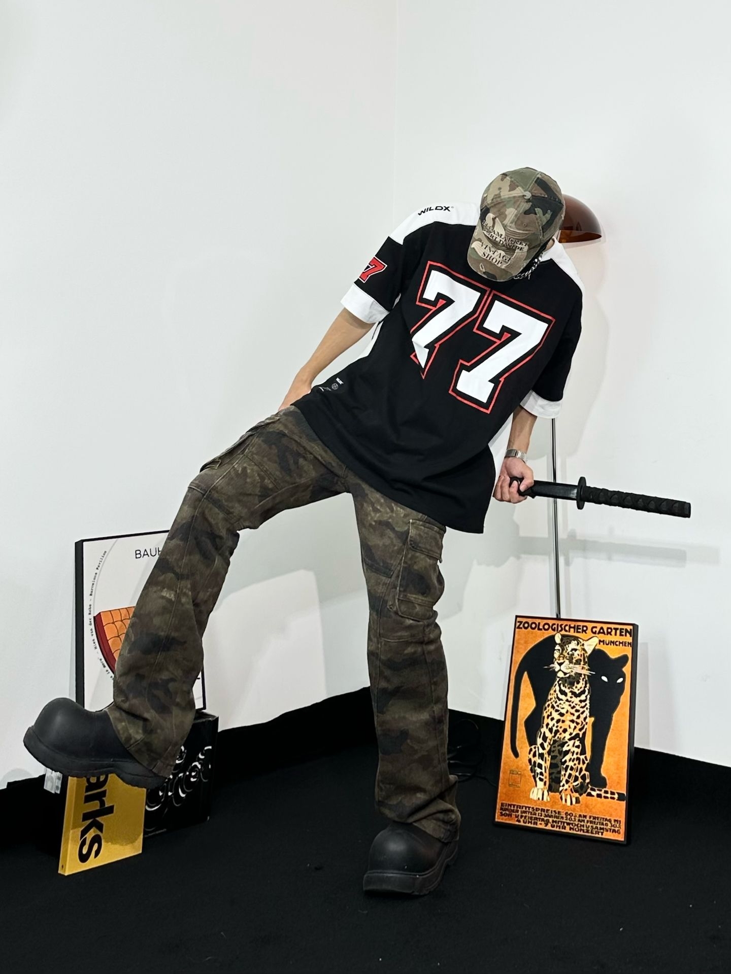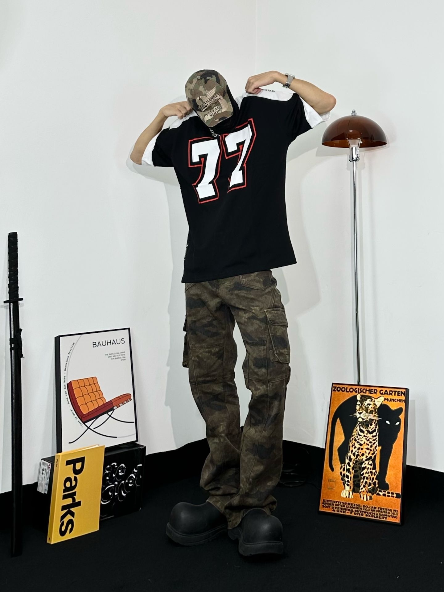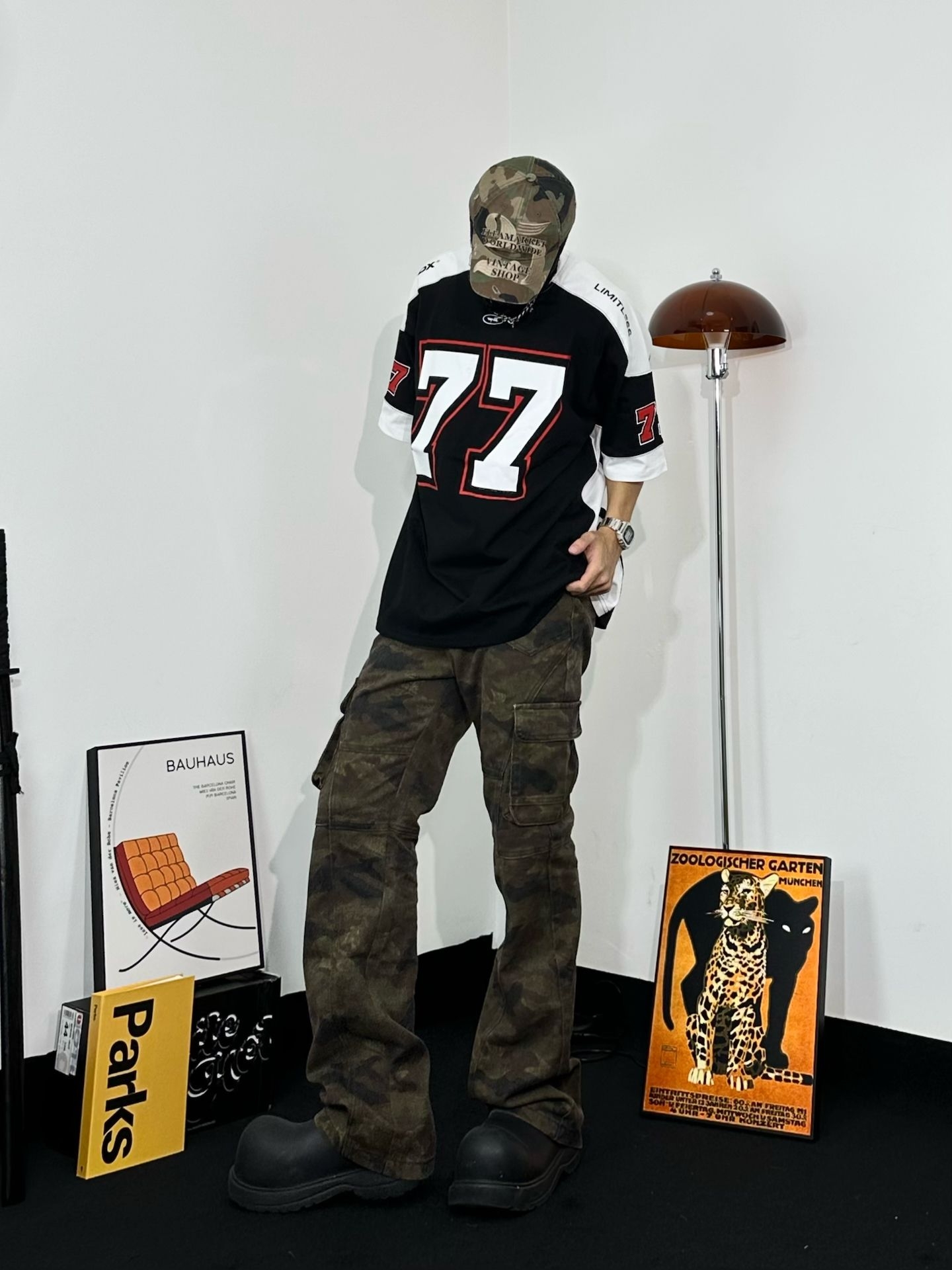 上身方面选择到了这件 WILDX 印字美式T美式复古感拉满。面料凉爽很亲肤,拼贴设计也很有美式街头感 迷彩工装裤,口袋超多超实用 而且迷彩元素一直都很潮,街头氛围拿捏 还是那双厚底鞋,和上一套搭配风格不同 但都能轻松hold住。迷彩棒球帽和裤子呼应 出街拍照超有感觉啊 秒变街头焦点!