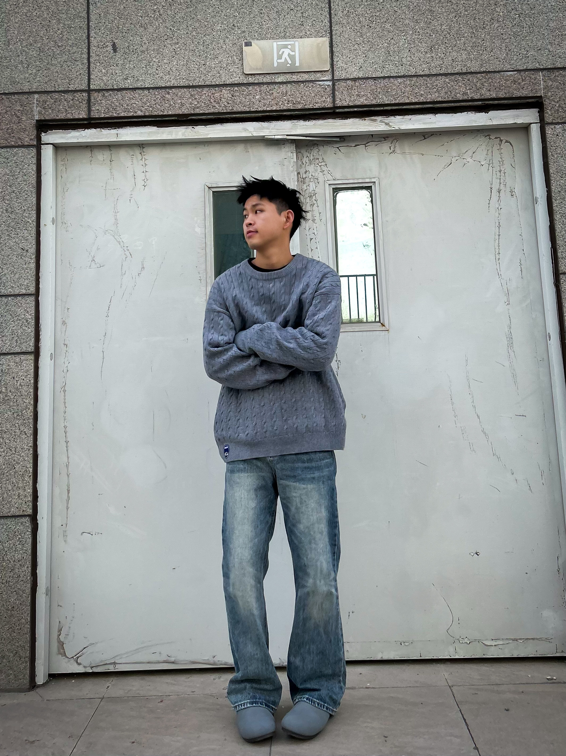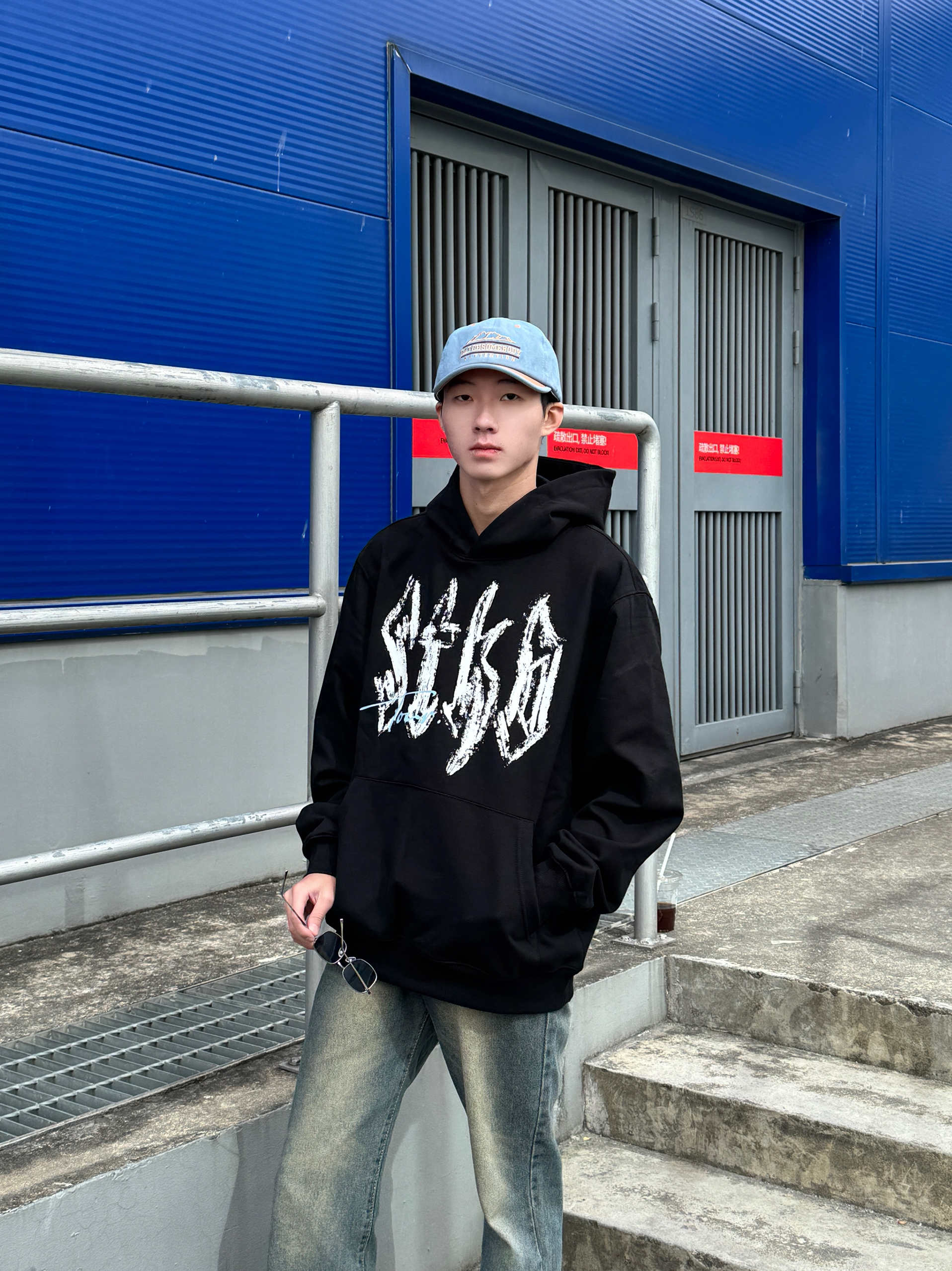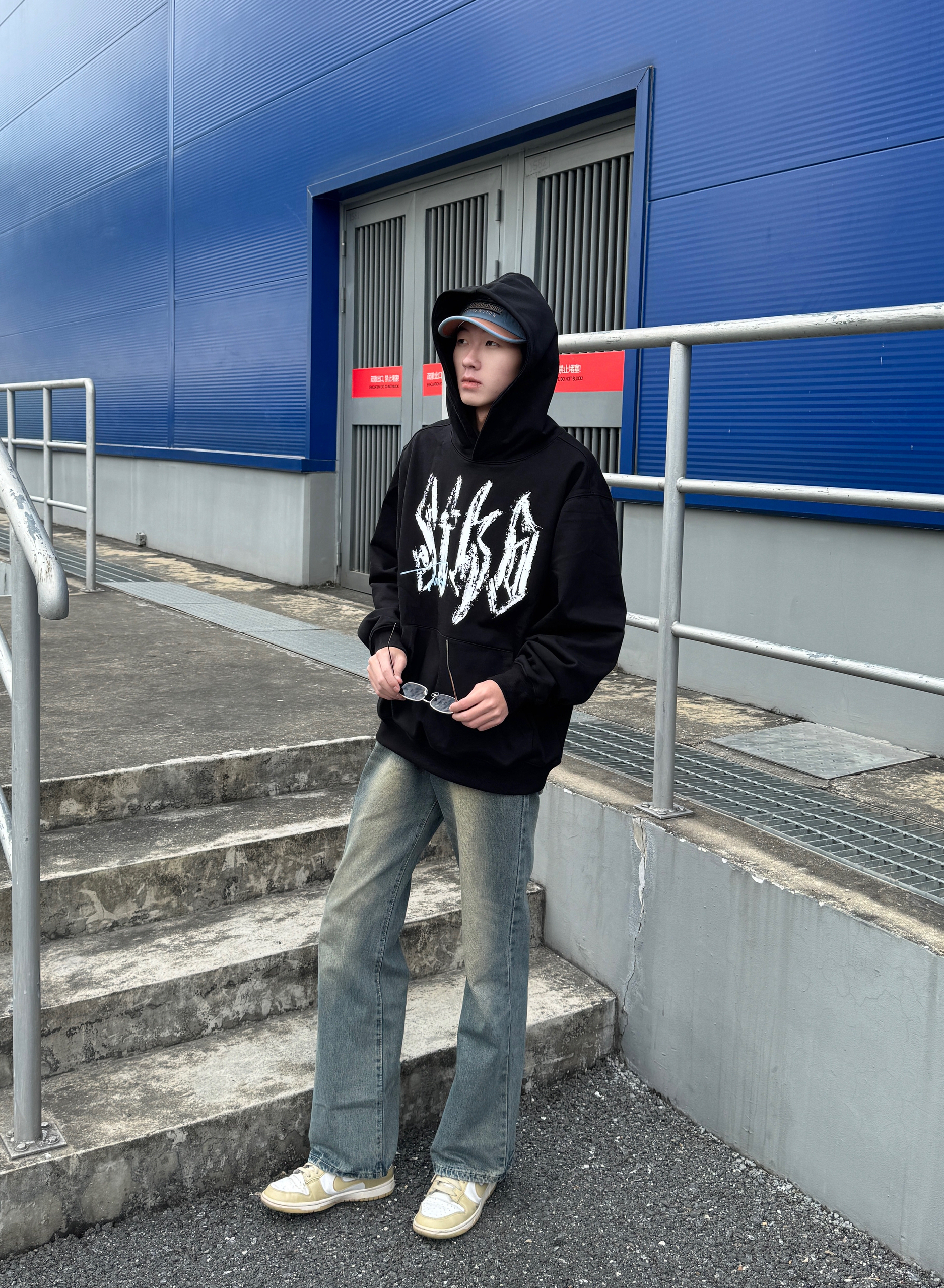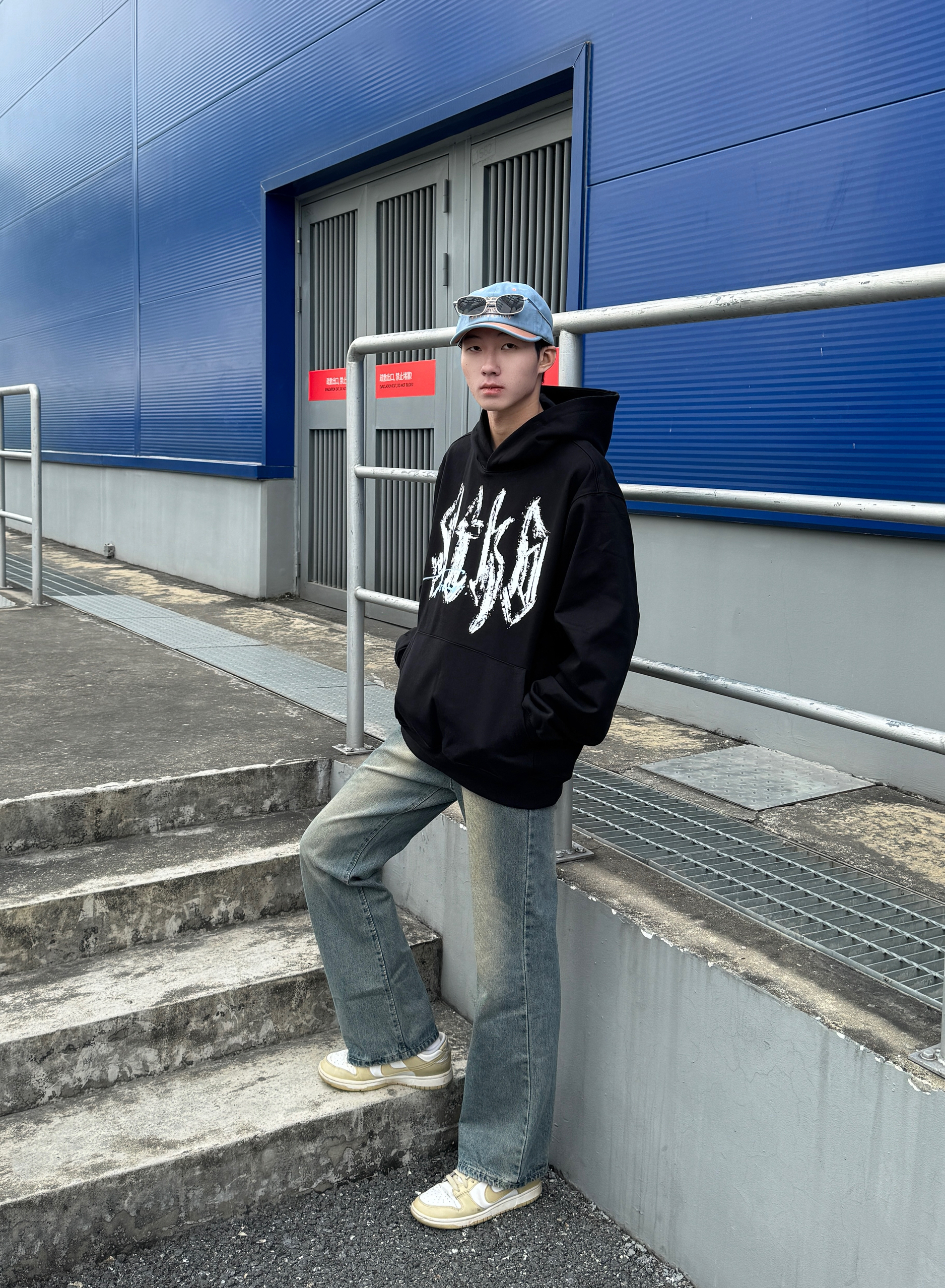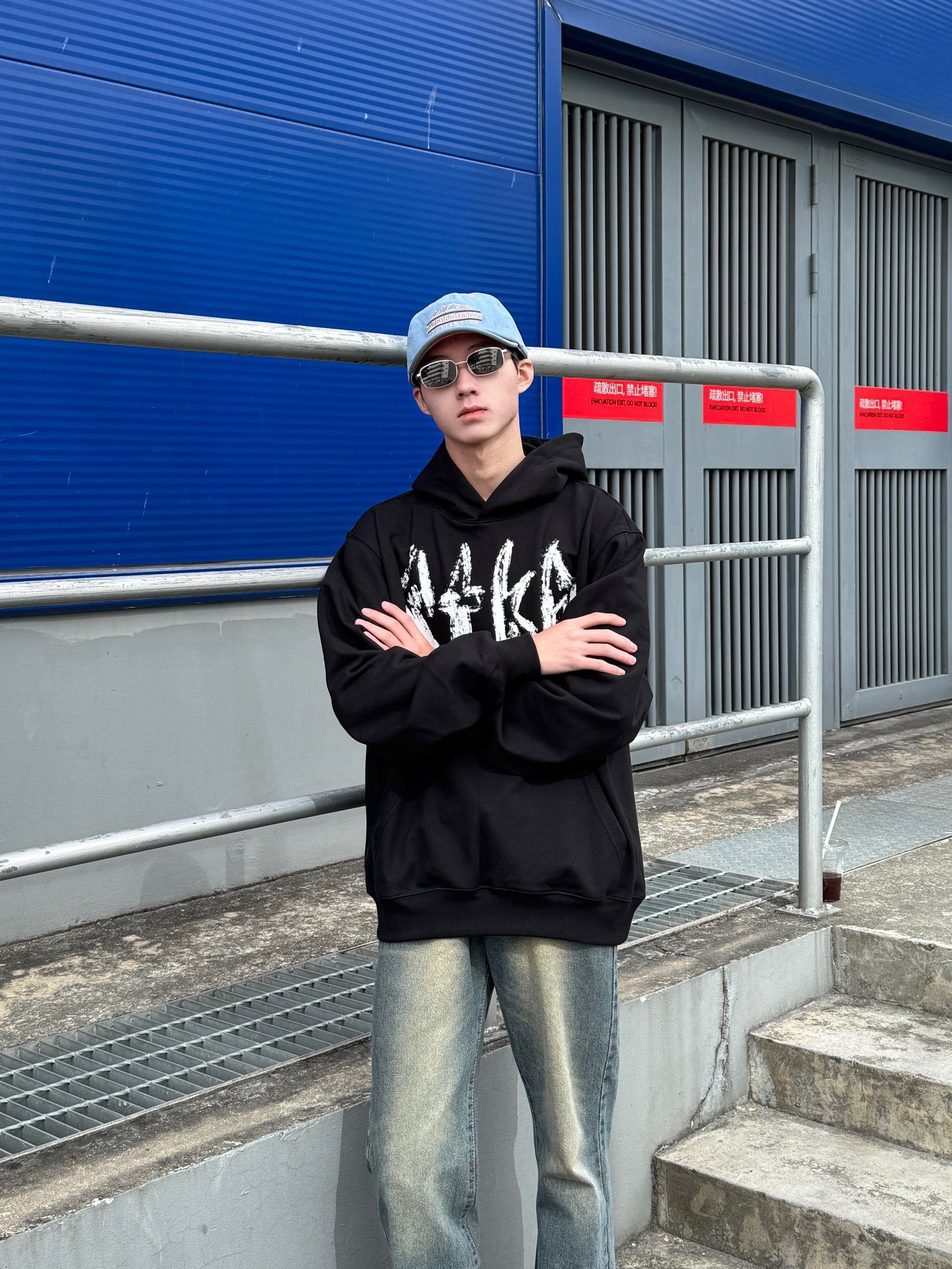这套简直是复古男孩的衣柜标配 黑色美式复古连帽卫衣 版型宽松面料扎实 胸前的复古印花是点睛之笔✨ 下身搭配经典复古蓝牛仔裤 水洗色调和适度磨损感自带岁月味道 整体散发着不刻意的复古气息 舒服又有型 像从90年代电影里走出来的画面~