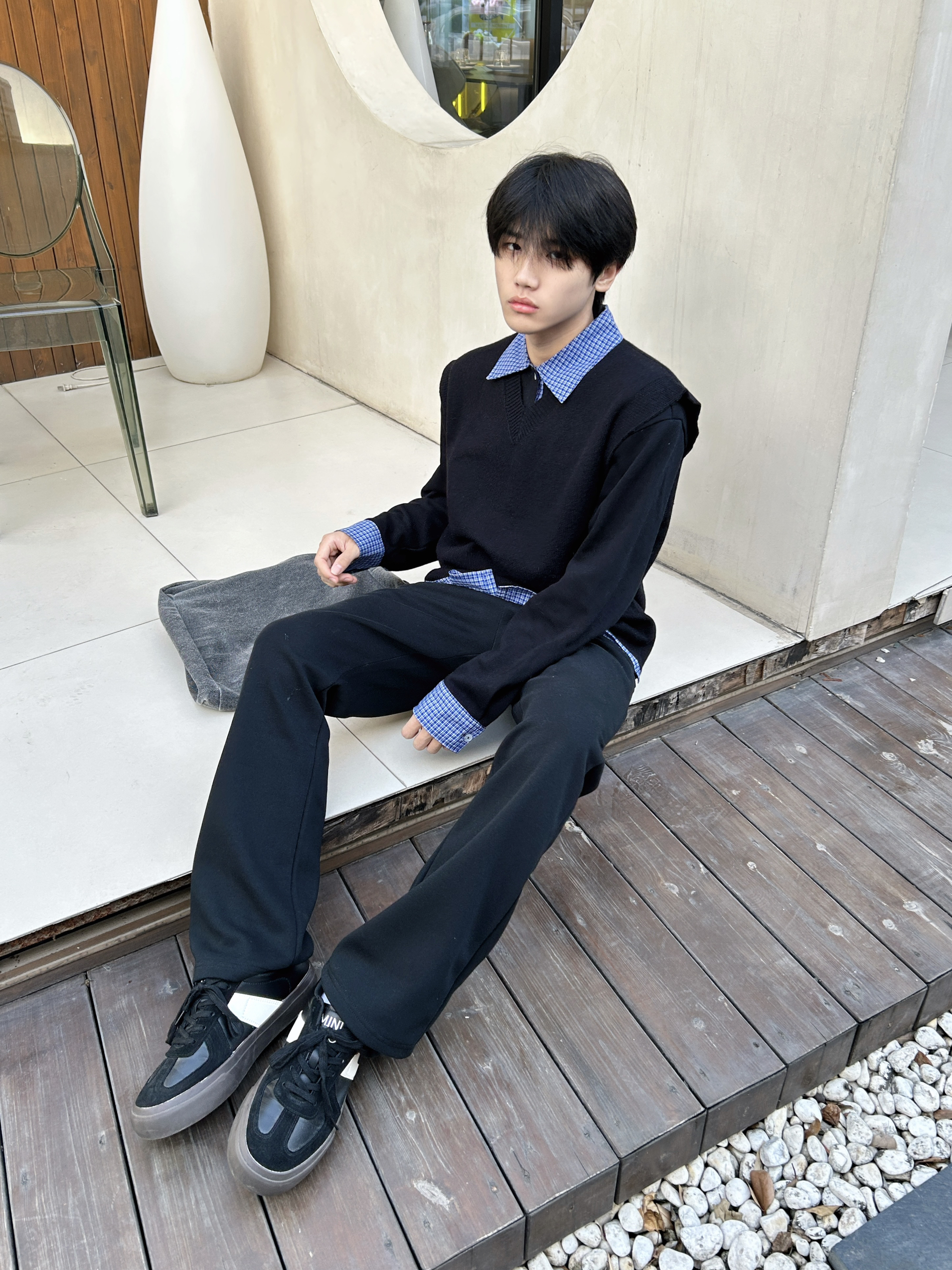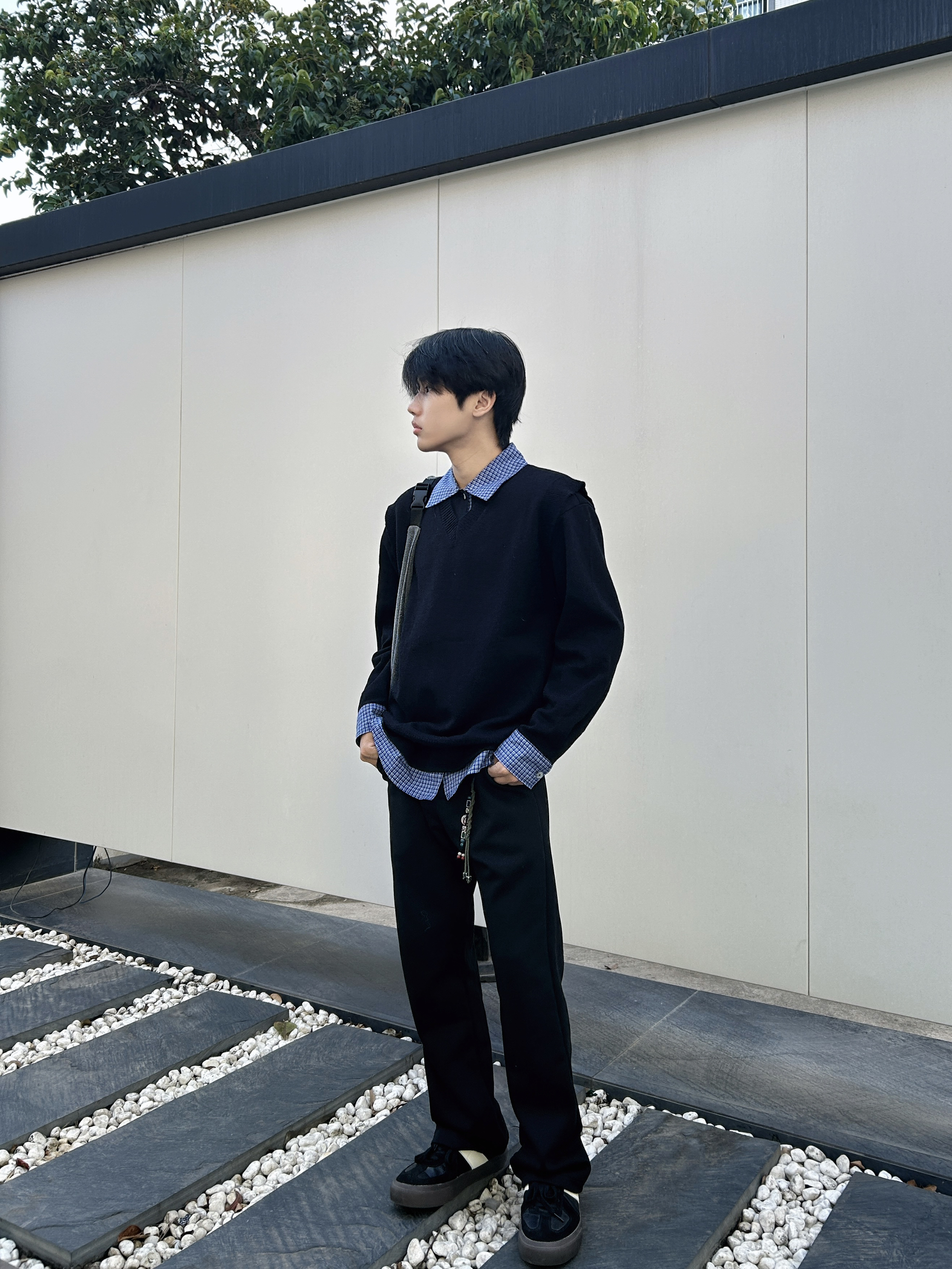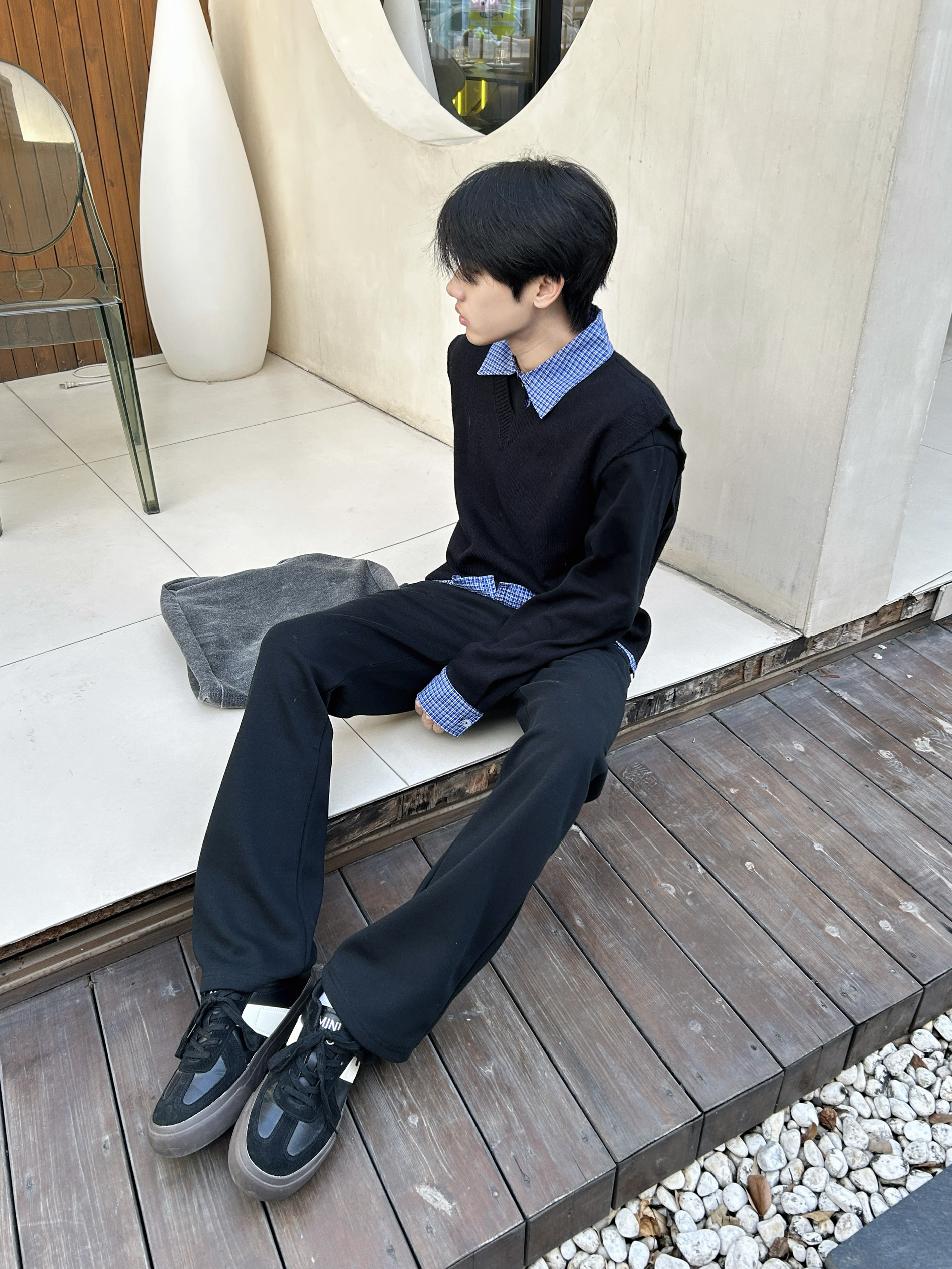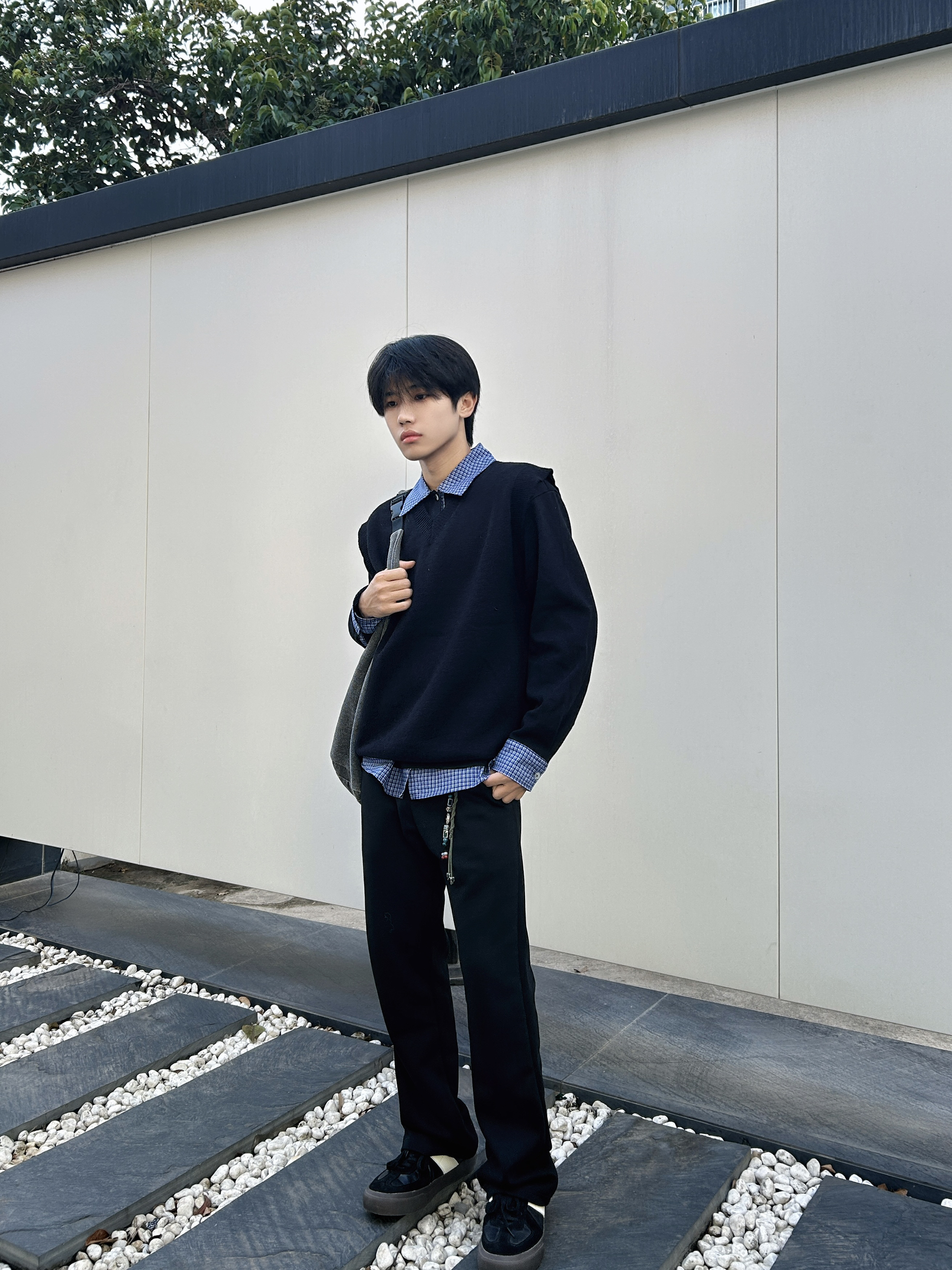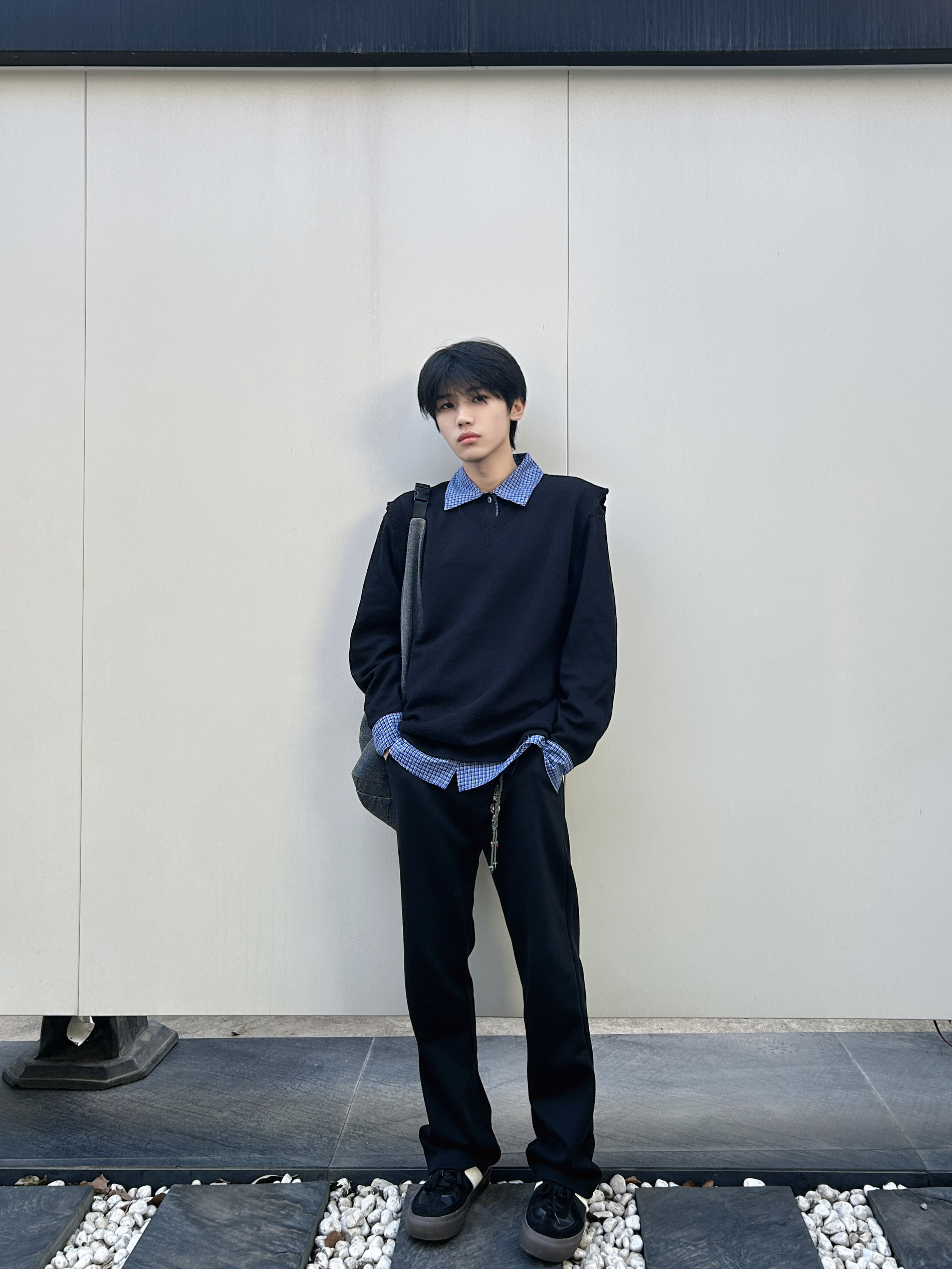 冷调阴天里低饱和的黑蓝 搭出清爽少年感 以黑色针织衫为主体构建简约基底 内搭蓝格衬衫做领口与袖口的层次延伸 纯黑直筒裤强化整体利落线条 黑色板鞋呼应上衣色调 让基础款叠穿既有少年清爽感 又不失穿搭的精致细节
