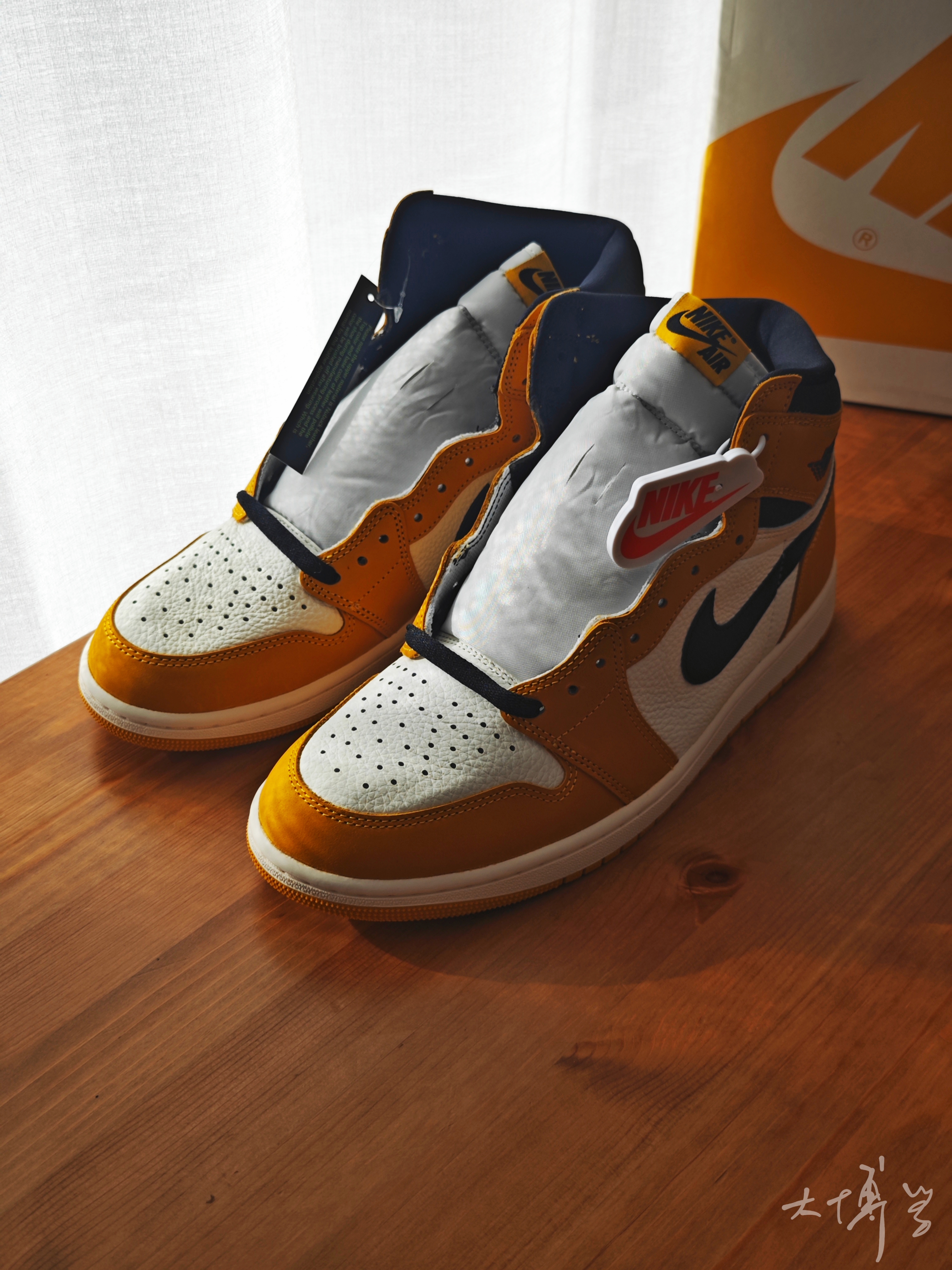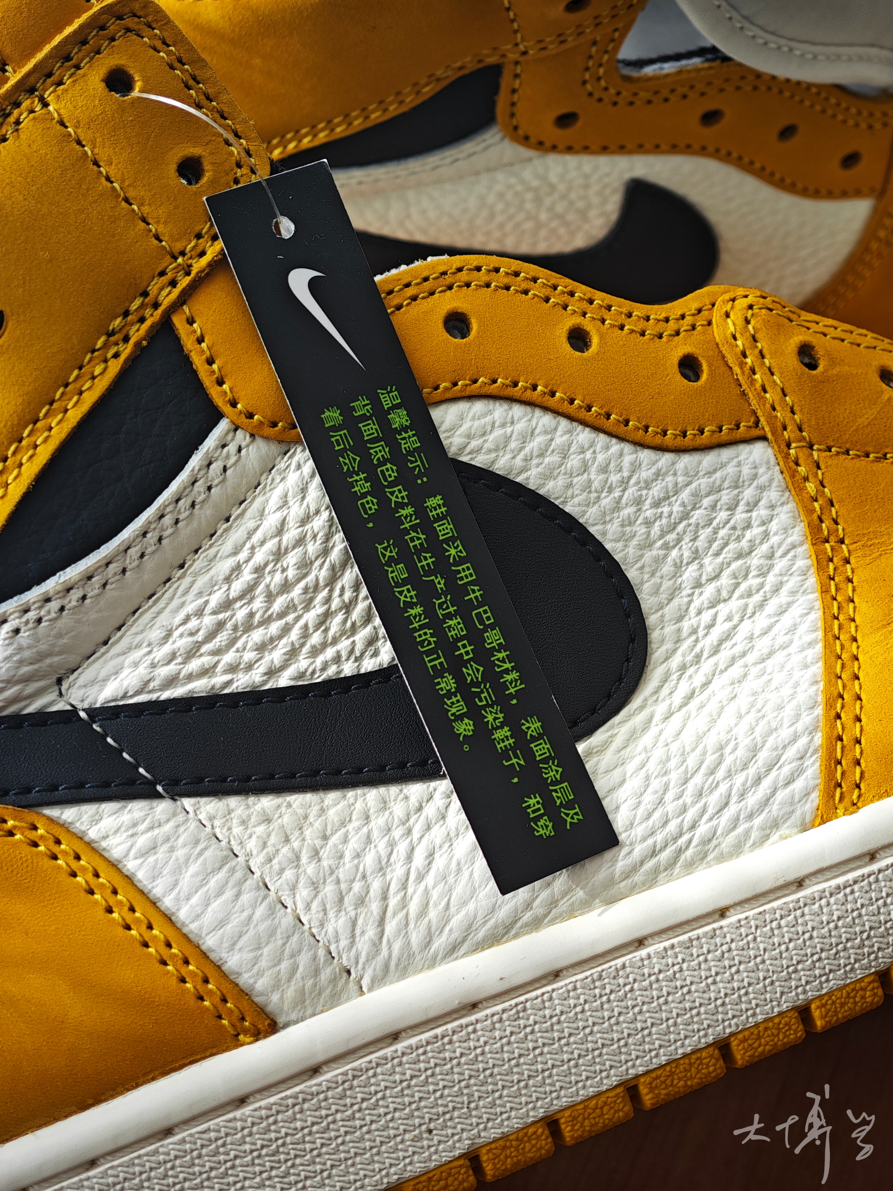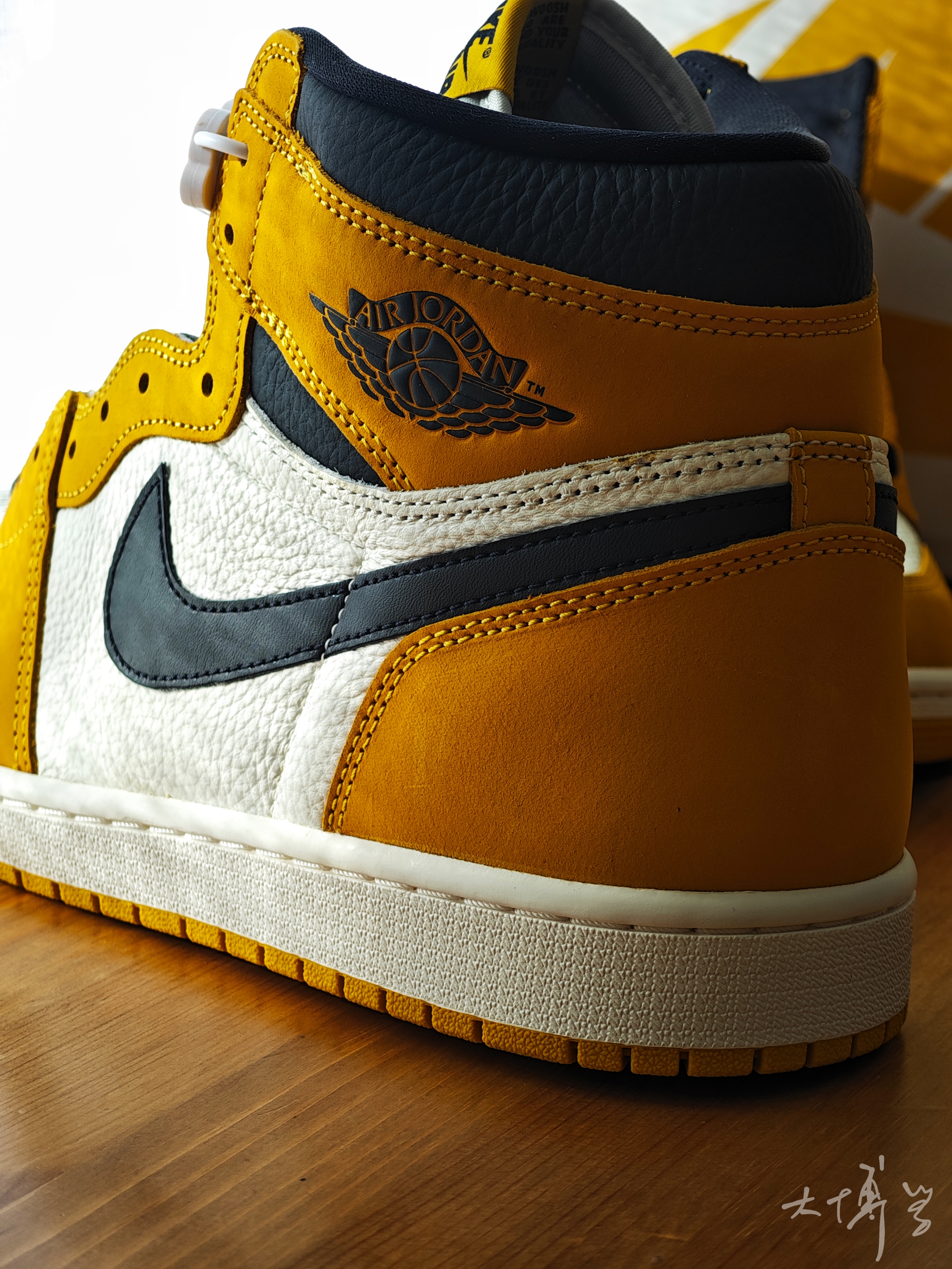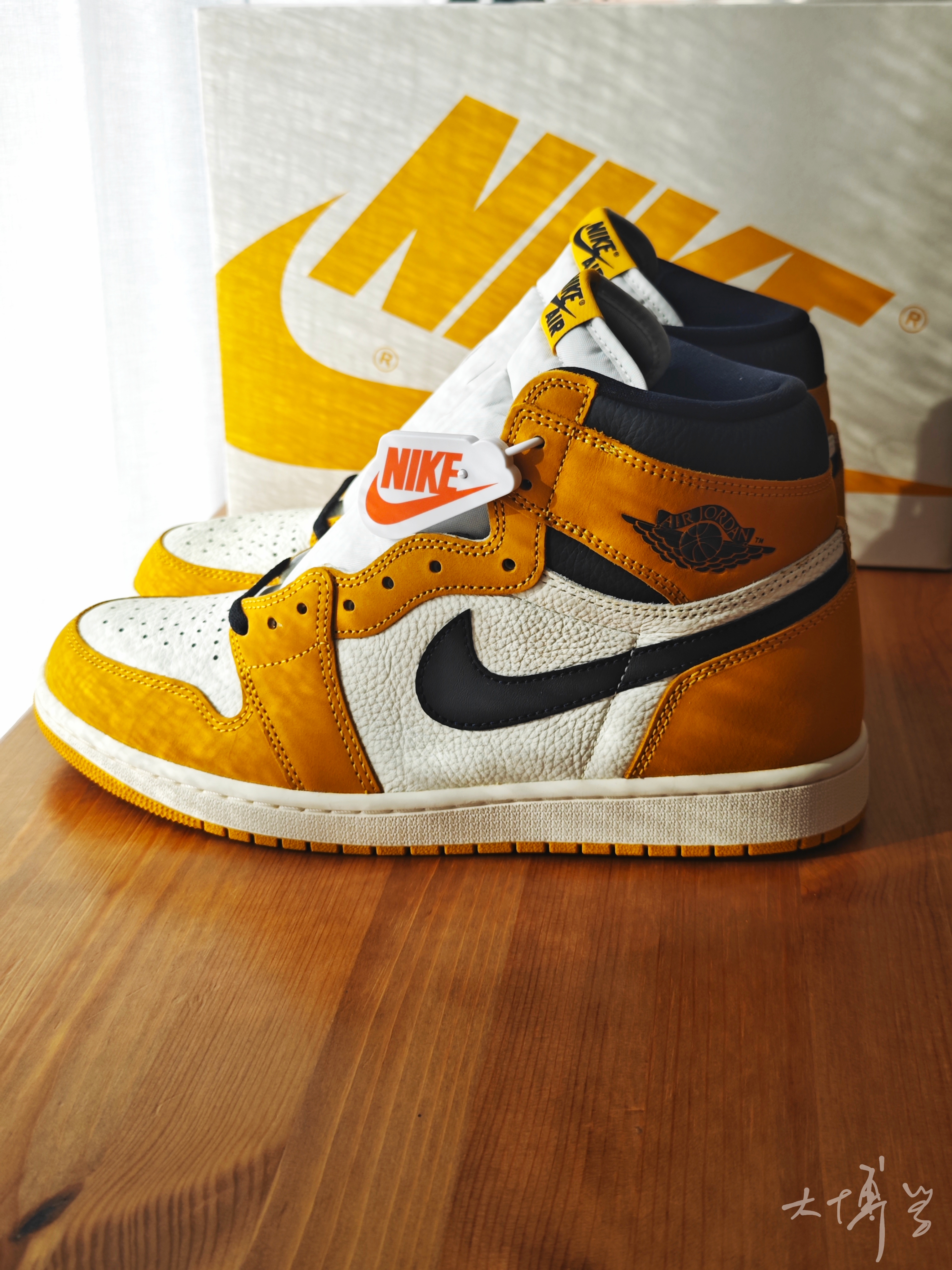 一双棕黄色的高帮AJ 1 买之前总觉得和那双“新秀”AJ 1撞脸 到手发现差距还是挺大的 鞋面白色部分是纹理很大的荔枝皮 棕黄色是磨砂皮 两种皮革搭配的质感还不错 我个人更喜欢这种白色皮革的质感 还是很值得一看的