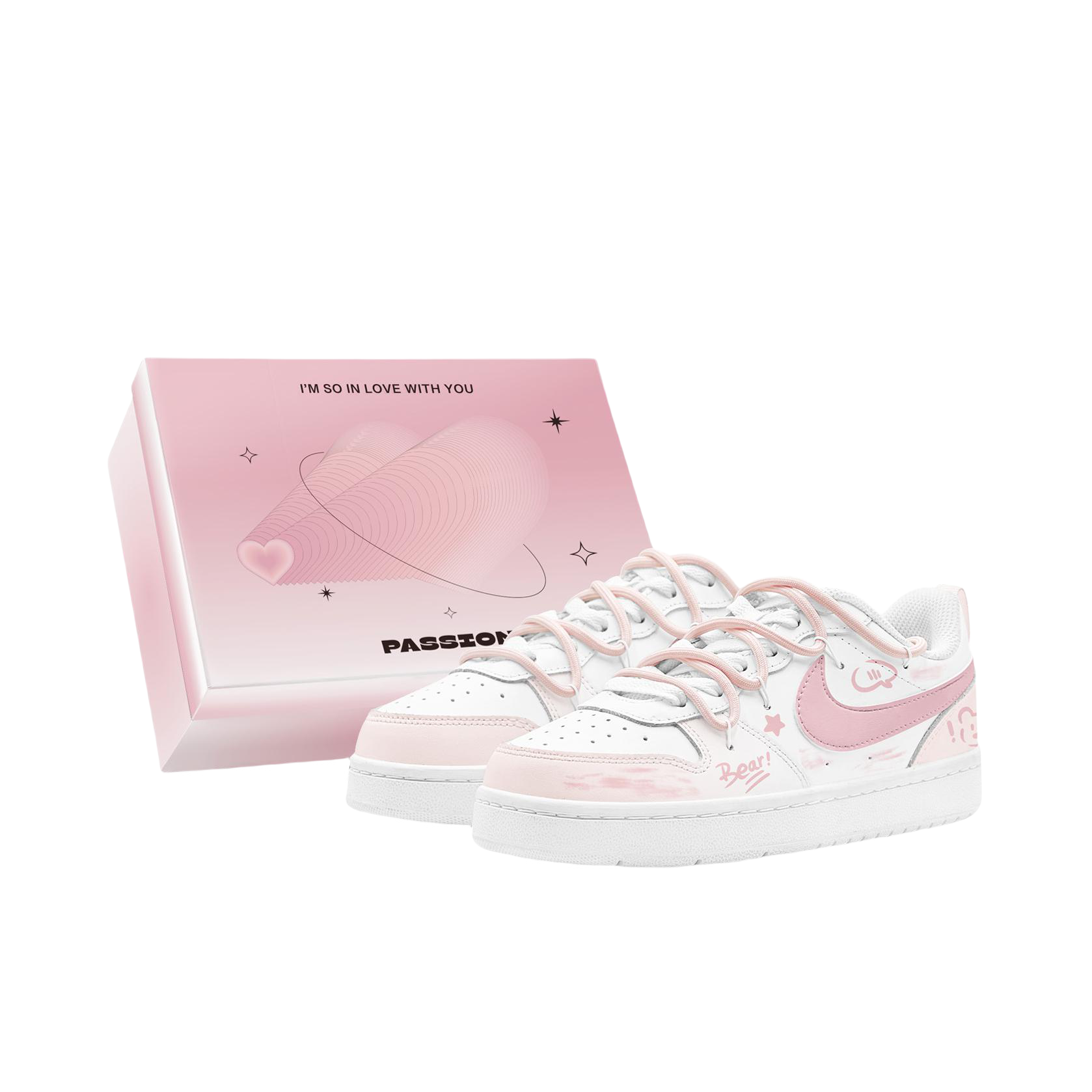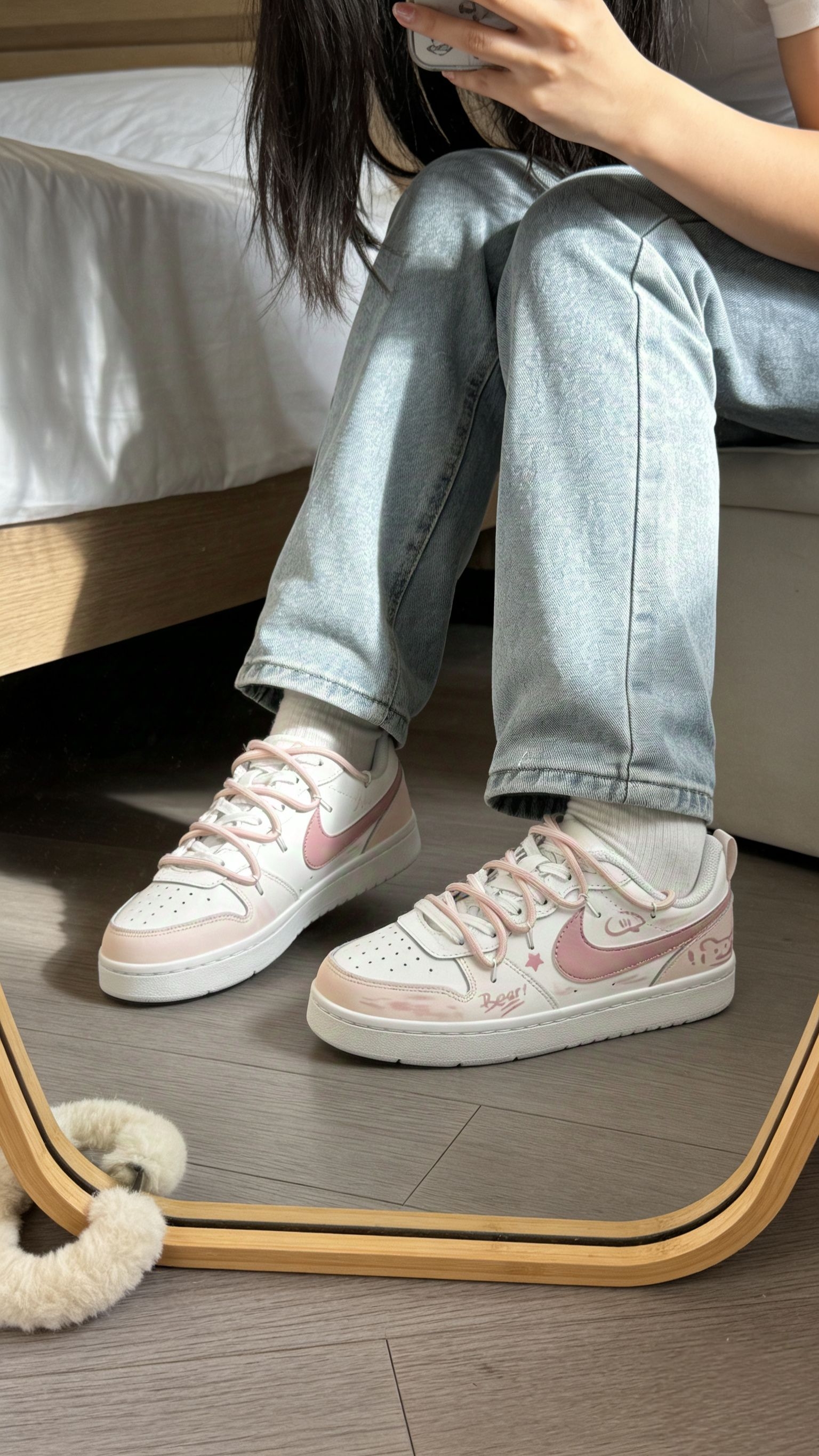 这双粉白Nike板鞋也太好看了吧,鞋面是软乎乎的皮质,摸起来超舒服,小熊涂鸦和星星图案萌到心坎里,出门完全不永怕撞款。我最近几乎穿它,搭浅蓝牛仔裤就是韩系甜妹,配粉白汉服居然也超和谐,甜酷风直接拉满。鞋底是那种软软的橡胶底,踩上去跟踩棉花似的,上周逛街走了一万步都没觉得累脚,再也不用为了好看硬扛磨脚的鞋子。黄皮姐妹也放心冲,这个粉白渐变配色巨显白,完全不会踩雷。通勤搭黑色西装裤也超合适,打工人表示...