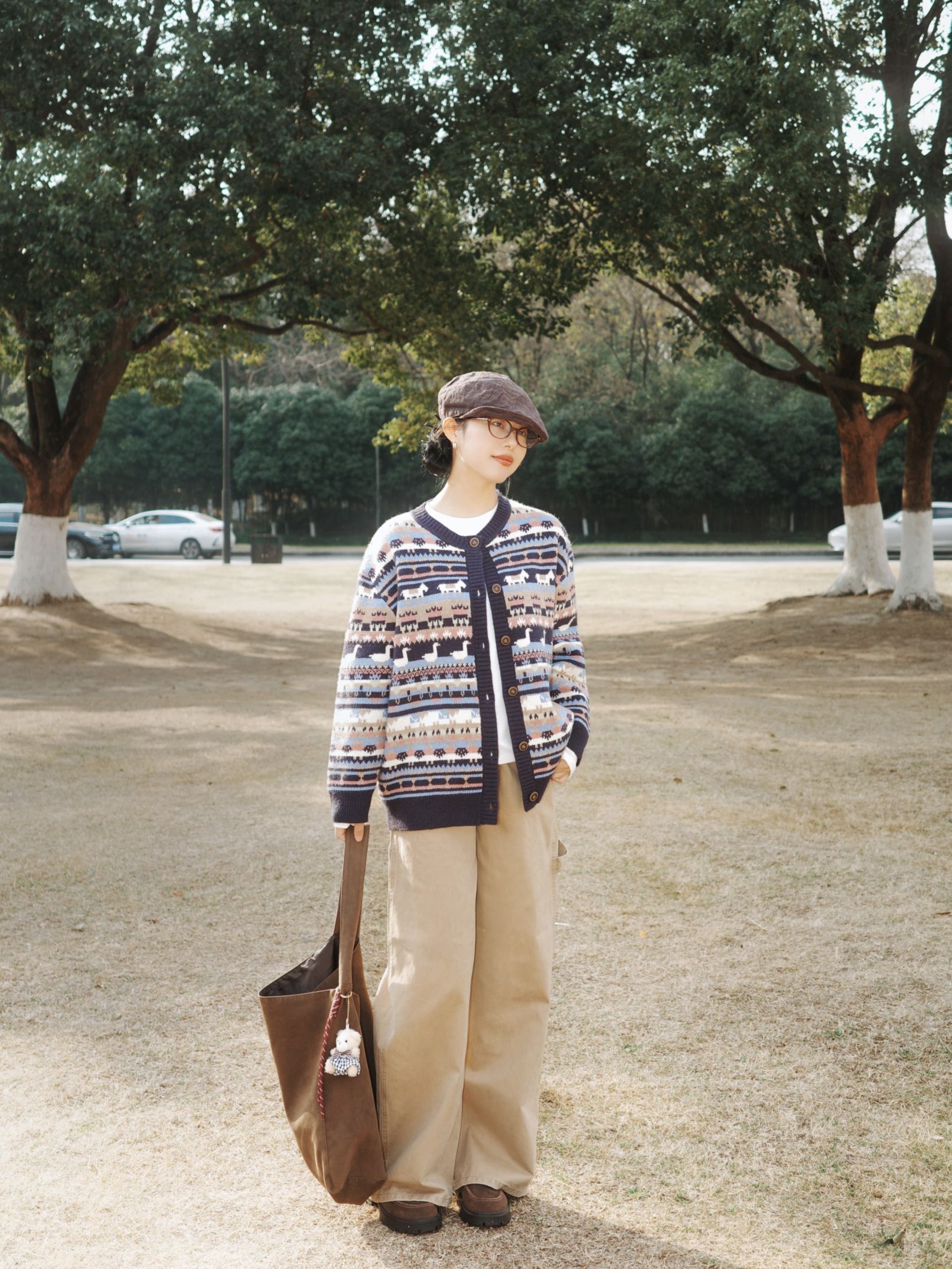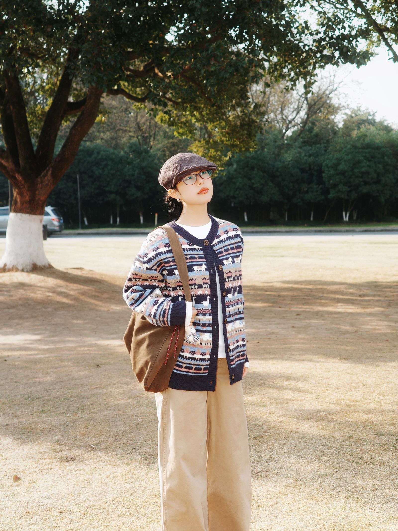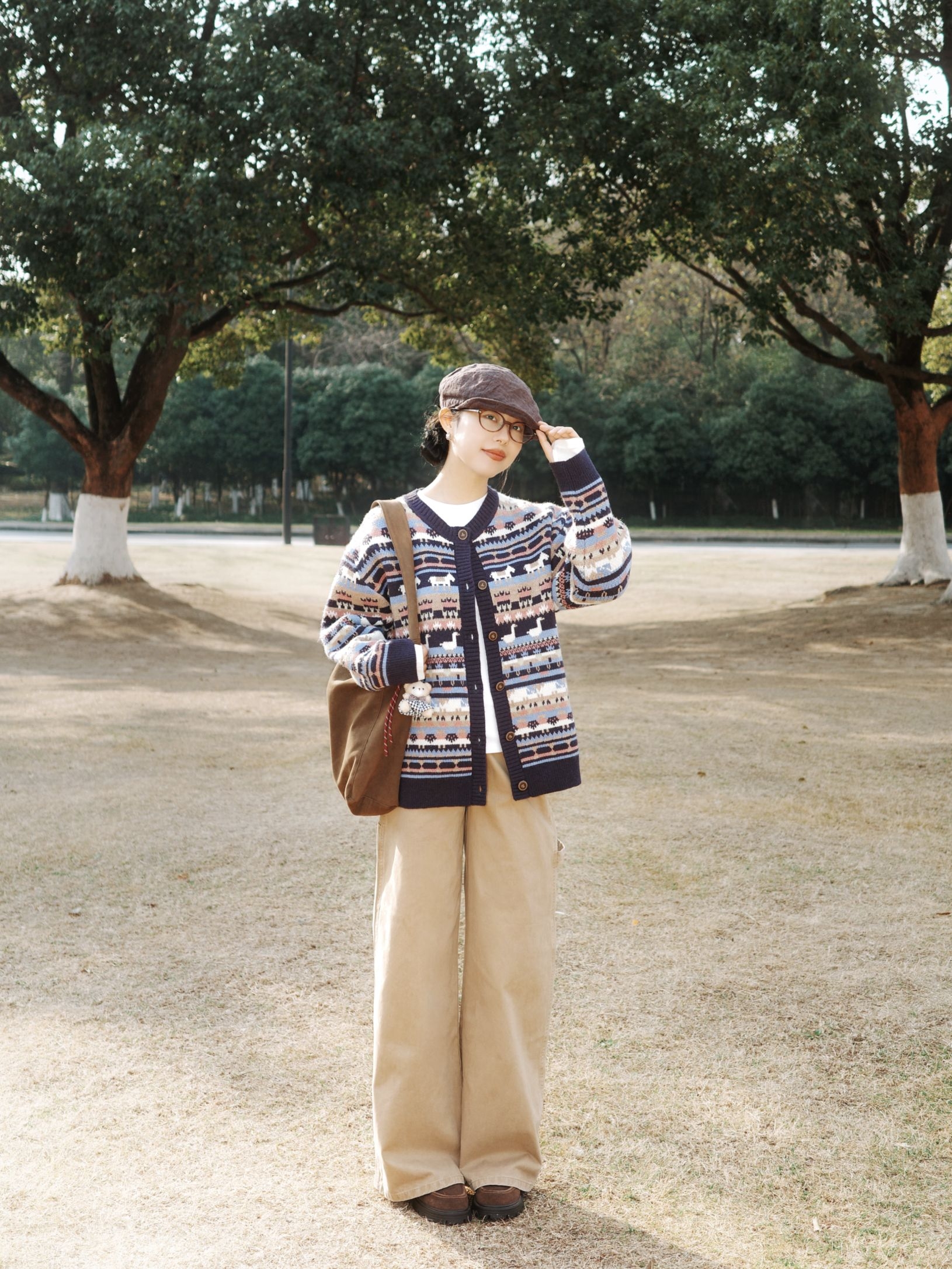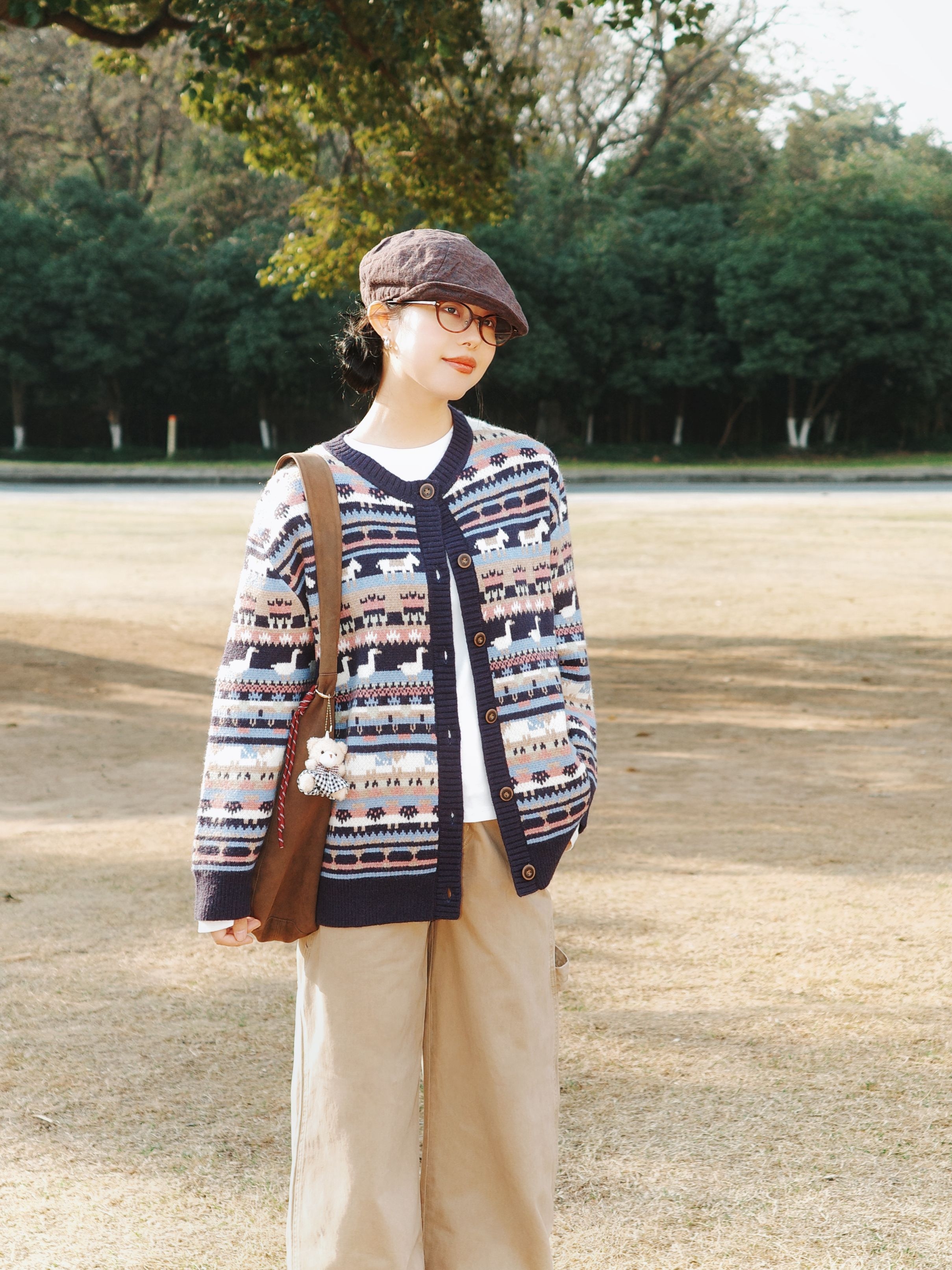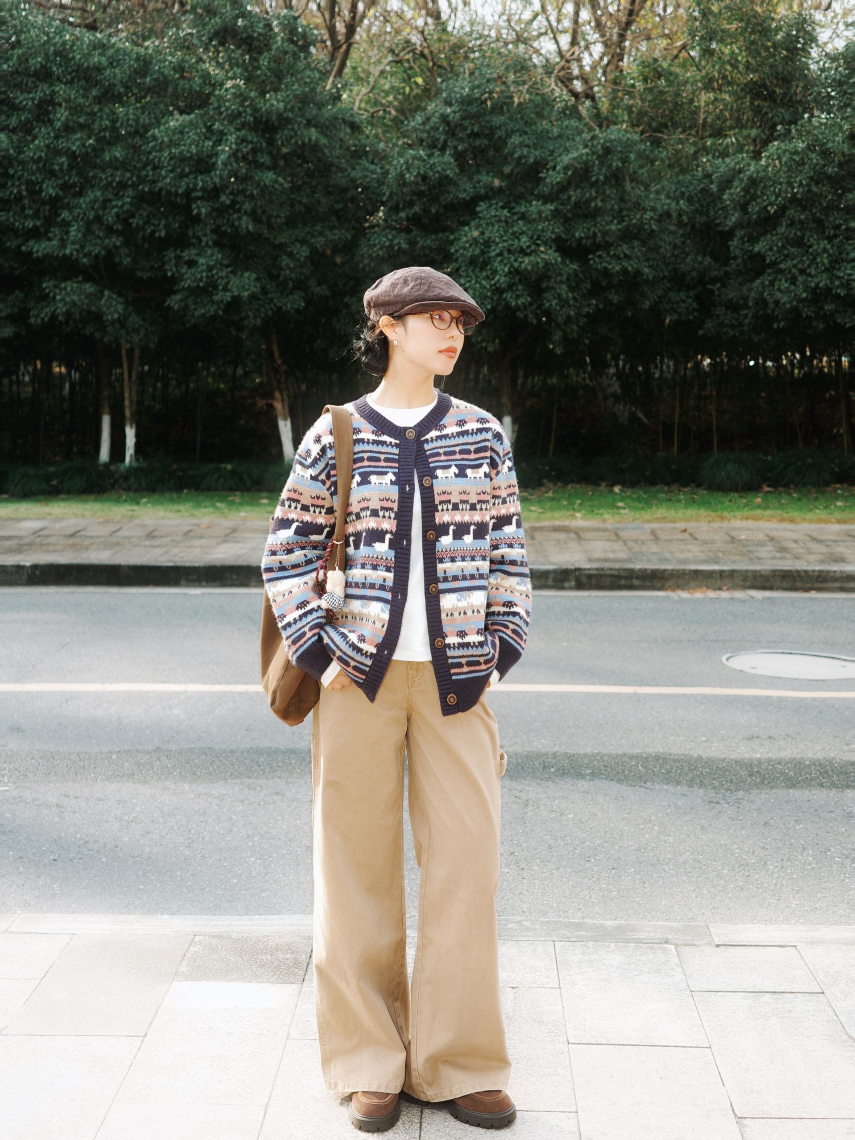 冬日林间踱步,费尔岛毛衣的复古文艺风揉出像秋日林海般的斑斓质感🍂 复古图案费尔岛毛衣如同拼贴的林间彩叶,丰富的纹样带着浓郁的复古腔调,内搭白色打底,干净的底色让图案更显鲜活~ 卡其色工装裤宽松又利落,棉质的肌理像初冬的草地般温润,和毛衣的复古纹样碰撞出文艺又随性的氛围~ 配上报童帽、棕色挎包与复古皮鞋,大地色系的配饰让整体的复古文艺感更完整
