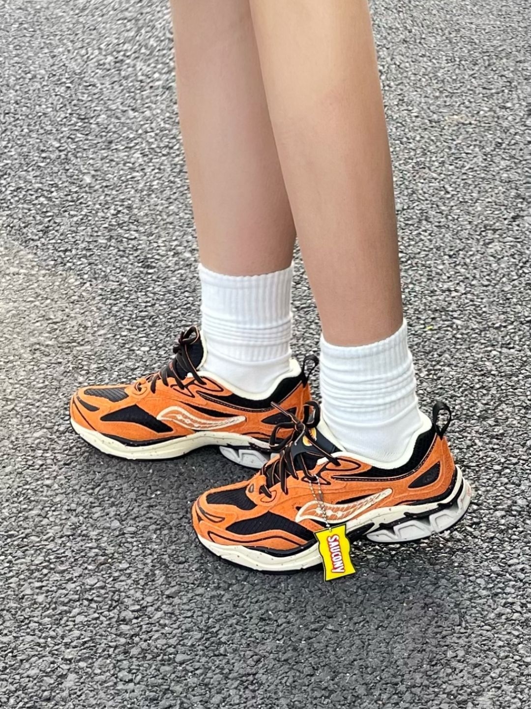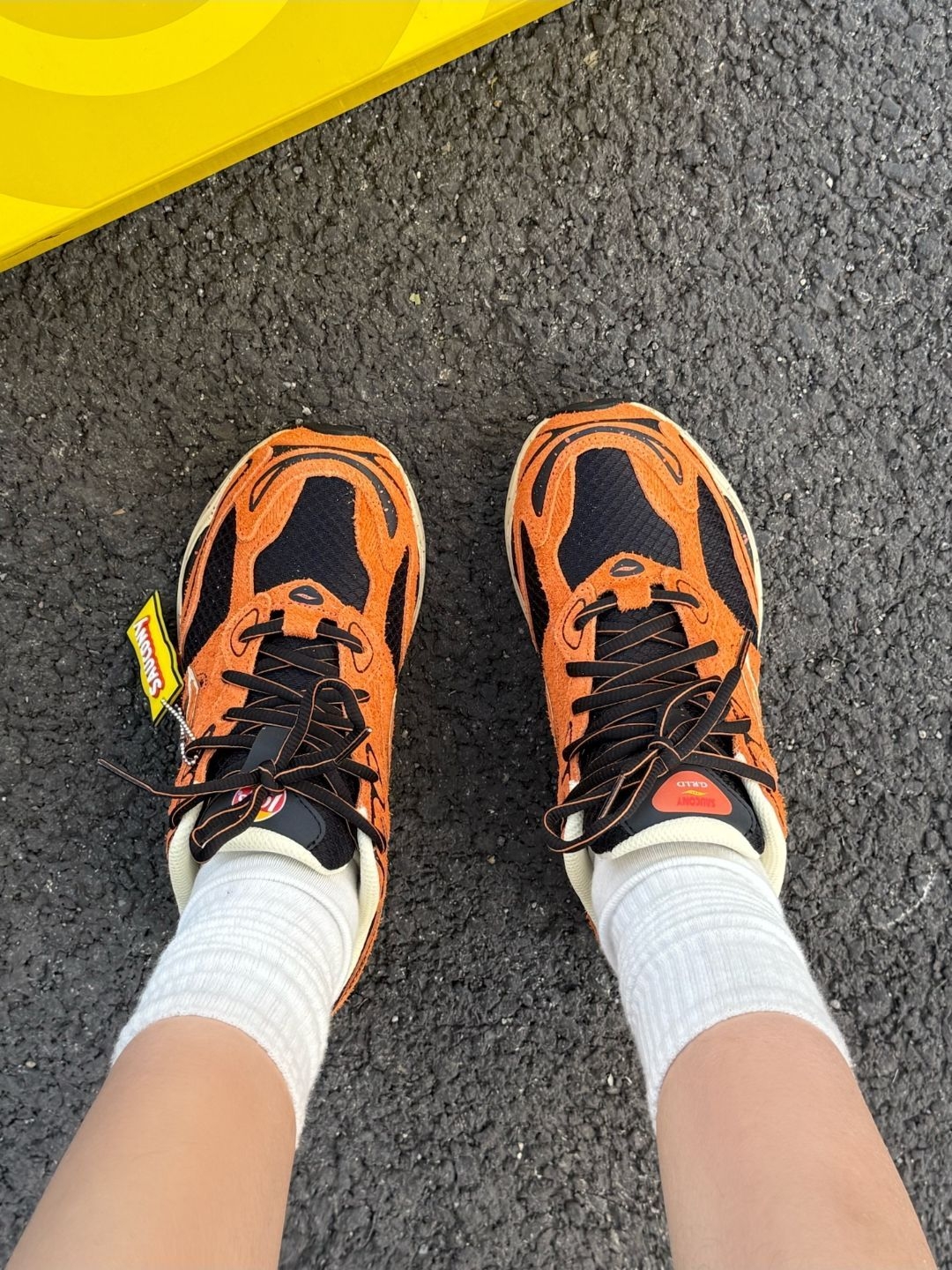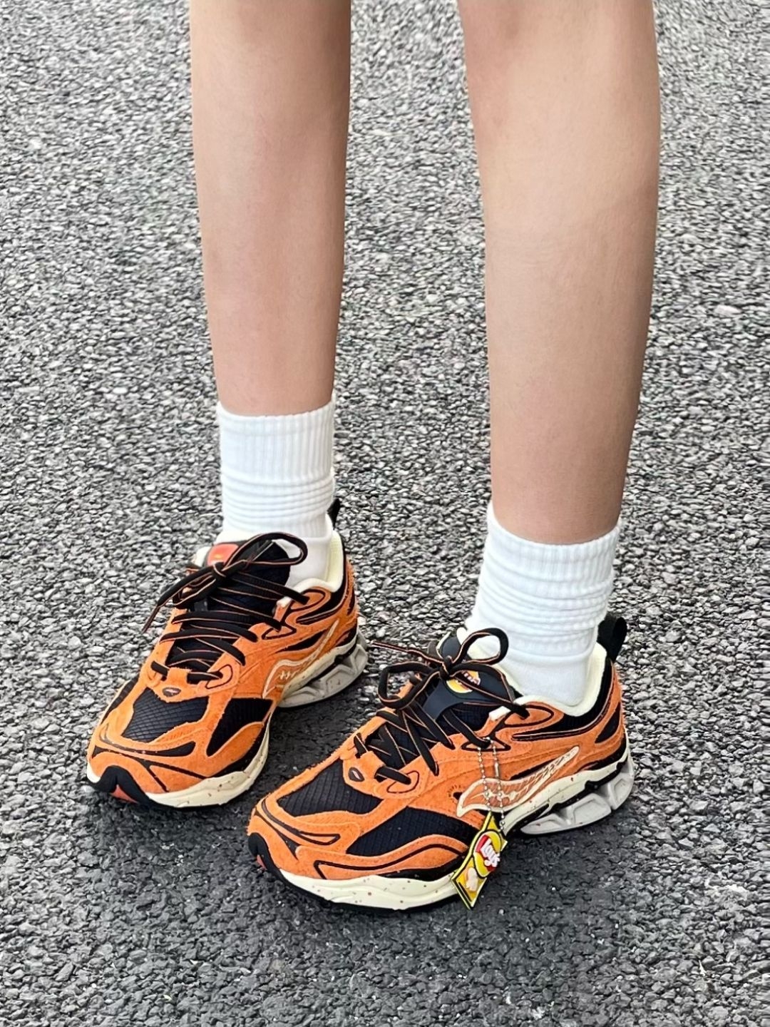 芜湖~没想到乐事跟跑鞋联名了耶 橙黑配色帅气又亮眼 鞋面翻毛皮材质拿在手里很有质感 鞋身还带有乐事的迷你挂件 整个鞋子细节和质感就蛮不错的 橡胶大底防滑耐磨 日常穿搭或者运动都ok