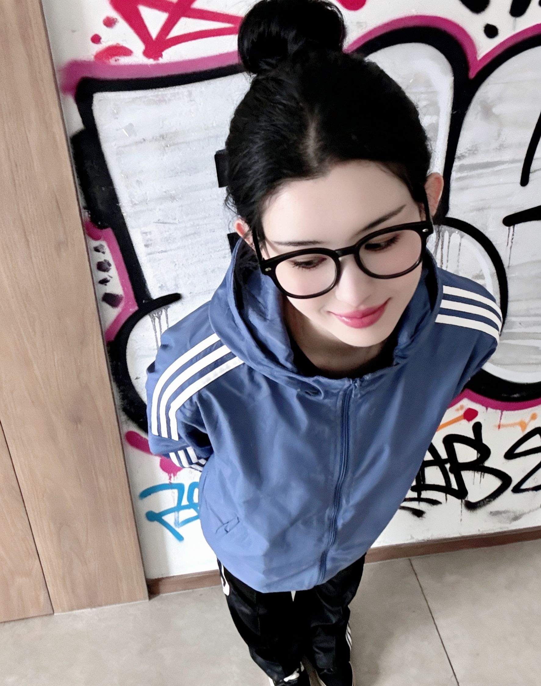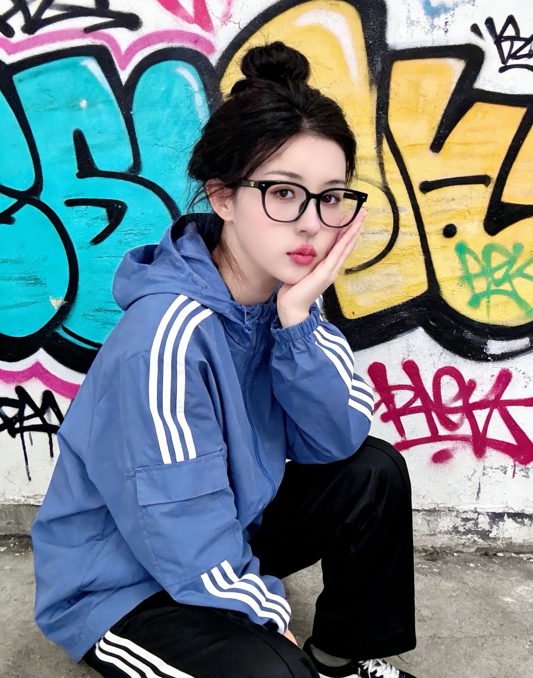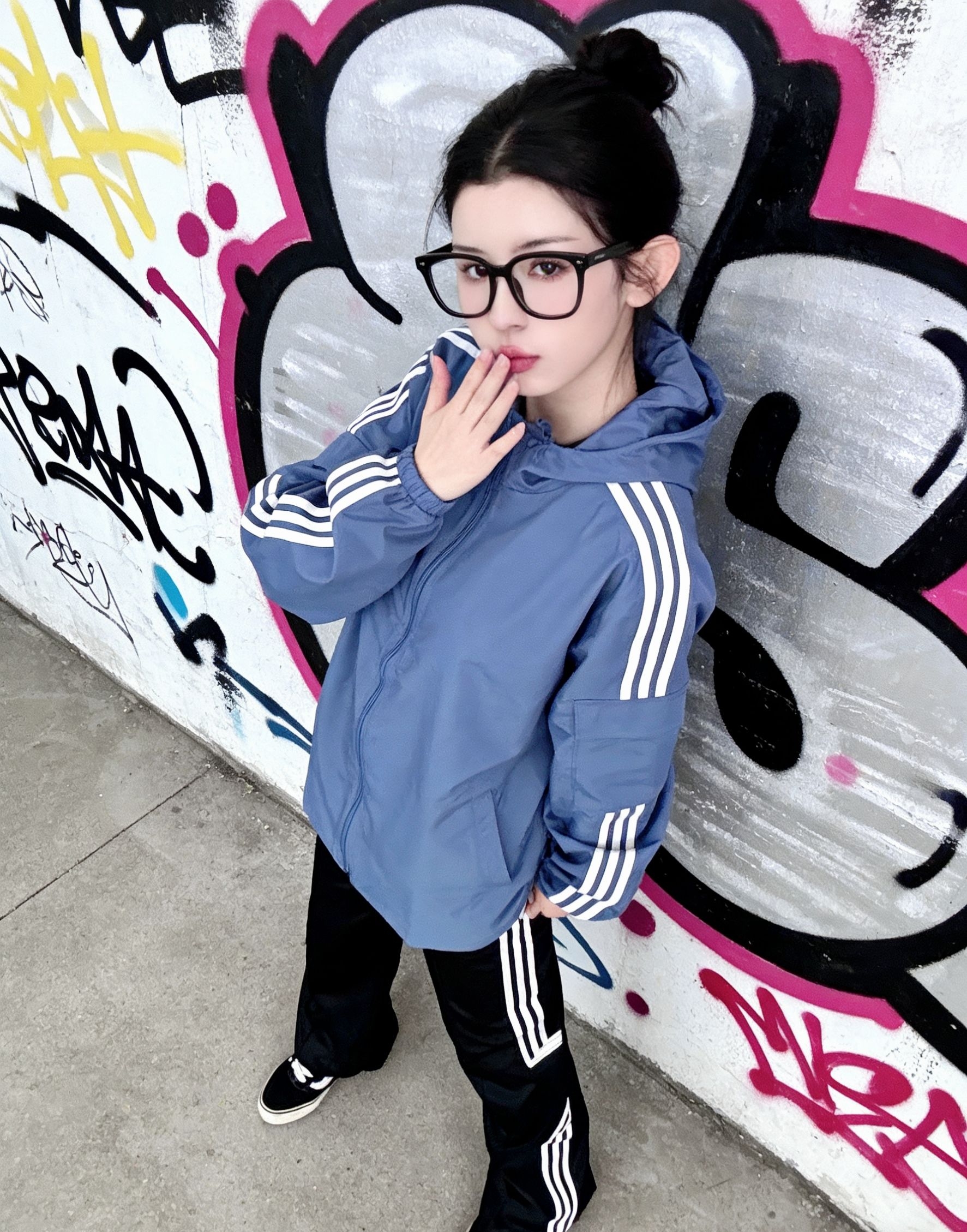 谁懂啊!这件蓝色连帽运动外套也太有少年感了😎 经典蓝白三条杠设计,复古运动风拉满 oversize版型藏肉又随性,搭黑裤子秒变街头酷妹 丸子头+黑框眼镜的搭配,甜酷平衡感直接拿捏👓 春日出街穿这套,走路都带风的程度🚶♀️
