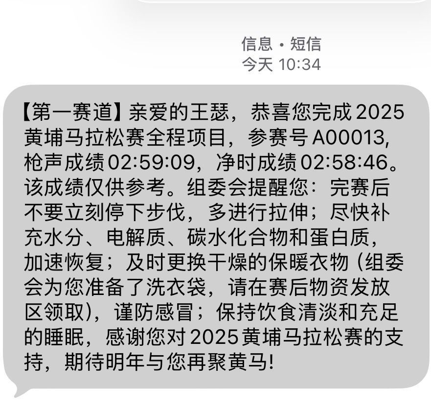 今年最后一场马拉松,目标是一列稳稳的破三列车,准时到站。 手臂上写满配速密码,每个5km核对一次。 当兔子的快乐,是把精密计算变成一群人的共同胜利。 亲眼见证好几位跑友首马破三,他们冲线时的激情和释然,让人触动。 黄埔体验很棒,赛道宽、补给足、能量胶管够! 终点是广式小吃嘉年华:烤乳猪、烧鸭、烧麦、皮蛋粥,唯运动和美食不可辜负~ 最暖的是家人在等候,2025 的奔跑以拥抱和热粥收官。 ...