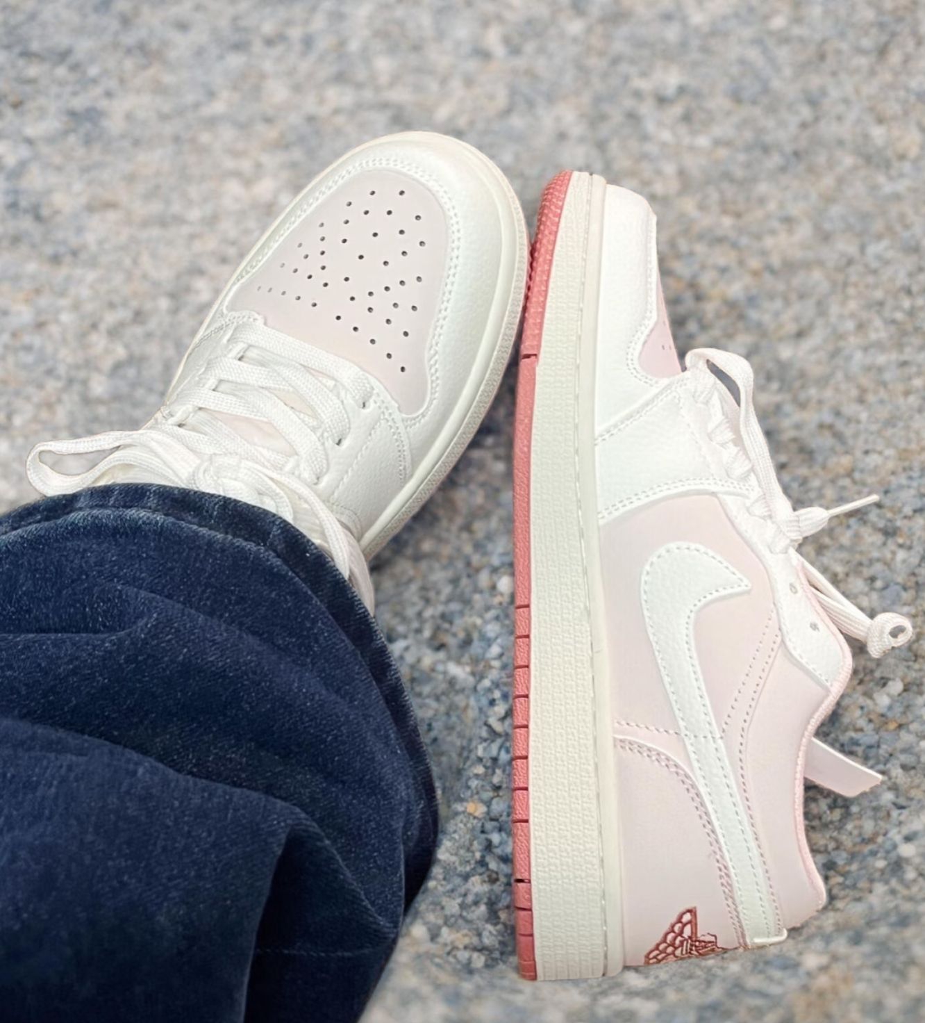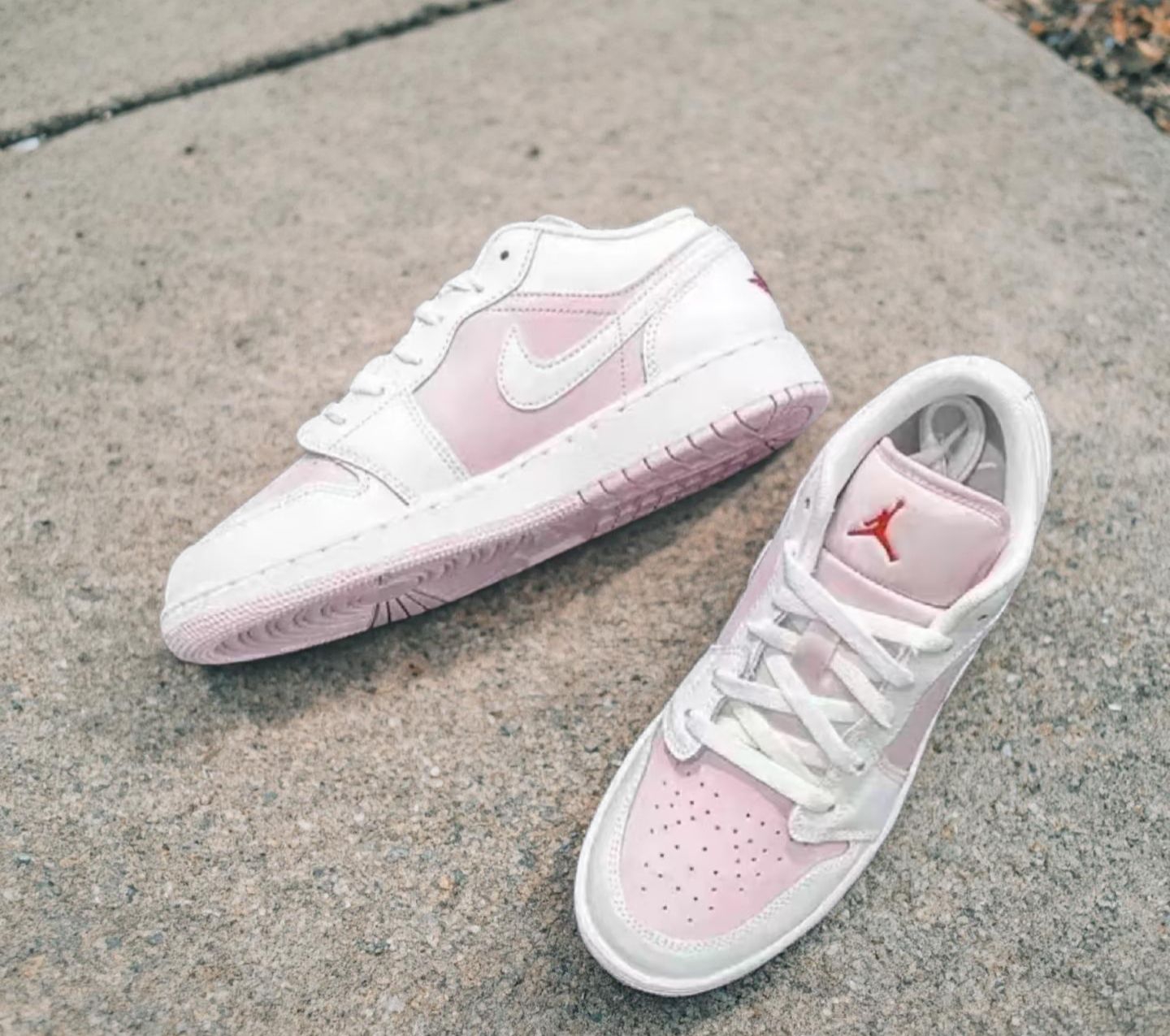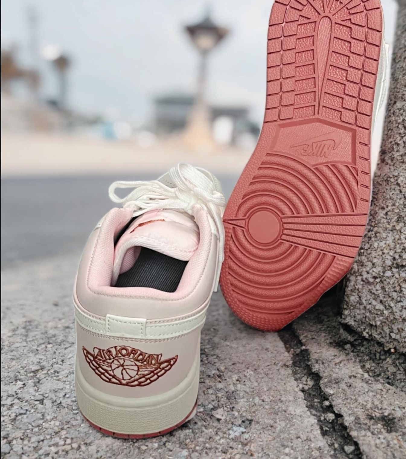 AJ1 Low 白粉配色开售 乔1低帮白粉色款,鞋身以淡雅粉皮质为主,白色框架覆盖层加持,简约配色却自带吸睛属性。鞋侧白色Swoosh Logo与鞋身线条碰撞,打造立体层次感;鞋舌、内衬全粉设计,搭配同色系Jumpman Logo和鞋带,细节处尽显品牌格调。后跟暗粉色Wings Logo低调又有辨识度,乳白色做旧中底+桃粉色大底,兼顾颜值与脚感,篮球文化与日常穿搭无缝衔接!