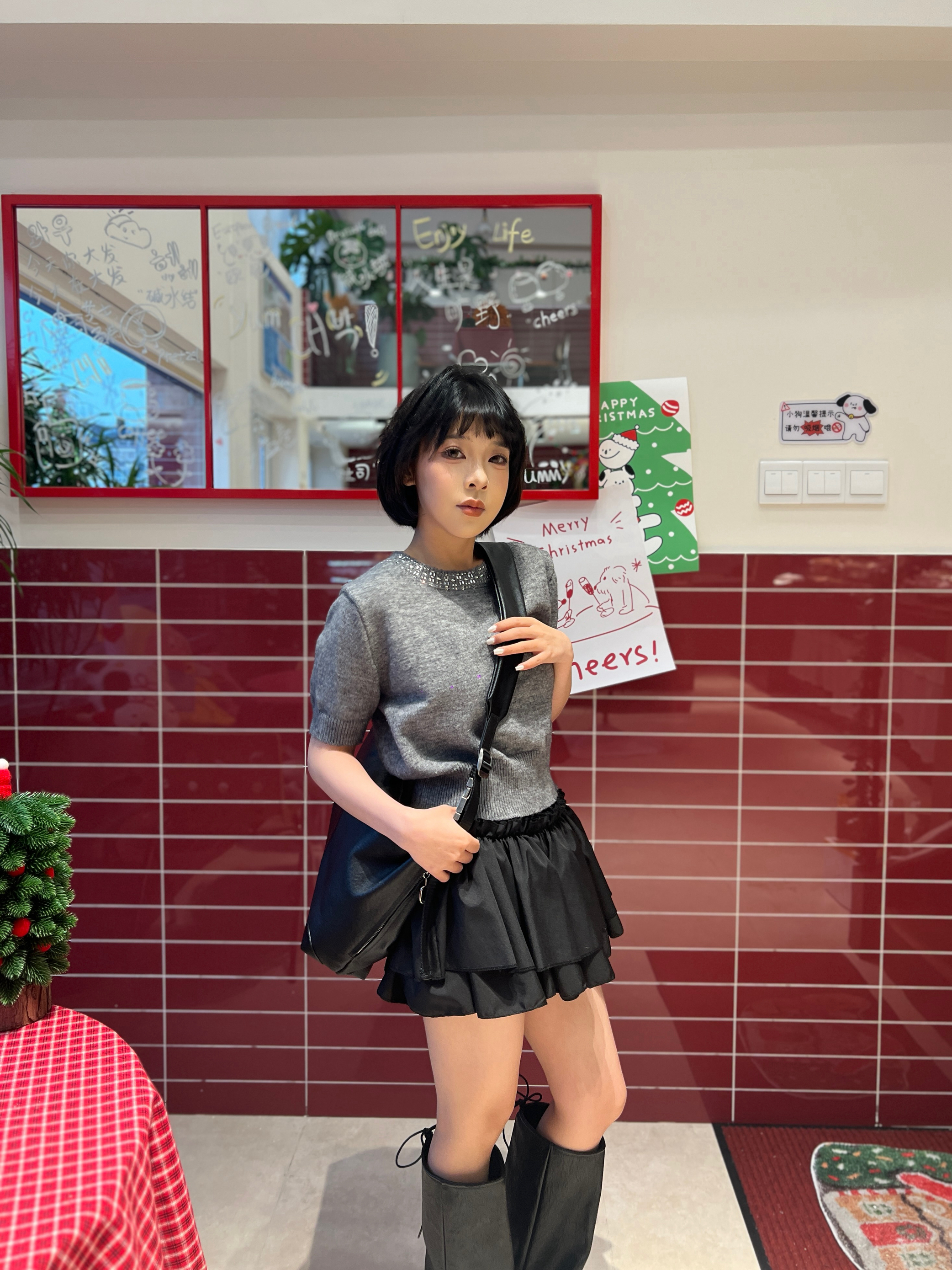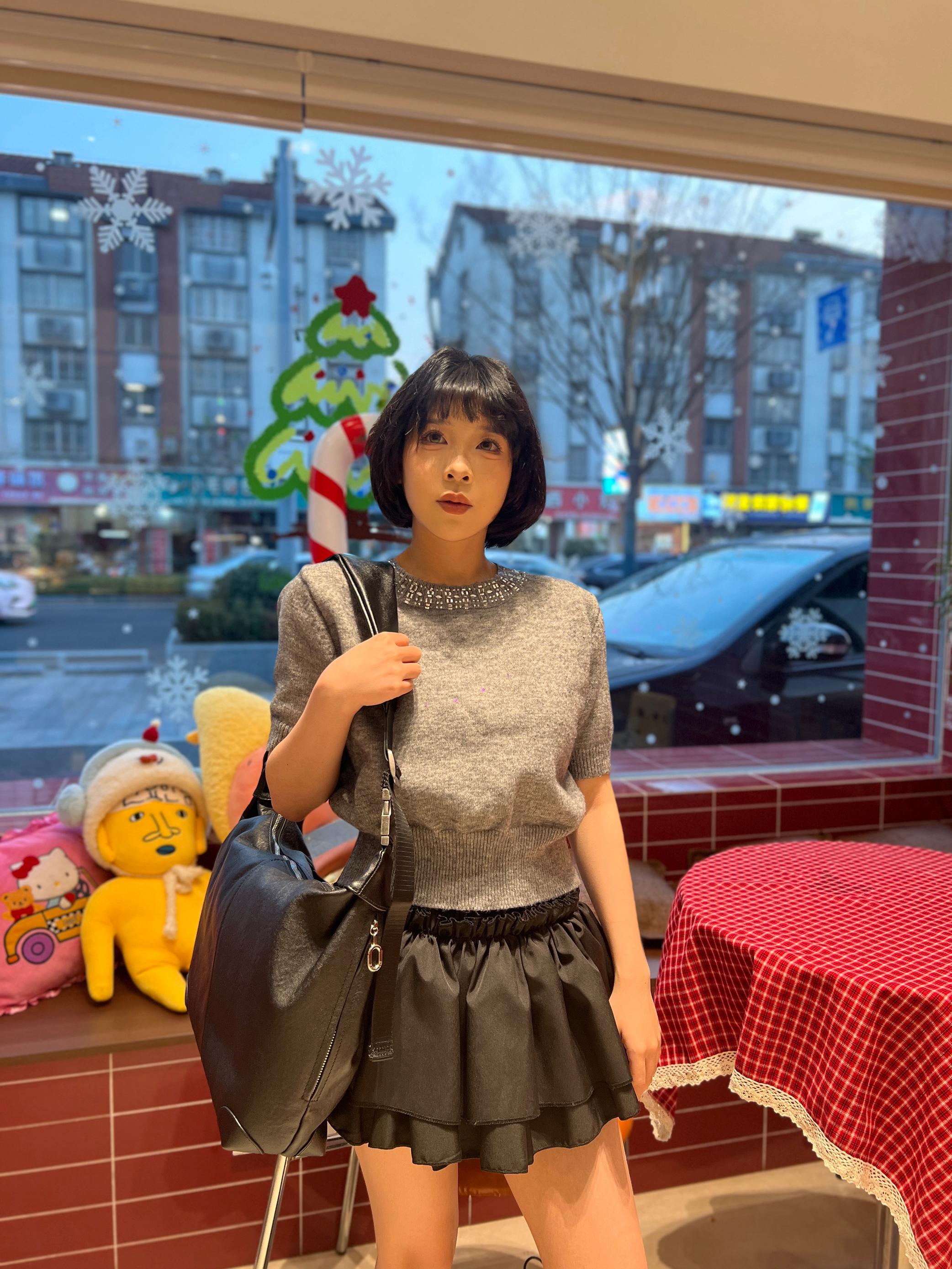 真的真的超有千金感的一件!!质感很好很好搭配!搭裙子也会很有千金感,但素最近有点小冷只能在室内穿 搭裤子的话其实单独搭牛仔裤就很韩很贵气很好看啦,搭屁帘单纯是加点层次感(其实也可以搭件打底在领口增加层次感的)