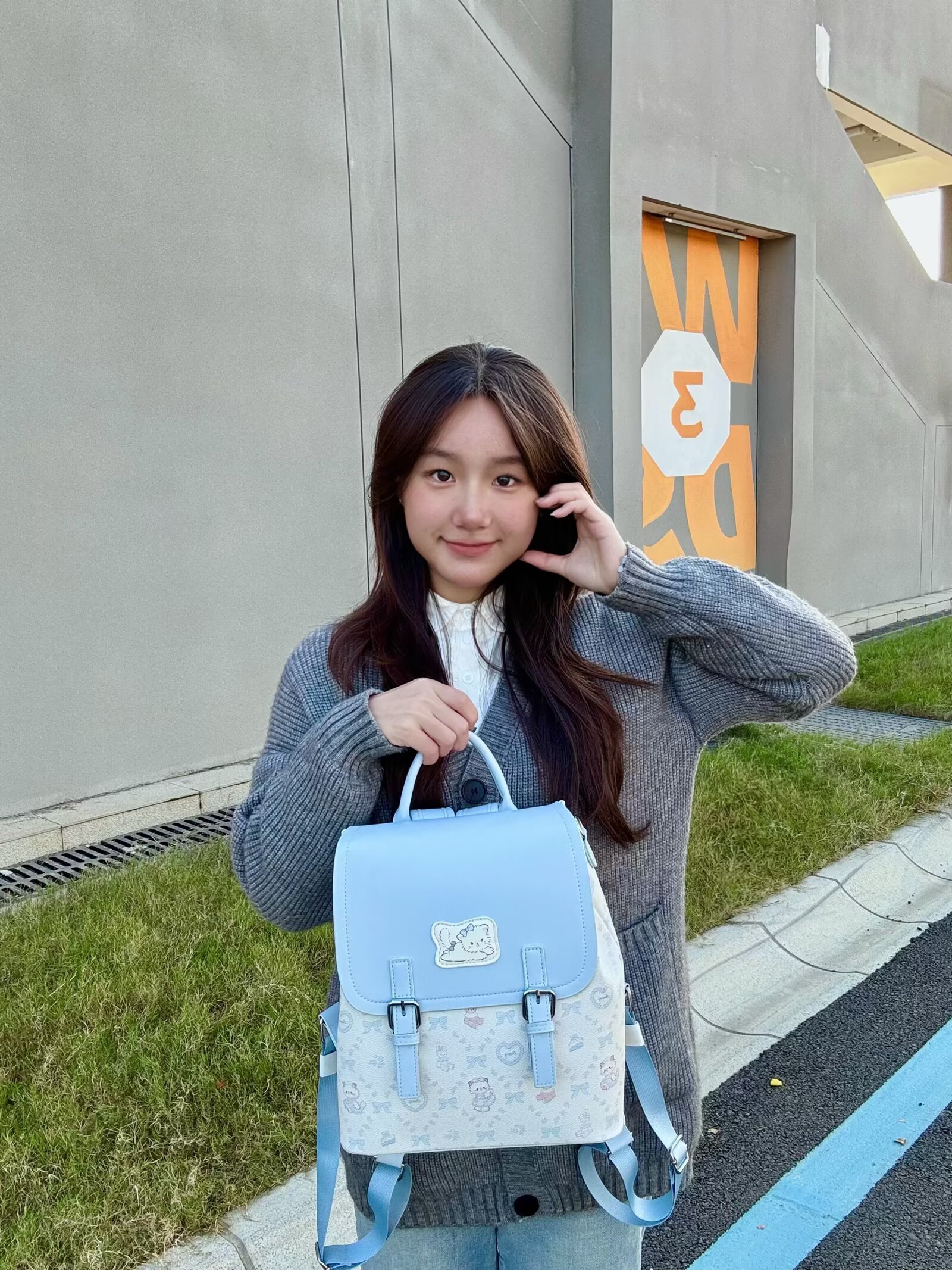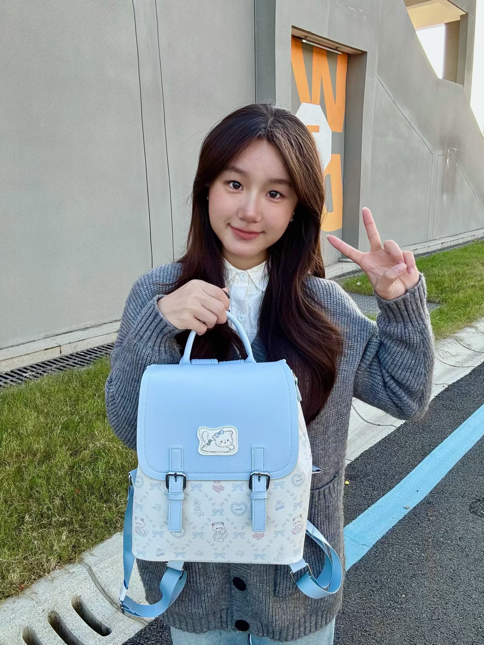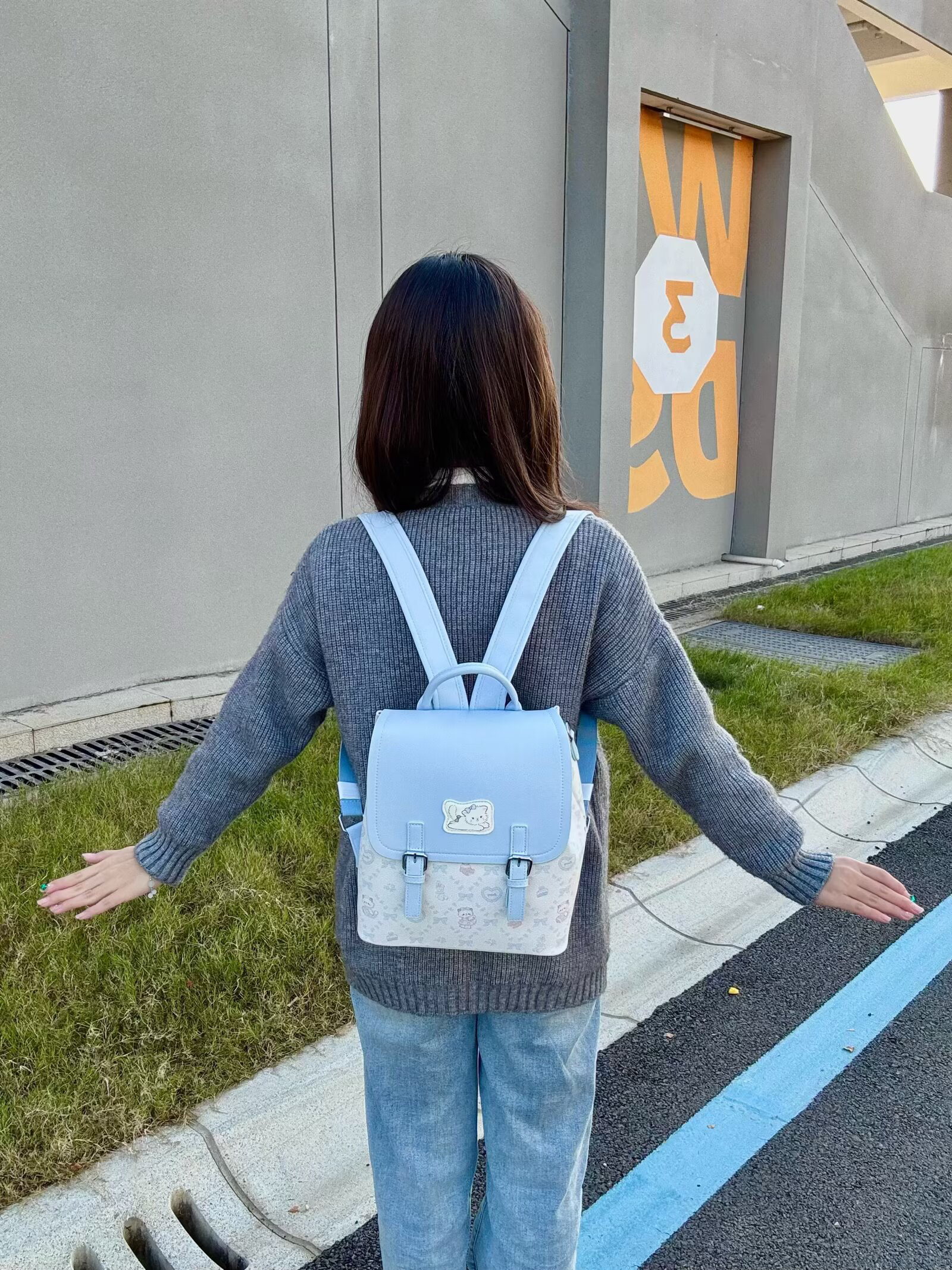 今天背双肩包~蓝白配色真的很好看呀,上面还有可爱的小动物印花和蝴蝶结元素,背在身上甜美感拉满🤩整体是皮革的面料,很硬挺背在身上也不会软塌变形~😆而且容量超大,装书和平板绰绰有余呢~☺️无论是早八通勤还是日常背出去玩都超合适!😉