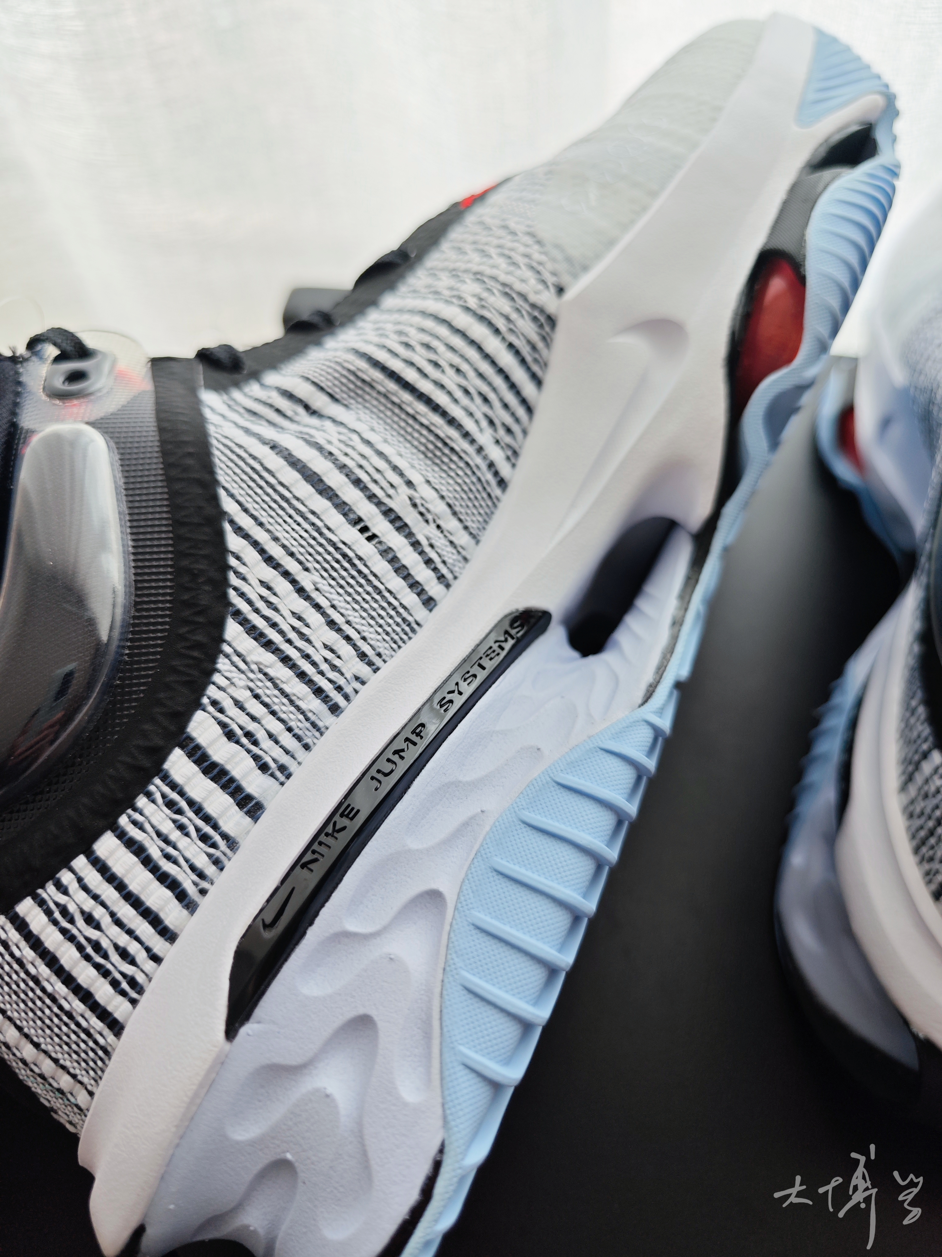 这双2代jump 我个人感觉更像勒布朗19的延续款式 后跟的react的加入和前面并排双气垫 是和一代截然不同的缓震设计 后跟像跑鞋,前面像训练鞋 抽出鞋垫,能看到zoom 脚心位置zoom是透光的 鞋帮低了许多 鞋领那几个小气囊真的太有 勒布朗19的味道了