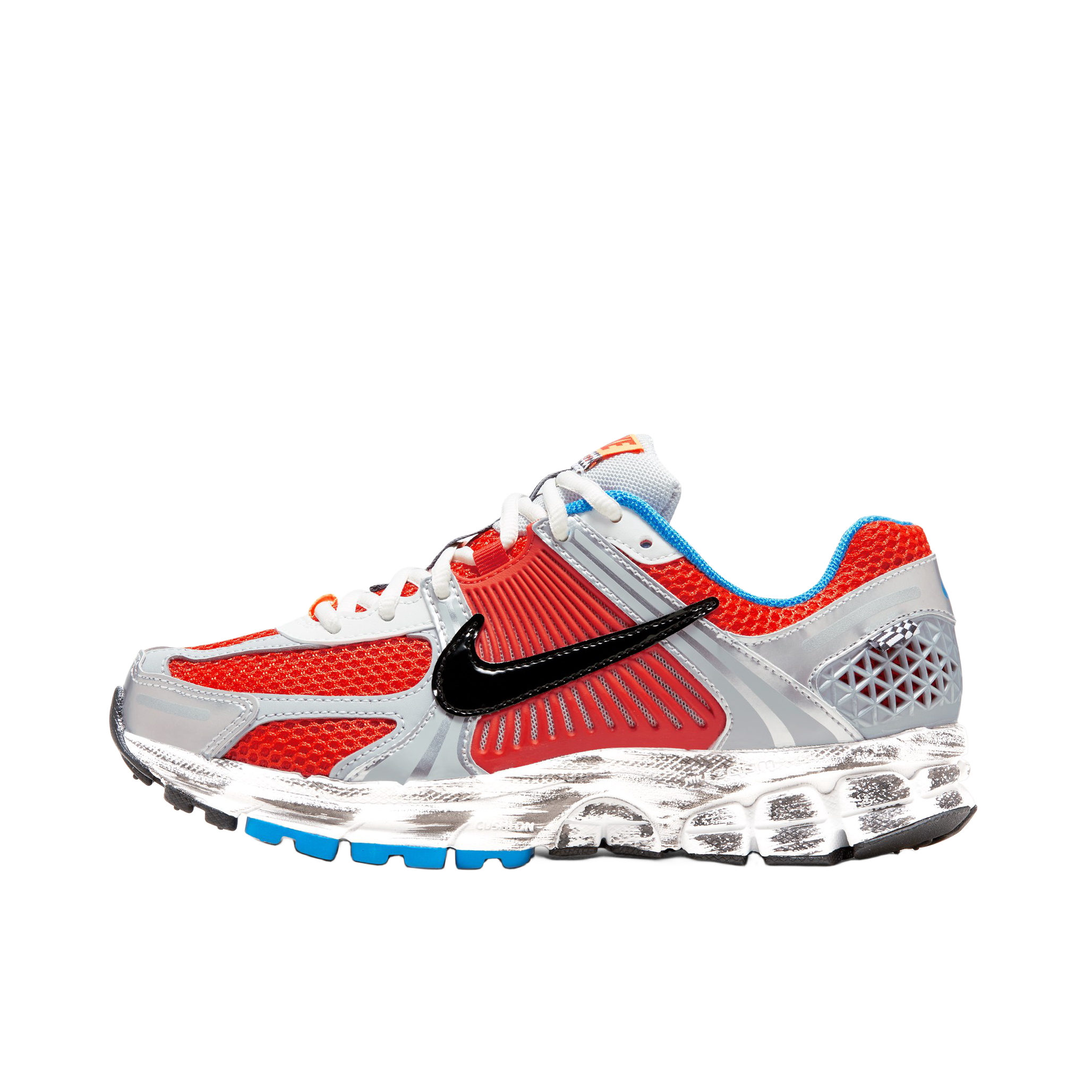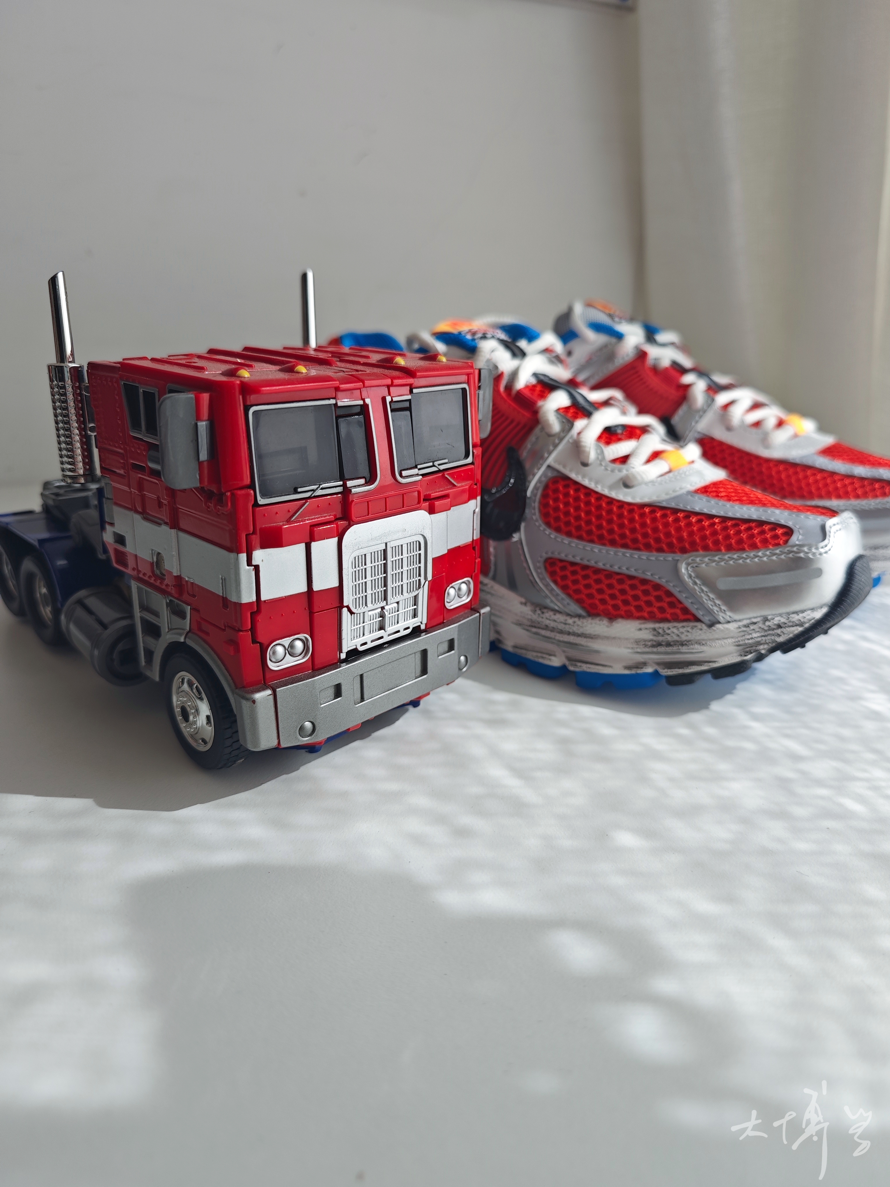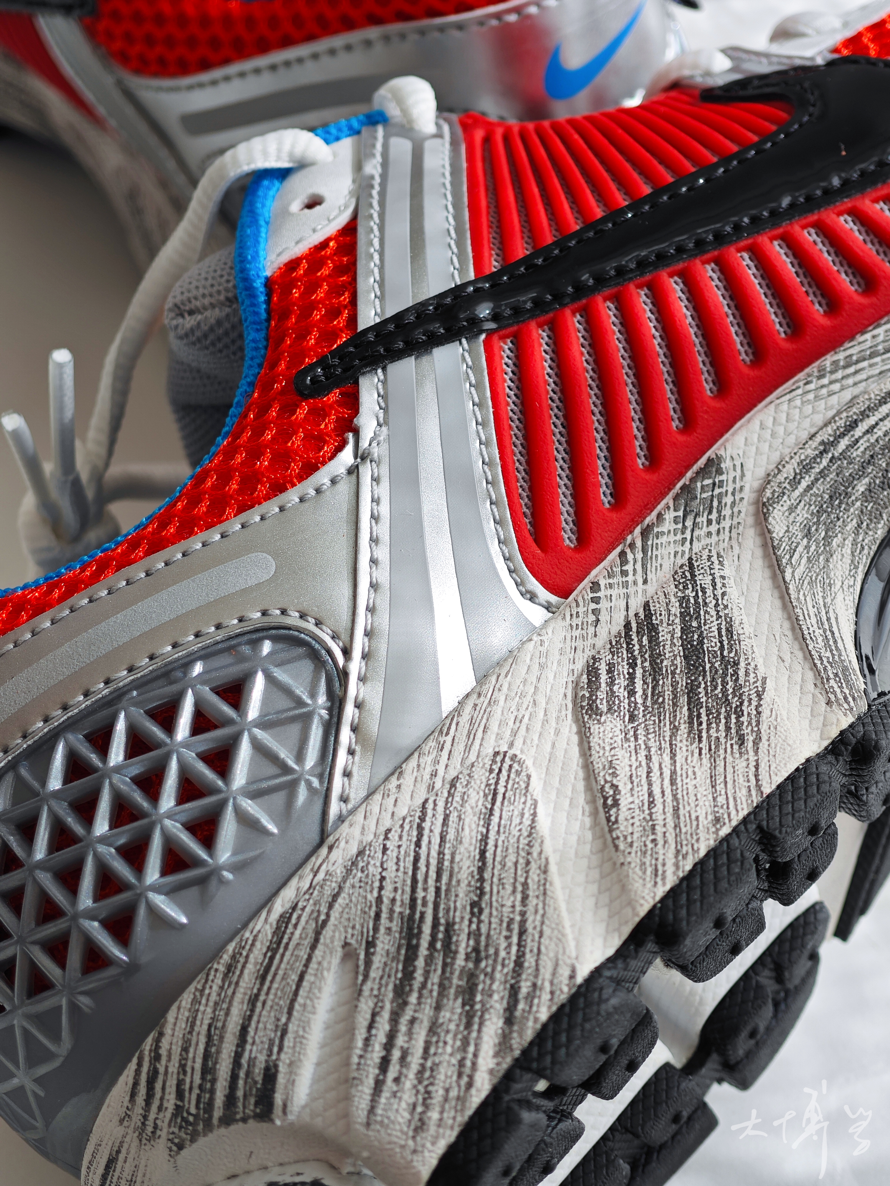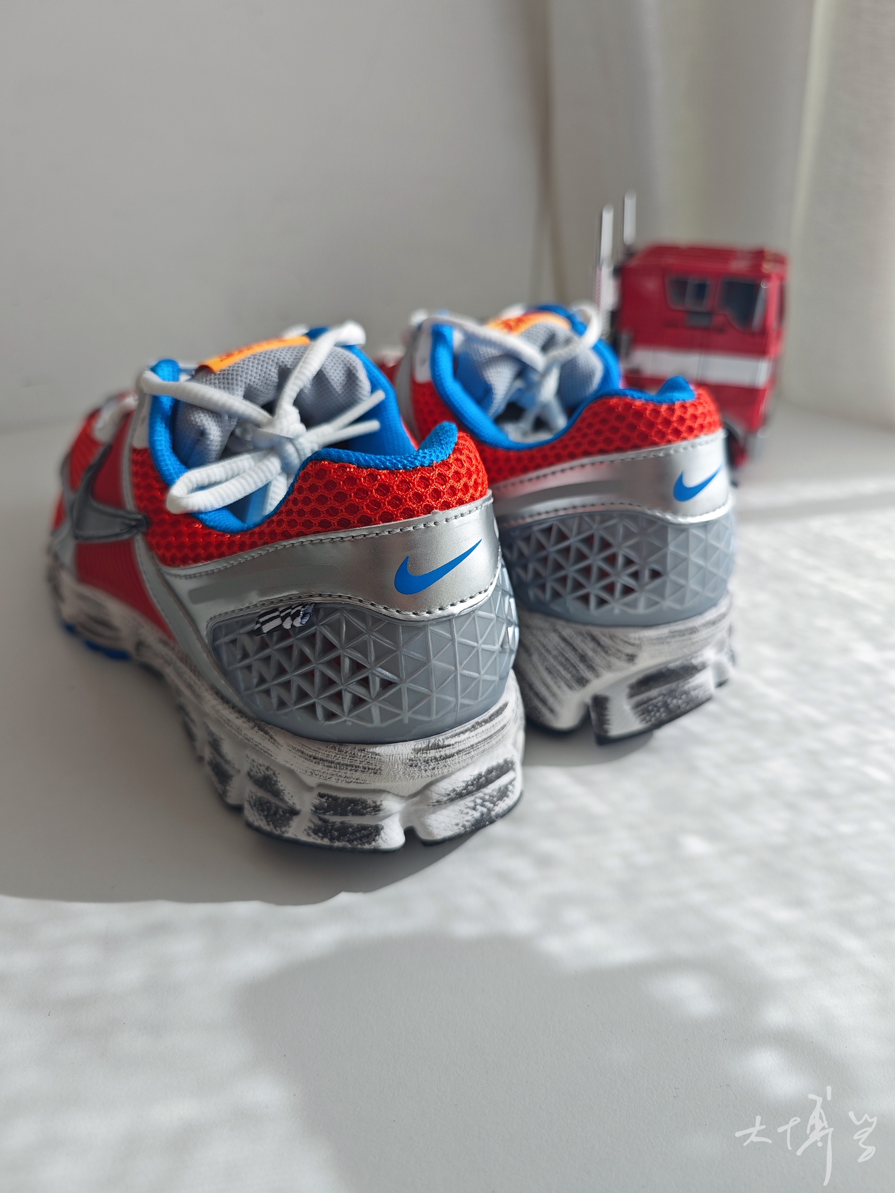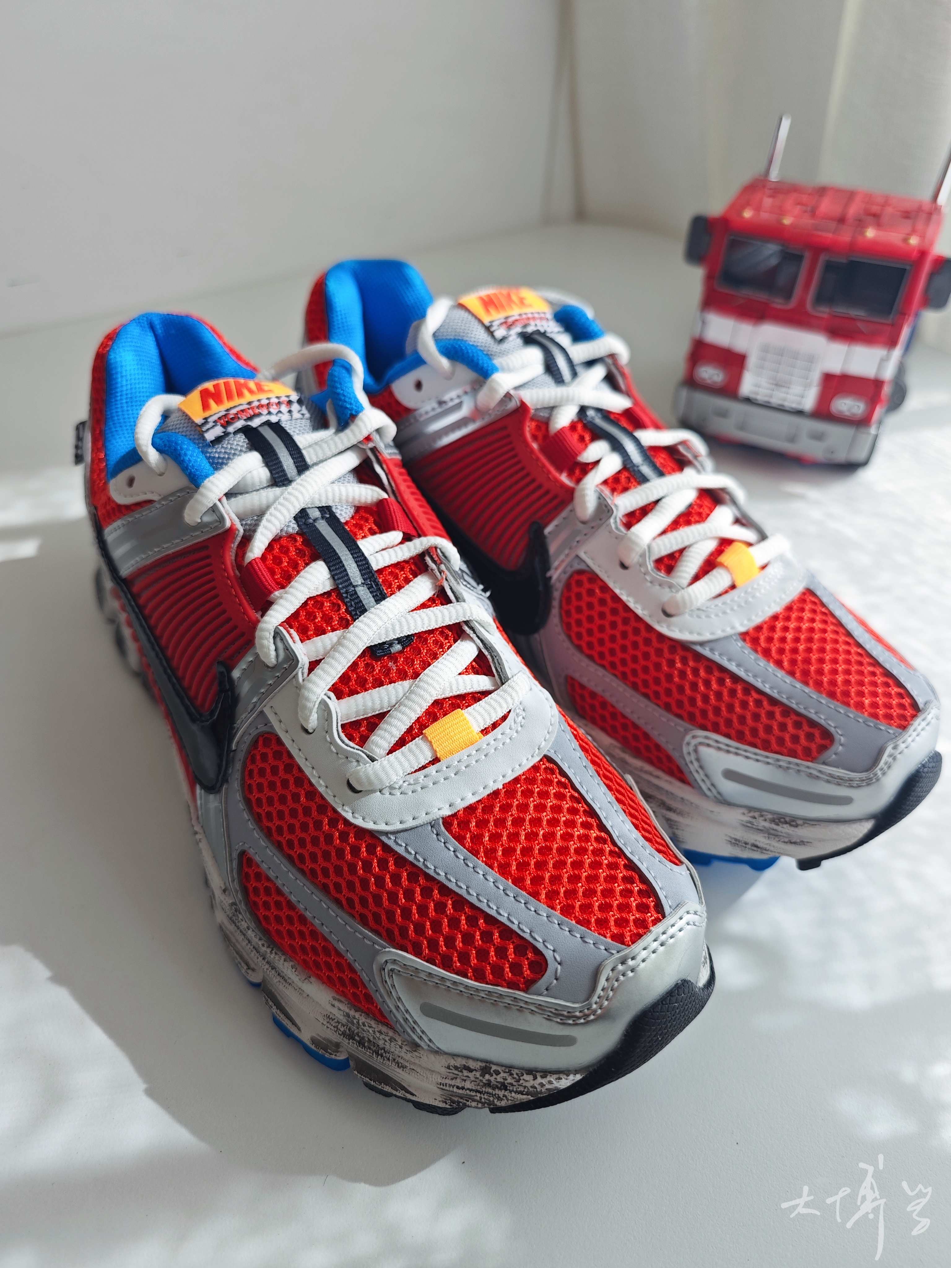 一个经典的配色 红蓝总会让我想起擎天柱 银色的塑料件点缀 还有中底的做旧处理 都像是柱子哥刚刚讨伐威震天归来 复古的鞋型,加上前后zoom气垫 虽是女鞋,但尺码包含大码 我很喜欢这双鞋的脚感 更喜欢这款配色