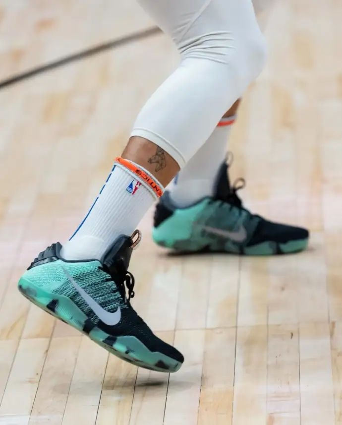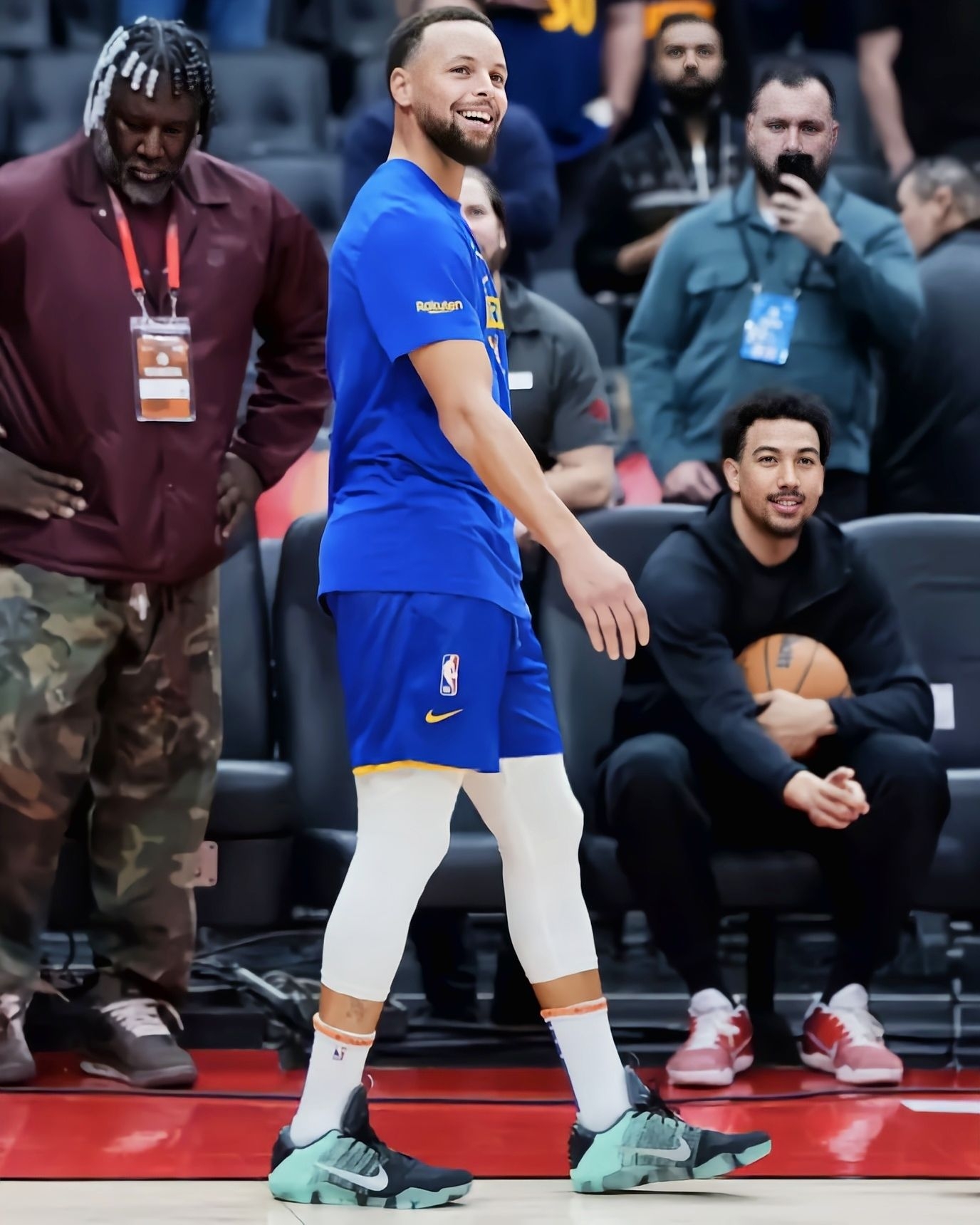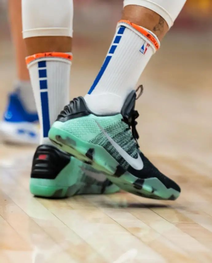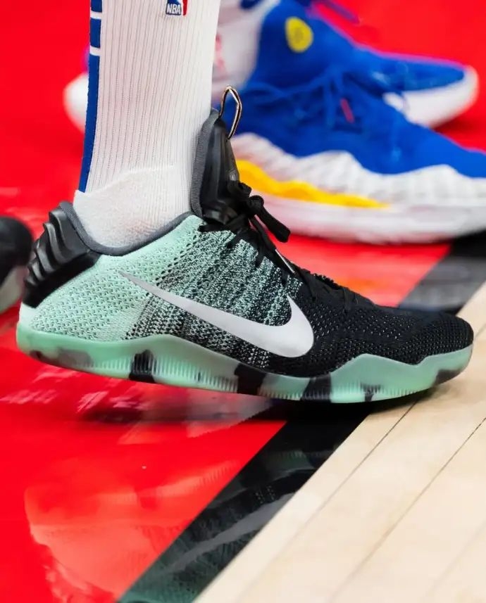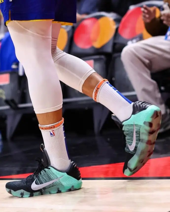 今天看勇士客场打猛龙的比赛,一眼就被库里脚上的鞋勾住了——是Nike kobe11 Elite Low的全明星配色,瞬间就想起2016年多伦多全明星赛,那是科比的全明星谢幕战,当时他就是踩着这双鞋站在球场上的。 库里这波上脚真的太有情怀了,多伦多的球馆好像一下就把人拉回九年前,科比挥手致意的画面还历历在目,而如今库里穿着同款配色,像是一种传承,也像是对传奇的致敬。 球鞋的黑绿配色在球场上特...