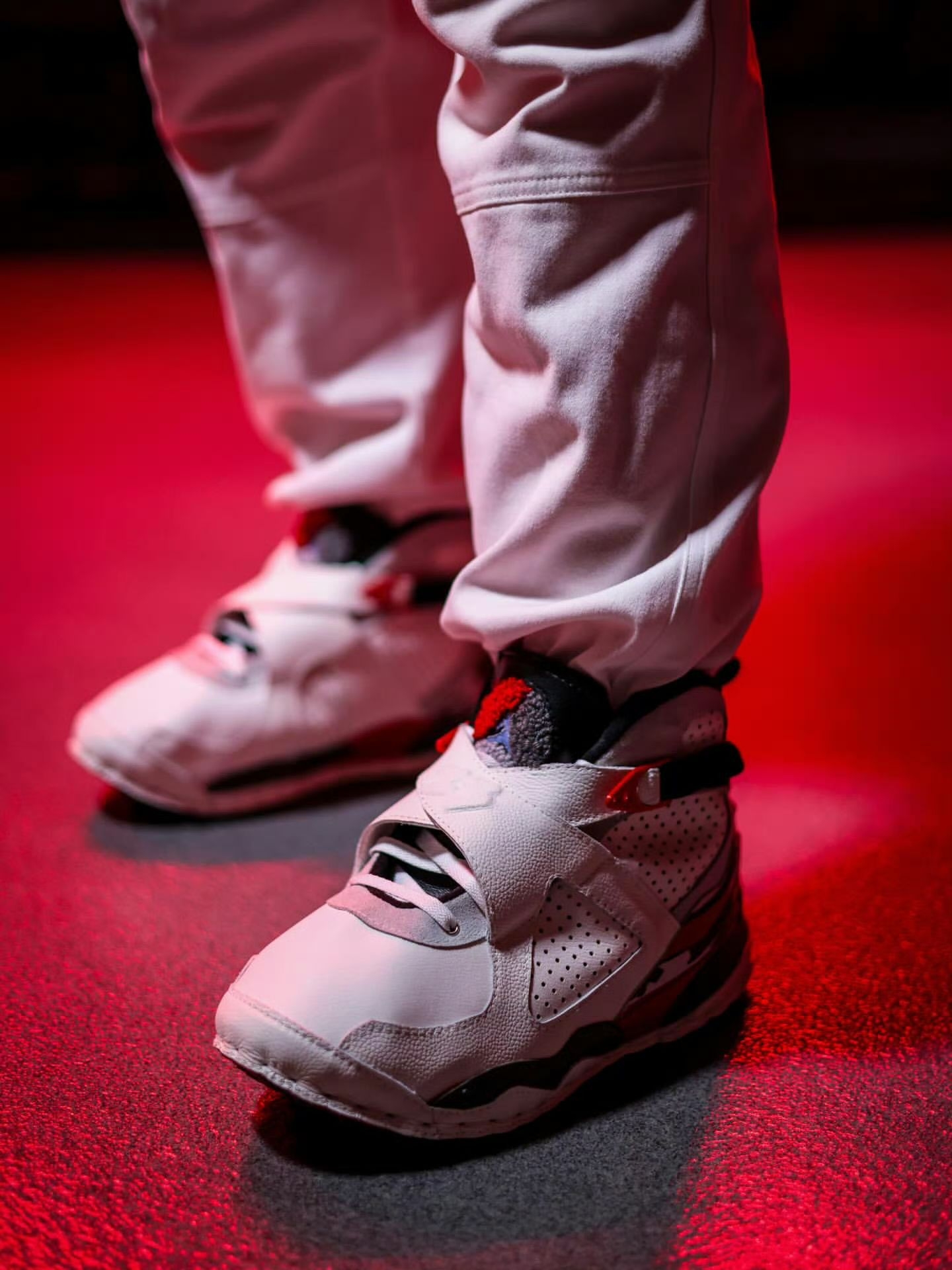 在球员通道撞见芝加哥公牛吉祥物Benny的入场镜头,目光直接被他脚上这双手工版AJ8勾走了。 红光照亮的通道里,白红配色的鞋身和公牛队的视觉风格撞个正着,手工打造的皮质在灯光下透着细腻的质感,鞋舌处兔八哥的小彩蛋还藏着《空中大灌篮》的情怀。 看着Benny迈着步子走过通道,球鞋和吉祥物的搭配把赛场的氛围感拉满,原来一双有故事的鞋,能让入场的瞬间都变得这么有味道。