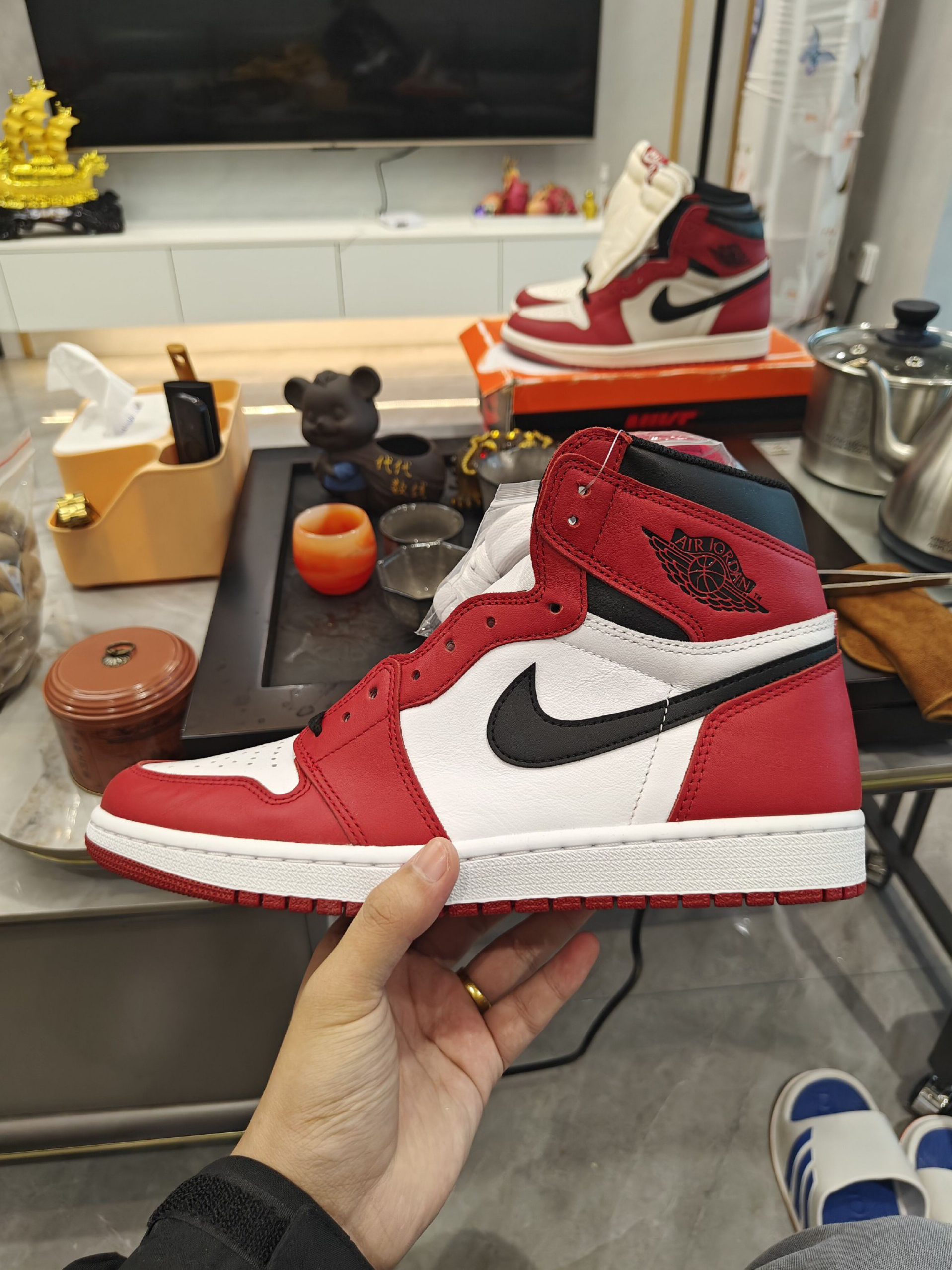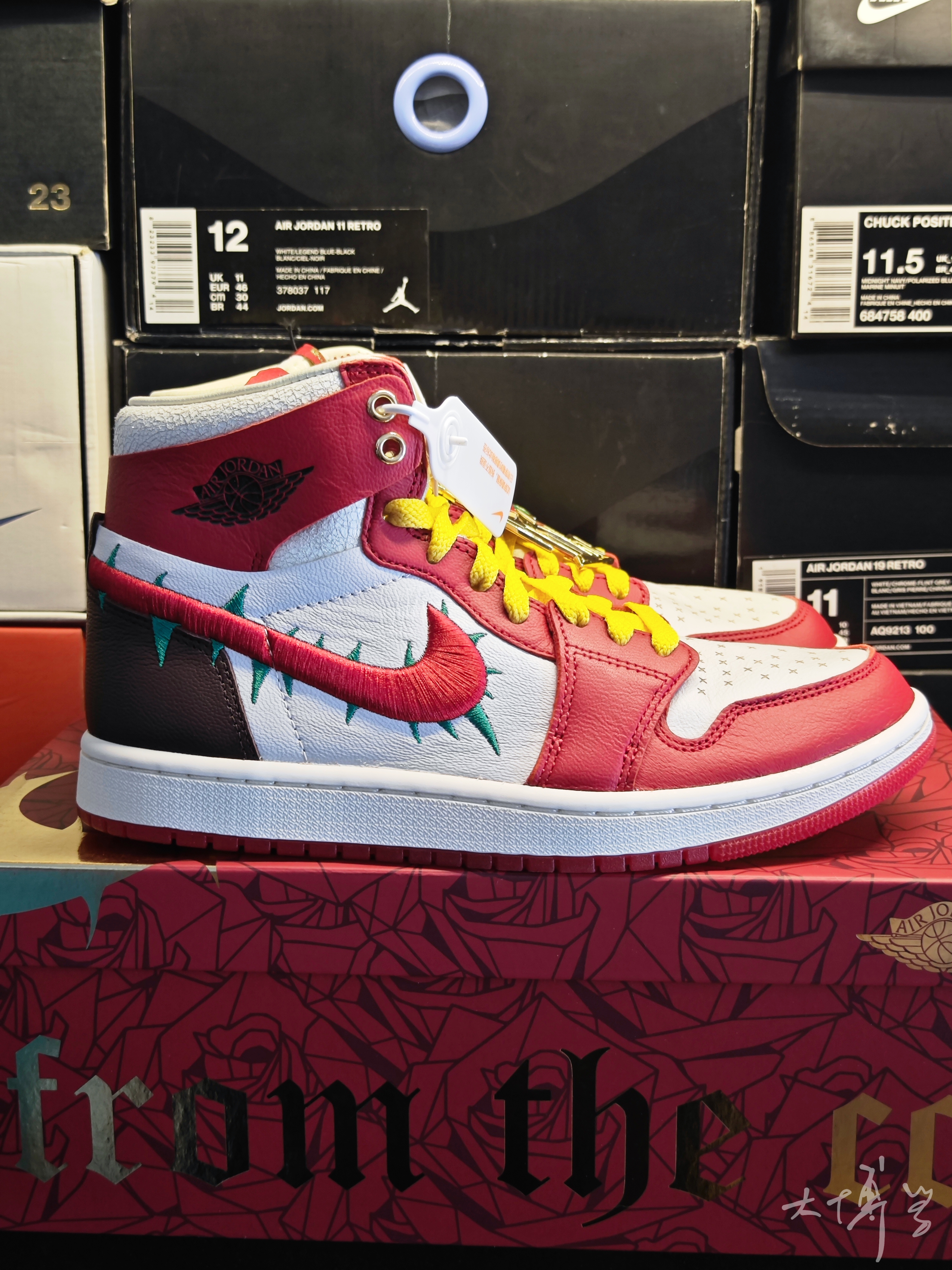 这是一双联名AJ 1 严格来说,这是AJ 1的2代cmft鞋型 算是AJ 1的衍生款 鞋领,鞋底都和传统AJ 1有很大变化 最主要是这款带有zoom 暂且称之为AJ 1,因为这款设计的“无敌”了 鞋身小细节超多,两只鞋还是鸳鸯设计 左右花纹并不对称 做工也不错