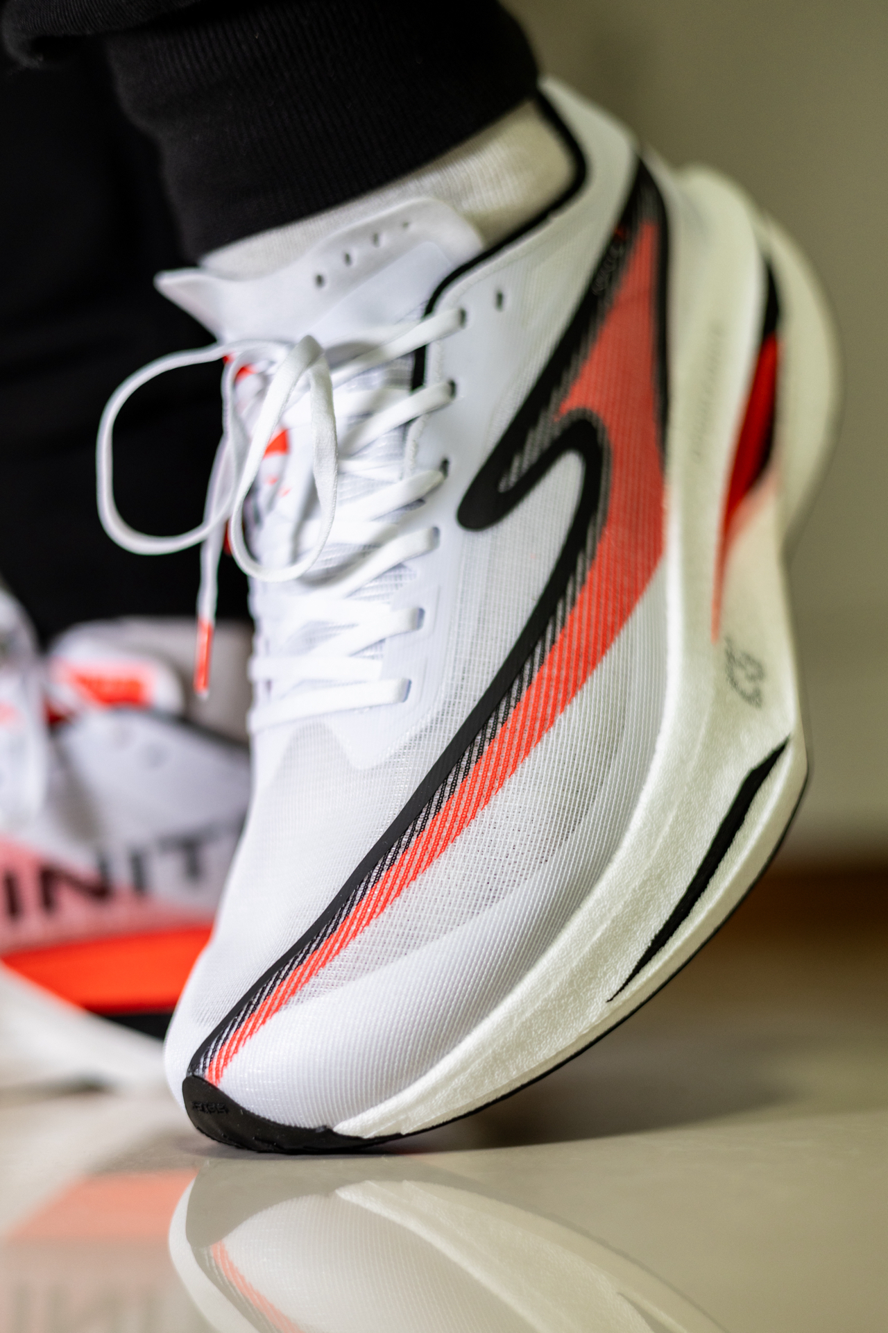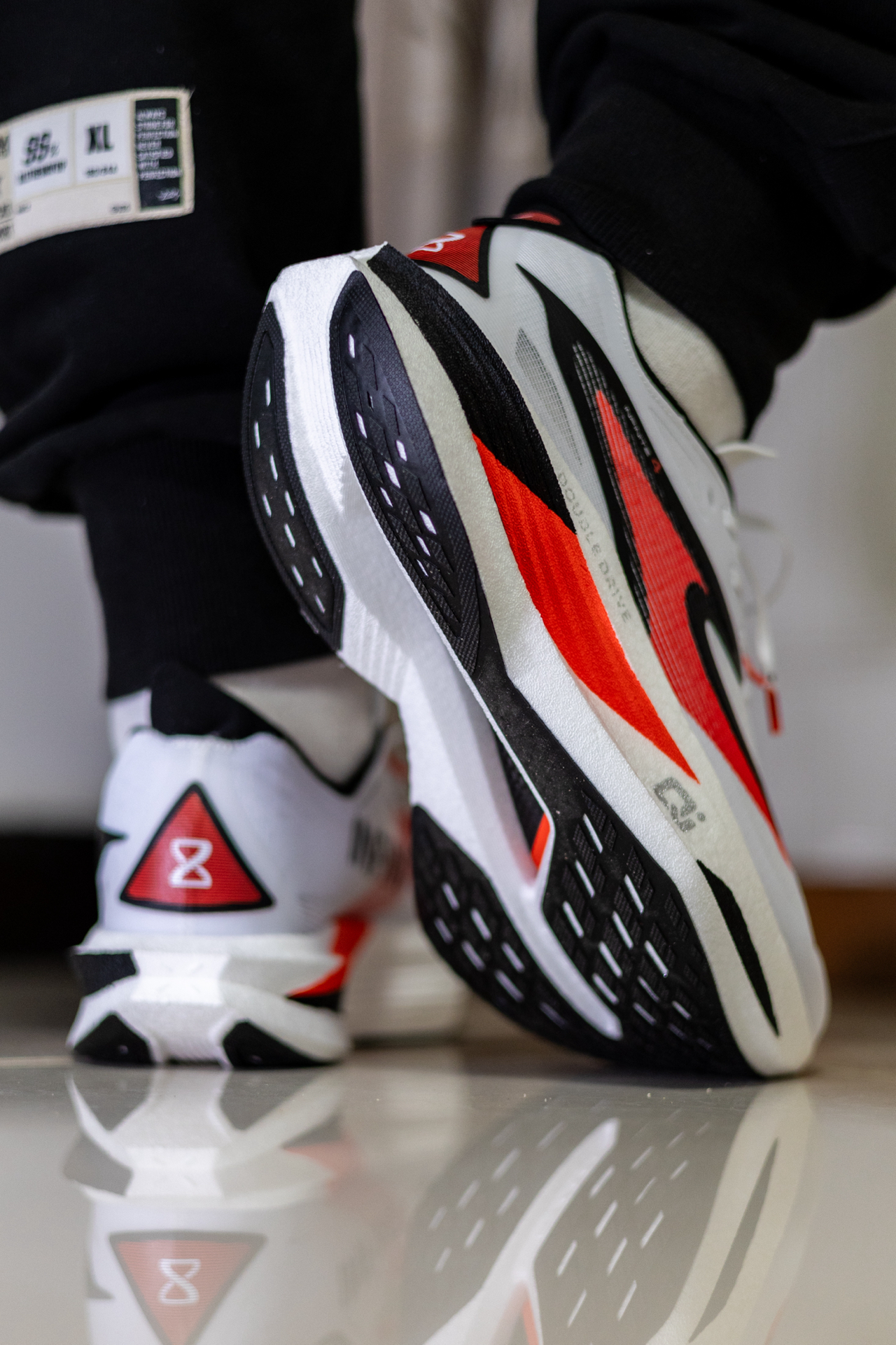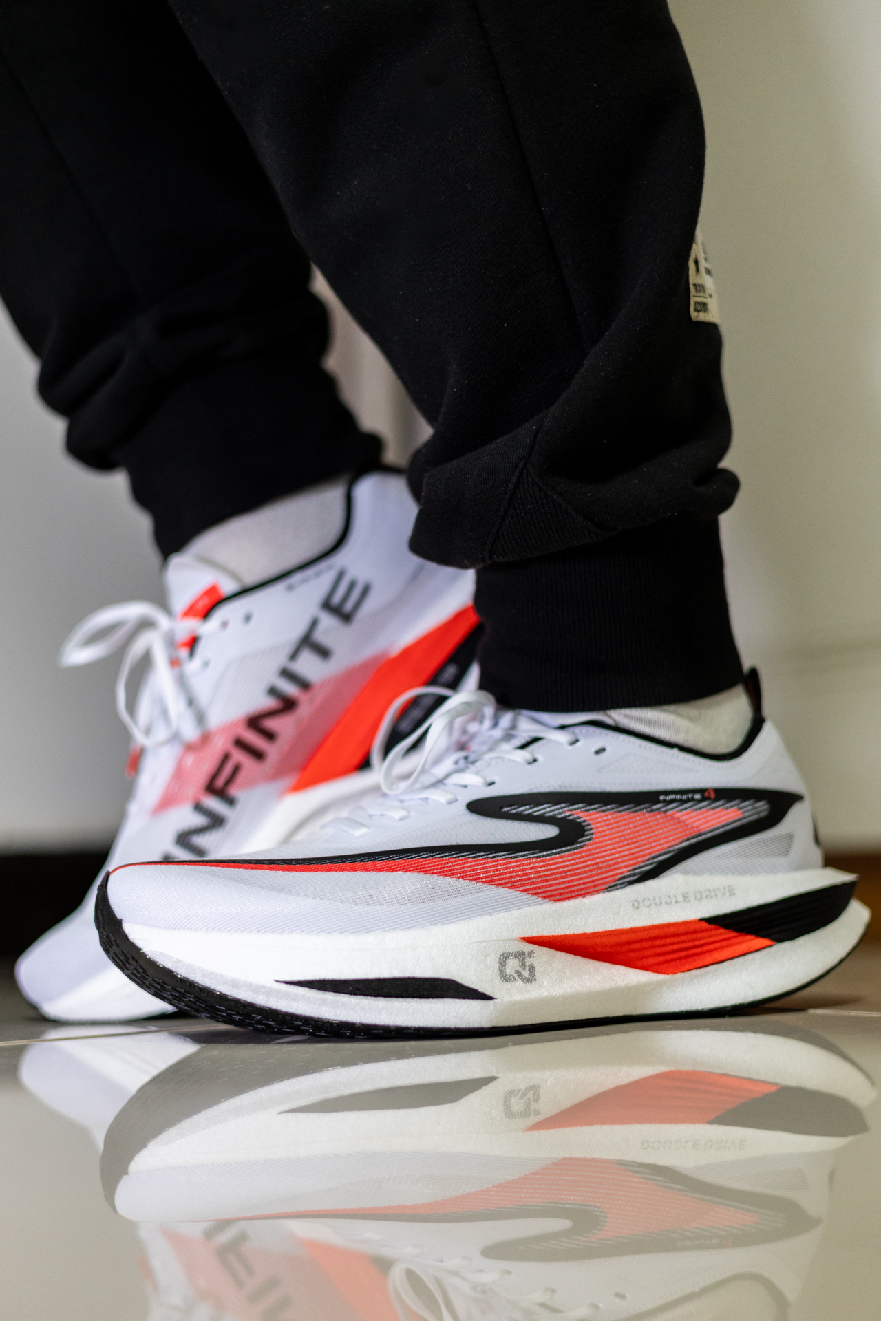 芷境4红白黑的撞色设计直接戳中了我,不是那种花里胡哨的配色,而是简约又有运动感的视觉冲击,鞋侧的流线型线条加上“INFINITE”的字样,往脚上一套,哪怕不跑步,日常搭运动裤出门也超吸睛。 我本来还担心这种竞速风格的跑鞋会偏硬,结果上脚的瞬间就被打脸了,鞋楦的包裹感刚刚好,不挤脚也不晃脚,脚背处的网面材质软软的,真正的惊喜是跑起来的脚感。起步的那一刻,能明显感觉到鞋底的双层炁科技在发力,不是那种...