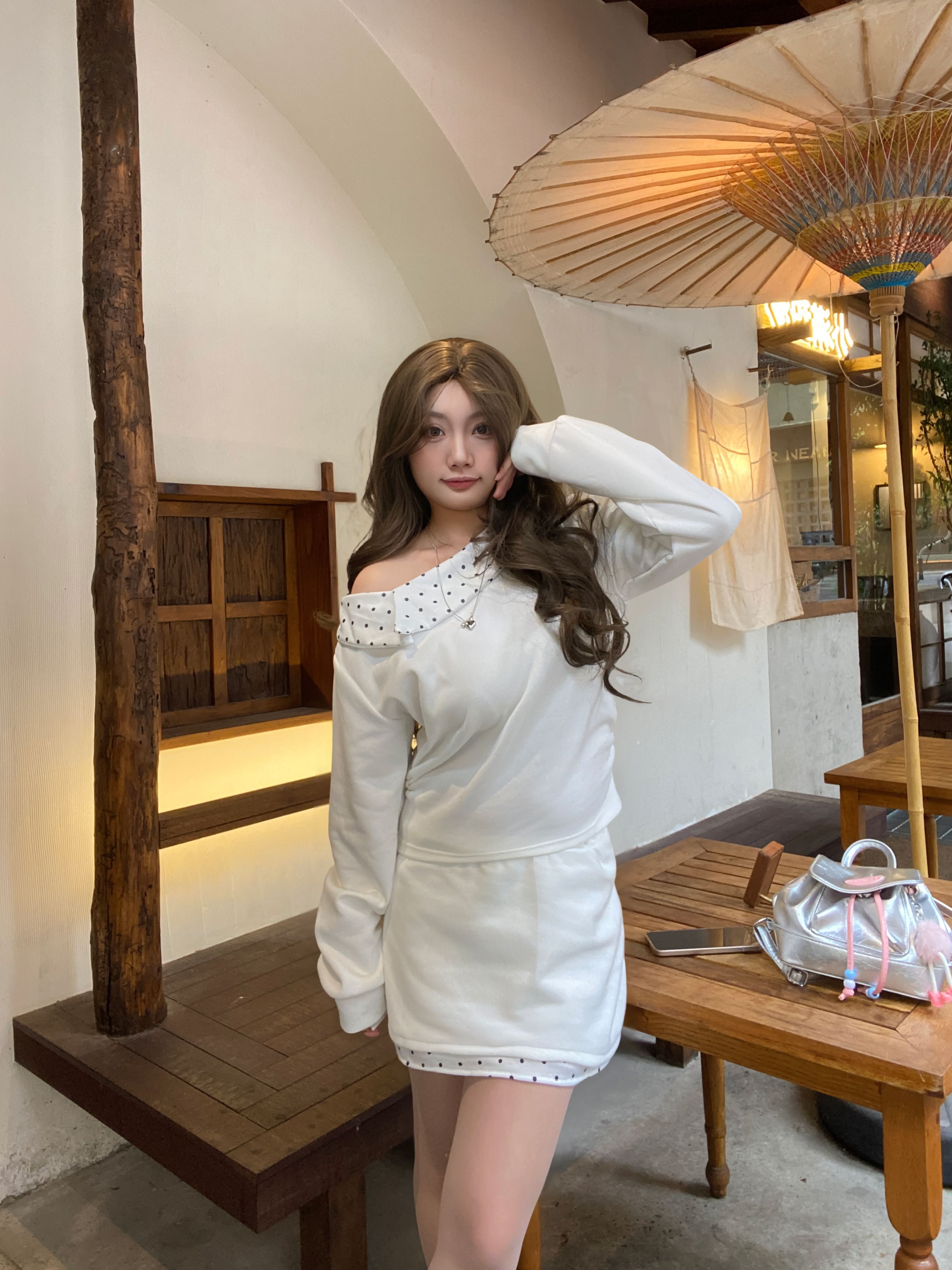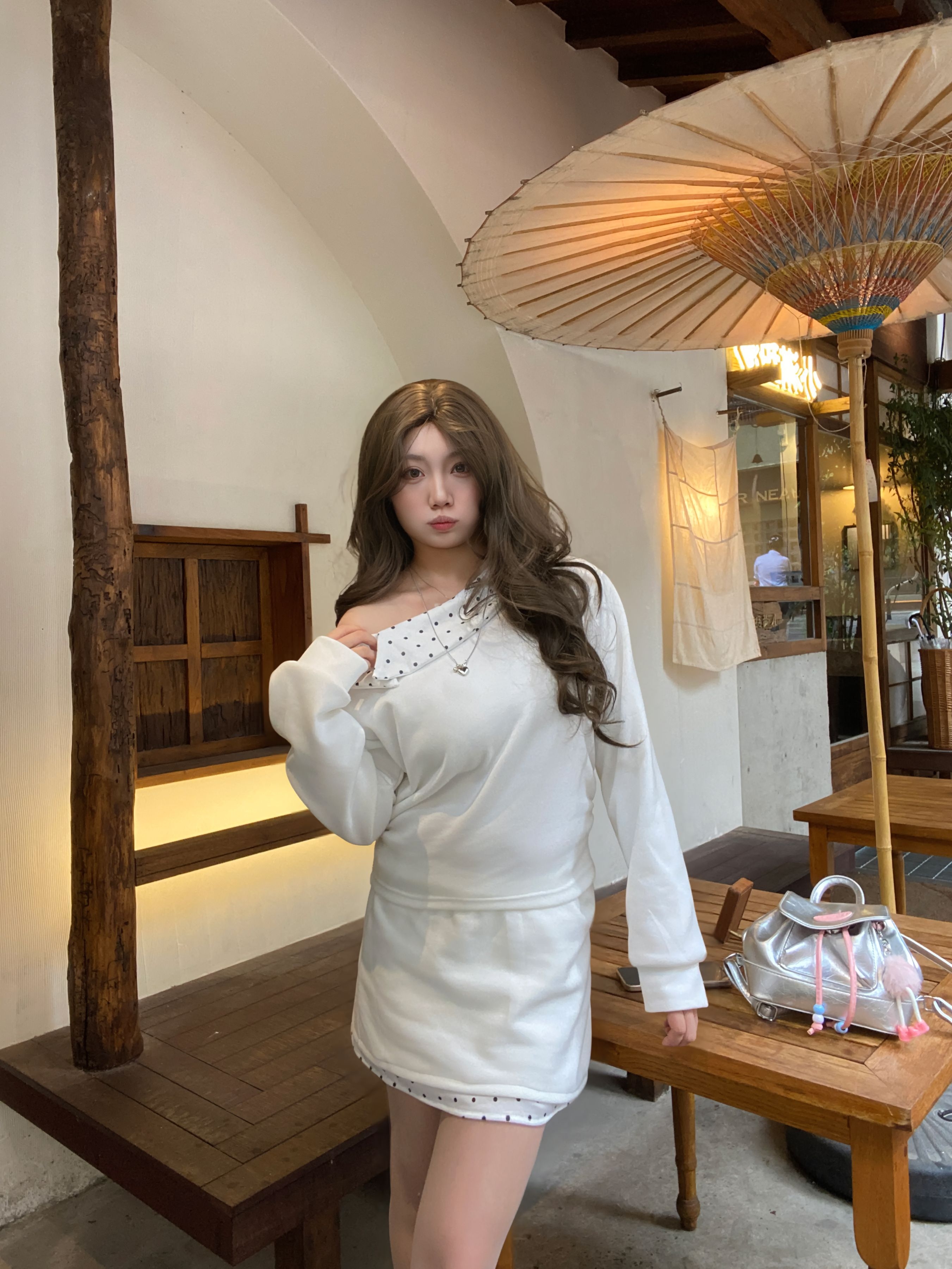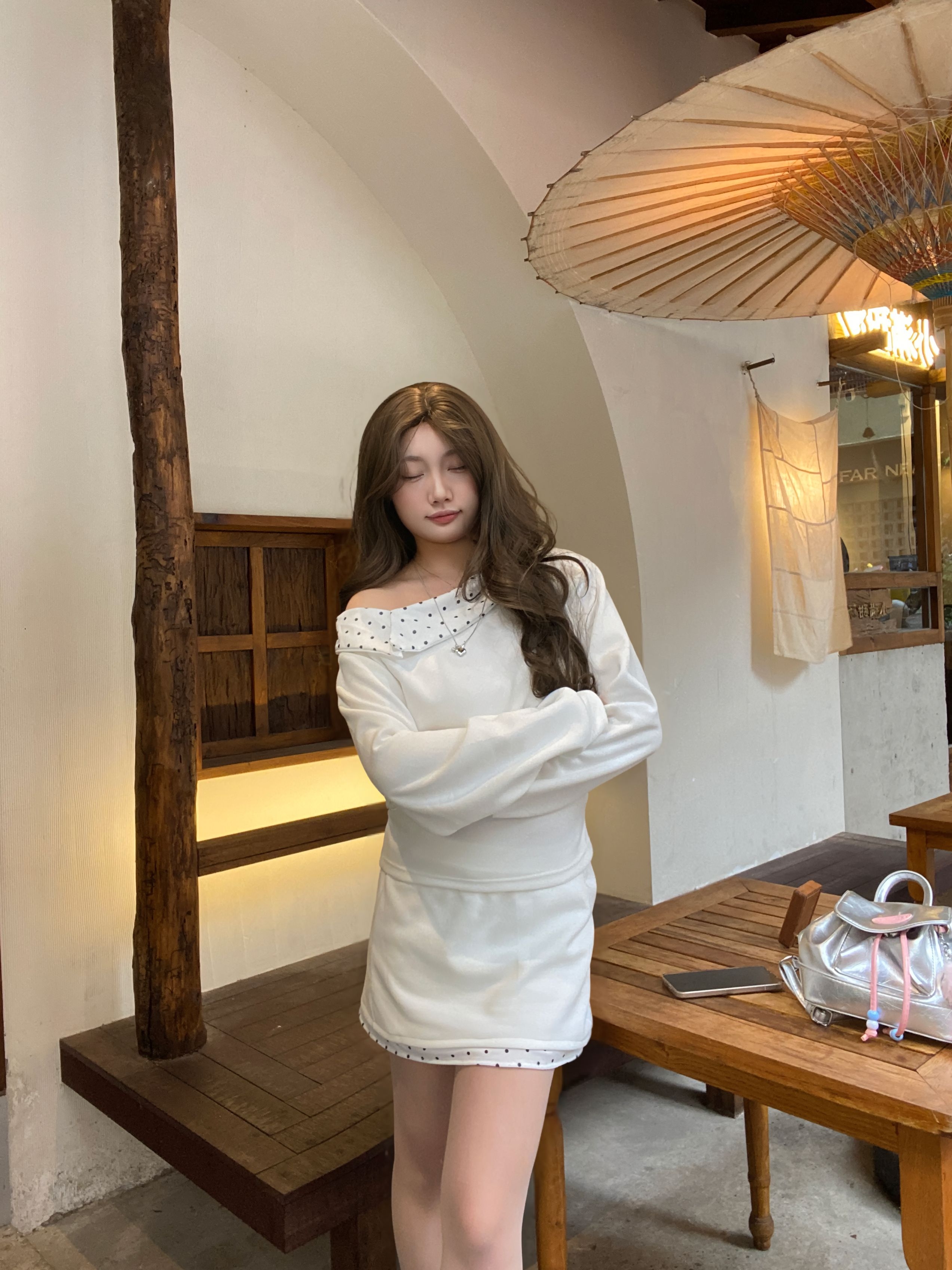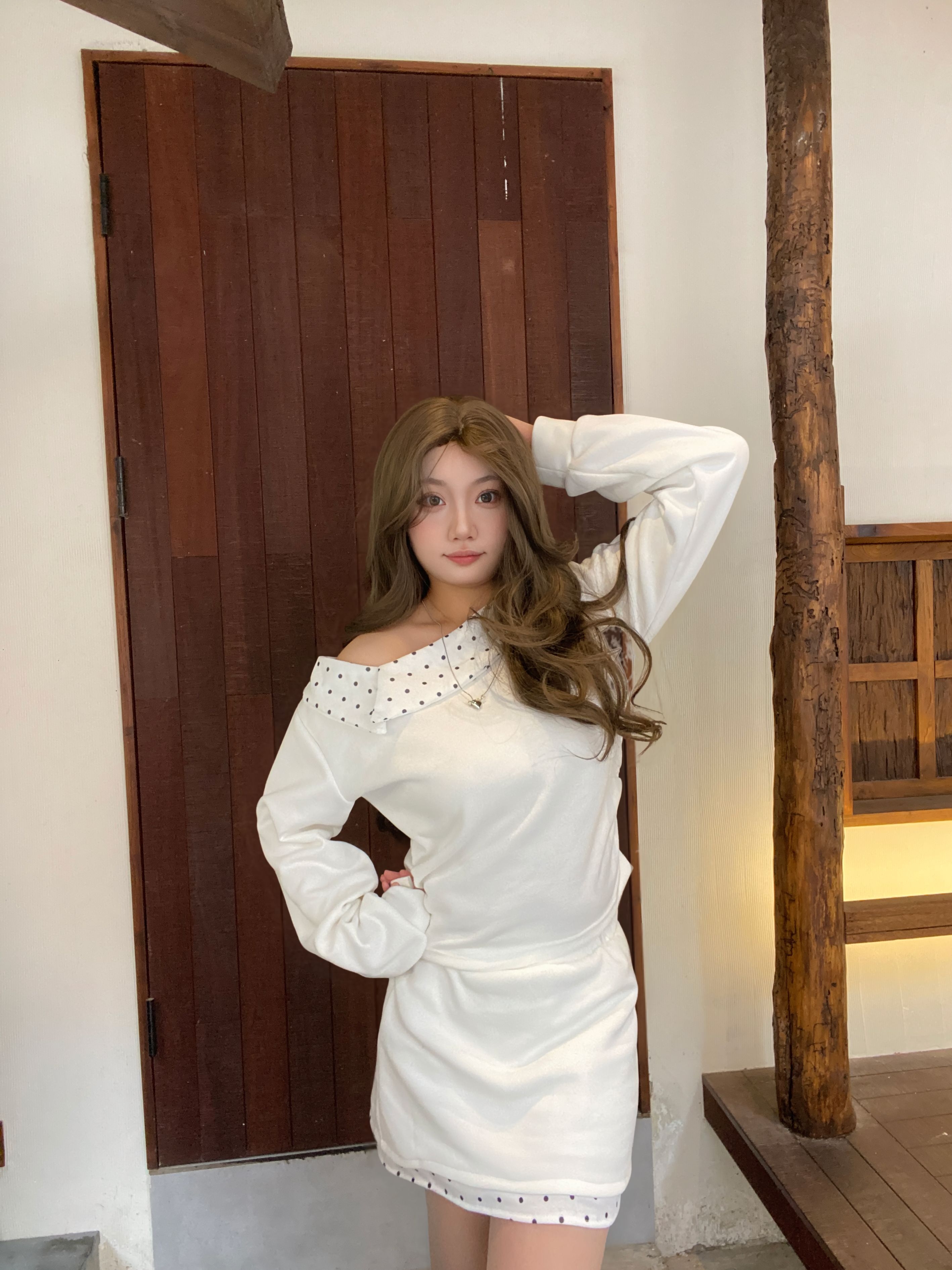 这件白色斜肩连衣裙也太懂甜妹了吧!露肩设计悄悄秀出锁骨,自带小性感,波点边的拼接又添了几分灵动俏皮,而且超级好看,搭配一个小吊坠~宽松的版型对身材超友好,遮肉又显腿长,搭配白色堆堆袜和小皮鞋,甜酷感直接拉满~背景的木质复古装修和白色裙装撞出温柔的层次感,随手拍都氛围感十足,妥妥的韩系甜妹出街look,爱了!