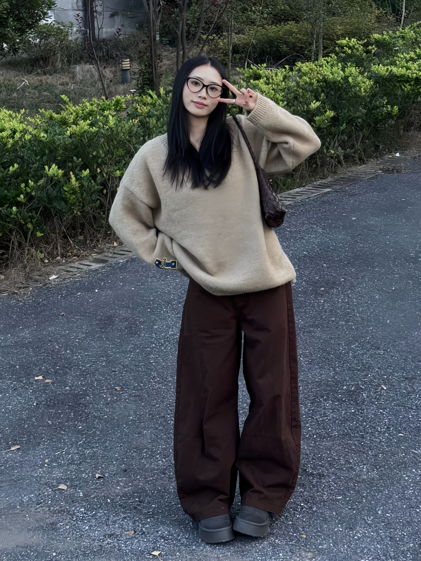 奶卡其毛衣像裹了件软乎乎的焦糖松饼,袖口的小徽章偷偷露着俏皮;配条深棕阔腿裤,同色系叠穿把秋意揉得温柔,踩双灰底鞋添了点利落,连抬腿的动作都透着松弛。 挎只编织棕包顺着色系走,往绿植边一站,冷绿背景衬得这身更暖,是“出门遛弯都像裹着热可可”的舒服穿法~