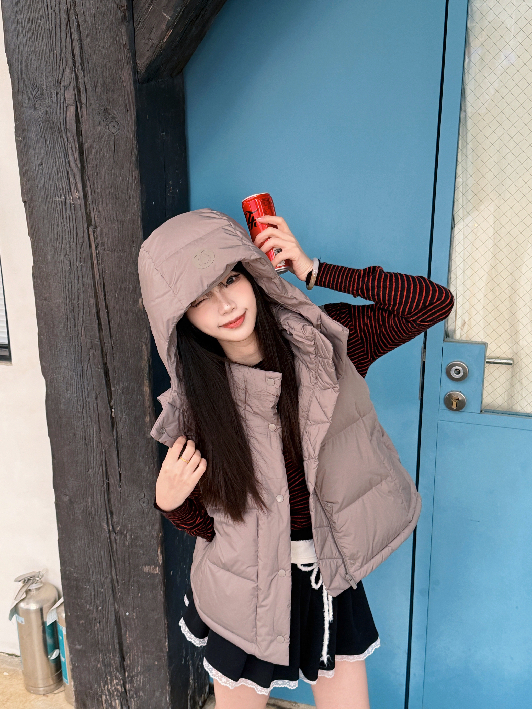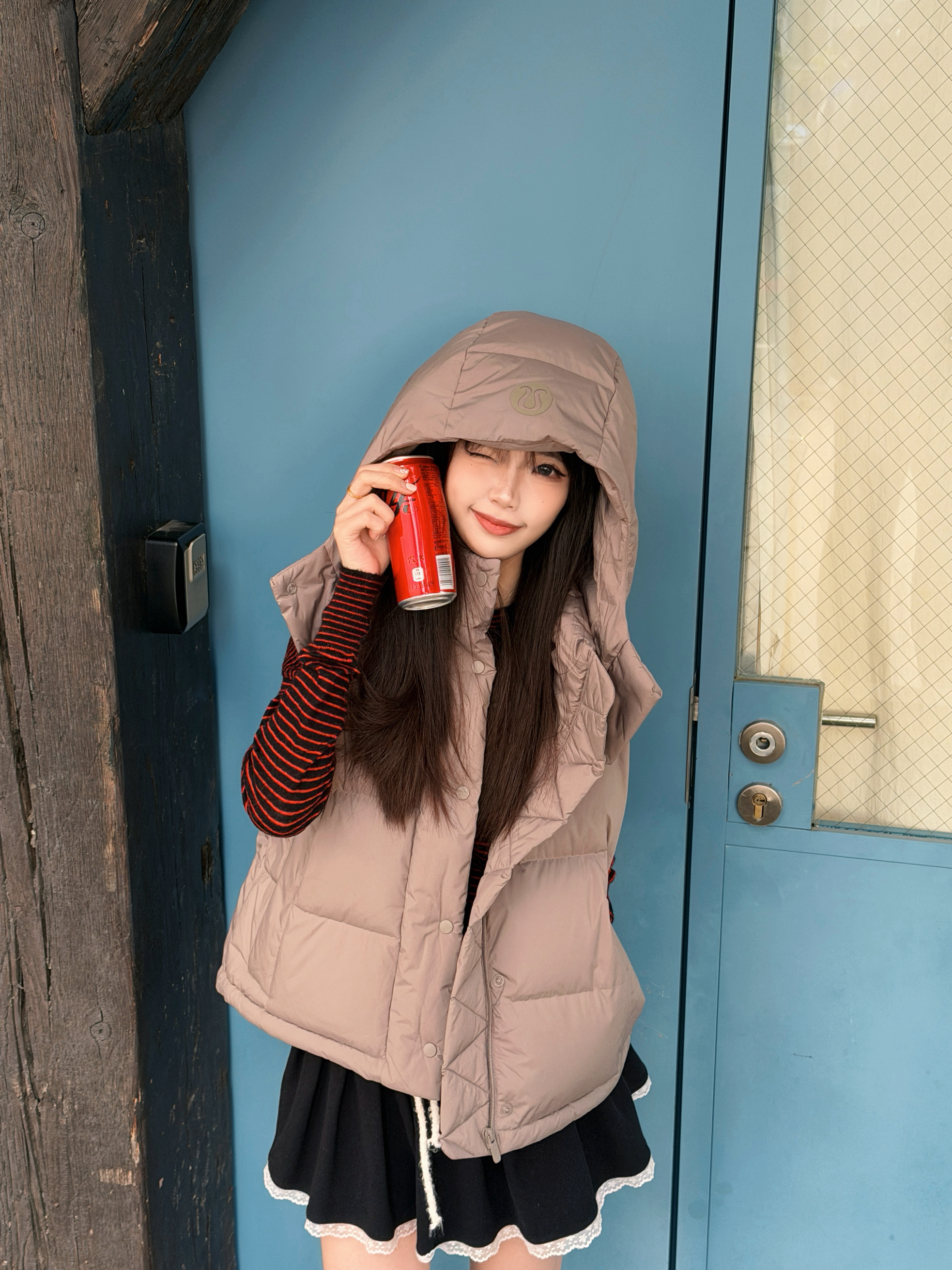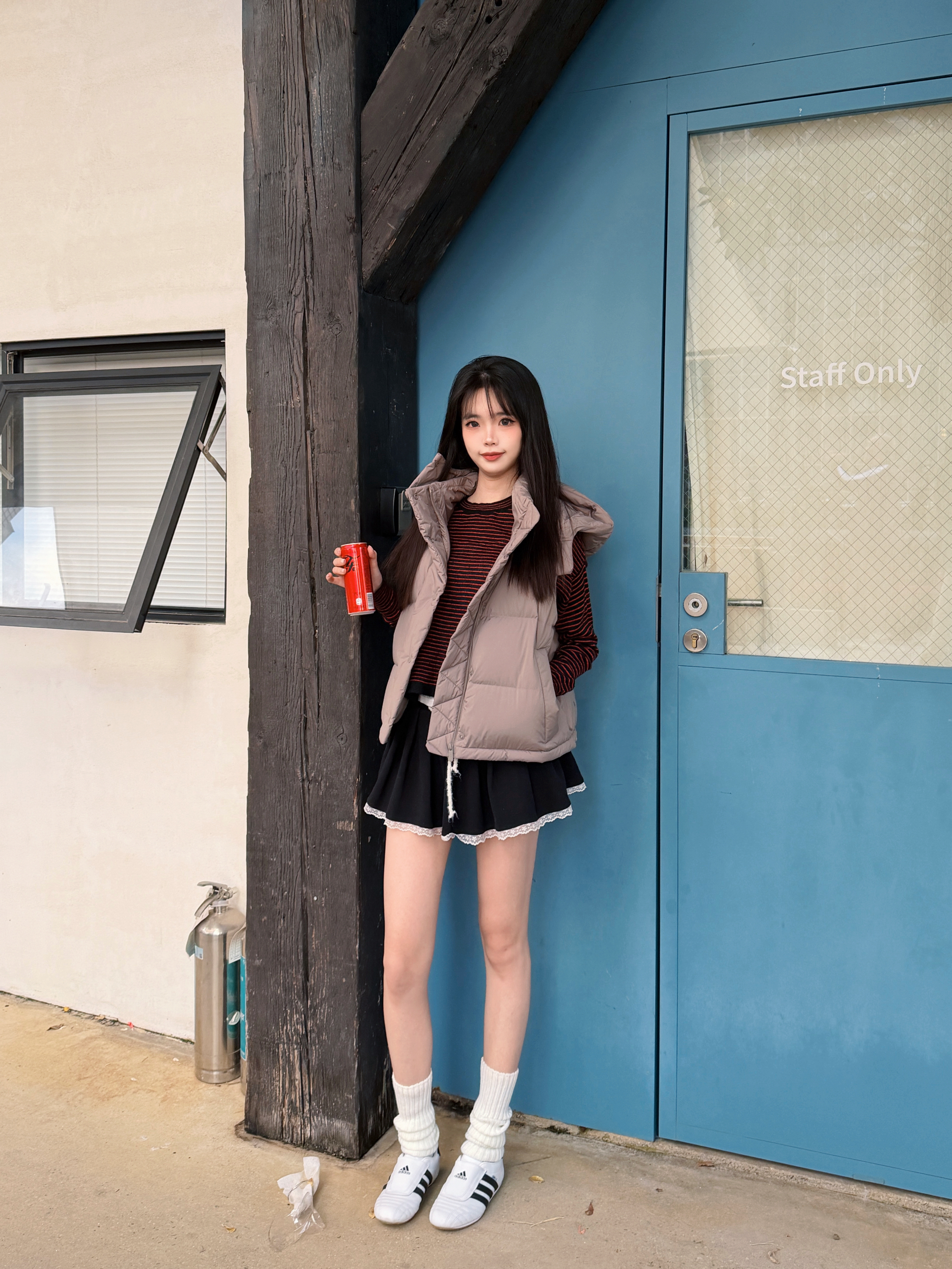 韩里韩气的冬日随手拍❄️ 韩系穿搭真的太拿捏我了! 暖褐灰露露羽绒马甲搭红黑条纹内搭,再配个小短裙+堆堆袜,甜酷感直接拉满~ 拿着可乐在蓝门旁边随便拍,氛围感满满✨ 新年跨年穿搭也可以参考这身搭配呀❤️🔥