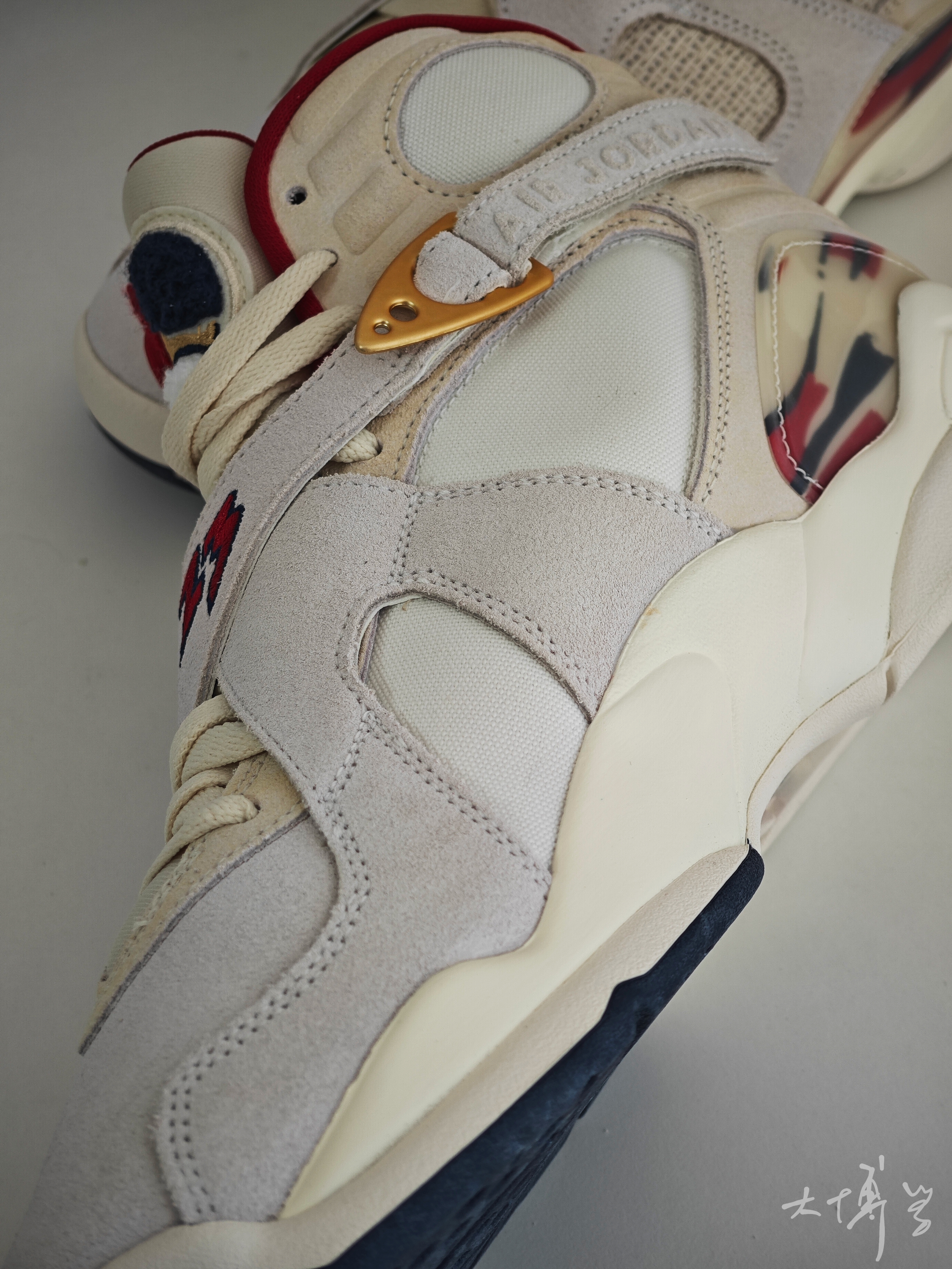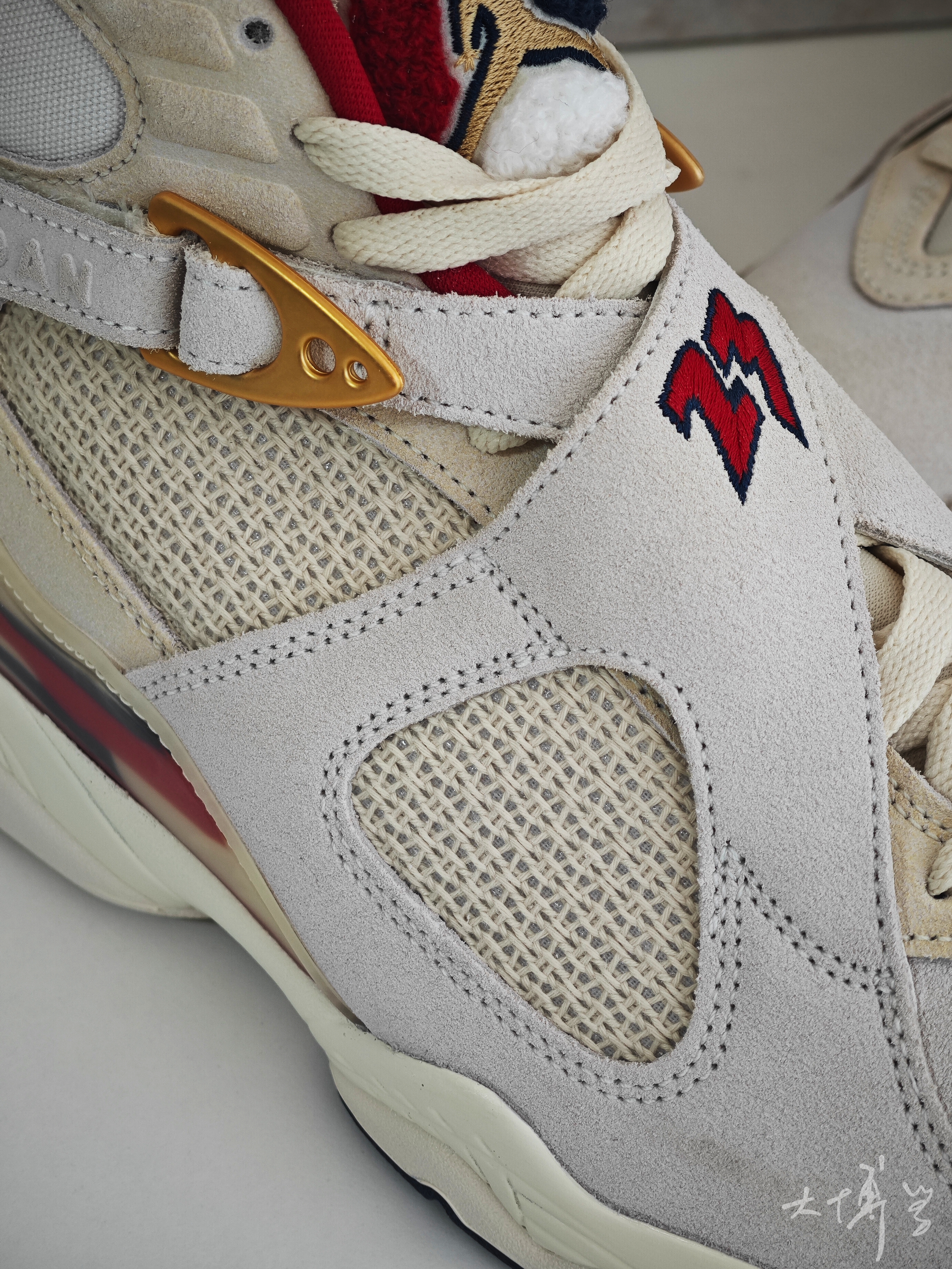 一双帆白色的AJ 8 鞋面使用了帆布和麂皮 不论配色还是材质 使AJ 8看起来清爽了不少 经典的毛巾鞋舌和后跟的涂鸦都得到保留 solefly联名,还是有点东西的