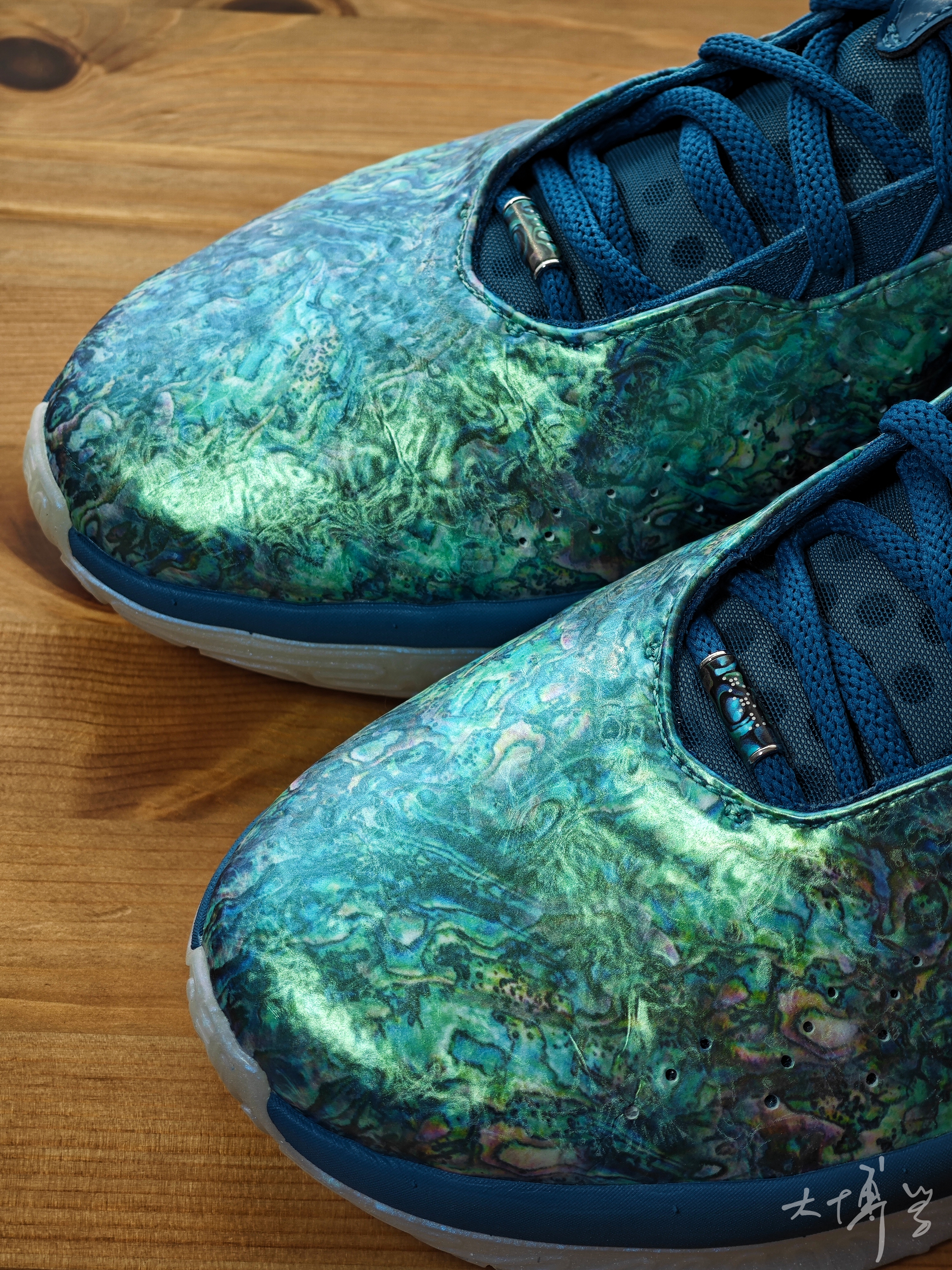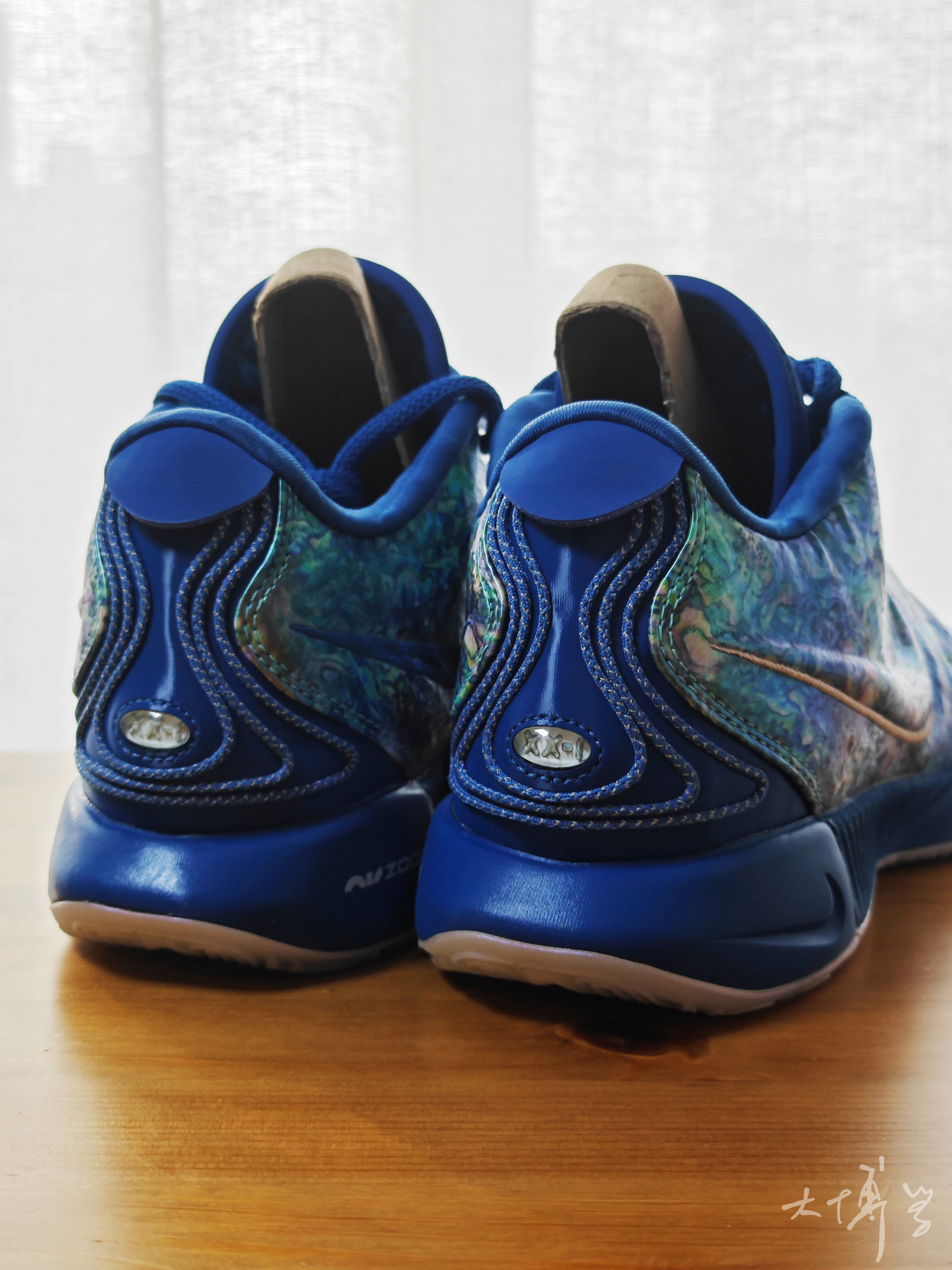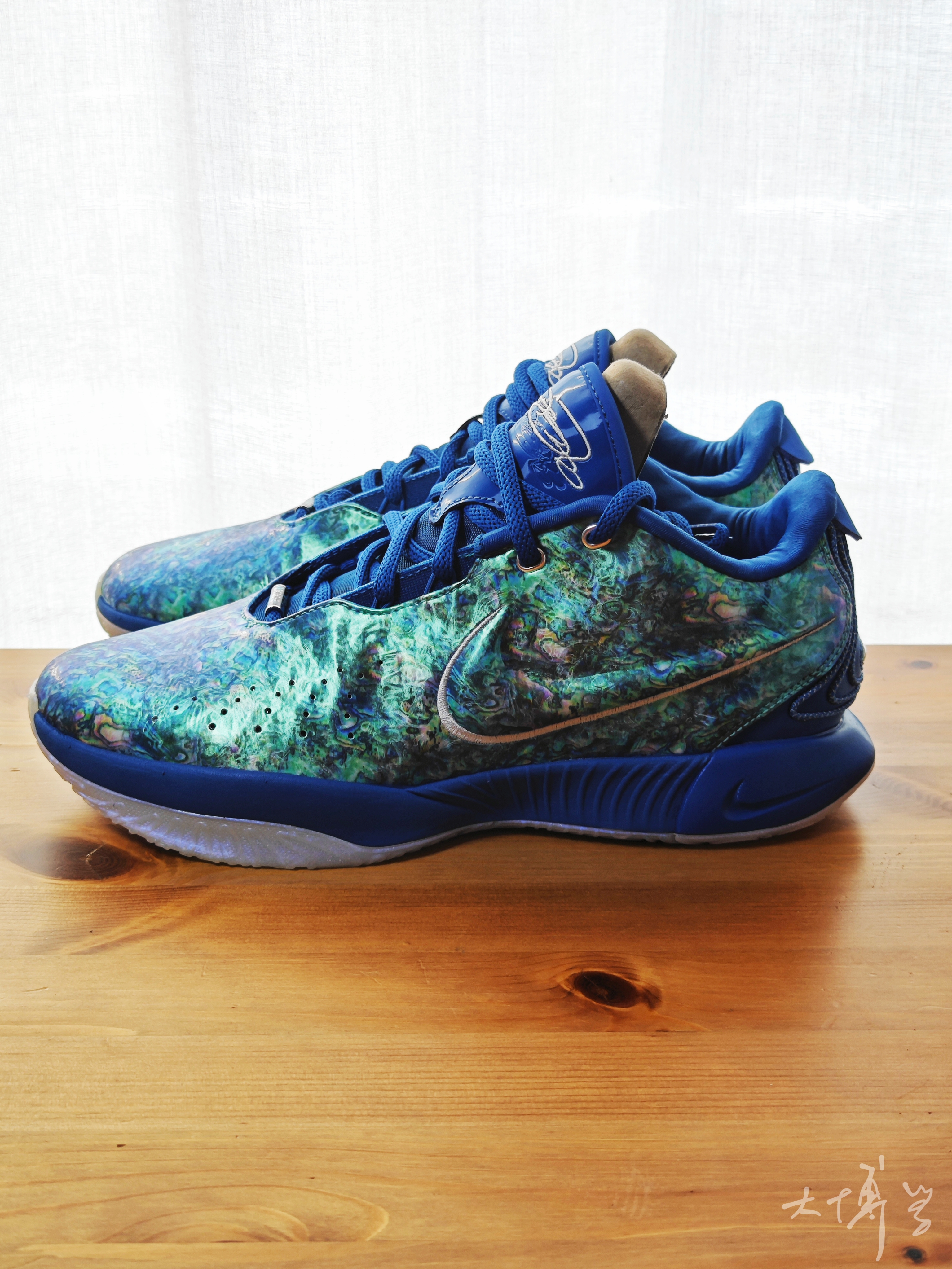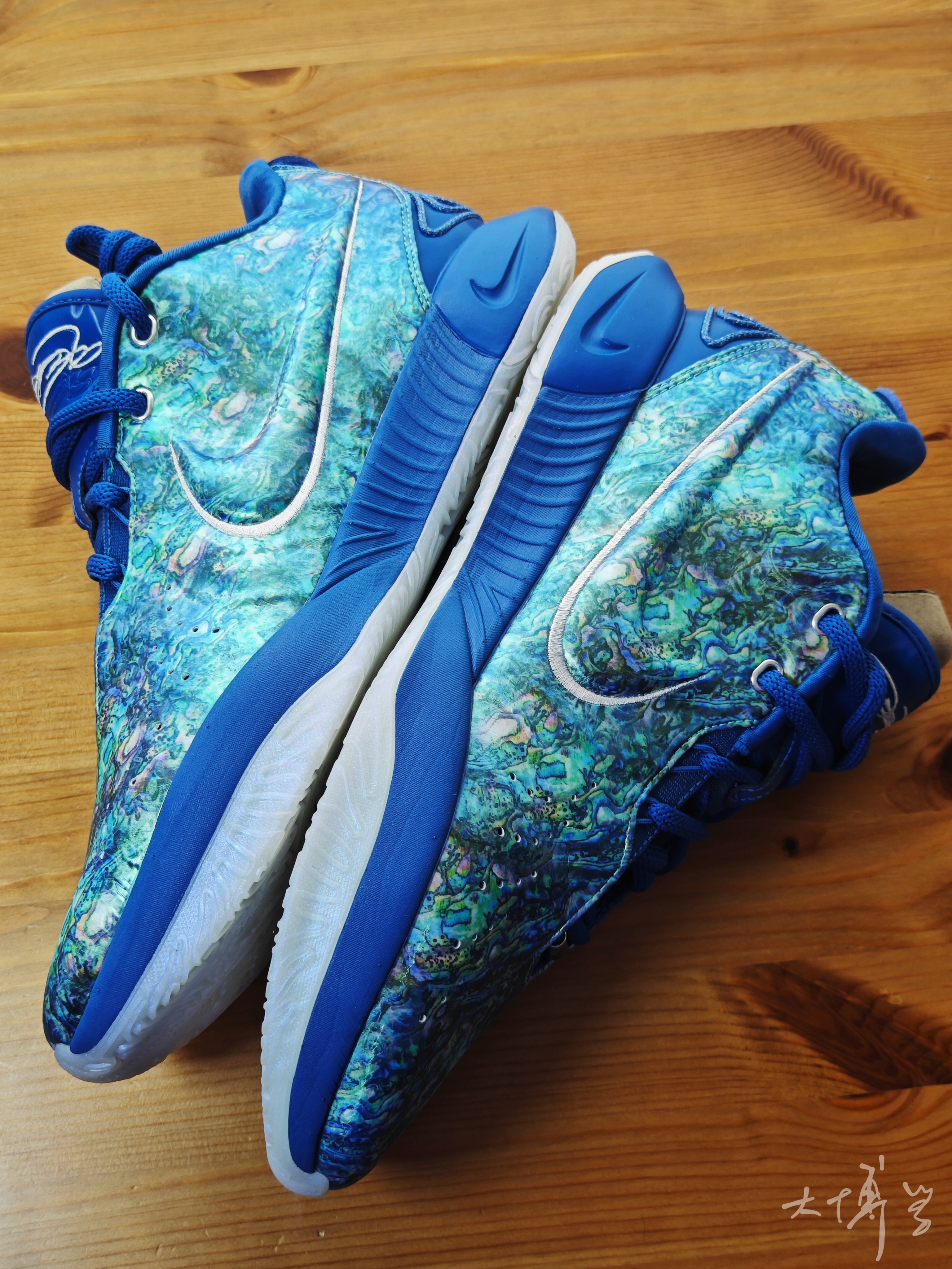 这是一双勒布朗的21代 整体轮廓延续了20代的设计 这双配色比较花哨,算是蓝绿色 很像当年的AJ29羊年 充满水彩画或者类似油画的感觉