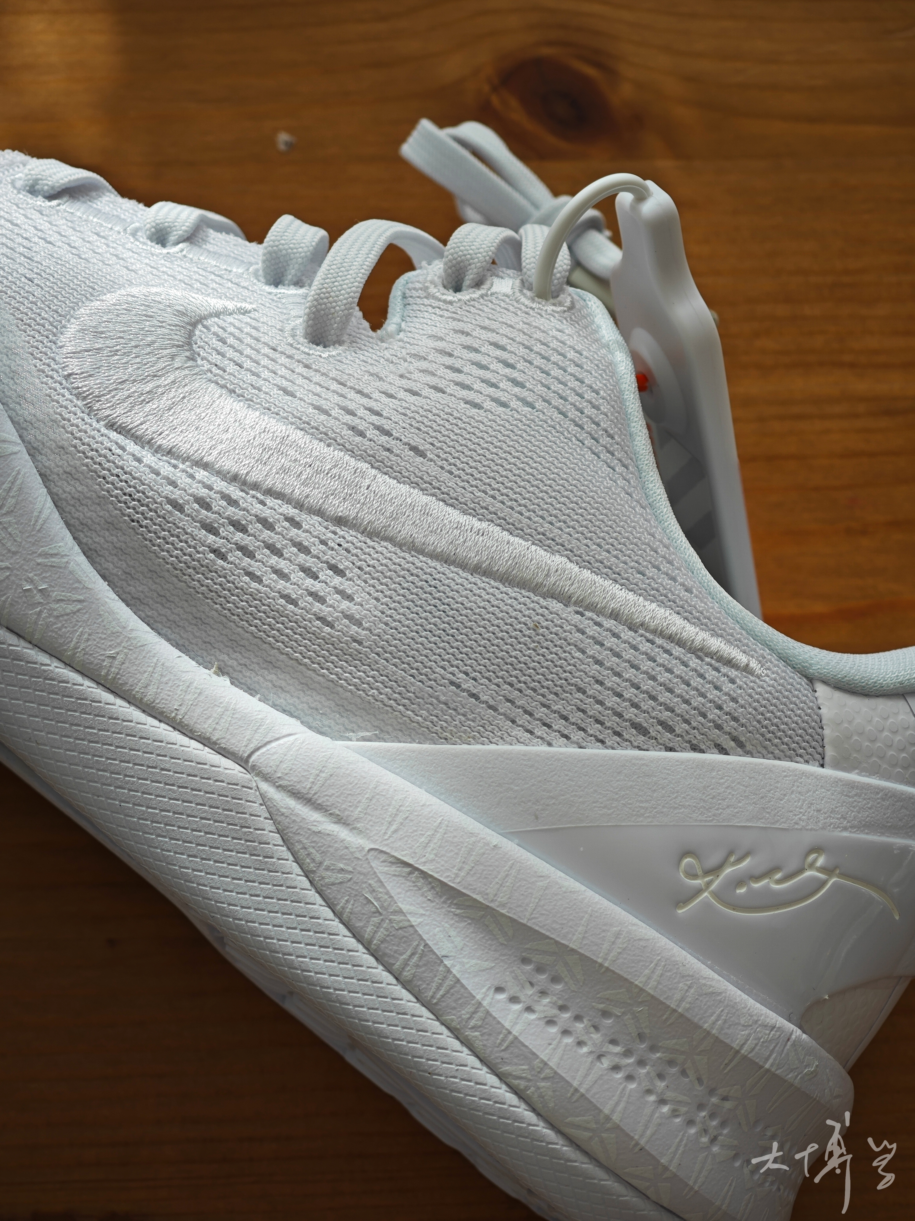 这双复刻的科比 8 鞋面的织物材质 看着就非常透气 鞋头位置隐约能看到KB24的编织纹路 侧面swoosh是刺绣的 质感不错 react鞋垫也是一个小小的升级 白色的鞋子穿起来很显精神
